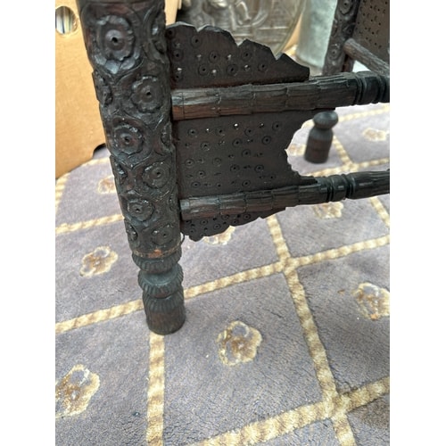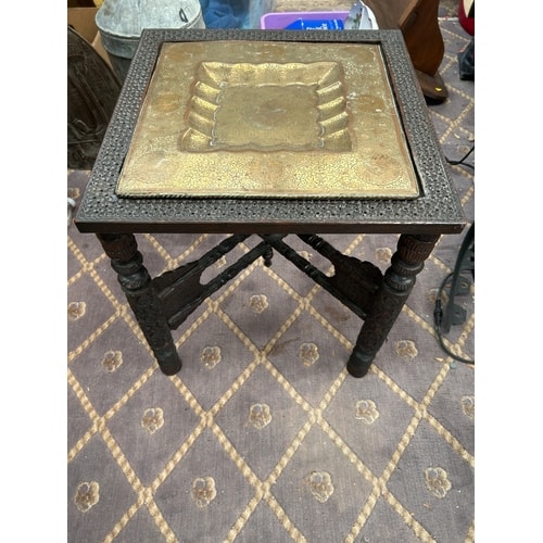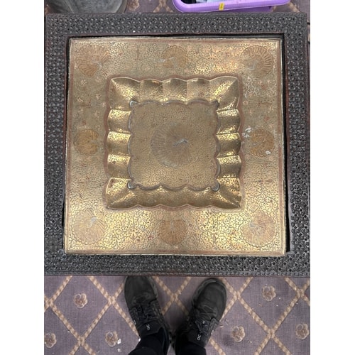 A square-top occasional table crafted from dark, carved wood, featuring a recessed brass panel top. The brass panel is elaborately decorated with etched or embossed floral and geometric motifs, including a raised central section with a scalloped edge and fluted details. The wooden frame of the tabletop and the four legs are extensively carved with floral or foliate patterns. The legs are connected by an X-shaped stretcher, also featuring carved elements. No discernible text or maker’s marks are visible.