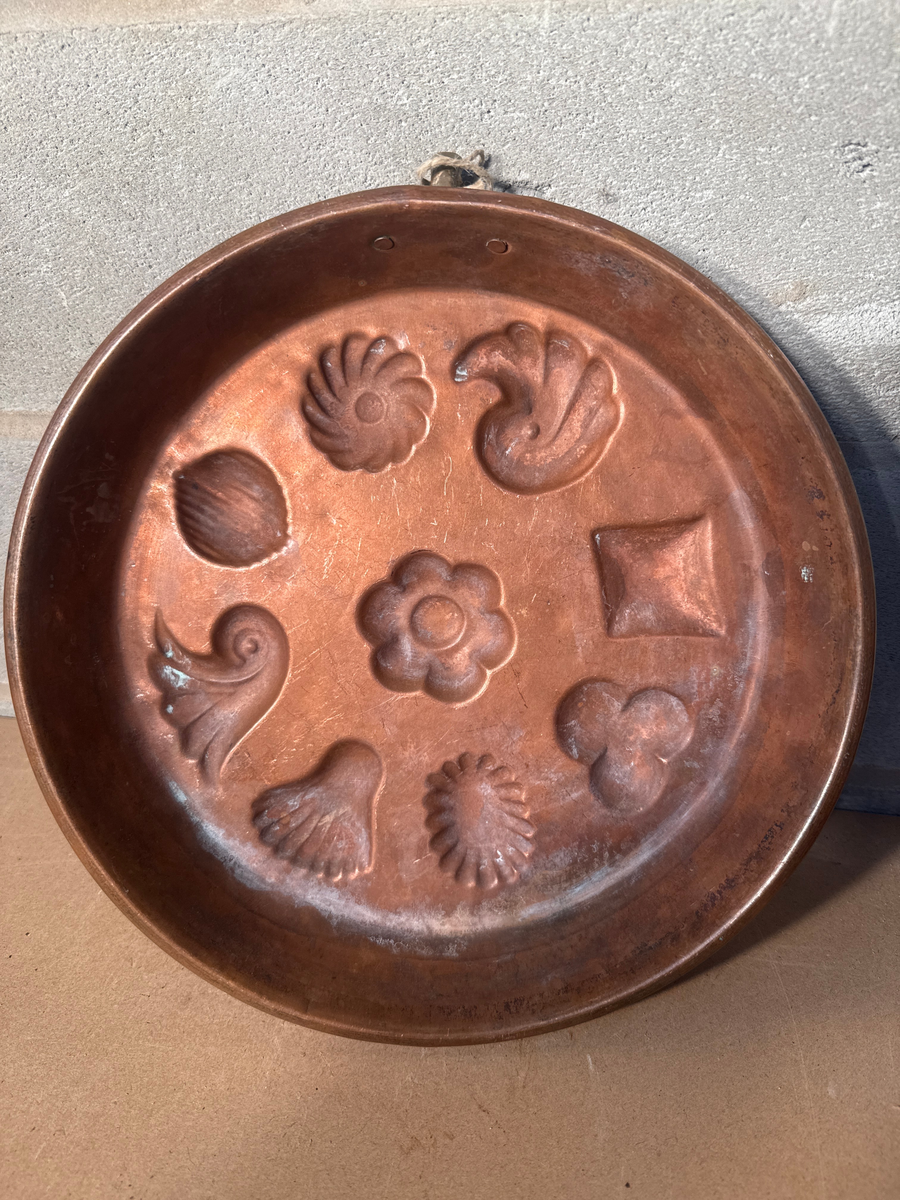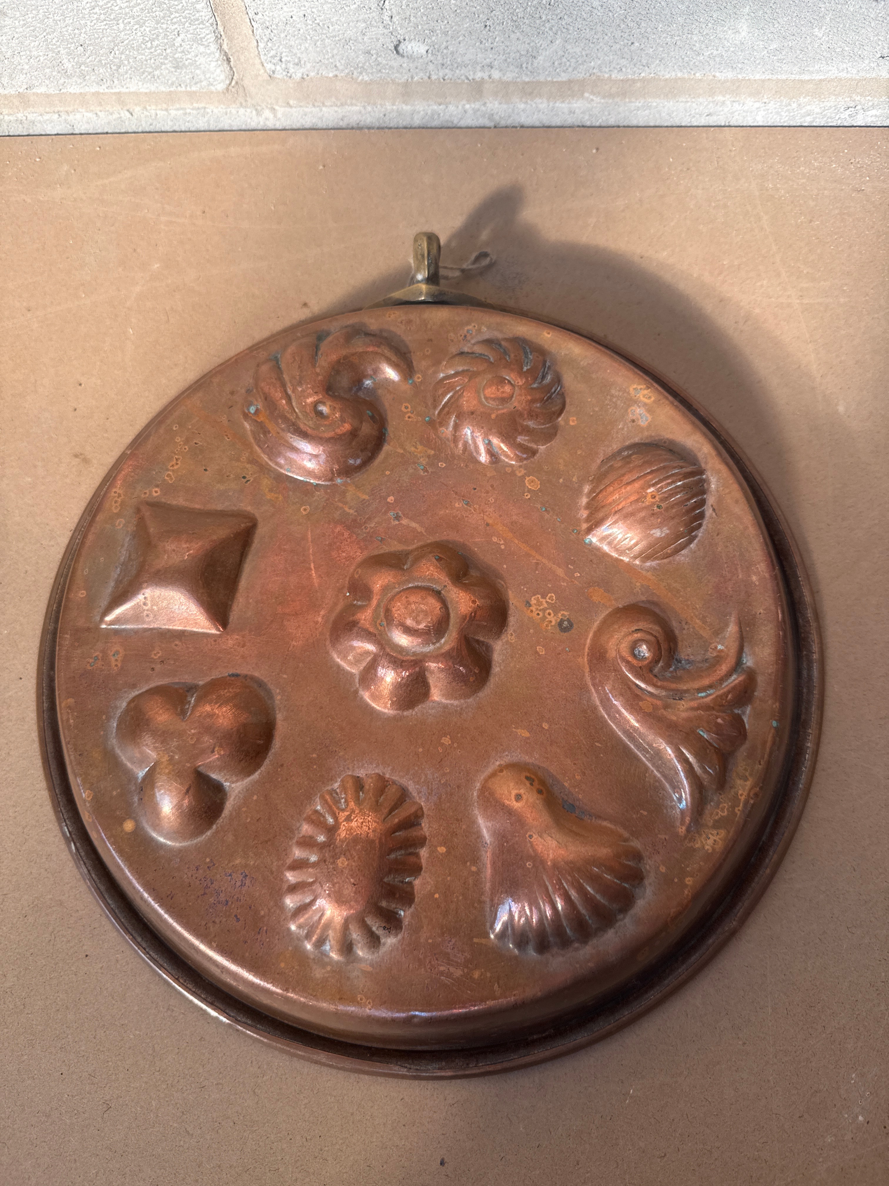A round, shallow copper mold, likely for baking or confectionery, featuring nine distinct decorative cavities. The embossed shapes include a swirl, spiral flower, shell, square, central flower, stylized leaf or scroll, trefoil, fluted shell, and a bird or swan. A small brass hanging loop is affixed to the top rim. No visible text or maker’s marks.