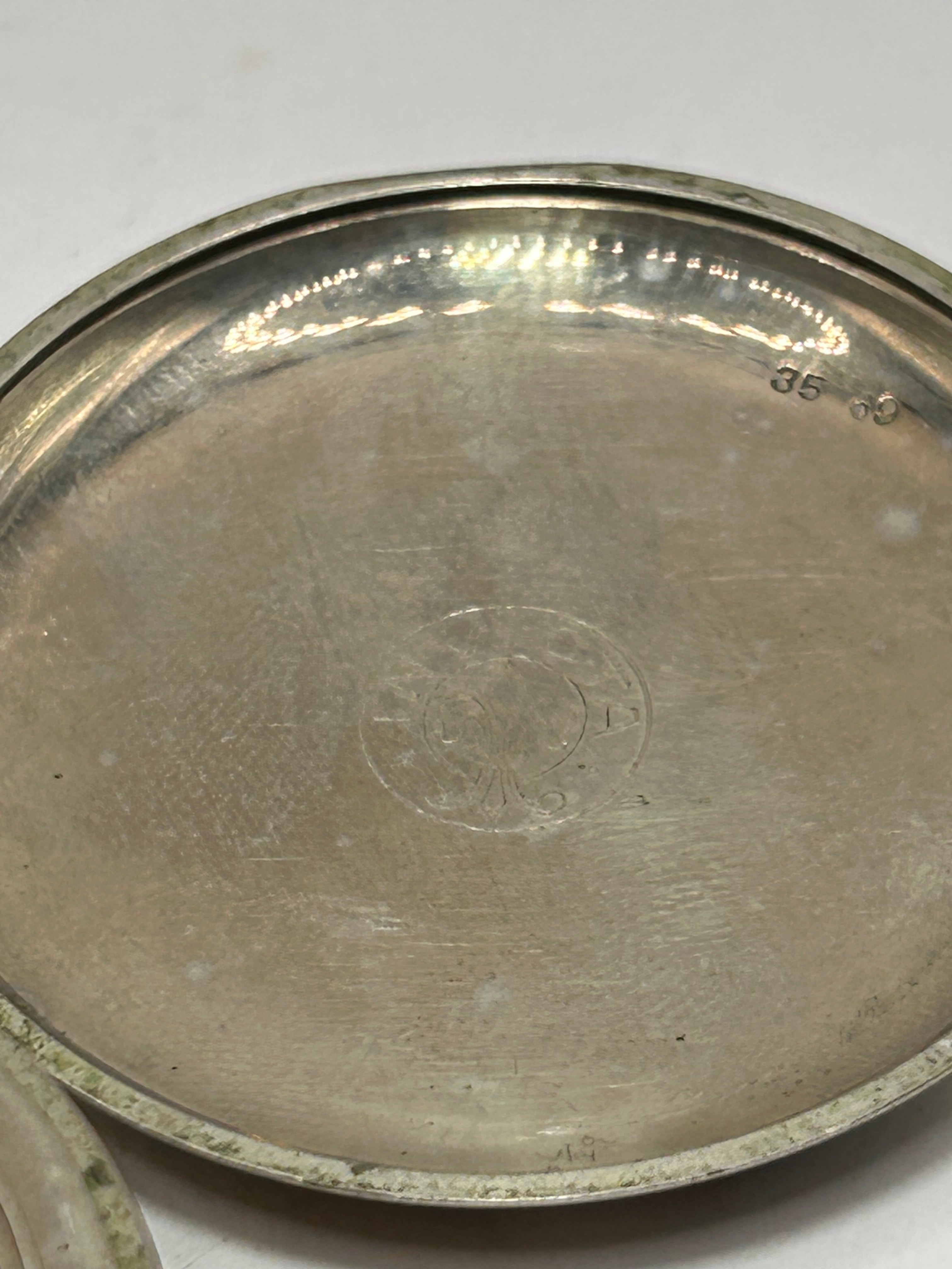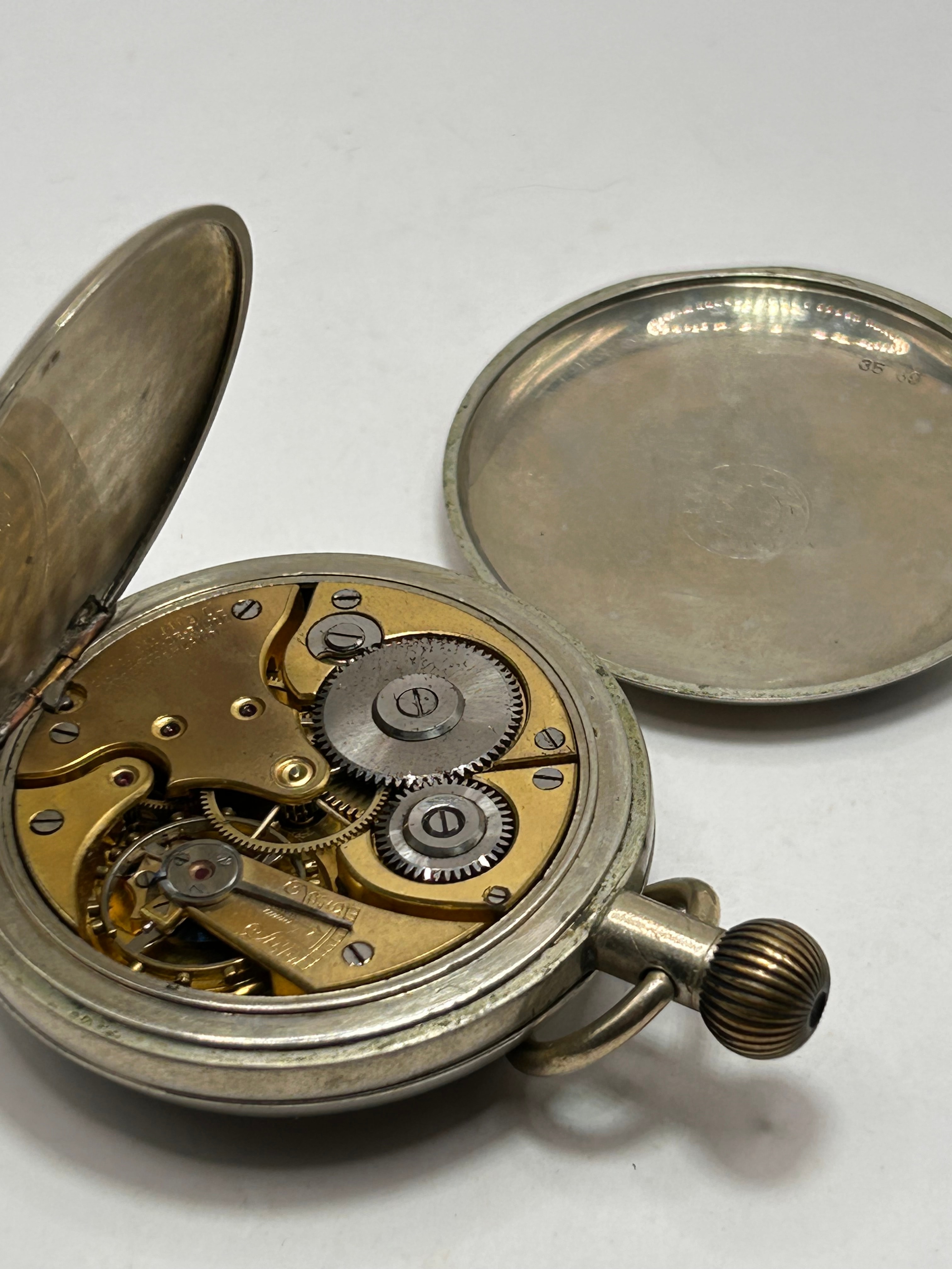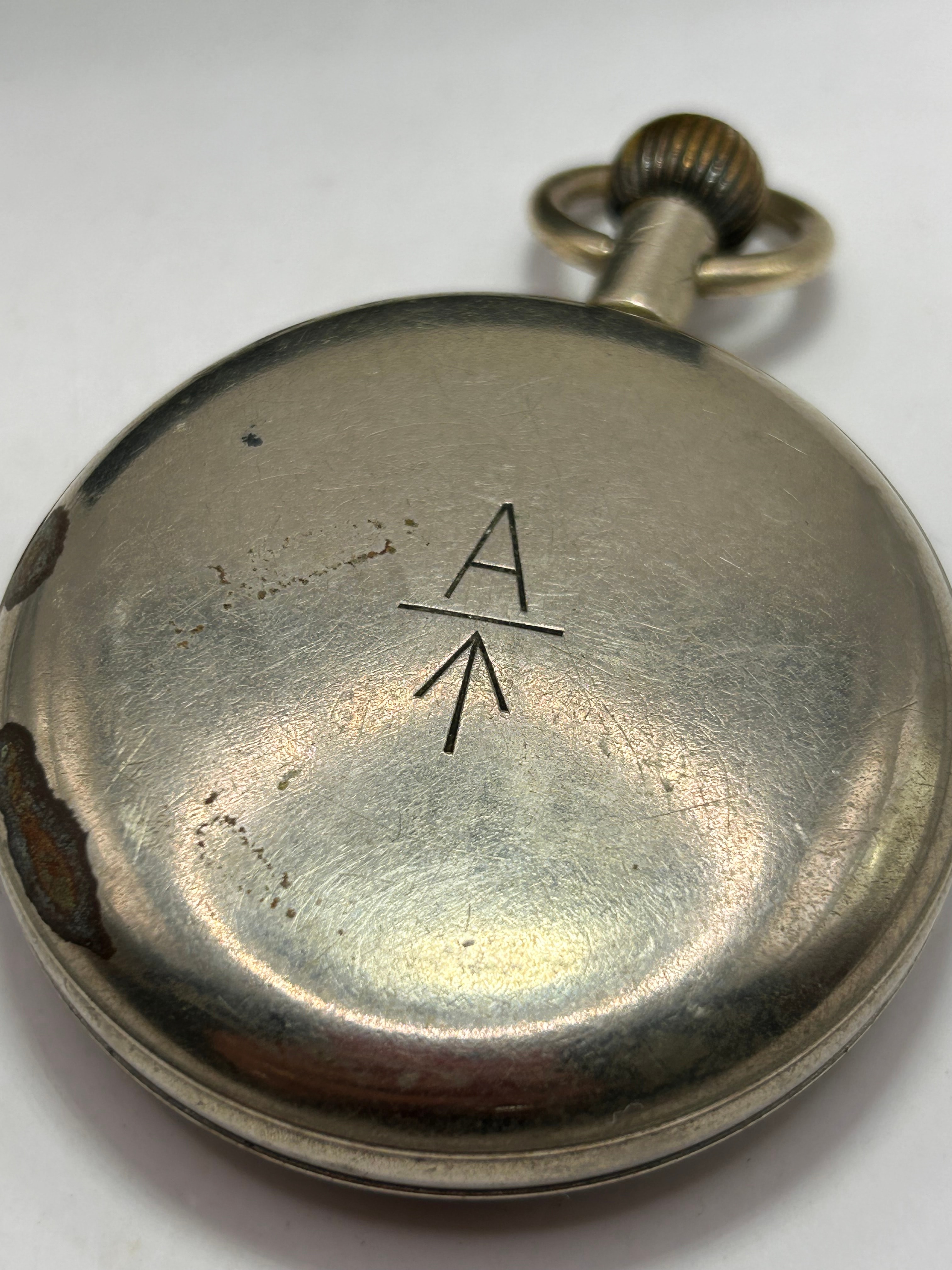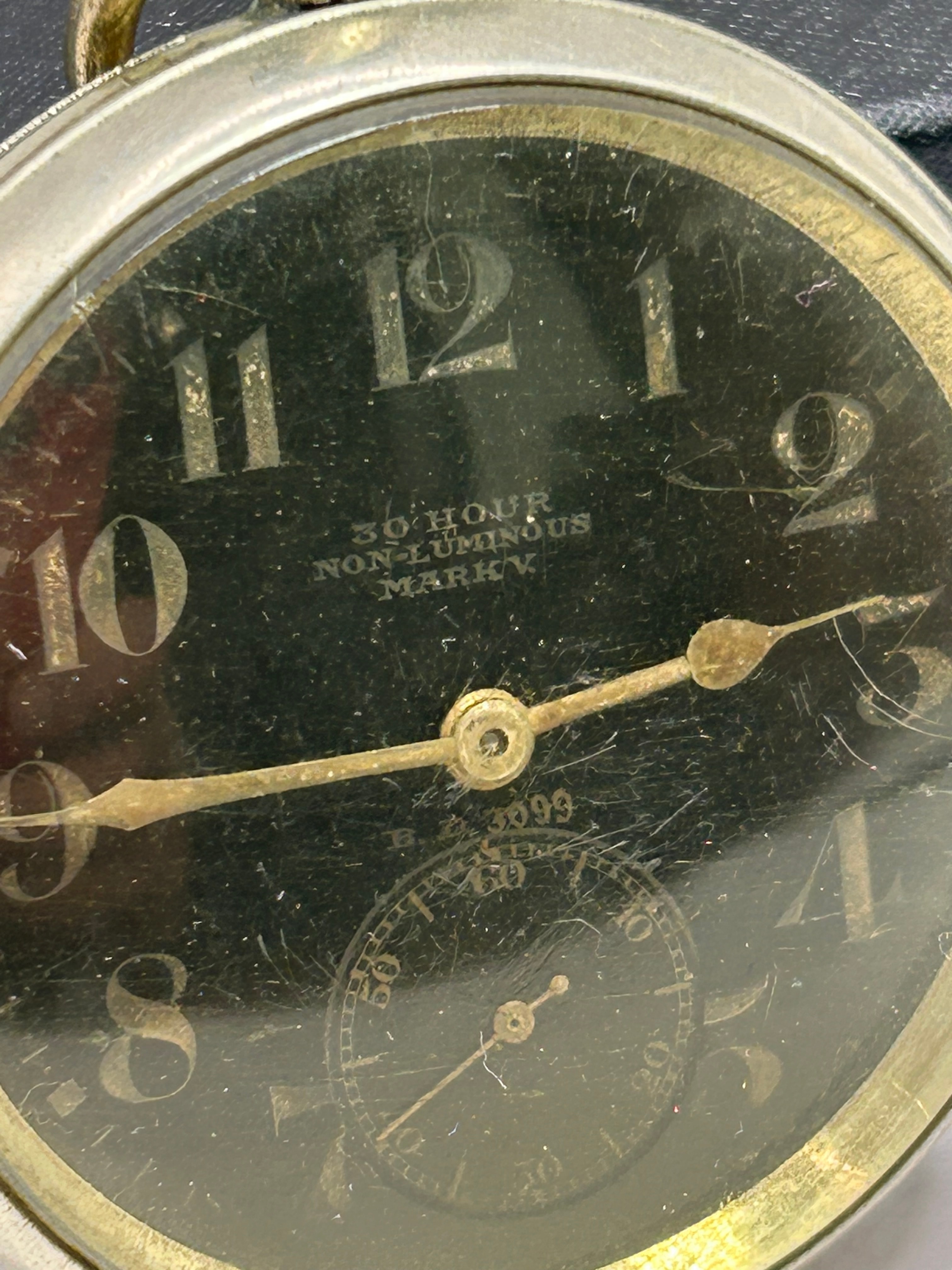 An H. Williamson Ltd. Royal Flying Corps Mark V 30-Hour Non-Luminous military pocket watch. This vintage timepiece features a silver-tone metal case, with its exterior back prominently marked with a broad arrow and ‘A’, indicating British military issue. The black dial displays Arabic numerals and a subsidiary seconds dial, inscribed “30-HOUR NON-LUMINOUS MARK V”, “B. 3099”, and “60”. The inner case back reveals a “35 60” stamp and a partially legible circular logo. The visible brass movement is marked “H. Williamson Ltd.”, “15 JEWELS”, and “SWISS MADE”.