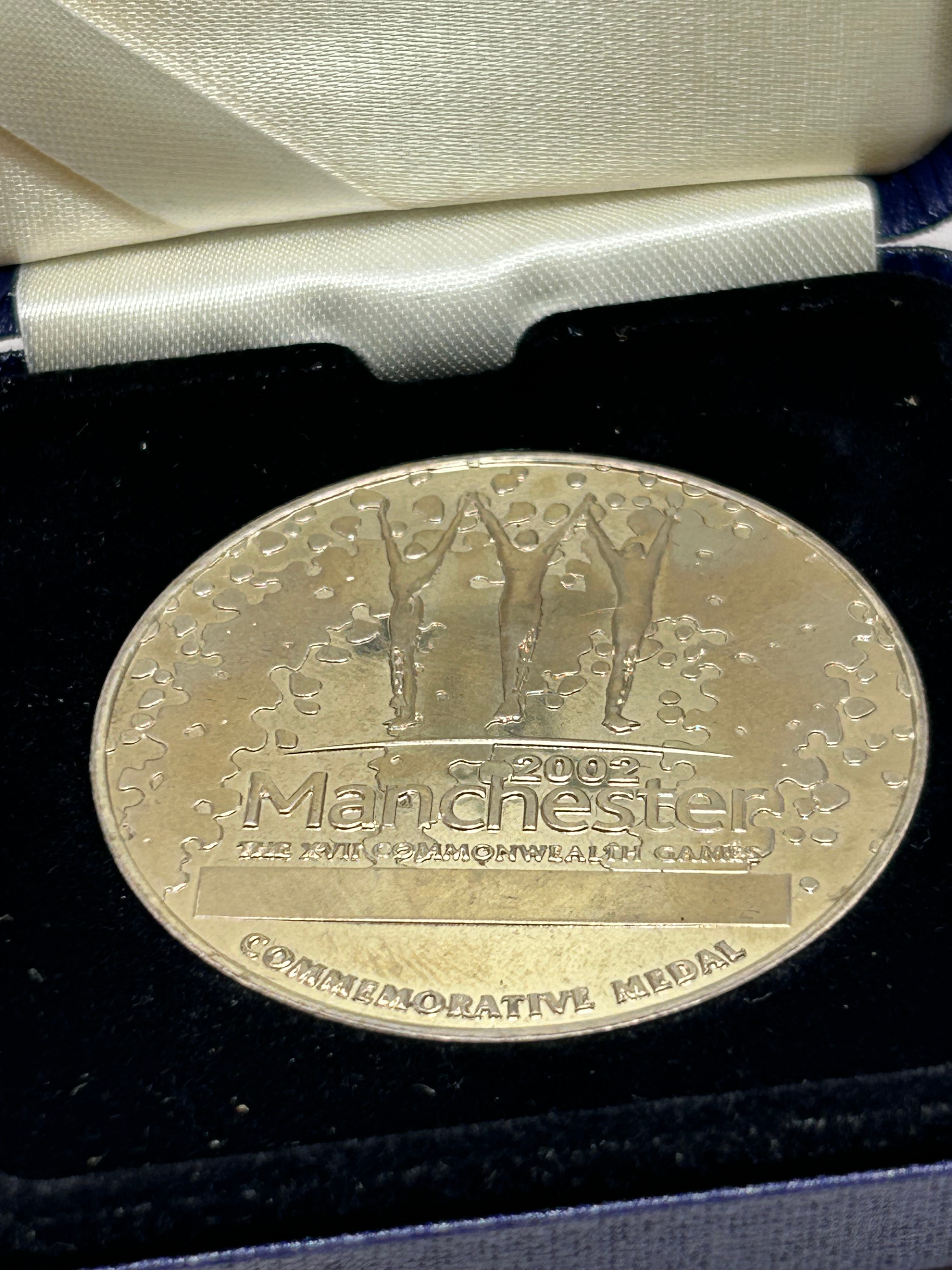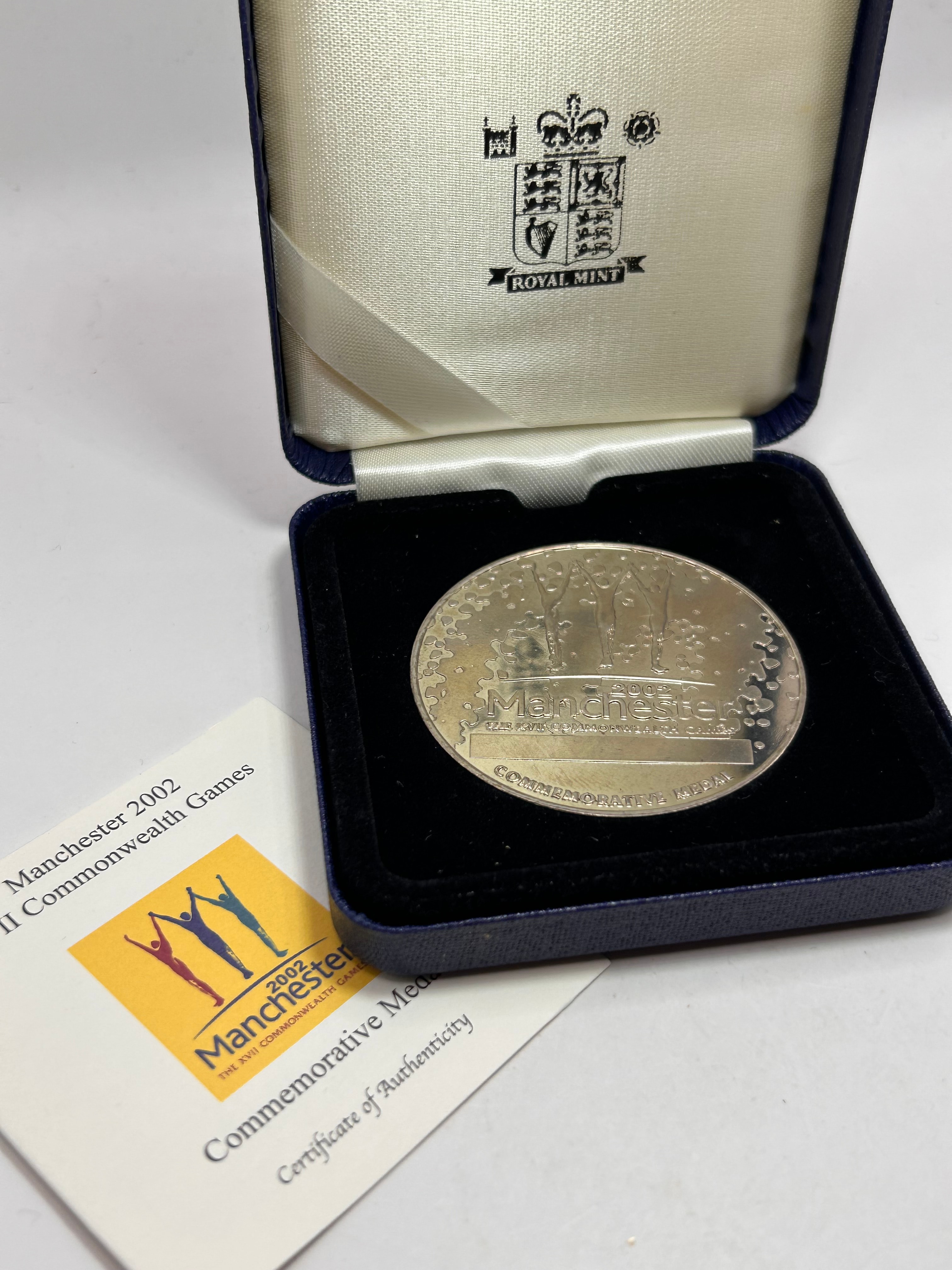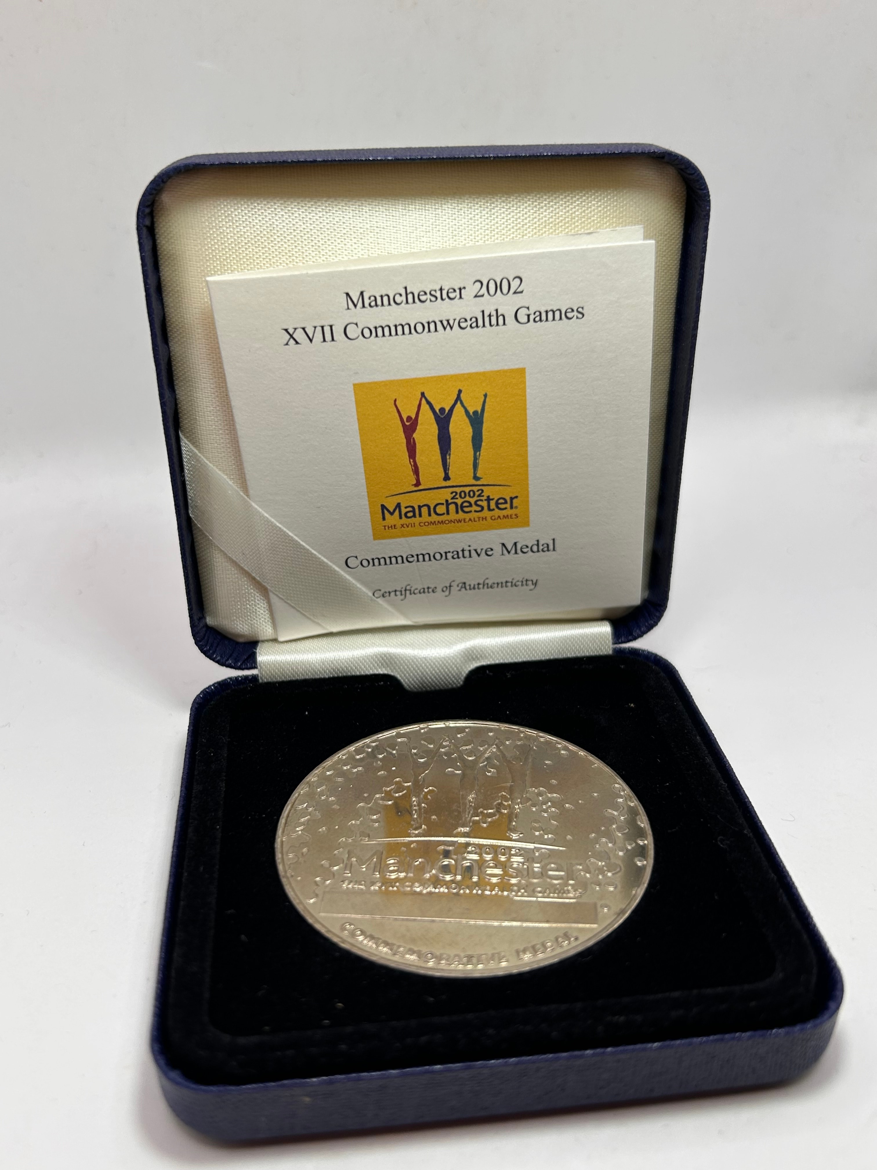 A Royal Mint Manchester 2002 XVII Commonwealth Games Commemorative Medal. This silver-toned metallic medal features three stylized figures above the text “2002 Manchester THE XVII COMMONWEALTH GAMES” and “COMMEMORATIVE MEDAL”. It is presented in its original dark blue, fabric-covered presentation box with a cream satin interior lid bearing the “ROYAL MINT” logo. Accompanying the medal is a “Certificate of Authenticity” and information card, also detailing “Manchester 2002 XVII Commonwealth Games Commemorative Medal”.