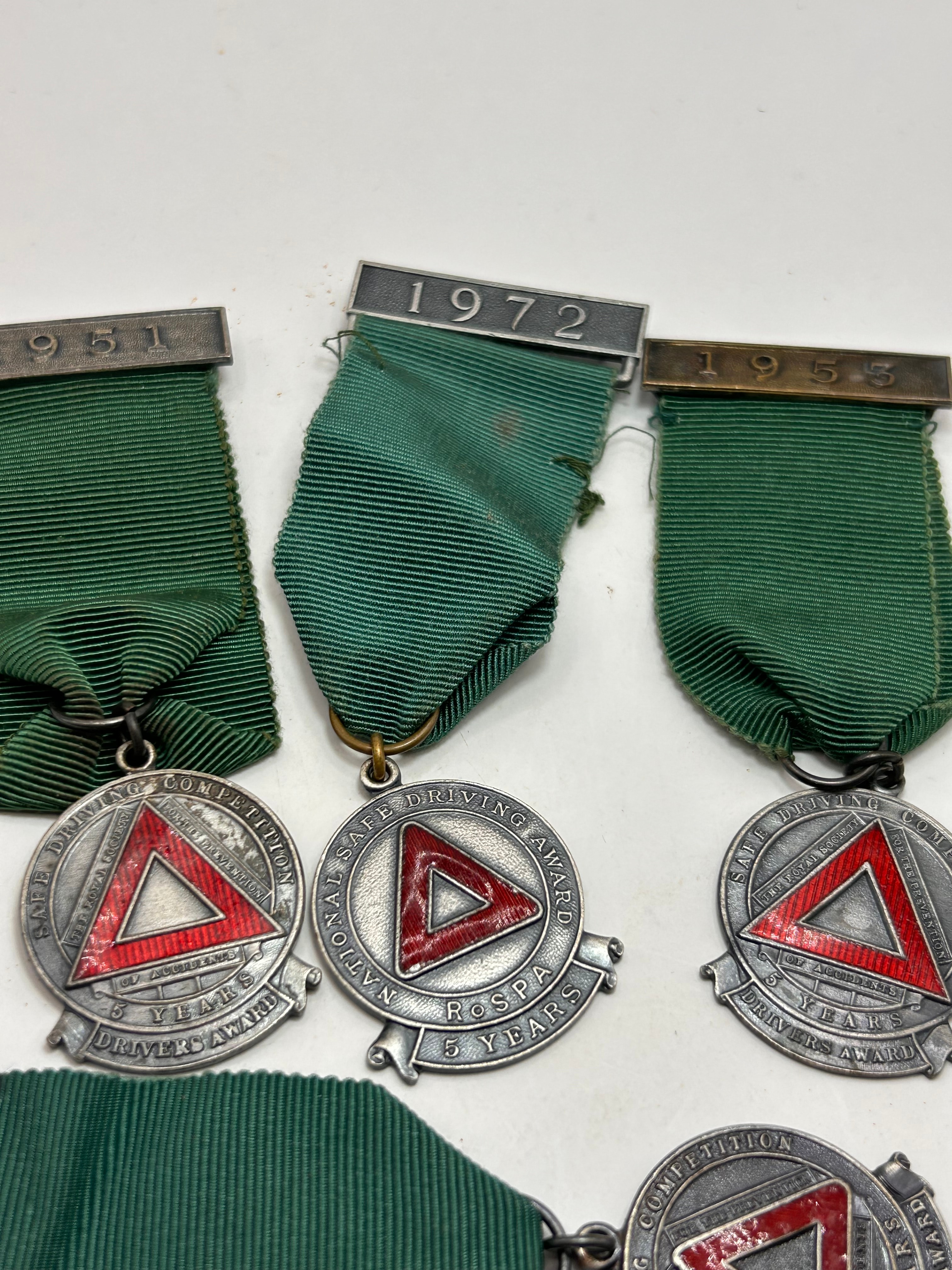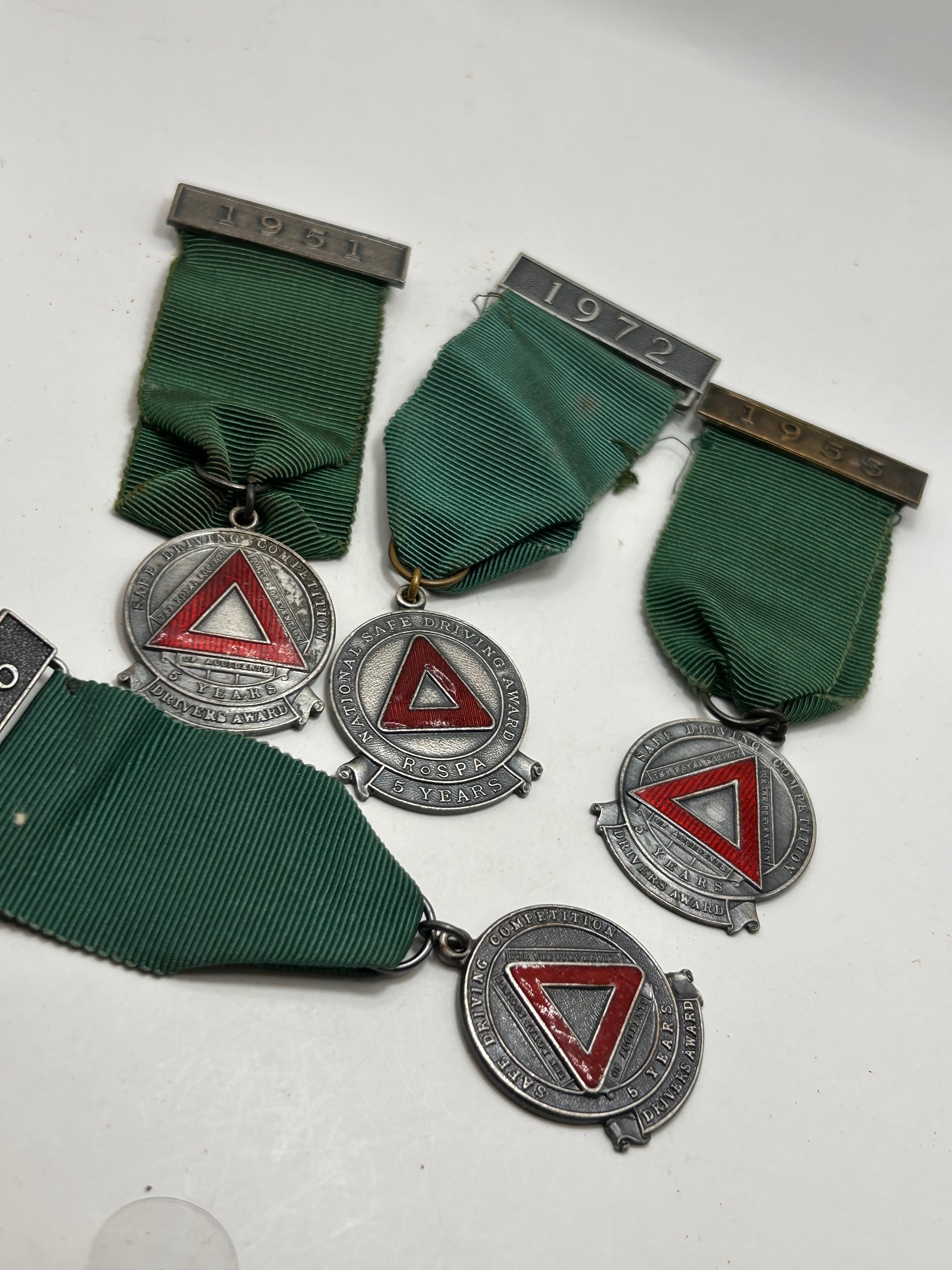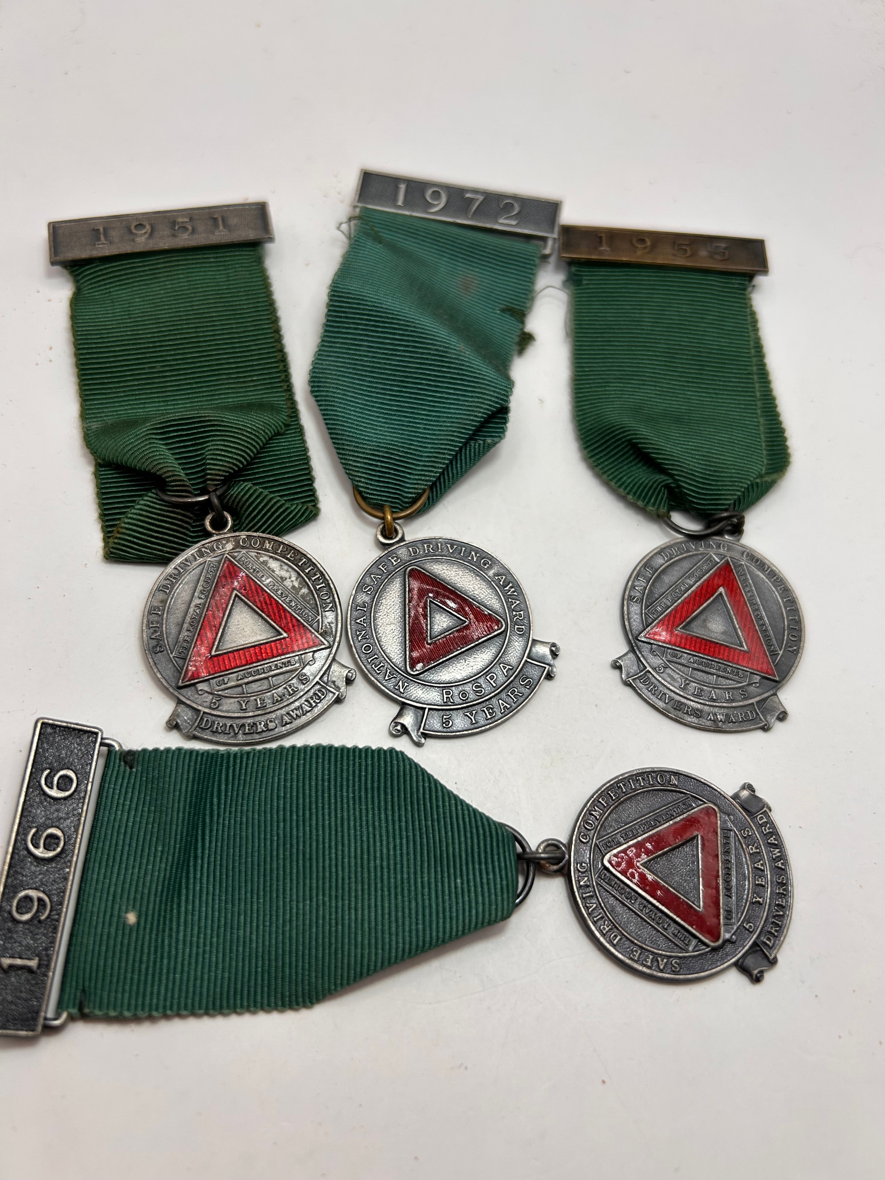 A collection of four ceremonial British Safe Driving Competition Medals and Awards. Each award consists of a rectangular metal suspension bar, a dark green pleated fabric ribbon, and a circular metal medal. The suspension bars are individually marked with the years: 1951, 1972, 1953, and 1966. Each circular medal features a silver-toned metal frame with a central red enamel triangle. Inscriptions around the perimeter of the medals include “SAFE DRIVING AWARD”, “5 YEARS”, “DRIVERS AWARD”, “NATIONAL SAFE DRIVING AWARD”, “ROSPA”, and “COMPETITION”. The awards are constructed from metal, enamel, and fabric.