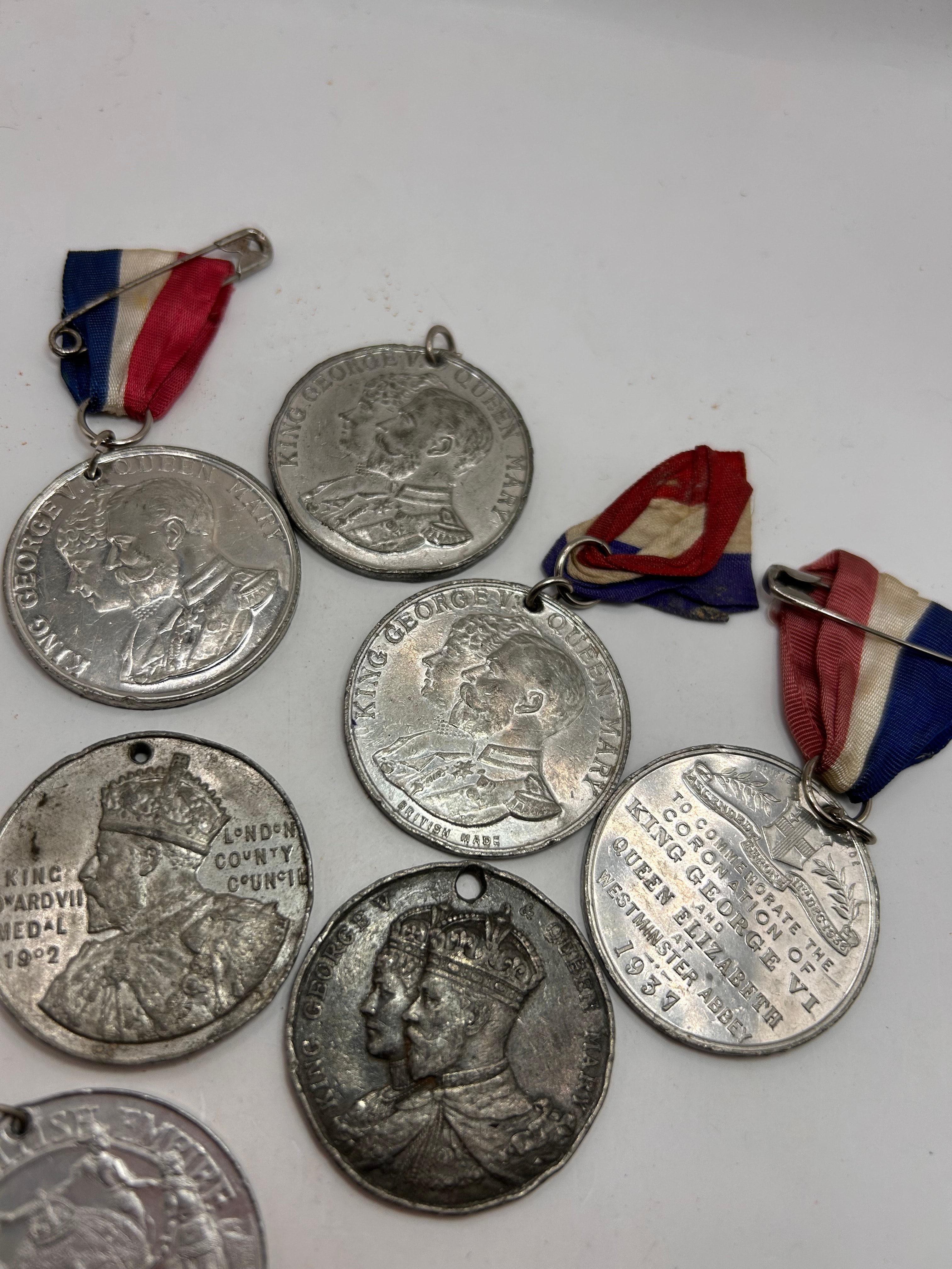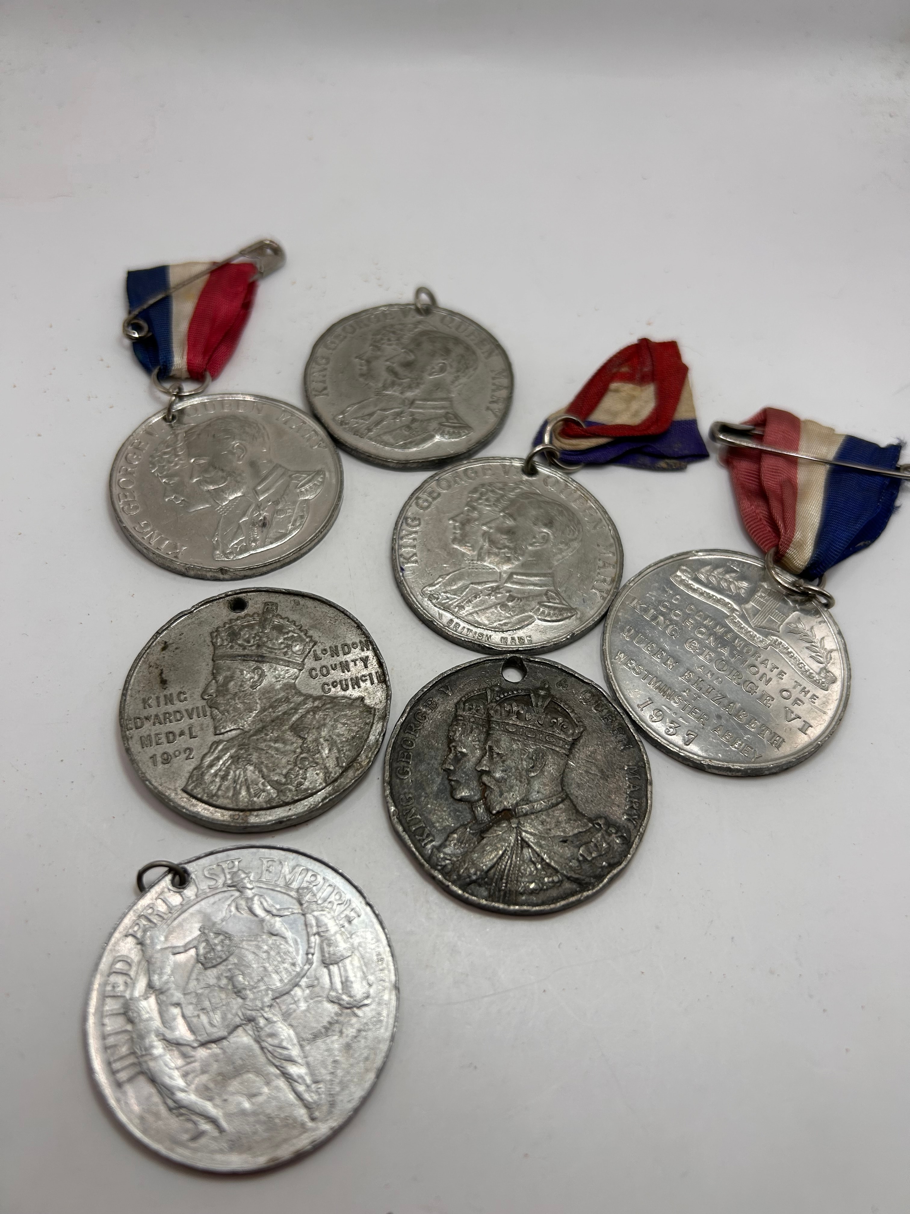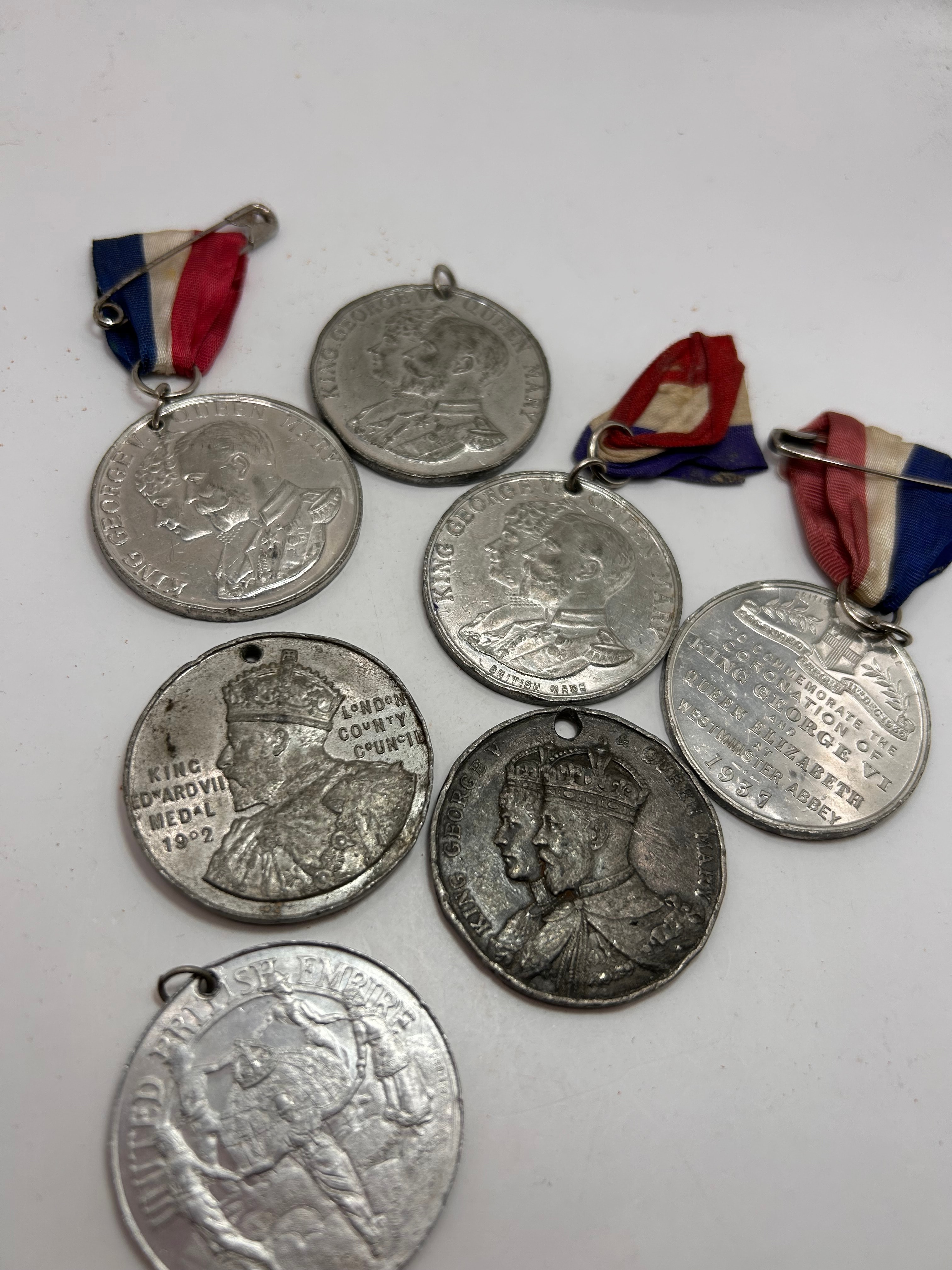 This lot presents eight circular commemorative medals, predominantly British royal in theme, dating from the early to mid-20th century. Fashioned from a silver-toned base metal, the medals feature various styles including crowned portrait busts of monarchs such as King Edward VII (1902), King George V, King George VI, Queen Mary, and Queen Elizabeth, alongside architectural and allegorical scenes. Visible inscriptions clearly identify events and figures, including “KING EDWARD VII MEDAL 1902 LONDON COUNTY COUNCIL”, “KING GEORGE V QUEEN MARY”, “KING GEORGE VI QUEEN ELIZABETH”, and “TO COMMEMORATE THE CORONATION OF KING GEORGE VI & QUEEN ELIZABETH WESTMINSTER ABBEY 1937”; some also bear the marking “BRITISH MADE” and one depicts “BRITISH EMPIRE”. Three of the medals retain their original red, white, and blue striped ribbons.