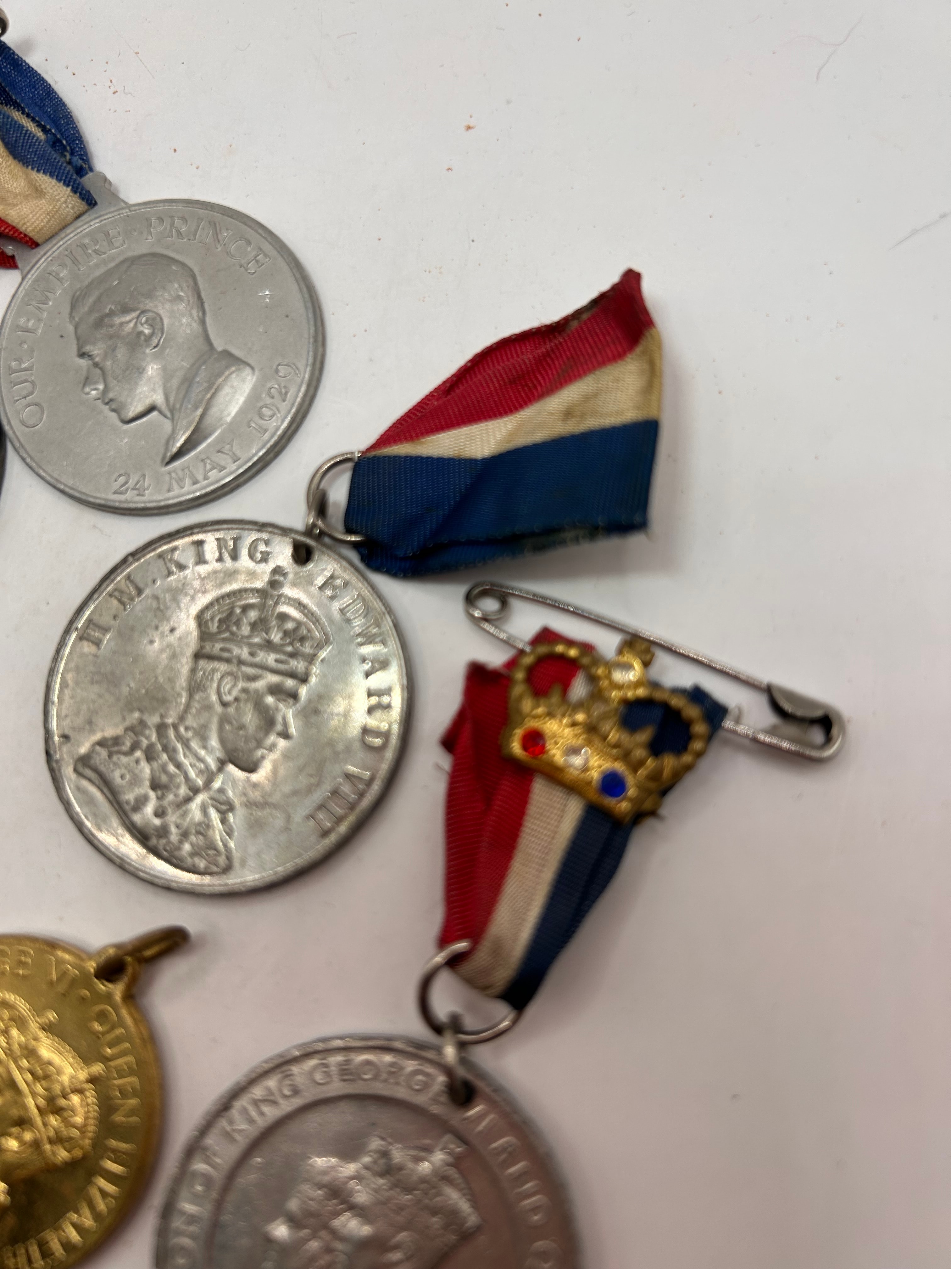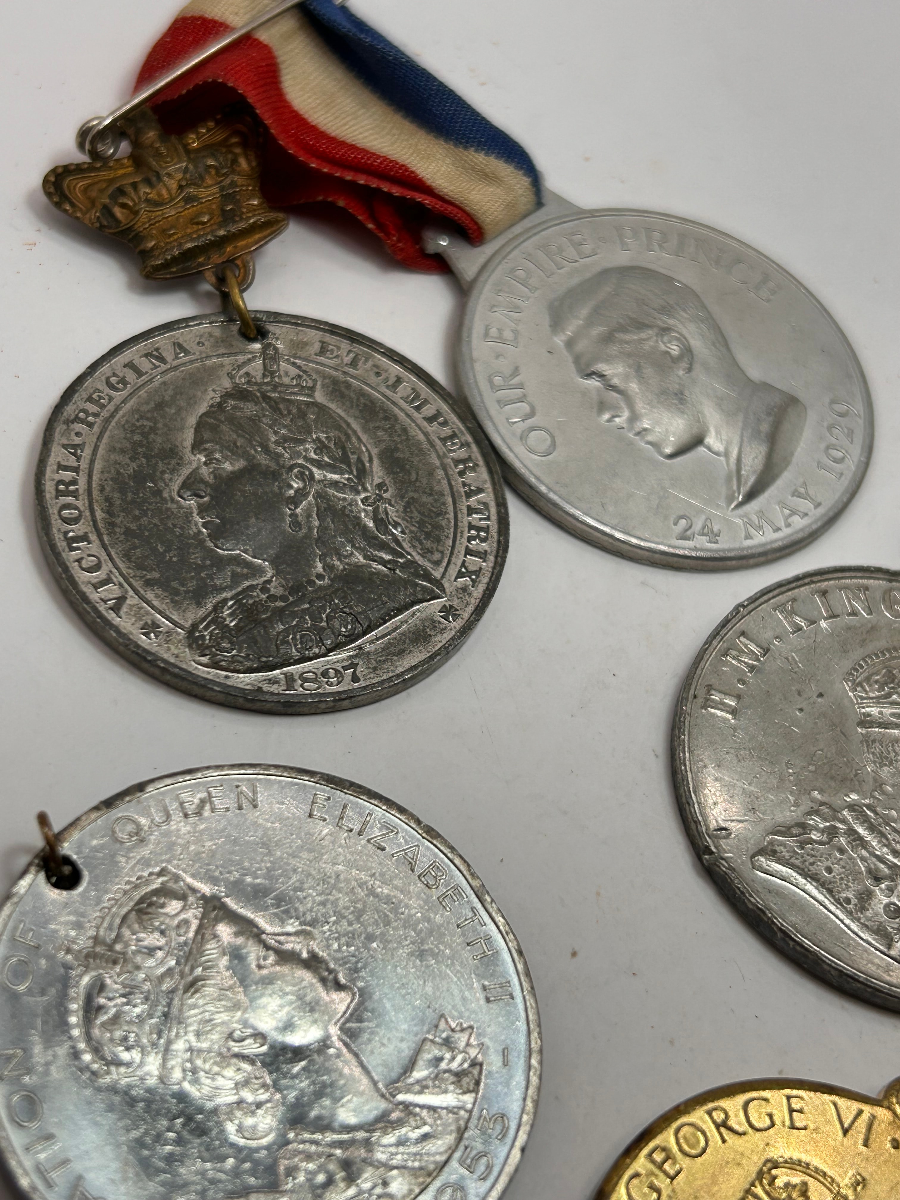 A collection of British Royal commemorative medals, dating from the late 19th to mid-20th century. The group comprises multiple full-size medals and one miniature medal, crafted primarily from silver-toned metal, with one partially visible gold-toned example. Each medal is adorned with red, white, and blue fabric ribbons, some attached via pins. Visible inscriptions include “VICTORIA REGINA ET IMPERATRIX 1897” depicting a crowned bust of Queen Victoria; “OUR EMPIRE PRINCE 24 MAY 1929” with a male profile; “H.M. KING EDWARD VIII 20 JAN 1936” with a crowned bust; and “QUEEN ELIZABETH II CORONATION 1953” with a bust of Elizabeth II. A partially visible medal also shows “KING GEORGE V QUEEN MARY”. The miniature medal is accented with a small, gold-toned crown.