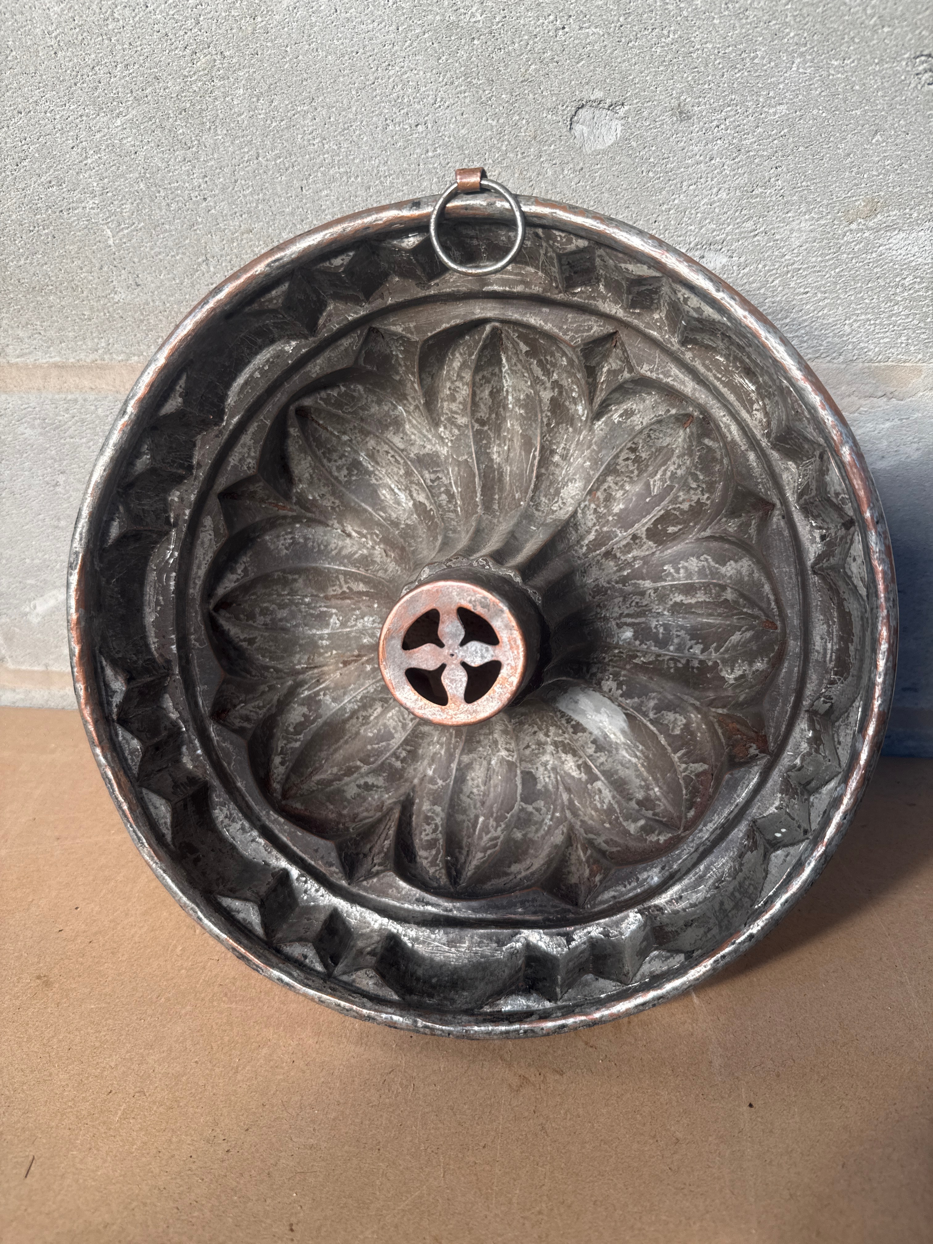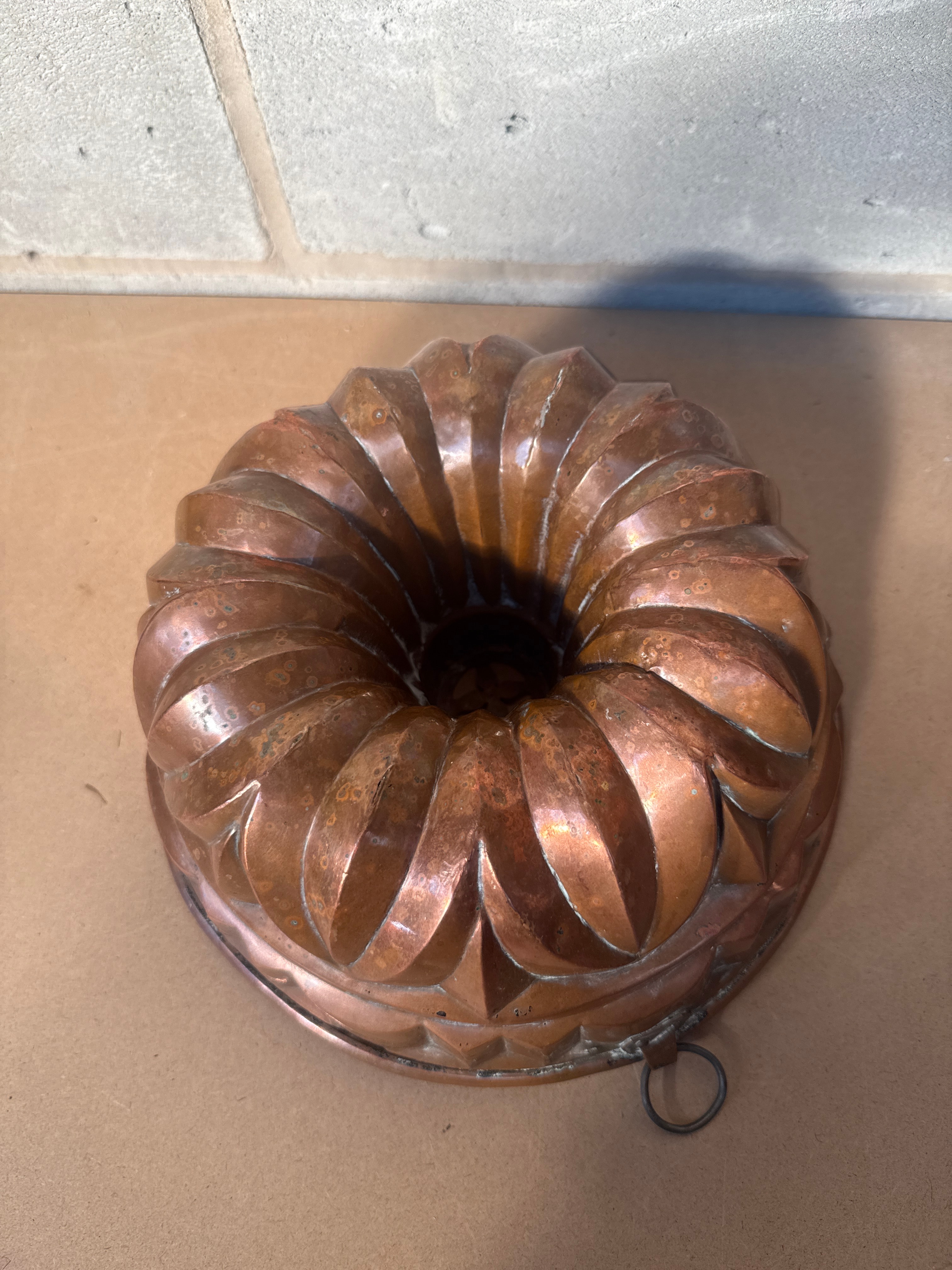 A Christian Wagner copper bundt cake mold, deep and circular, featuring deeply fluted or spiraled sides and a central tube with a cruciform cut-out or vent. The exterior displays an aged, uneven copper patina with minor surface irregularities and a small metal loop handle attached to the rim. The interior is tinned.