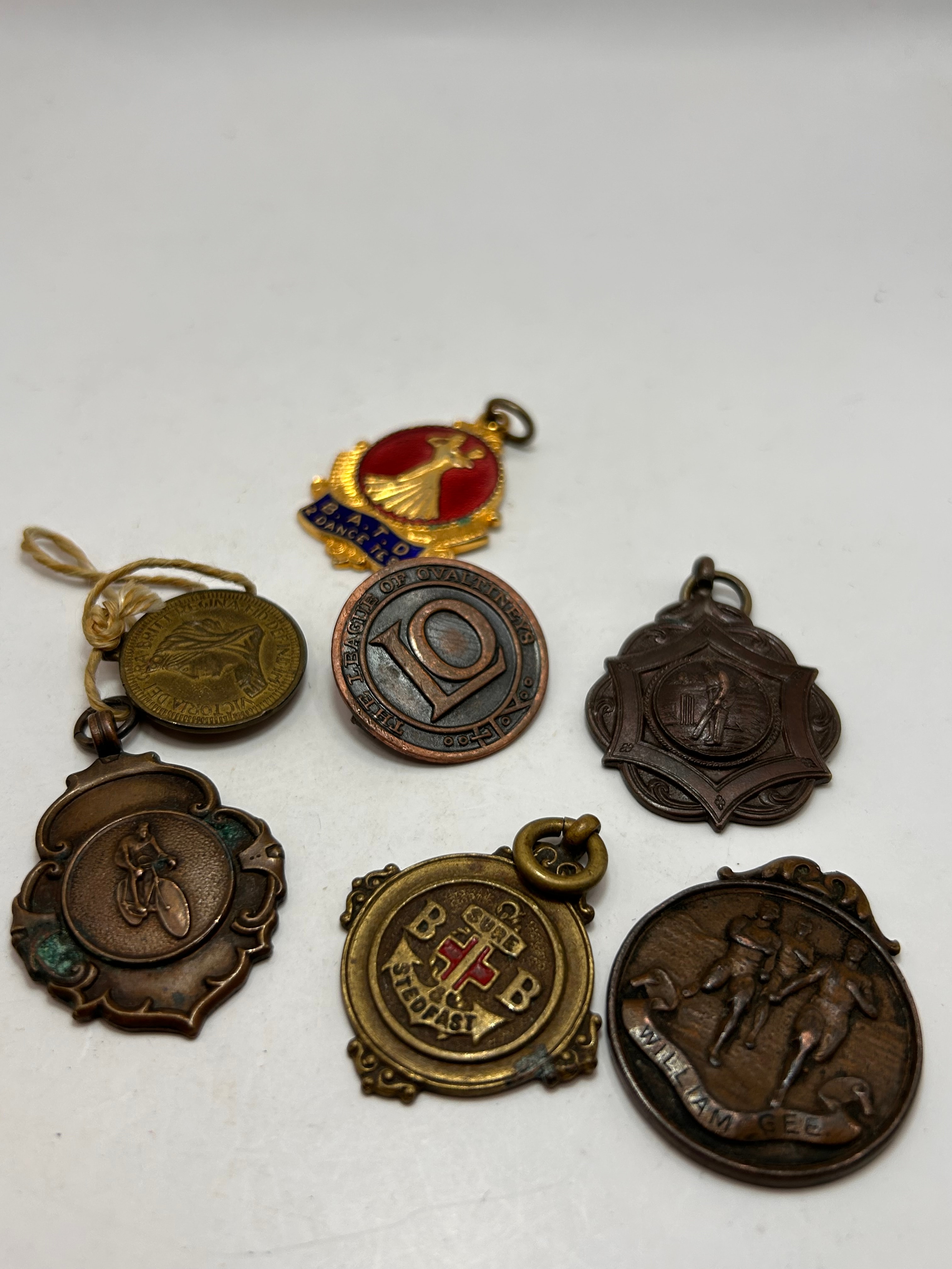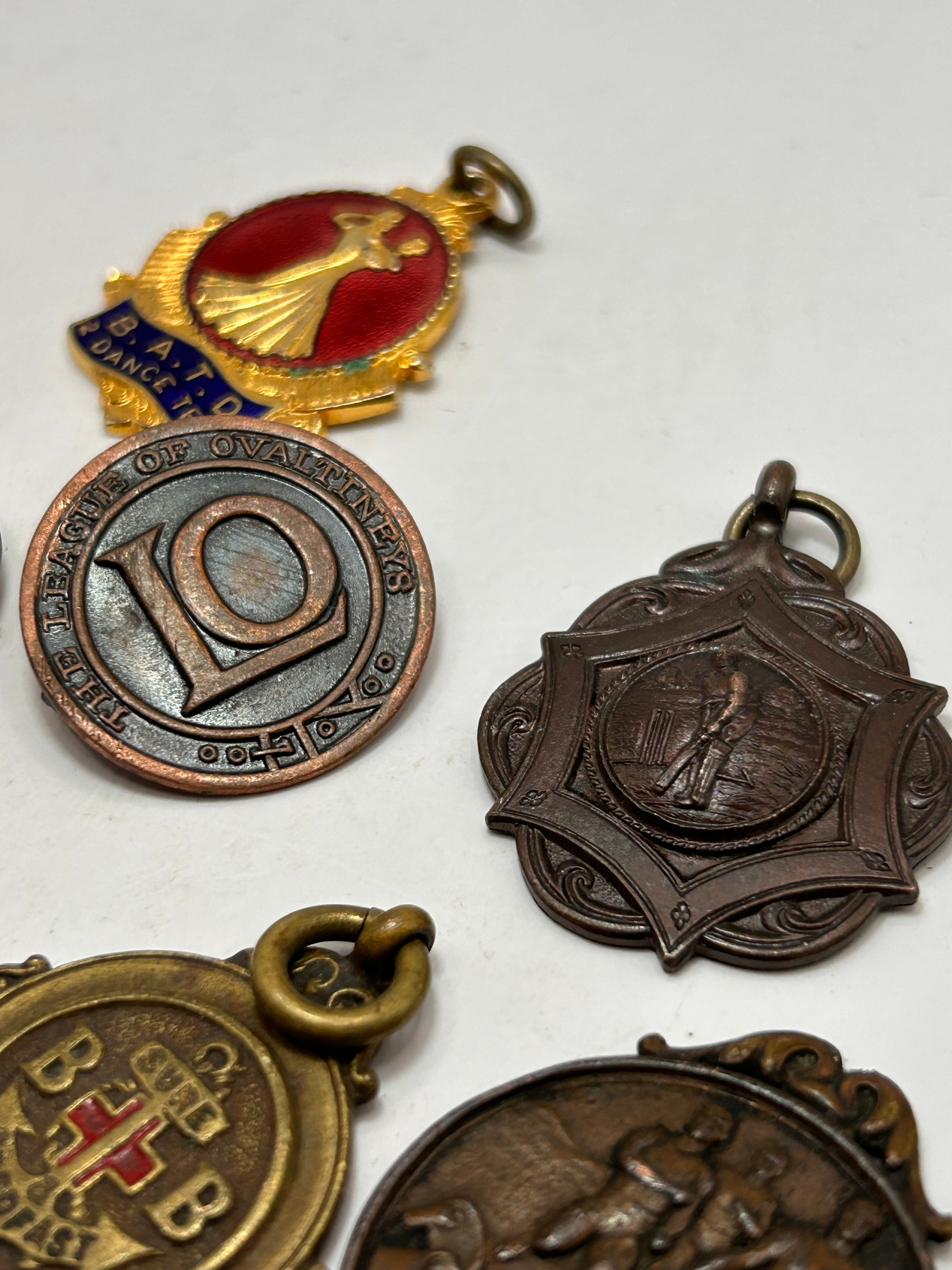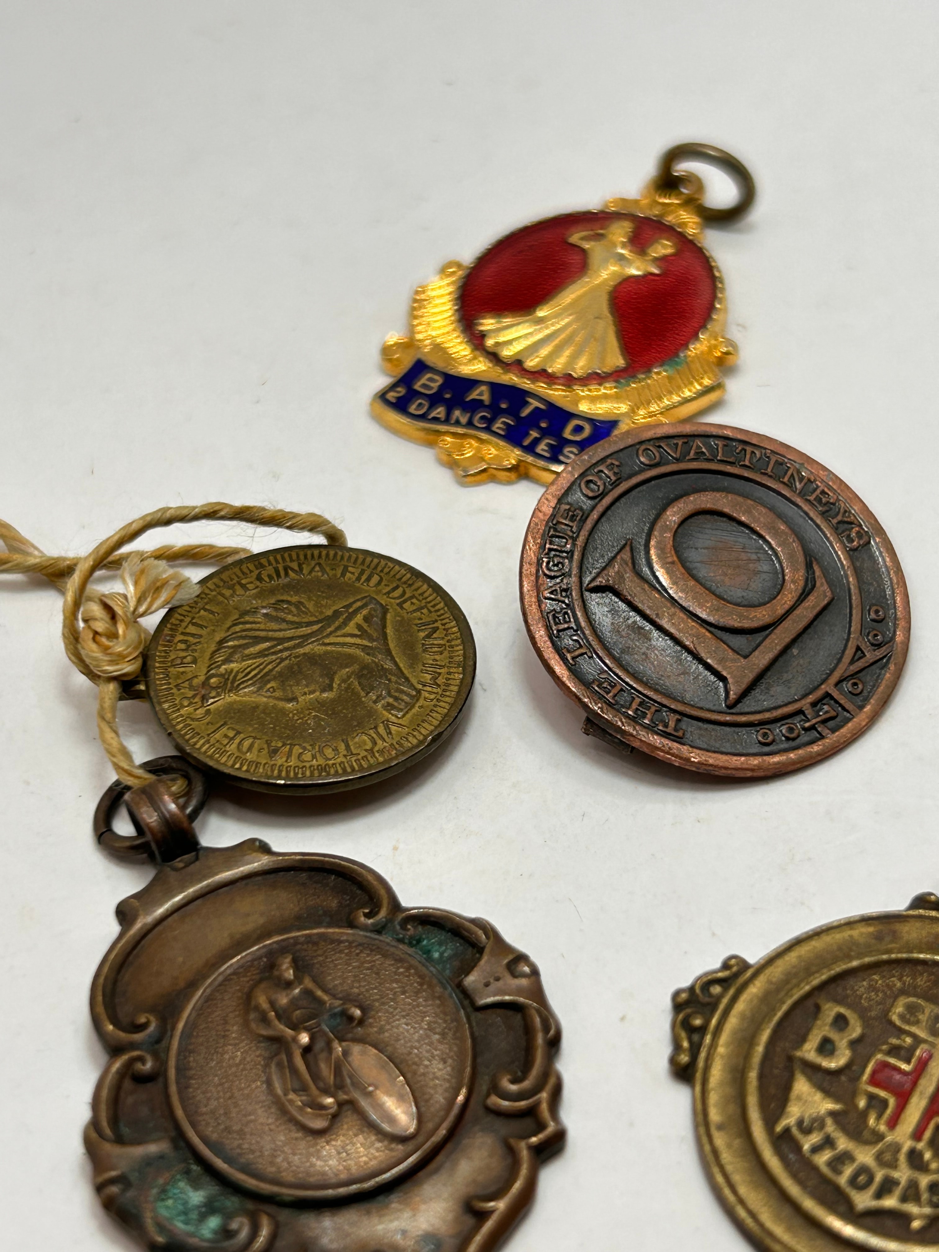 This lot comprises seven assorted vintage metal medals and commemorative charms, dating from the late 19th to mid-20th century. The items are primarily crafted from bronze and brass-tone alloys, with one piece featuring red and blue enamel on a gold-tone base. Notable inscriptions and designs include: a medal with ‘B.A.T.D. DANCE TES’ (likely ‘TESTS’) and a dancer figure, associated with the British Association of Teachers of Dancing; a coin-like piece tied with string inscribed ‘BRITISH REGINA VICTORIA’, referencing Queen Victoria; and a medal with ‘THE LEAGUE OF OVALTINE YS’ (likely ‘OVALTINEYS’) featuring a prominent ‘O’ logo, indicating an association with the popular children’s club. Other pieces display ‘B+B STEADFAST’ with a cross, ‘WILLIAM GEE’ below three figures in motion, a central image of a cyclist within an ornate frame, and a figure holding a staff within a distinct border.