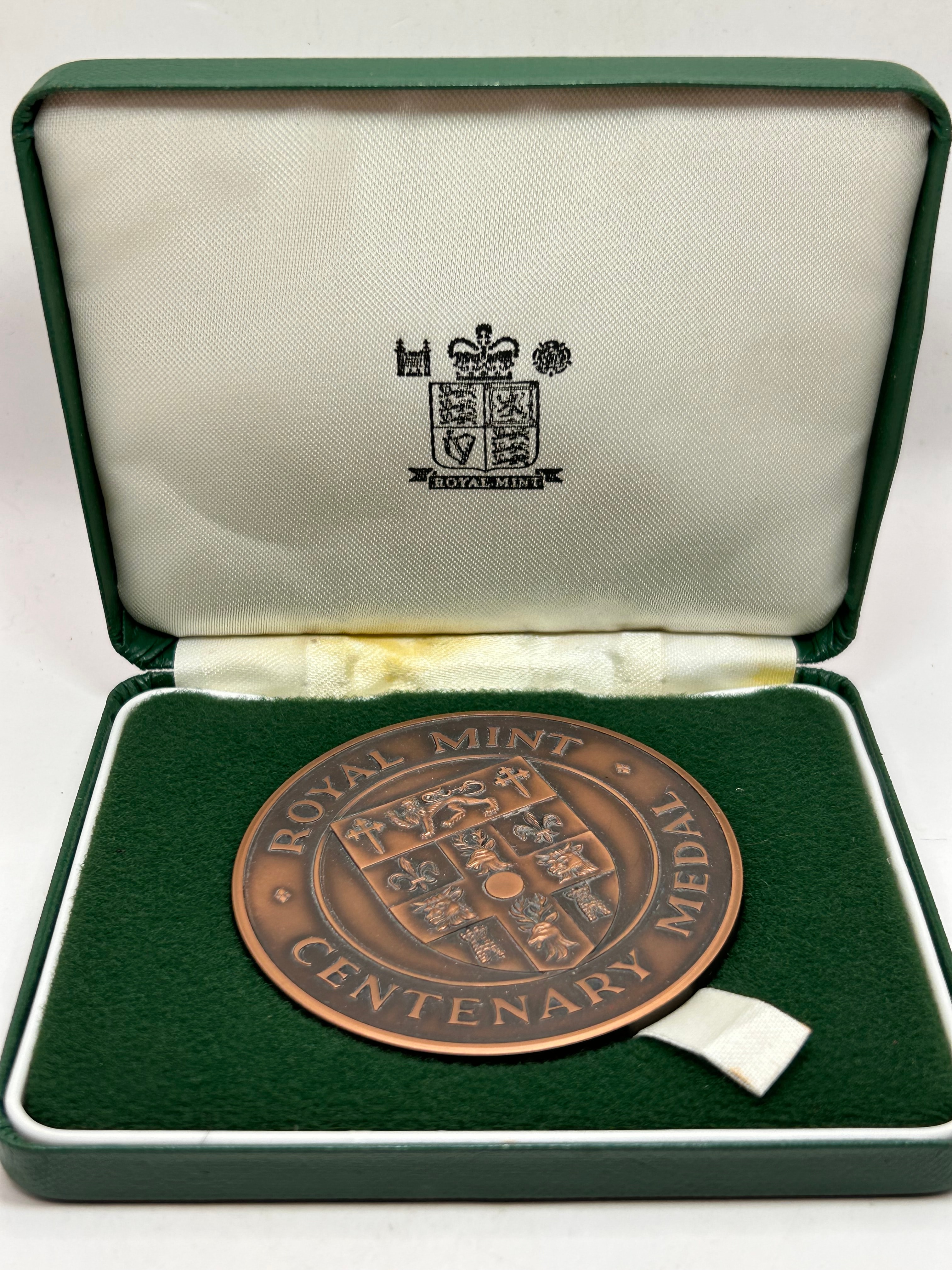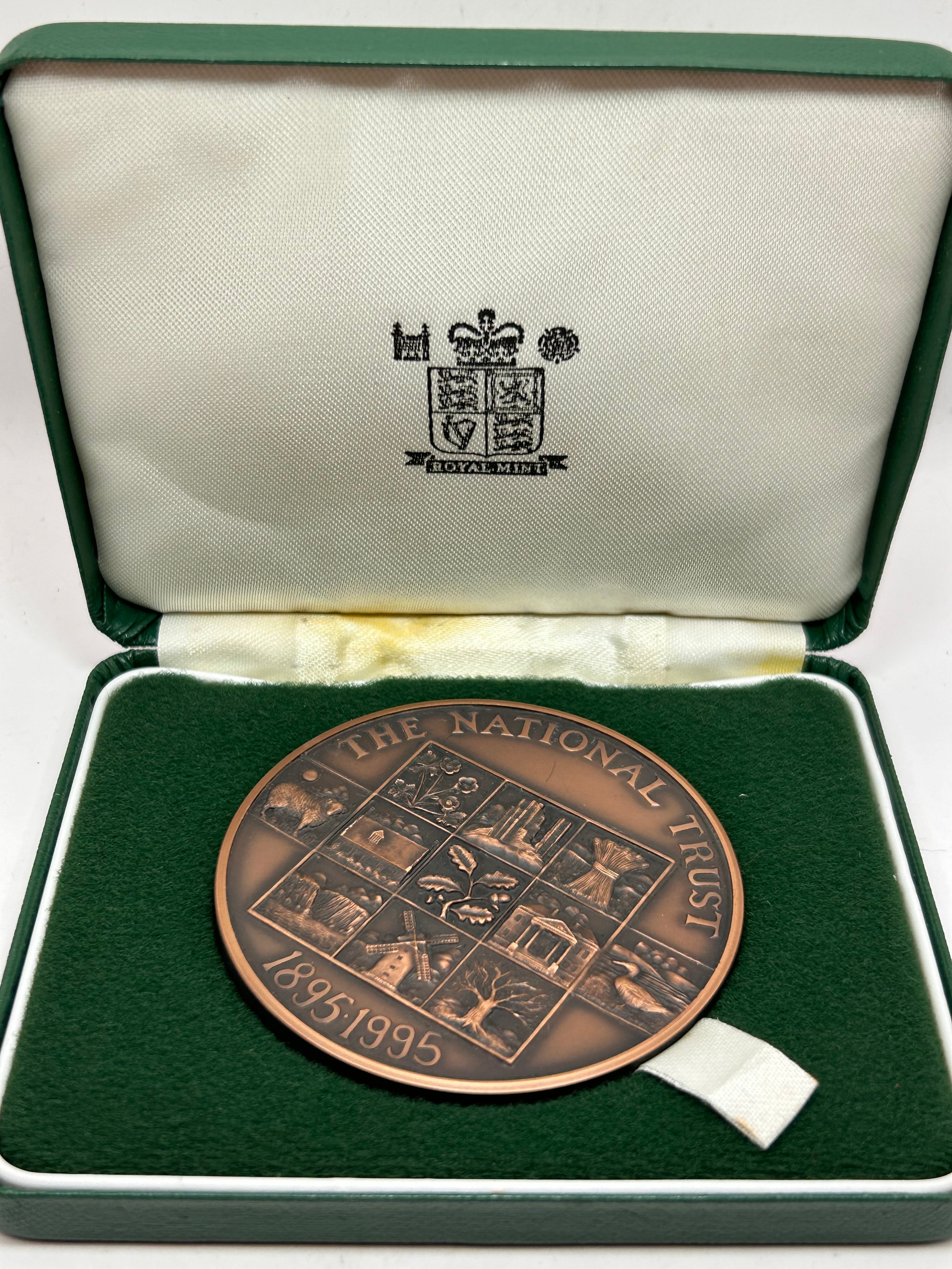 A Royal Mint ‘The National Trust Bronze Centenary Medal 1895-1995’. This commemorative medal is housed within its original dark green presentation case. The case lid’s cream fabric lining features a printed Royal Mint crest and text. The medal’s obverse displays a central heraldic shield, likely representing the Royal Arms, encircled by the text ‘ROYAL MINT CENTENARY MEDAL’. Its reverse depicts a grid of nine pictorial scenes relating to nature and heritage, alongside the inscription ‘THE NATIONAL TRUST 1895-1995’, establishing its purpose as commemorating the National Trust’s centenary. The apparent period is late 20th century, circa 1995.