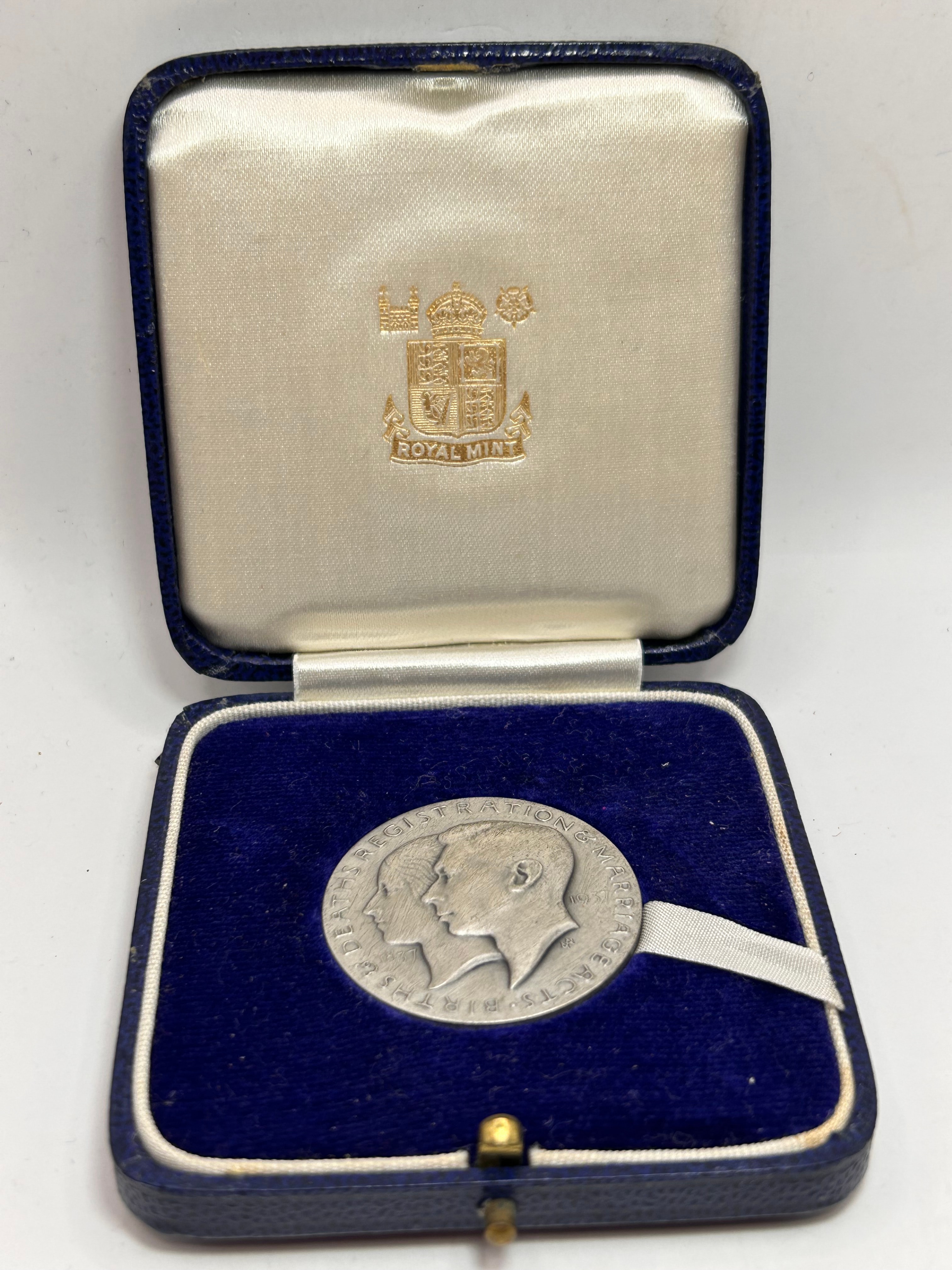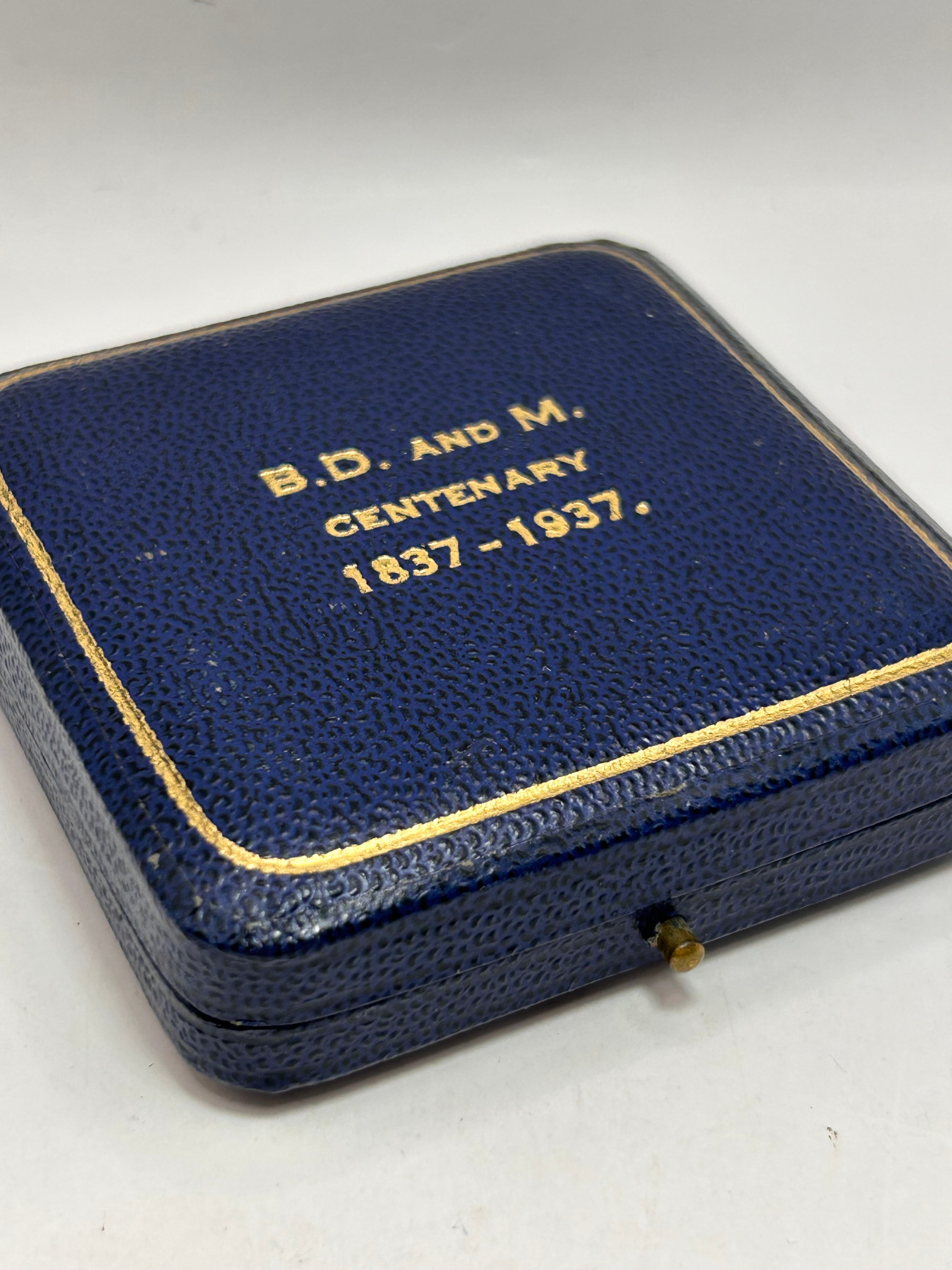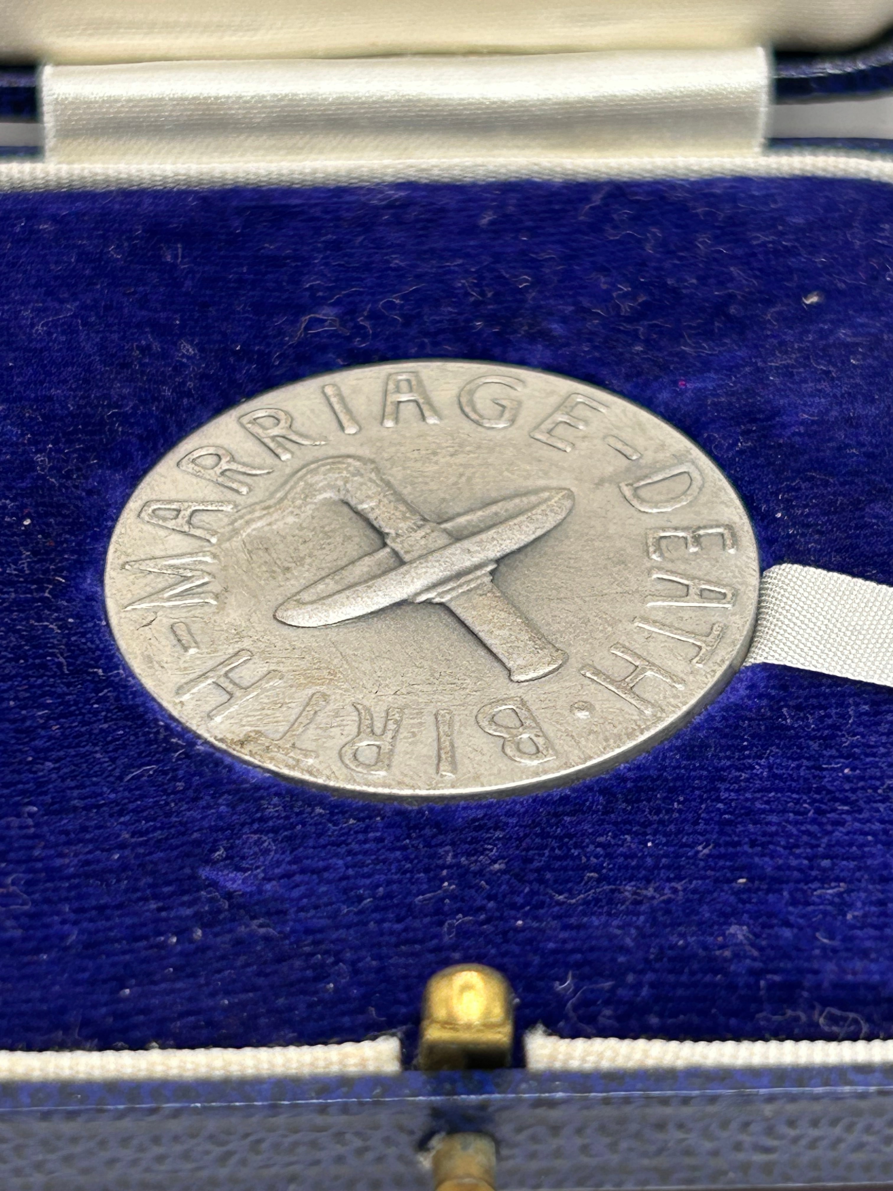 A Royal Mint Silver Medal commemorating the Centenary of the Births, Deaths & Marriages Registration Acts, 1837-1937. The silver-colored metal medal features a dual profile portrait of a man and a woman on one side, and a stylized cross motif on the other. Both sides are encircled by the legible text “BIRTH · MARRIAGE · DEATH”. It is presented in its original dark blue textured case, lined with blue velvet and cream satin. The interior of the lid bears a gold embossed Royal Mint crest and “ROYAL MINT” text. The exterior of the case is gold-stamped with “B.D. AND M.”, “CENTENARY”, and “1837 – 1937.”.