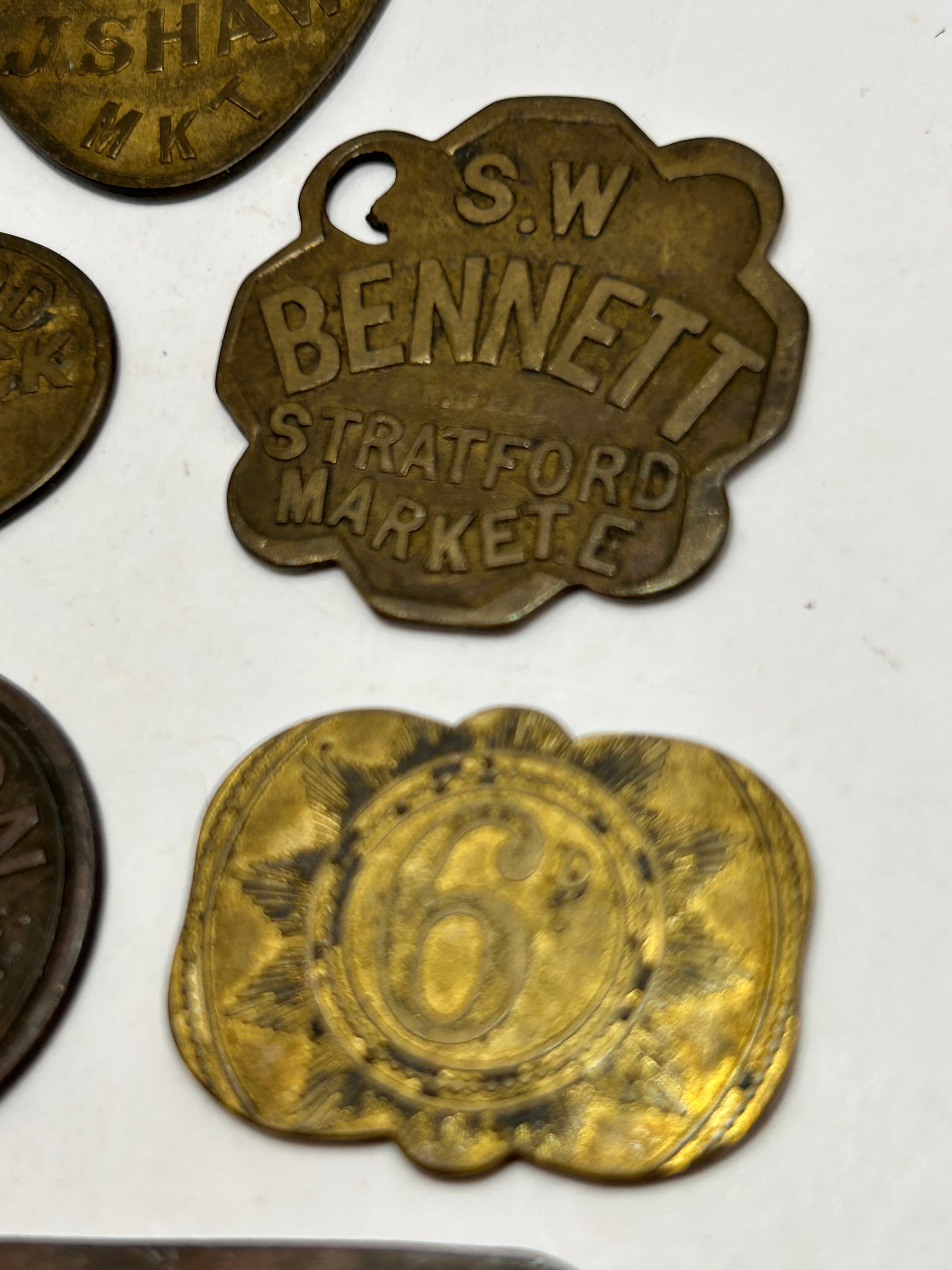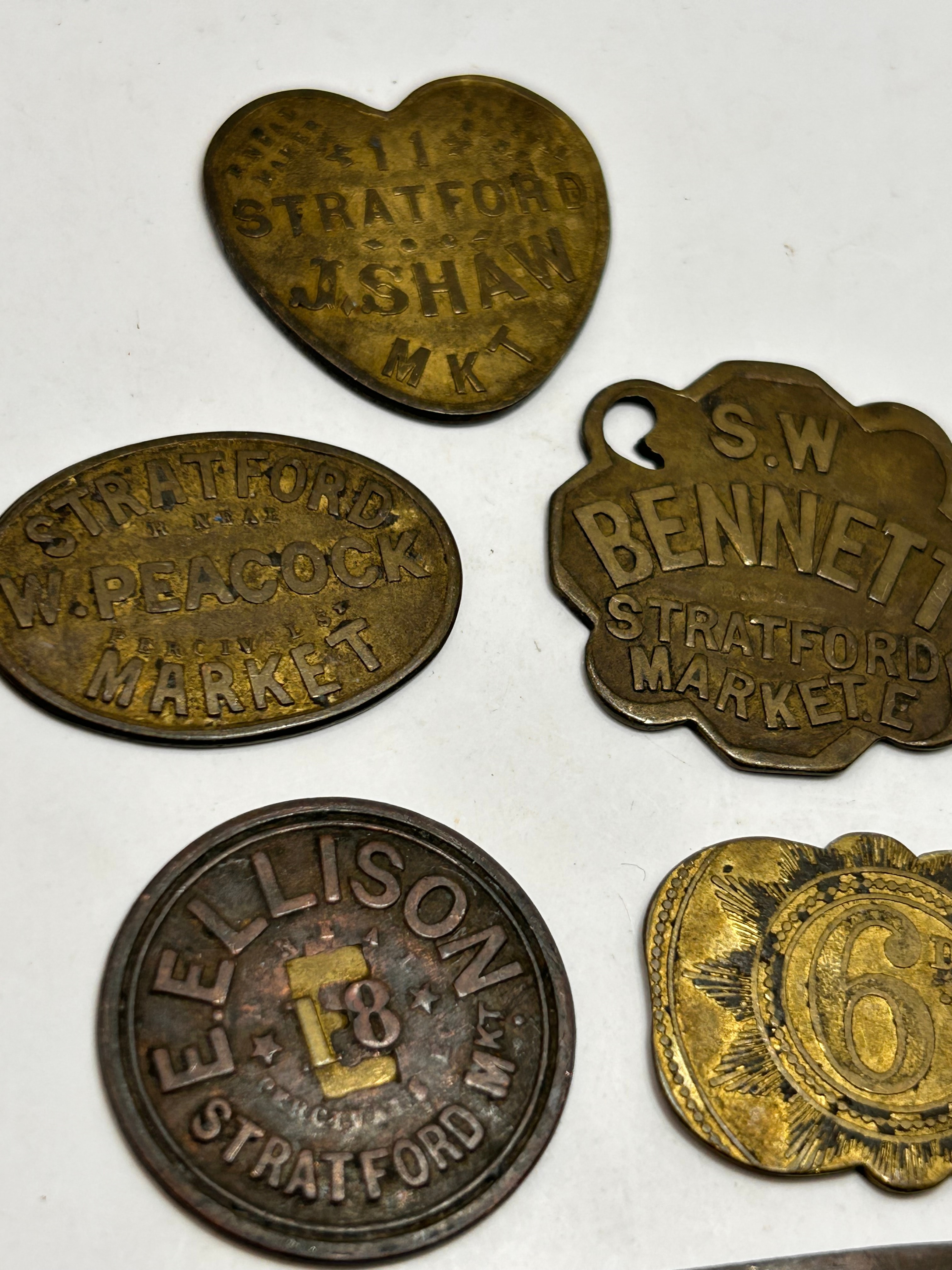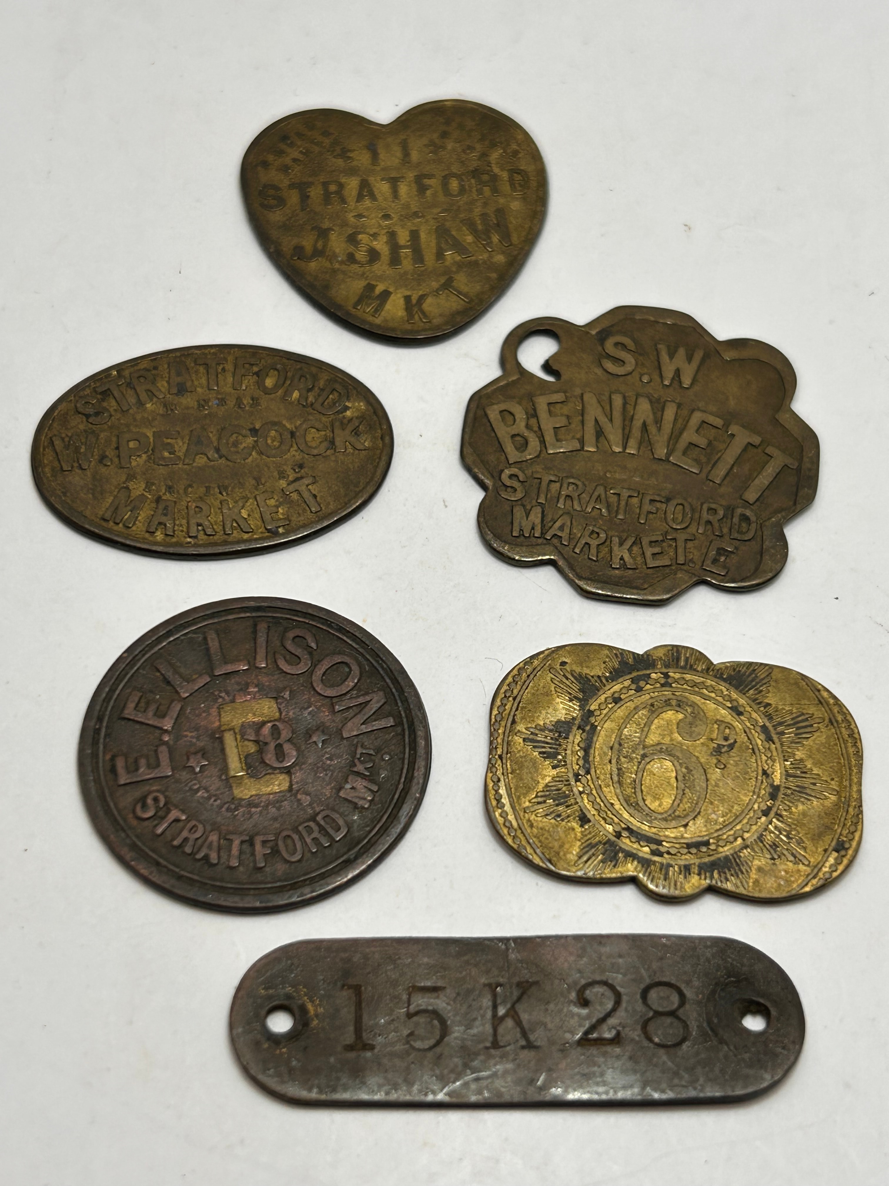 A collection of six varied antique or vintage metal tokens and tags, predominantly crafted from brass or bronze, exhibiting differing patinas and surface wear. These items are identified as market tokens, likely originating from a market in Stratford, UK. The shapes include a heart, an oval, an irregular cloud-like form with a suspension hole, a circular token, a decorative shield-like piece, and a rectangular tag with two holes. Inscriptions across the pieces repeatedly feature “STRATFORD” and “MARKET” (or “MKT”), alongside merchant names such as “A. SHAW”, “W. PEACOCK”, “S.W. BENNETT”, and “F. ELLISON” (with “F8”). One ornate token displays a large “6” with a superscript “d” (denoting “six pence”) and the number “19”, set within a radial design. The rectangular tag is stamped “15 K 28”.