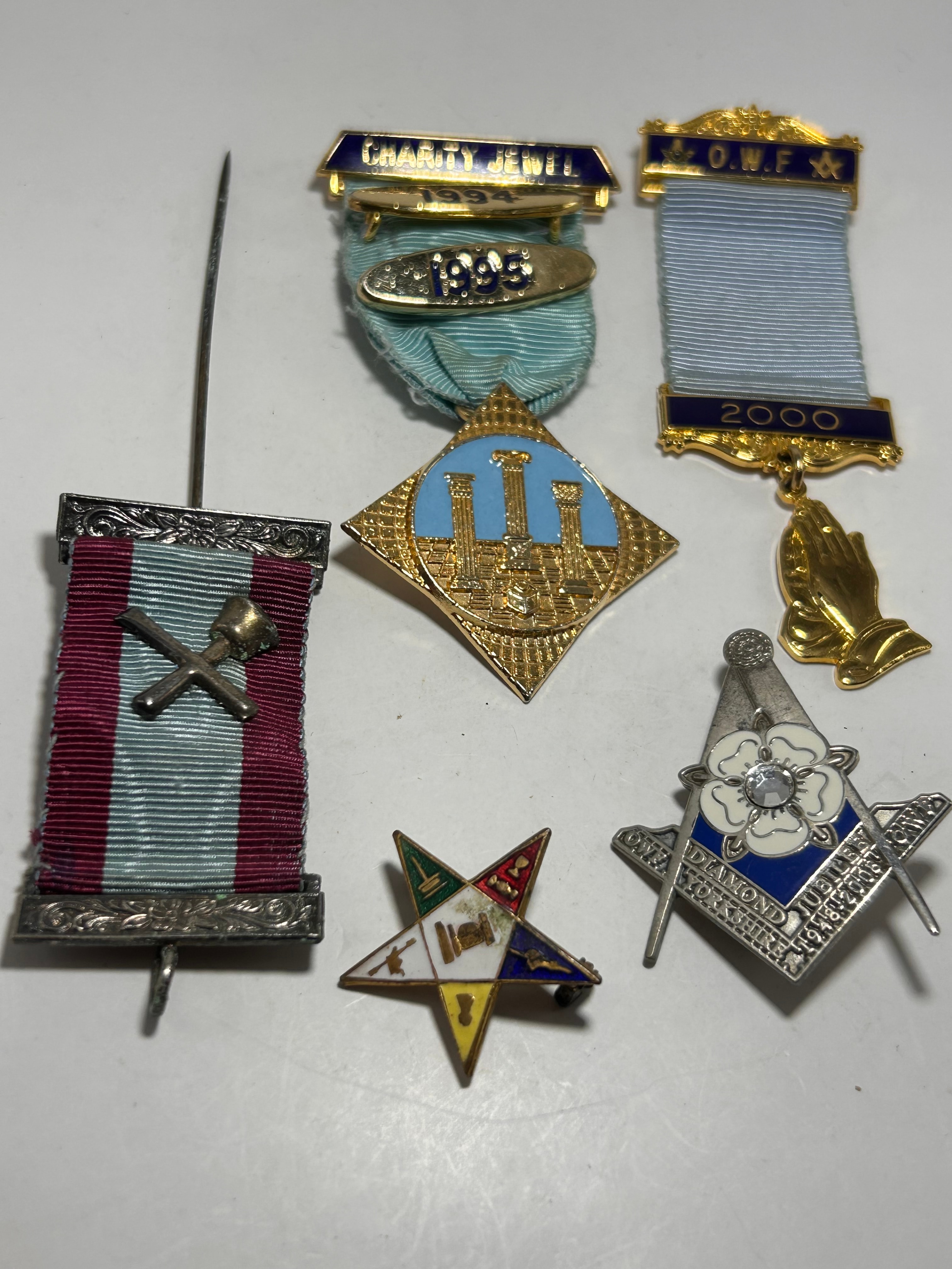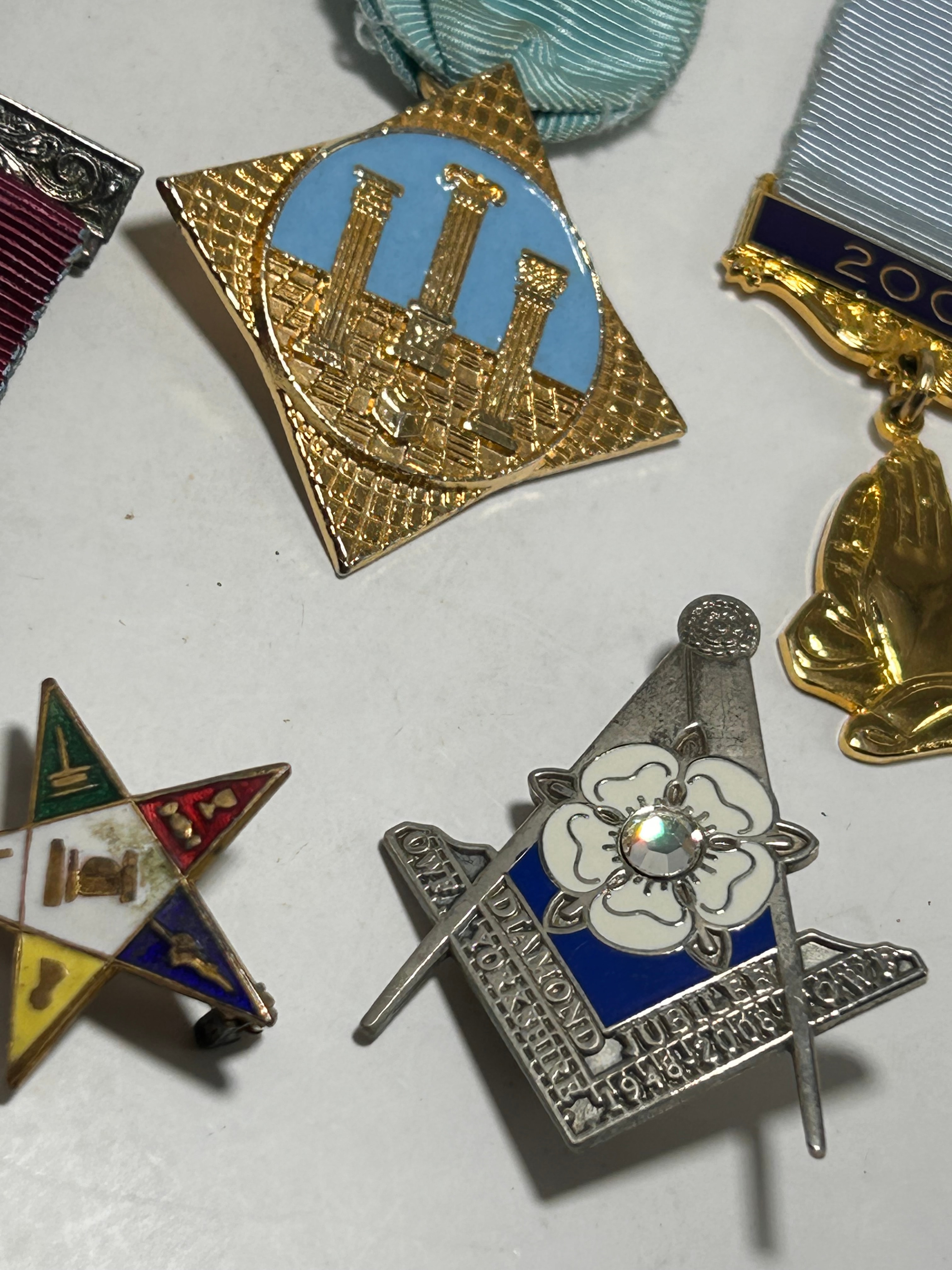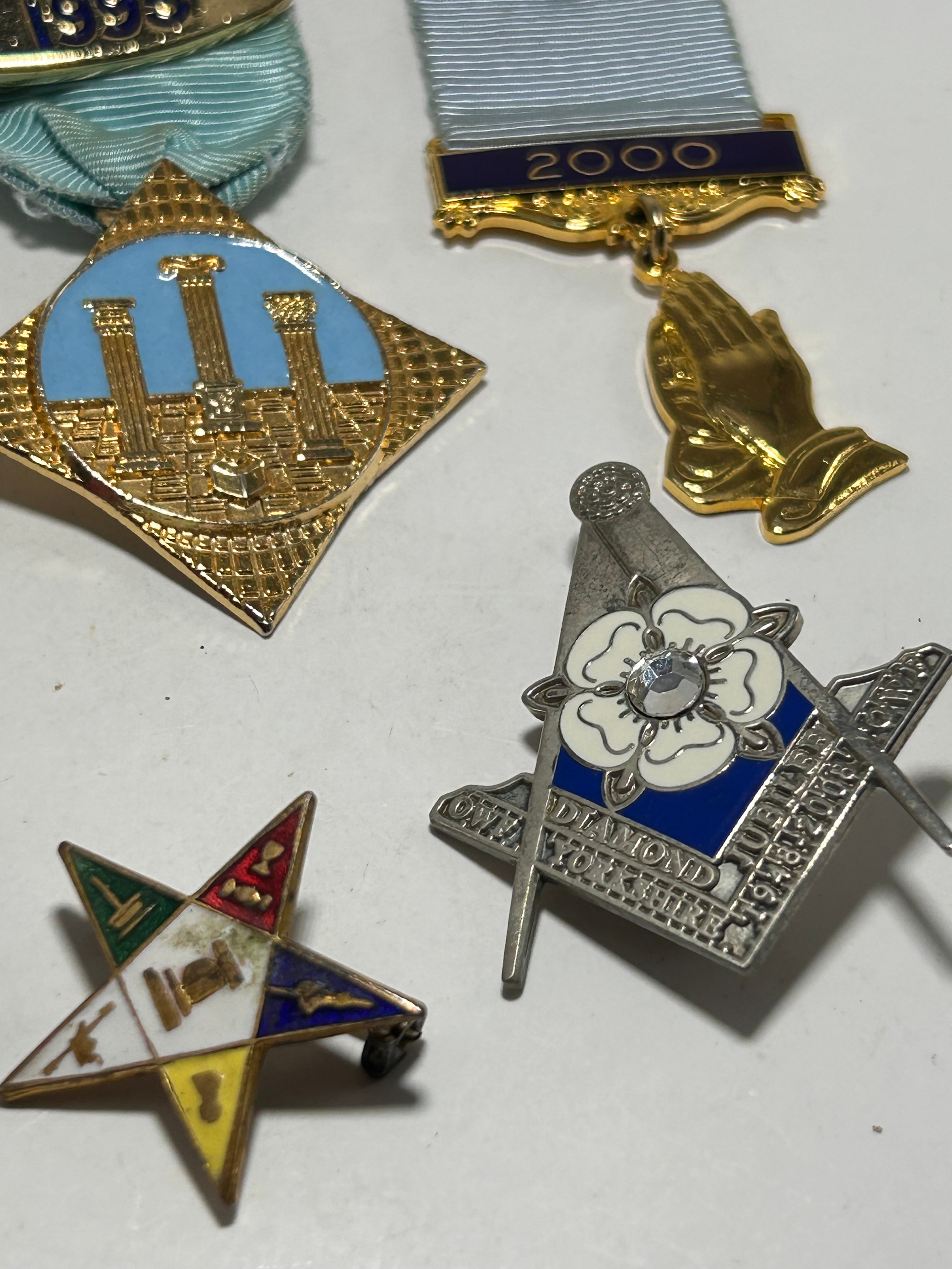 An Order of Women Freemasons Yorkshire 1948-2008 Diamond Jubilee Badge, designed as a silver-tone square and compass emblem featuring an enameled white rose with a central clear stone, inscribed “DIAMOND JUBILEE 1948-2008” and “YORKSHIRE”. Also included is a gold-tone medal with a bar inscribed “O.N.W.F.” and “2000”, suspending a praying hands pendant, attached to a light blue ribbon. Another gold-tone medal features a bar partially visible with “CHARITY JEWEL” and “1994”, suspending a square emblem with three gold classical columns on a blue enameled background, attached to a light blue ribbon. A five-pointed star pin, multi-colored with various enameled symbols, consistent with the Order of the Eastern Star, is also present. A final medal, partially seen, has a maroon and light blue striped ribbon with a silver-tone bar displaying a crossed mace or staff motif. The items are primarily in gold-tone and silver-tone finishes with enameled details and attached ribbons.
