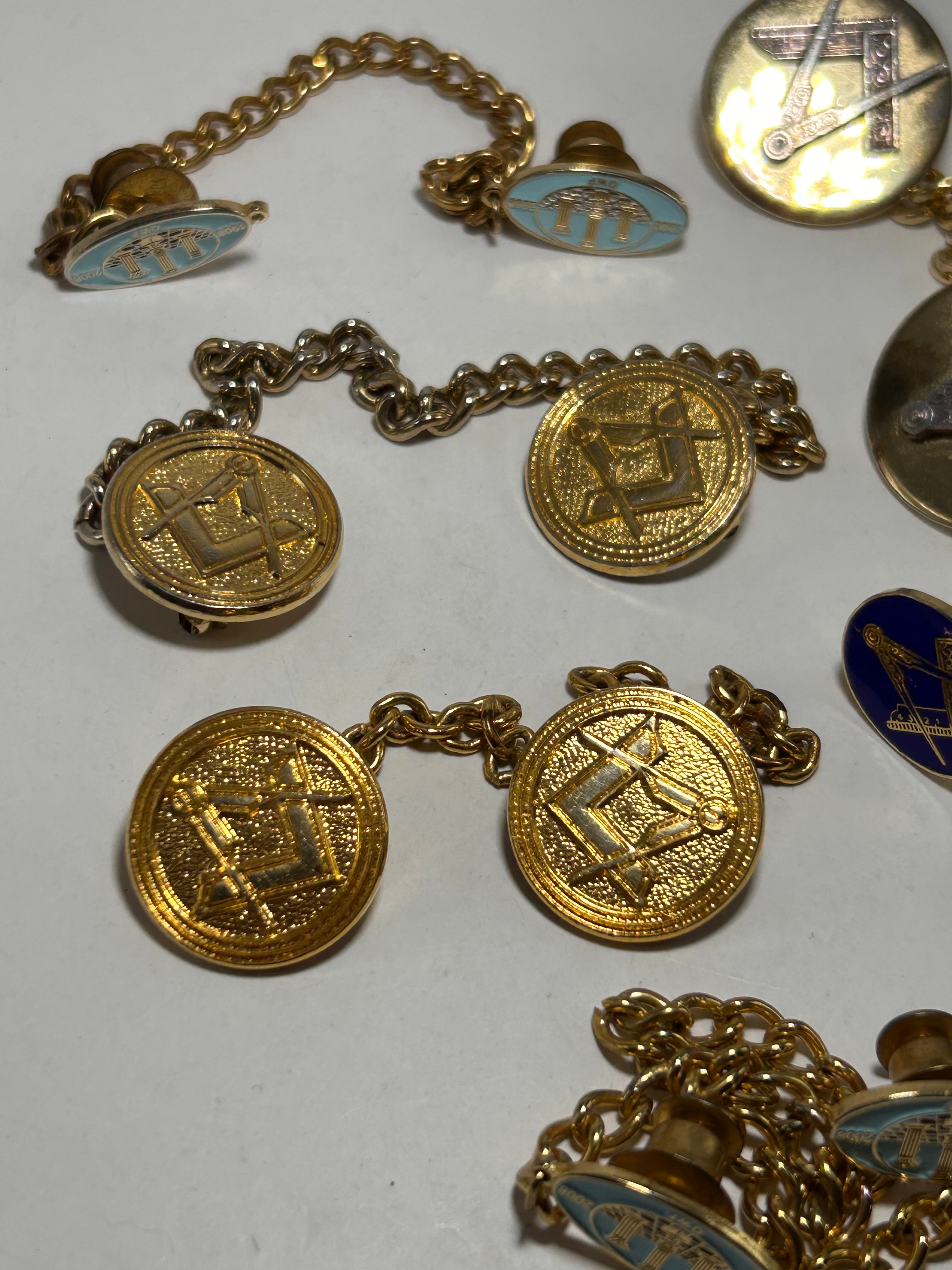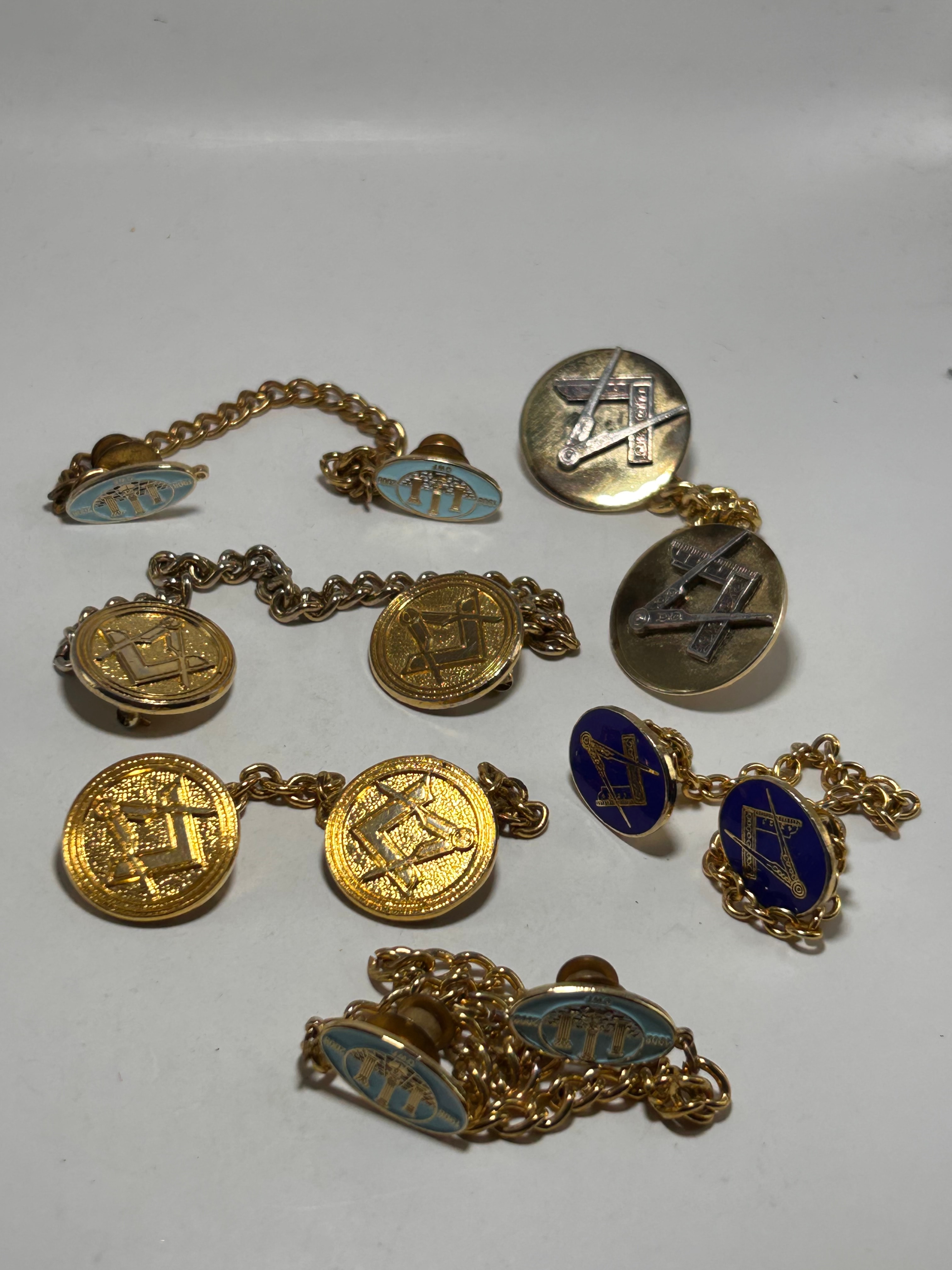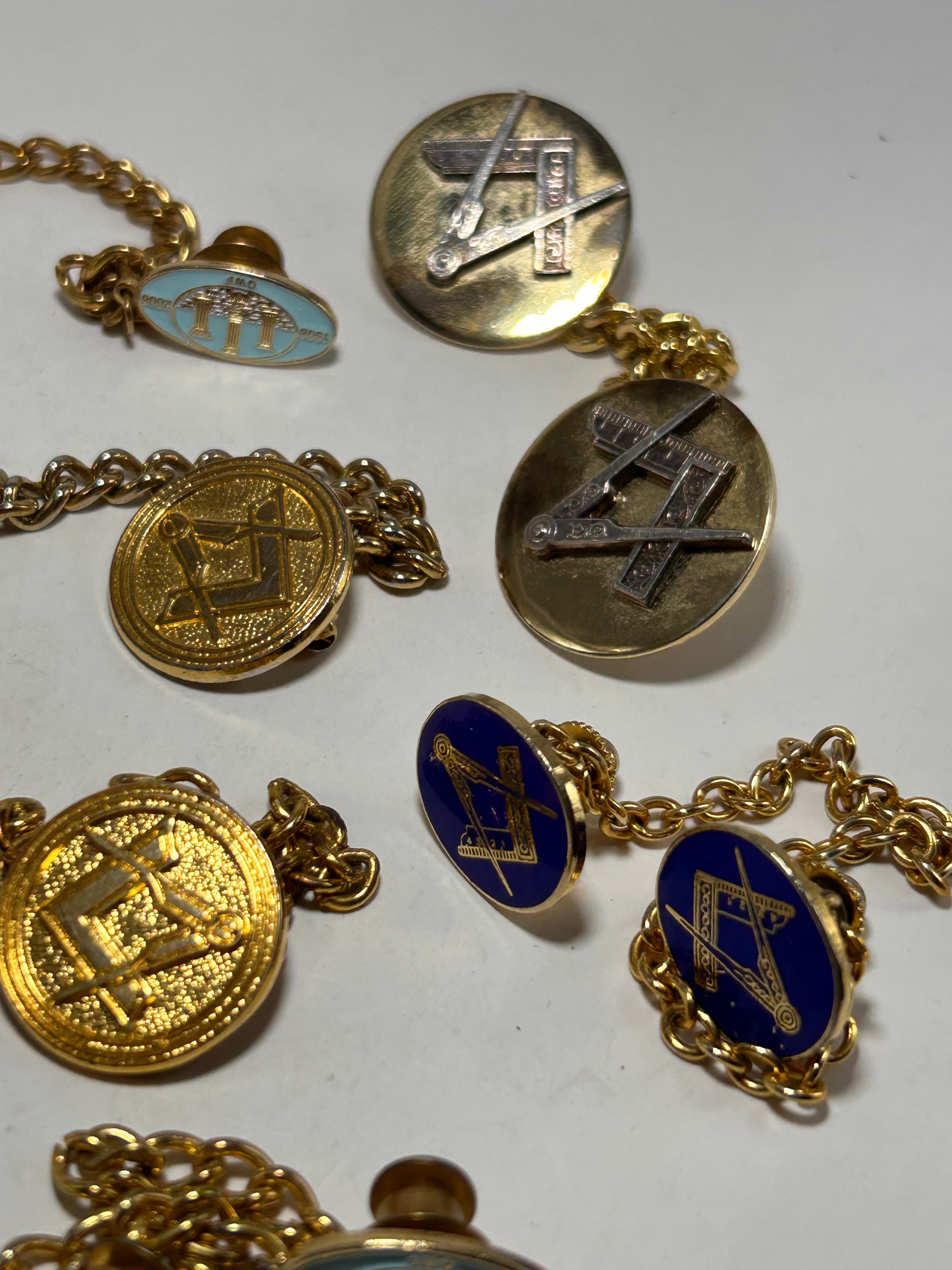 This collection comprises various fraternal jewelry items, including multiple sets of cuff links and individual lapel pins or tie tacks, many connected by short chains. Crafted primarily from gold-tone base metal, several pieces feature accents of light blue or dark blue enamel. The dominant iconography is Masonic, displaying the compass and square emblem, frequently with the letter ‘G’ positioned centrally, while other designs include the level and plumb bob. A distinct motif on some items presents a stylized numeral ‘3’ or ‘III’ within an architectural archway or set of pillars.
