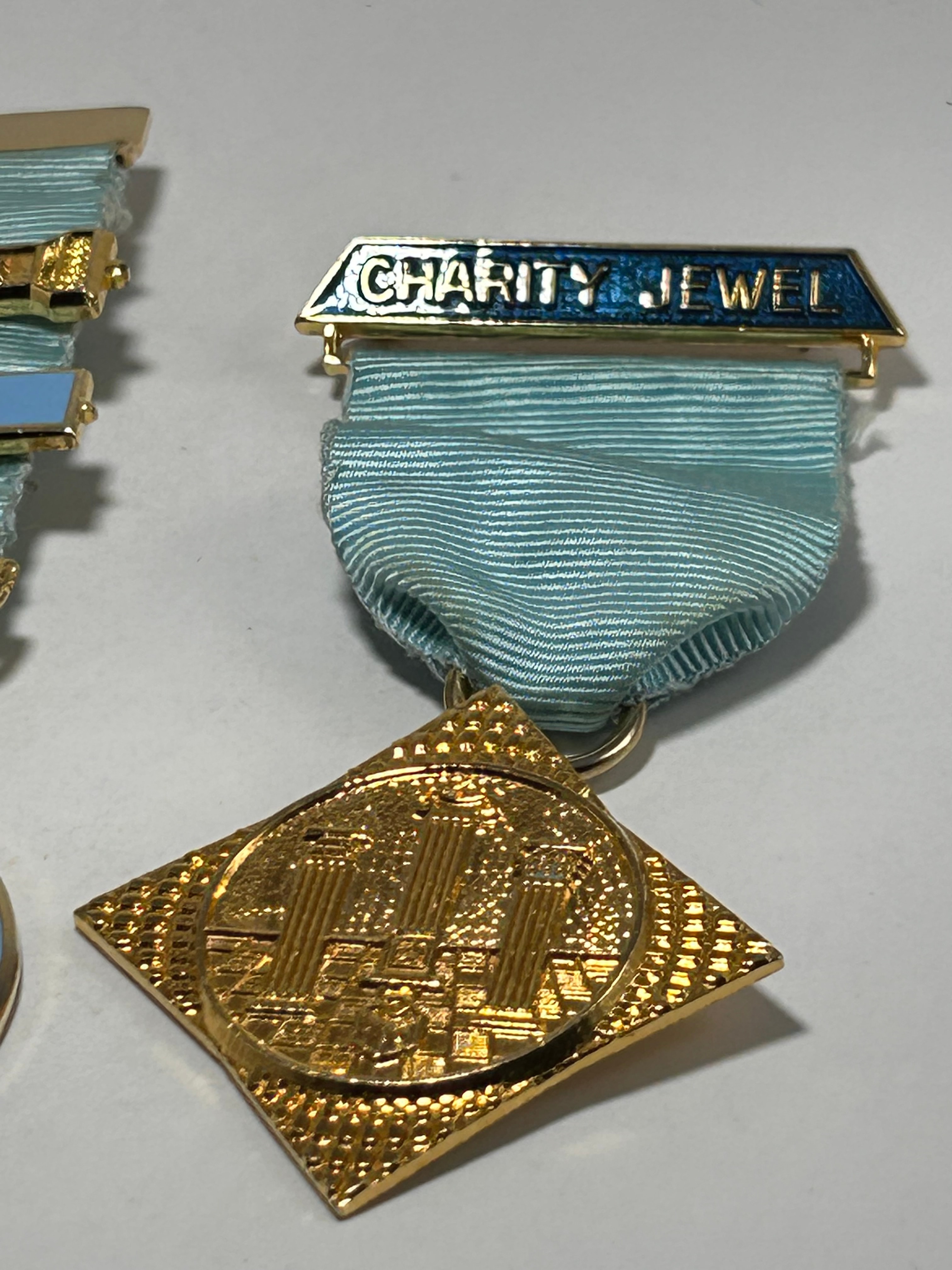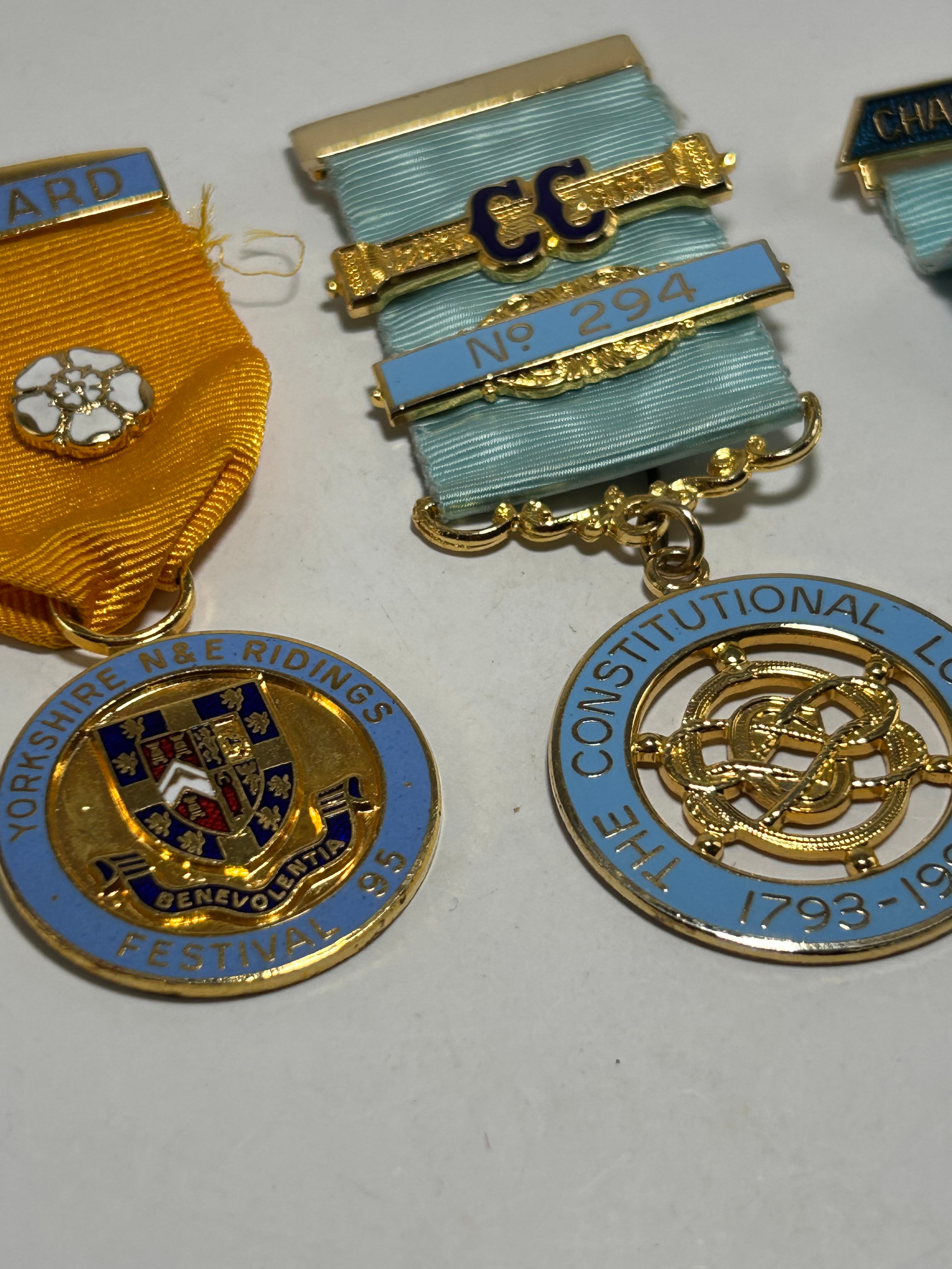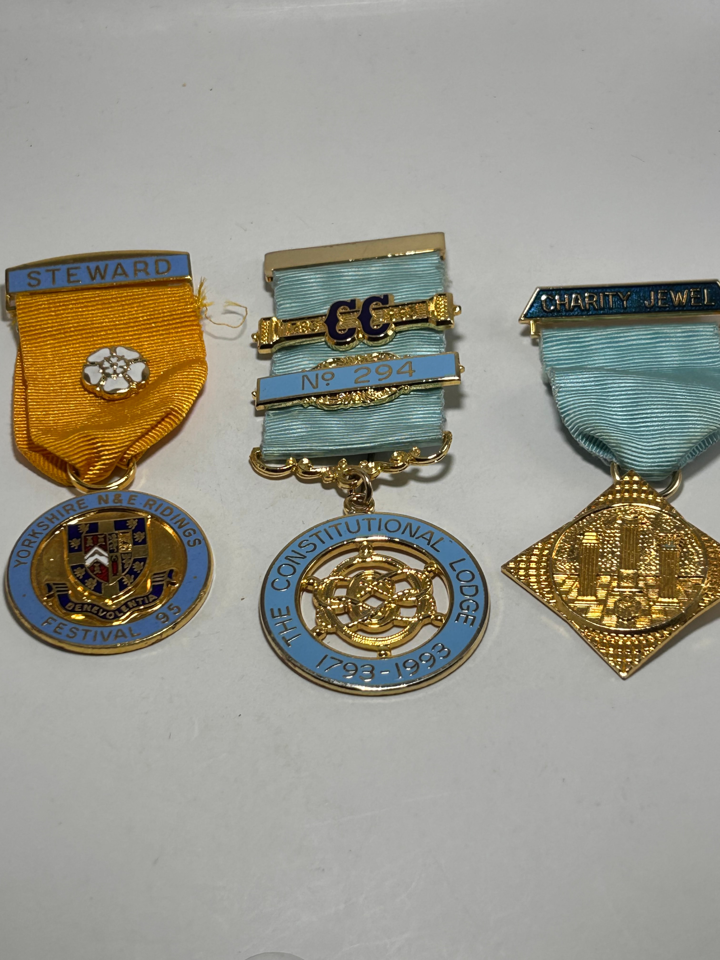 A group of three Masonic craft lodge and festival jewels, predominantly crafted from gold-tone metal with enamel accents and fabric ribbons. The leftmost jewel features a yellow fabric ribbon with a ‘STEWARD’ bar and a circular medal inscribed ‘YORKSHIRE N & E RIDINGS FESTIVAL BENEVOLENTIA 95,’ indicating a 1995 event, and includes a white rose emblem. The central jewel, on a light blue fabric ribbon, has ‘CC’ and ‘No 294’ bars, with a circular medal marked ‘THE CONSTITUTIONAL LODGE 1793-1993,’ commemorating a bicentennial, and a complex knot design. The rightmost piece, also on a light blue fabric ribbon, carries a ‘CHARITY JEWEL’ bar and a diamond-shaped medal depicting an ornate building structure with a prominent ‘G’ within.