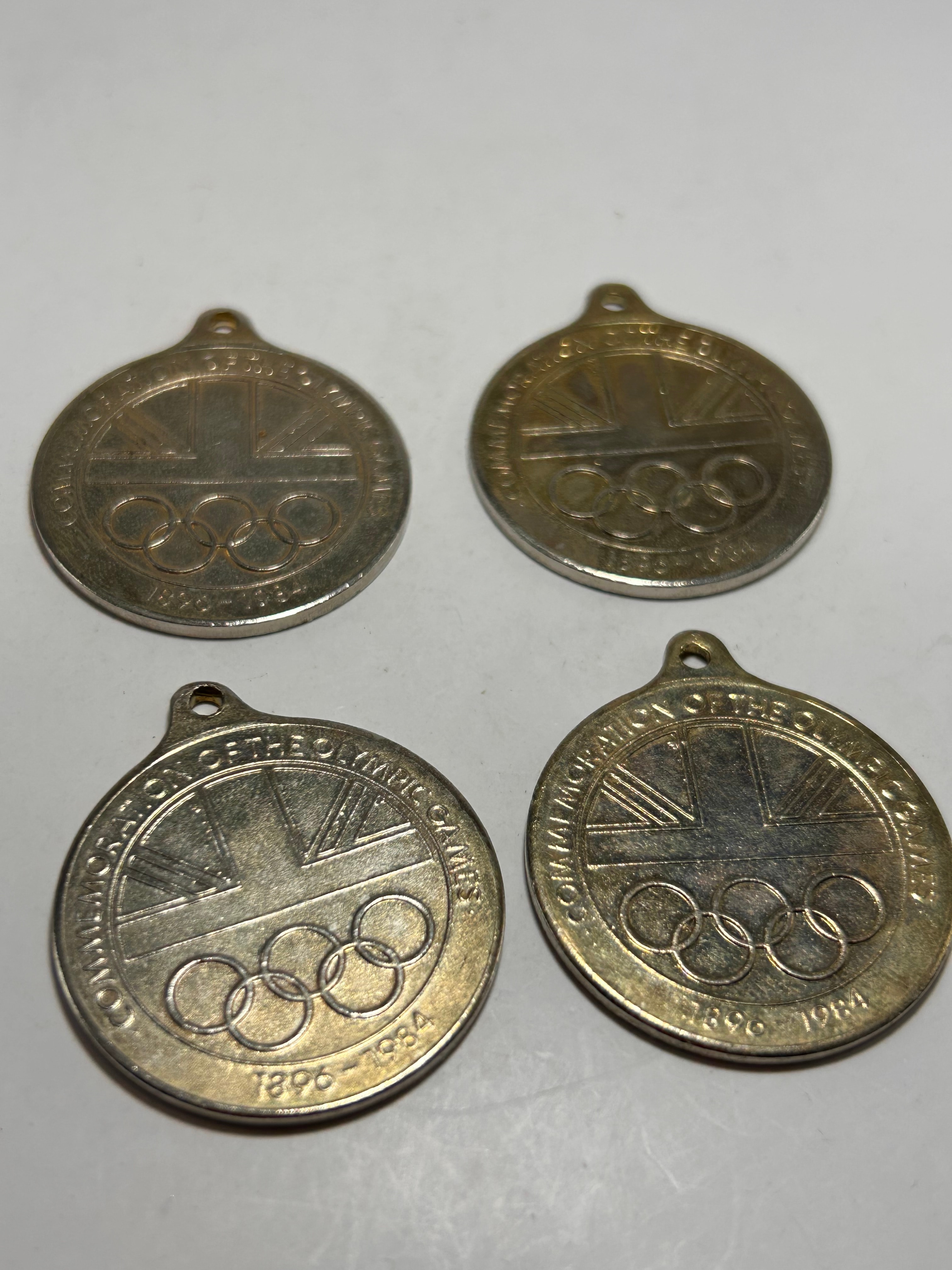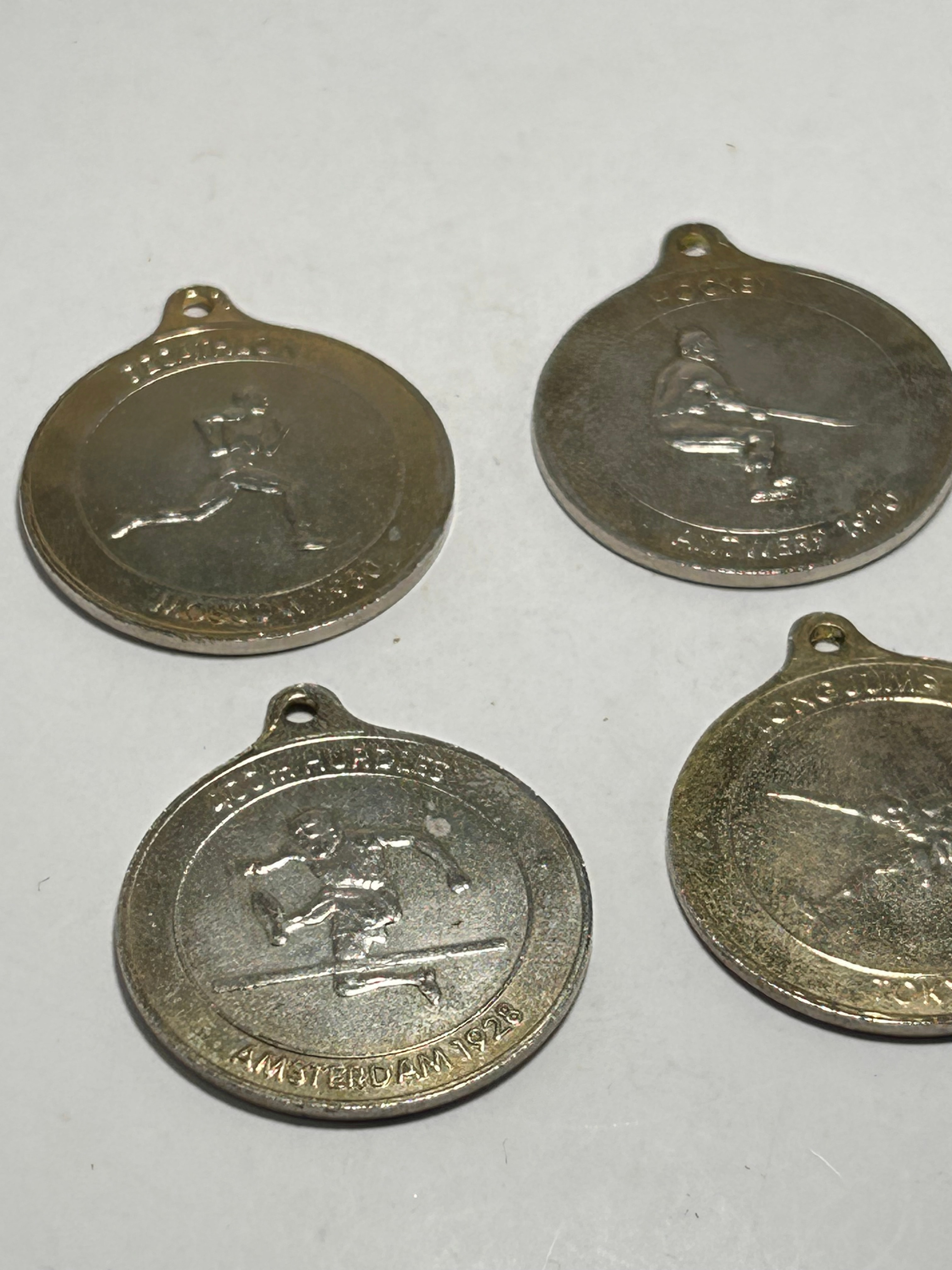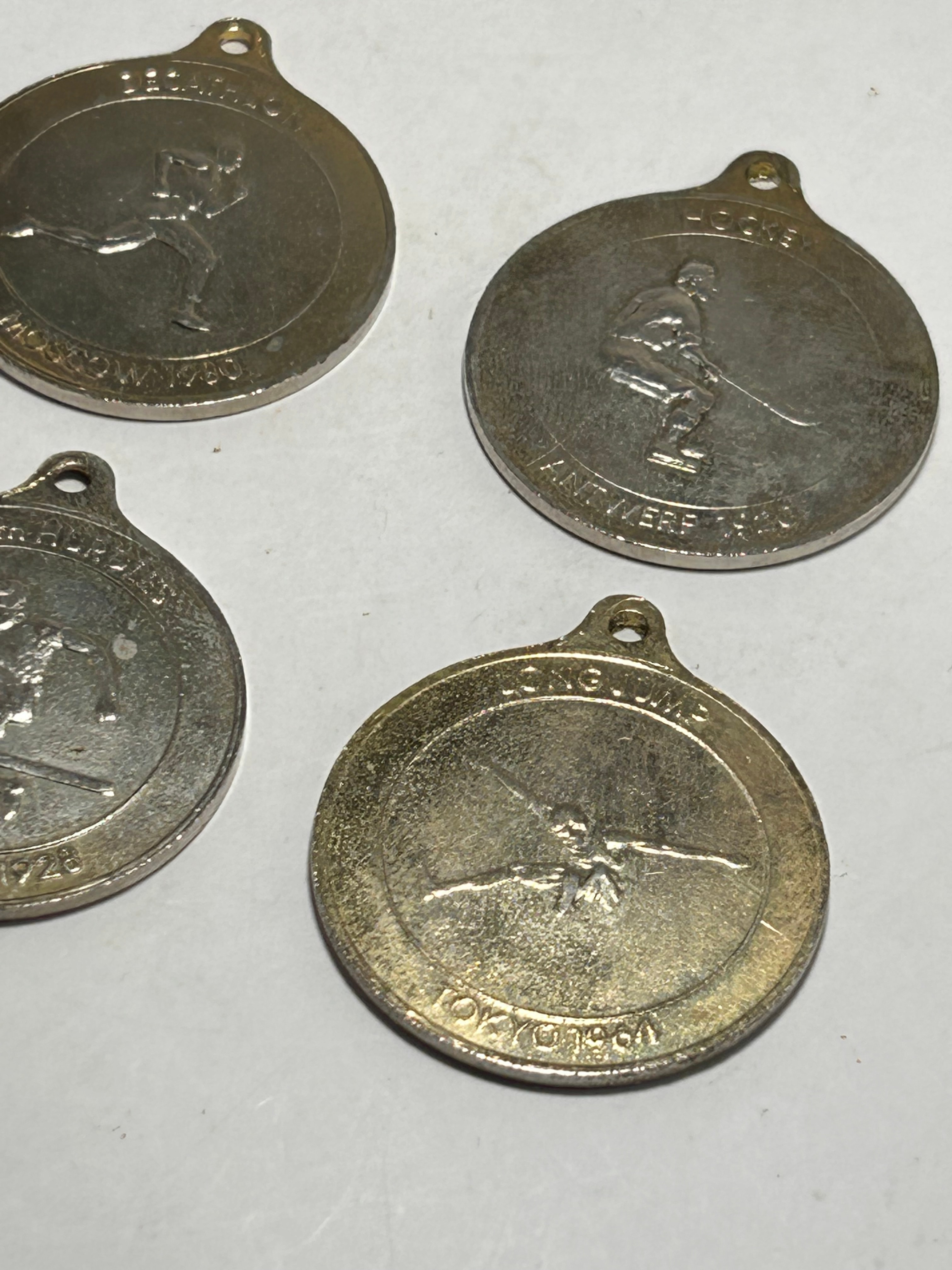 A lot of four circular commemorative medals or tokens, each crafted from a base metal with a silvery tone. The reverses are uniform, displaying the Olympic rings against a stylized sunburst, encircled by the text ‘COMMEMORATION OF THE OLYMPIC GAMES’ and the date range ‘1896-1984’. The obverses depict various Olympic sporting events with associated host cities and years, including ‘200 HURDLES AMSTERDAM 1928,’ ‘HOCKEY ANTWERP 1920,’ ‘LONG JUMP TOKYO 1964,’ and ‘SKIING MOSCOW 1980.’ Each piece features a suspension loop at the top.