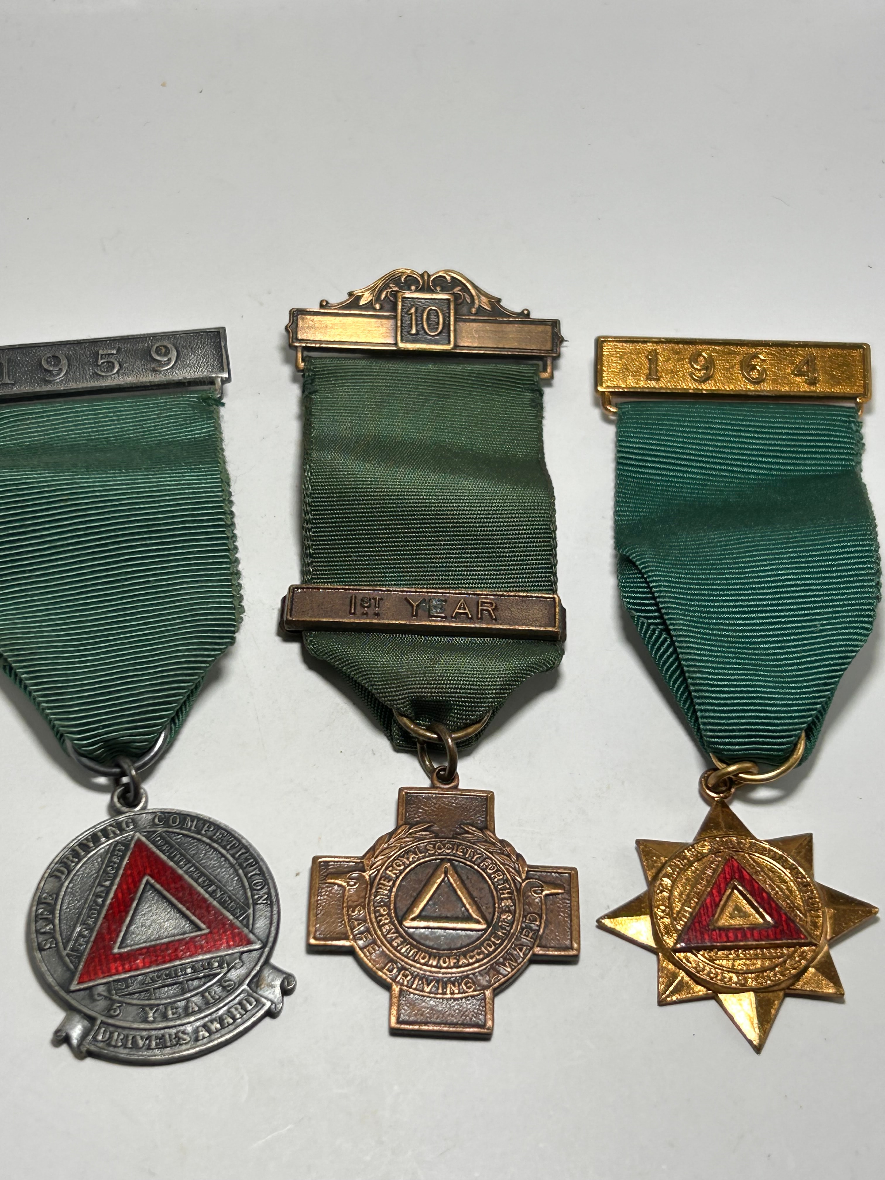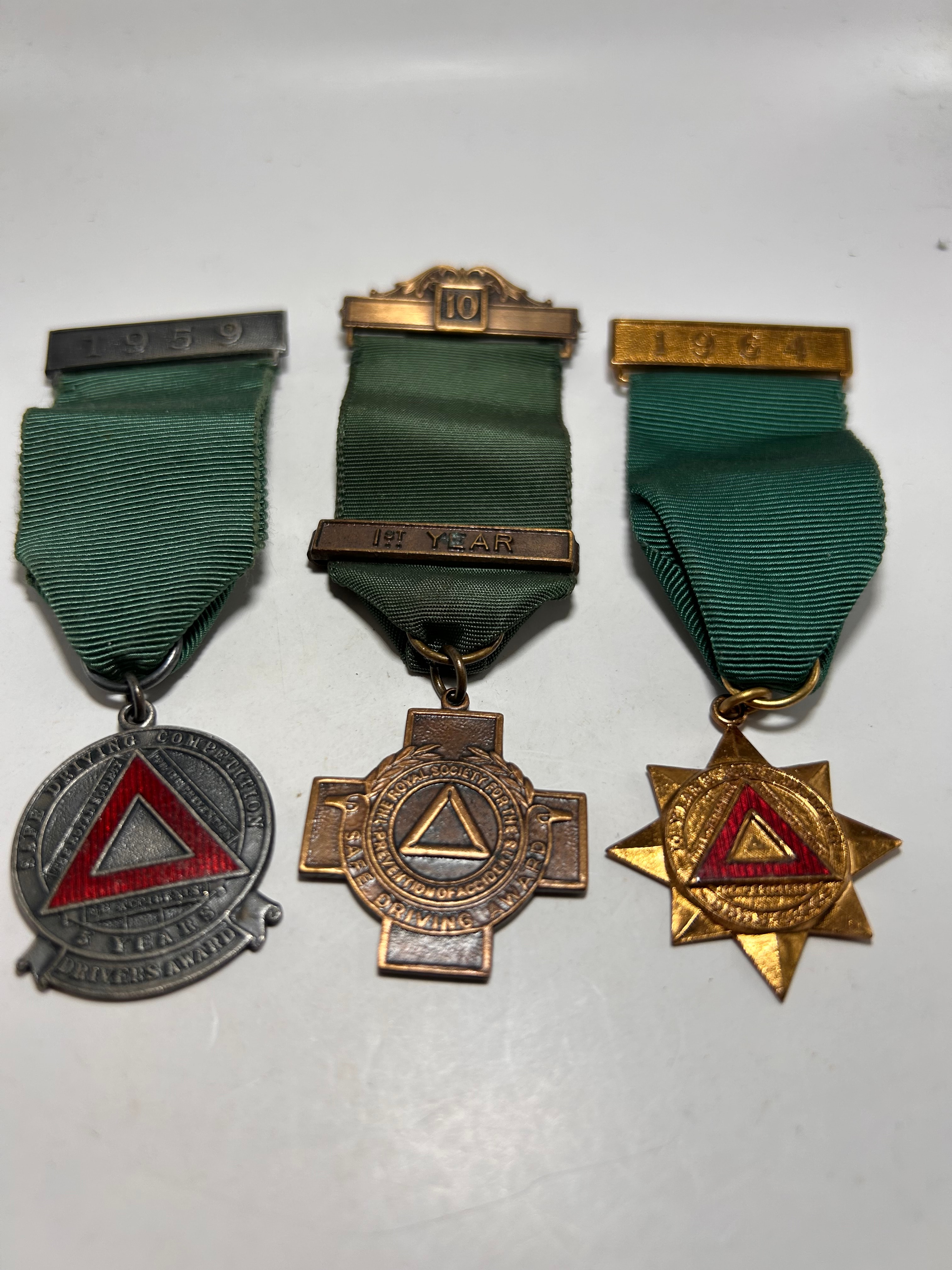 This lot comprises three vintage mid-20th century safe driving achievement medals, each suspended from a dark green ribbed ribbon and featuring a distinctive red triangle motif. The leftmost medal is a silver-tone ‘1959 SAFE DRIVING COMPETITION 3 YEAR DRIVERS AWARD’ with red enamel accents. The central bronze-tone medal, featuring a top bar marked ’10’ and a suspension bar reading ‘1ST YEAR’, is a cross-shaped award from the ‘NATIONAL ASSOCIATION OF INTERCITY TRUCK OWNERS SAFE DRIVING COUNCIL’. The rightmost medal is a gold-tone ‘1964’ eight-pointed starburst design with a central red triangle.
