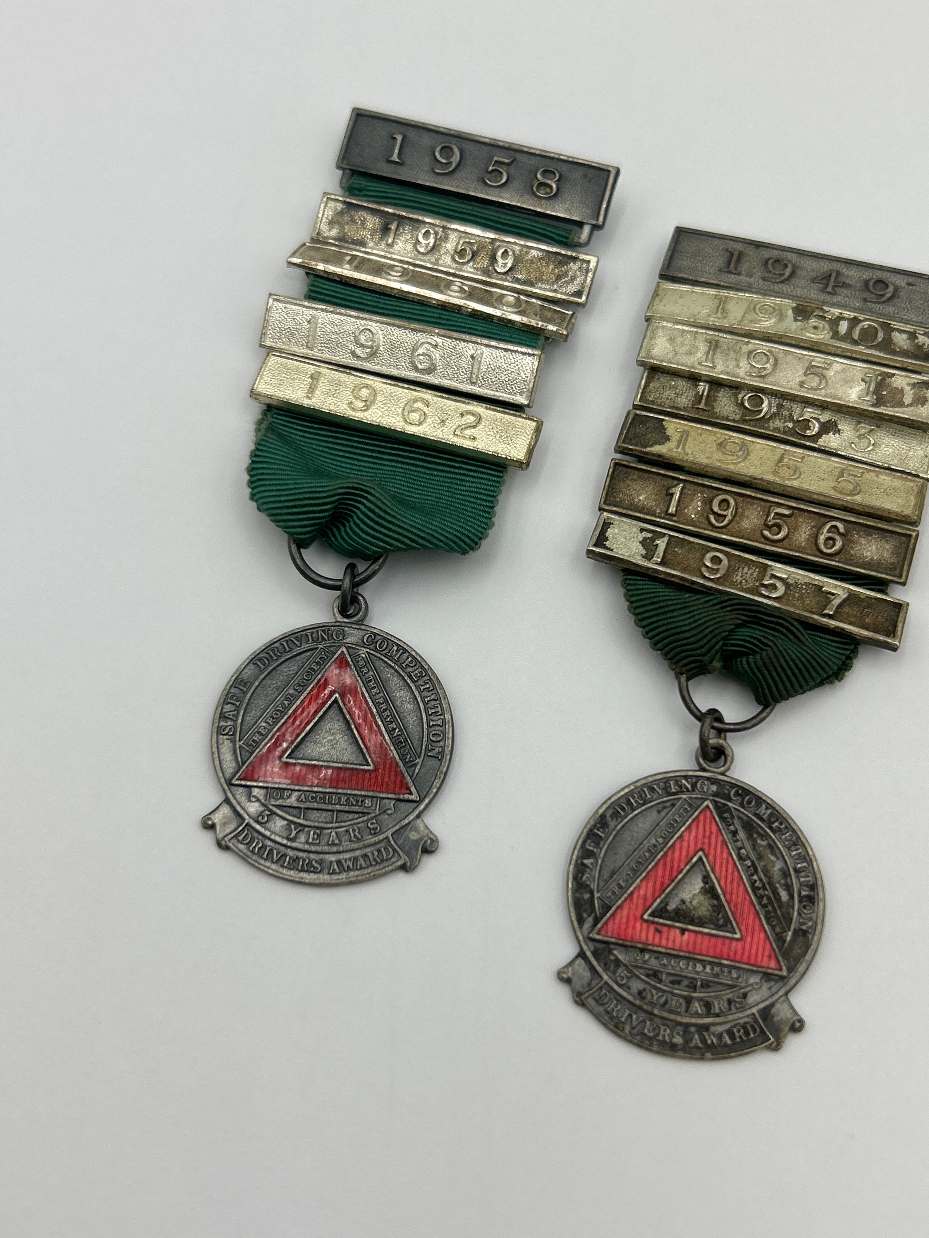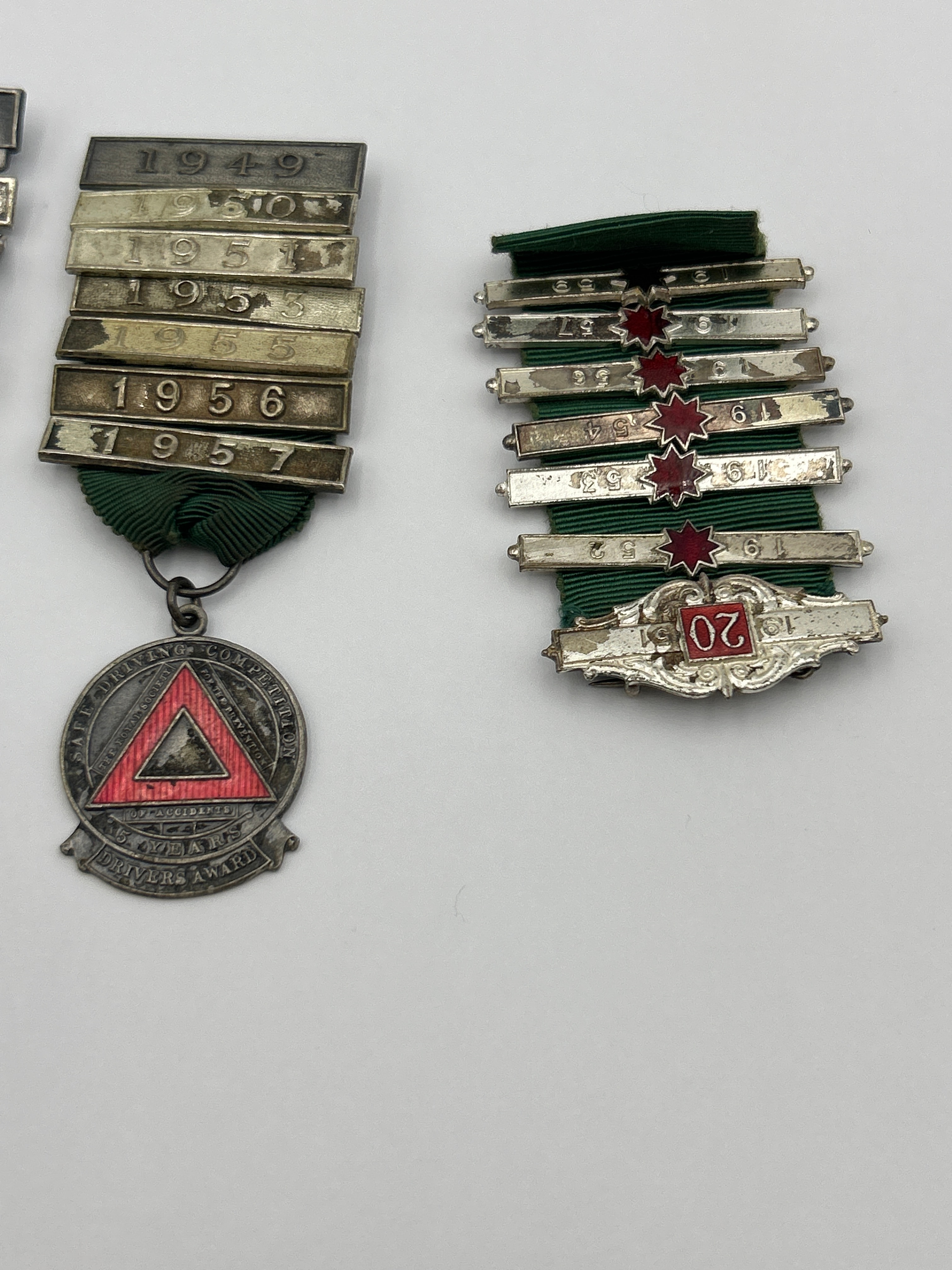A group of three mid-20th century Safe Driving Awards, likely dating from the 1940s-1960s. Each award features base metal components with green fabric ribbons, comprising stacked rectangular clasps pinned to a ribbon, suspending a decorative medallion or bar. The leftmost award has five clasps marked “1958” through “1962” and a circular medallion reading “SAFE DRIVING COMPETITION,” “ACCIDENT FREE,” “5 YEARS,” and “DRIVERS AWARD,” centered by a red enamel triangle. The middle award includes nine clasps, with visible dates ranging from “1949” to “1957,” and a similar circular medallion for “SAFE DRIVING COMPETITION,” “ACCIDENT FREE,” and “DRIVERS AWARD,” also with a red enamel triangle and “8 YEARS” partially visible. The rightmost award features multiple clasps, some decorated with red enamel stars, and a lower decorative bar prominently displaying a red enamel “20” on a shield-like design. All visible text is in English. Similar examples are often attributed to organizations such as ROSPA (Royal Society for the Prevention of Accidents) or the National Safety Council.