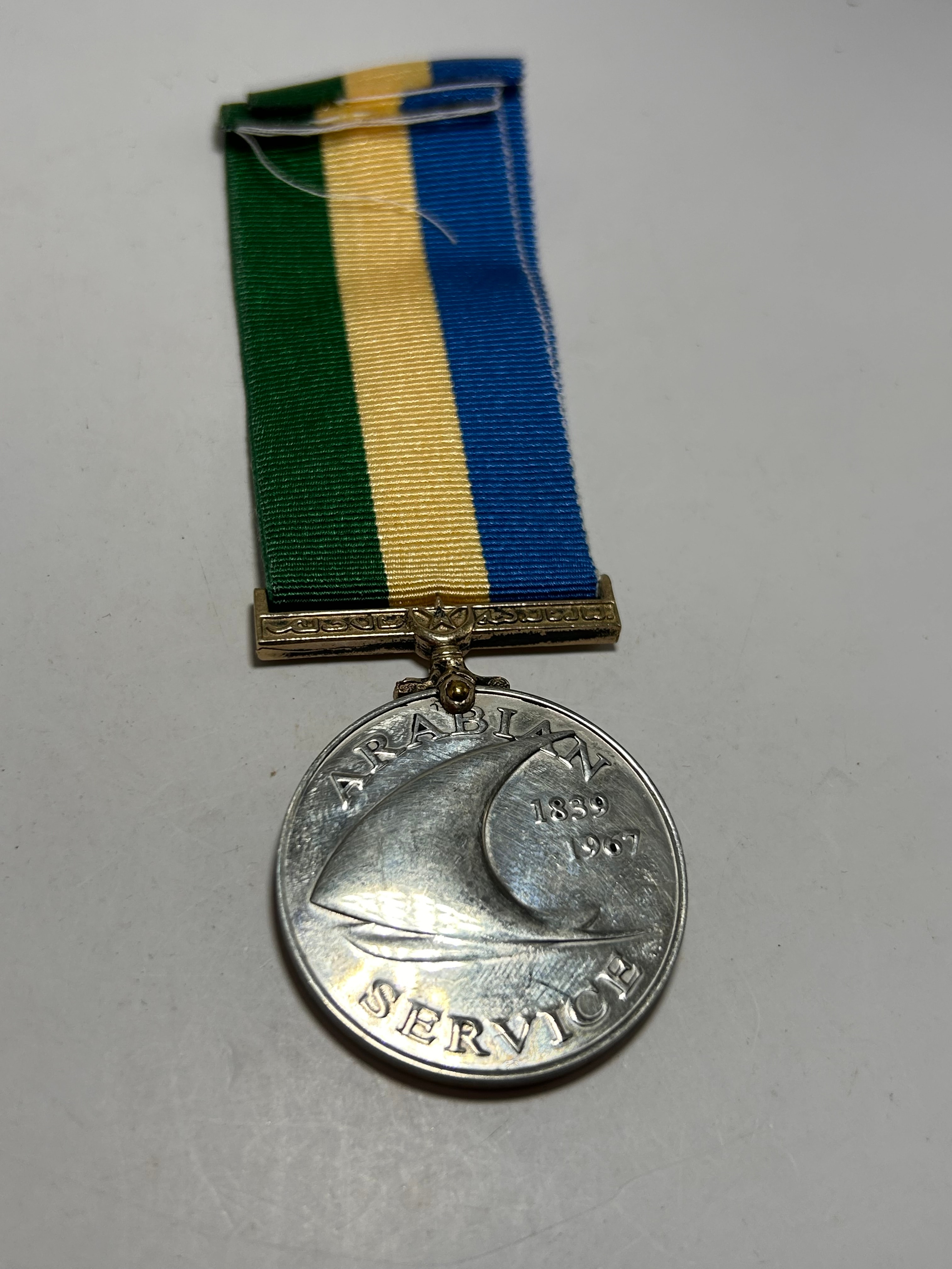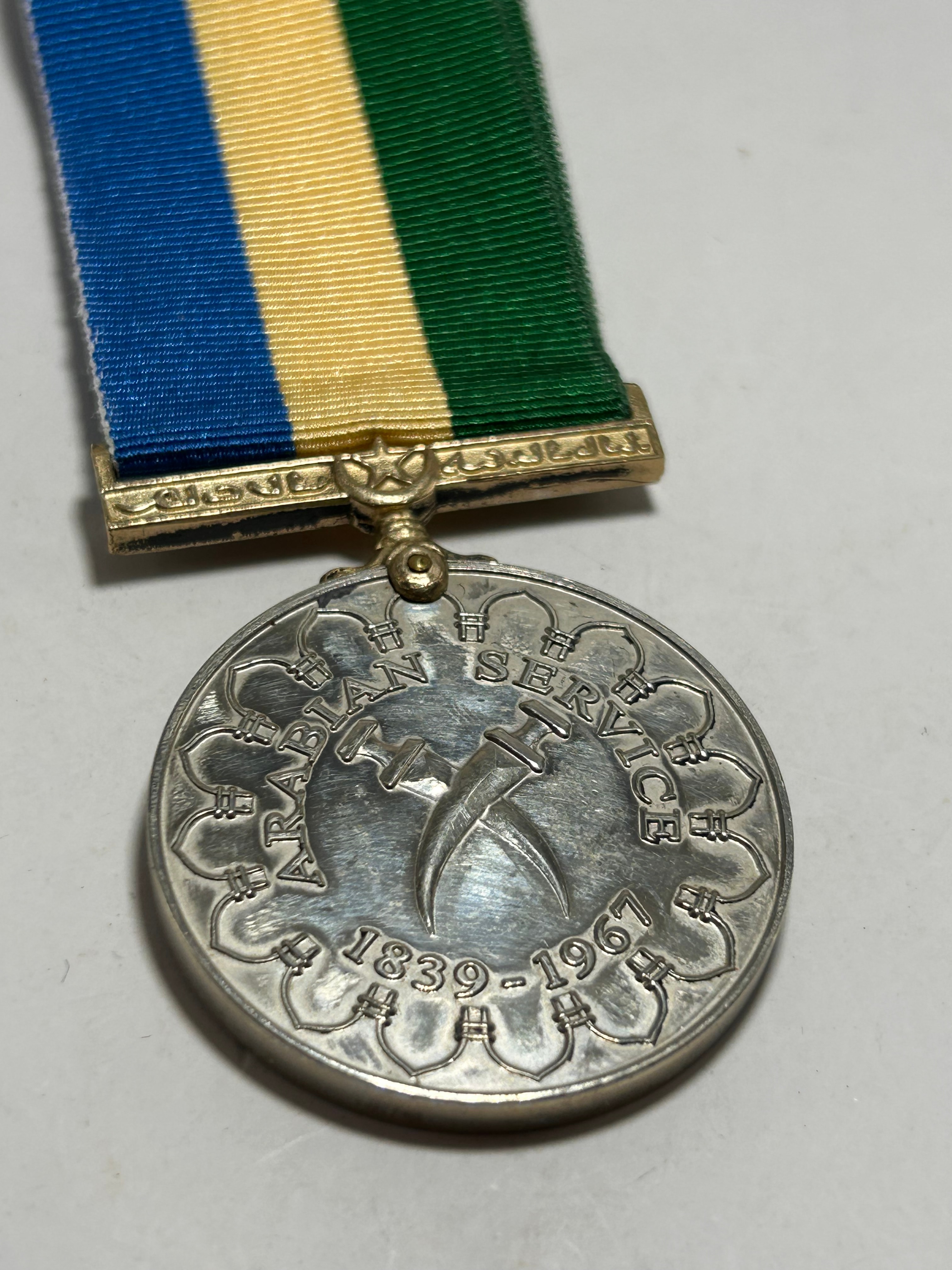 An Arabian Service Medal, crafted from a silver-toned metal, suspended from a gold-toned metal bar and a vertically striped ribbon of blue, yellow, and green. The obverse features the inscription “ARABIAN SERVICE” at the top, a central design of two crossed curved daggers (jambiyas) with a pickaxe-like implement, and the dates “1839 – 1967” at the bottom, all framed by a decorative floral border. The reverse displays a stylized dhow with “1839” over “1967” in the upper right, and the word “SERVICE” at the bottom, within the same decorative border. The gold-toned suspension bar bears Arabic script, which translates to “Service” (خدمة).