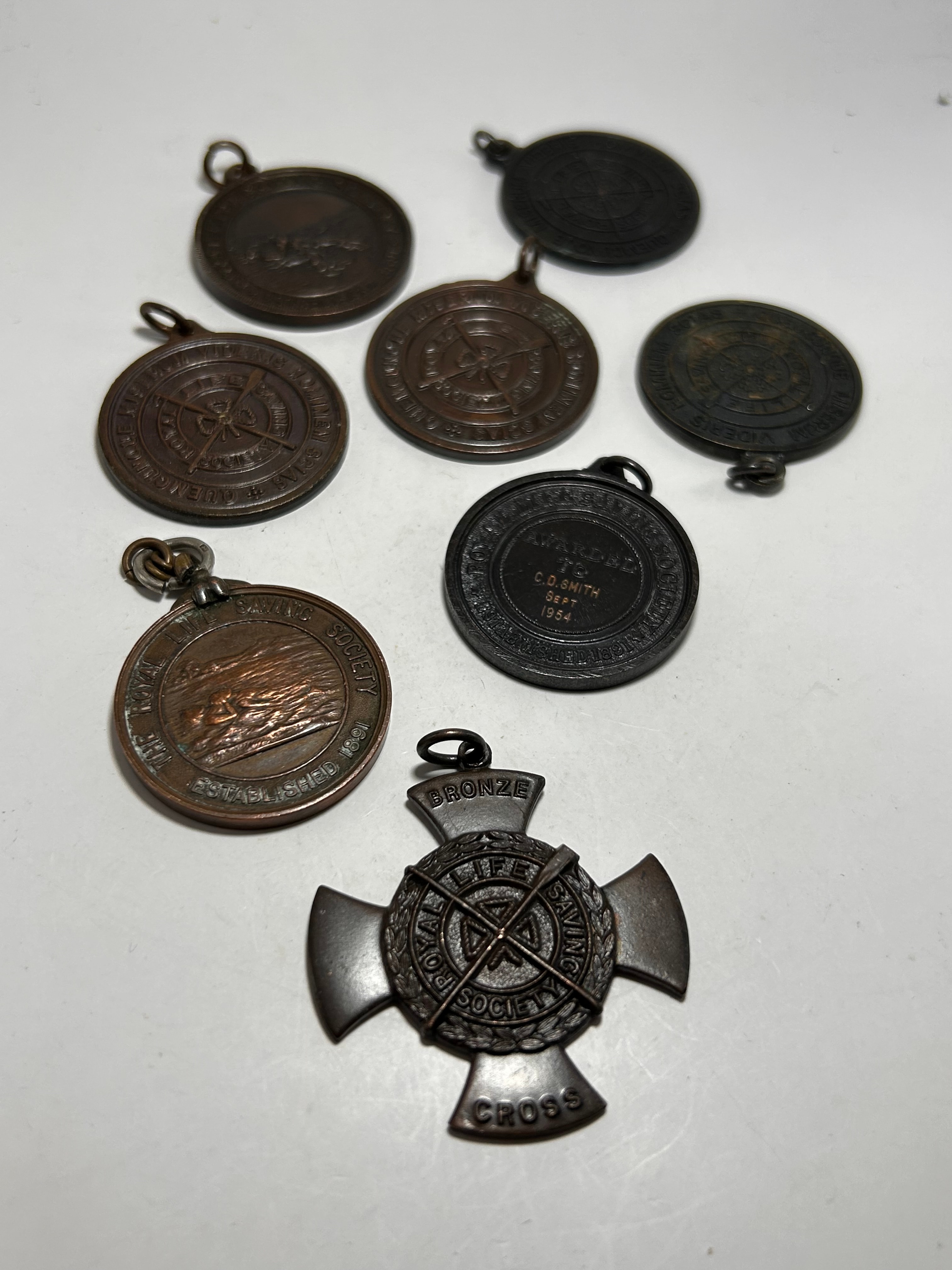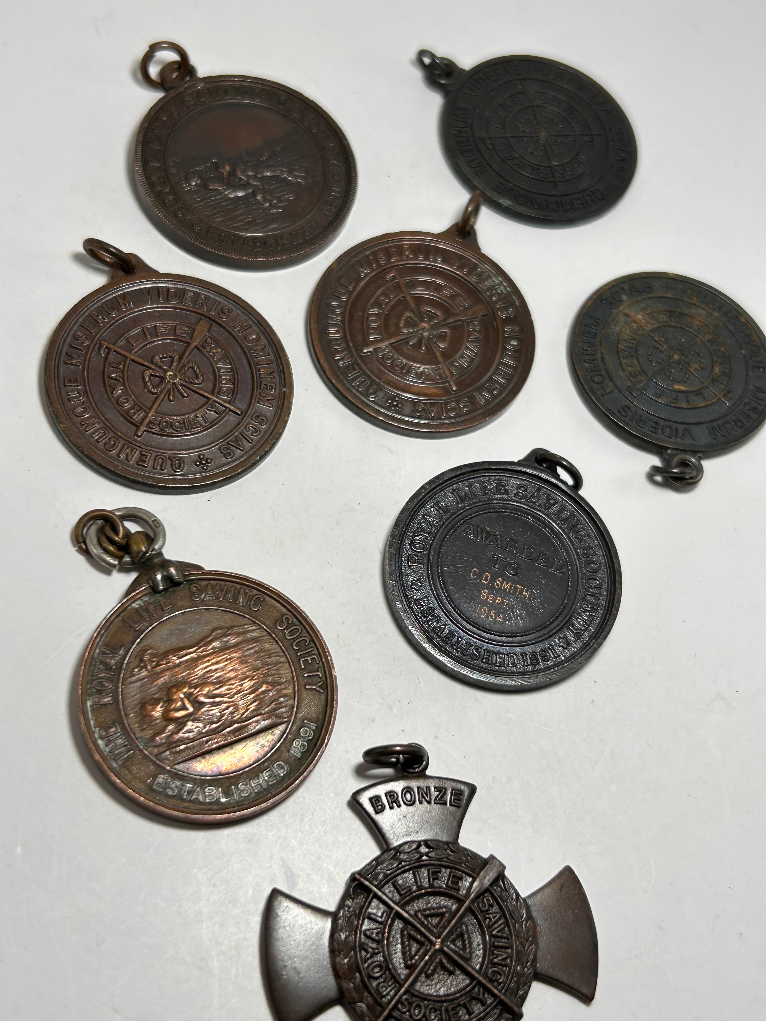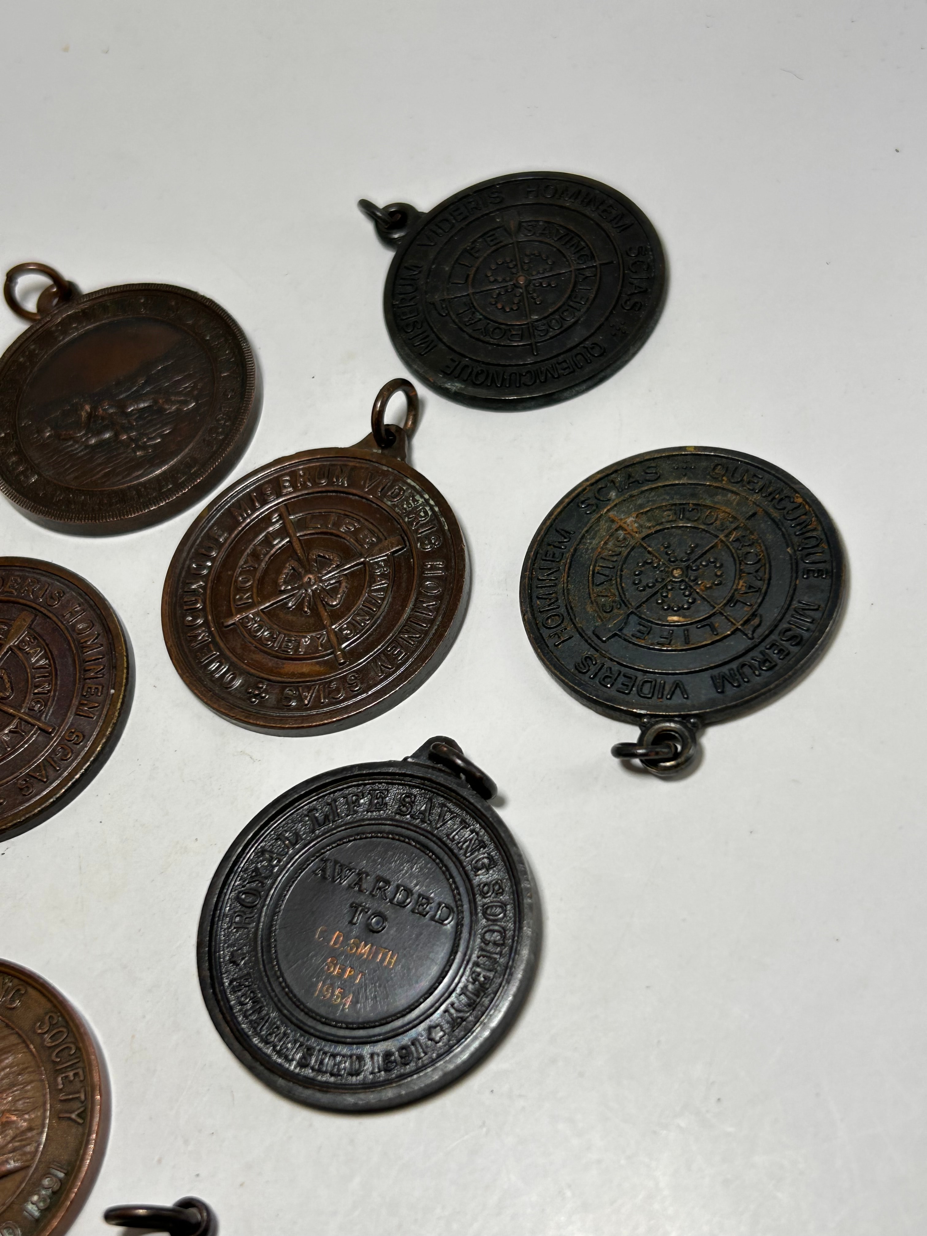 A collection of eight circular medallions and one cross-shaped medal, all struck in bronze or a dark, patinated copper alloy, predominantly from the mid-20th century. One medallion is engraved “AWARDED TO C. D. SMITH SEPT 1954,” and another bears “ESTABLISHED 1891.” The cross-shaped medal is marked “BRONZE” and “CROSS.” Most items feature a central compass rose design, while others depict a nautical scene. Visible text includes “ROYAL LIFE SAVING SOCIETY” and the Latin phrases “QUEMCUNQUE VIDEBIS AD VITAM” or “QUEMCUMQUE VIDERIS AD VITAM.”