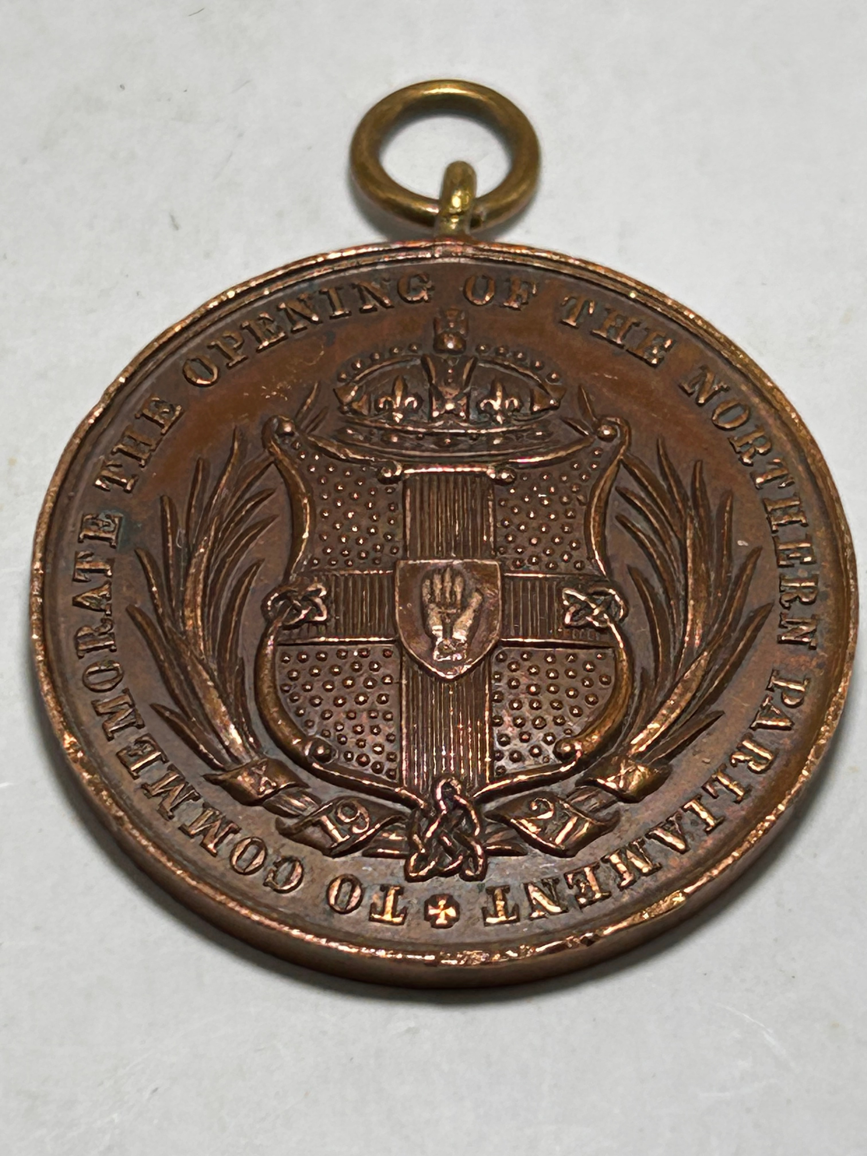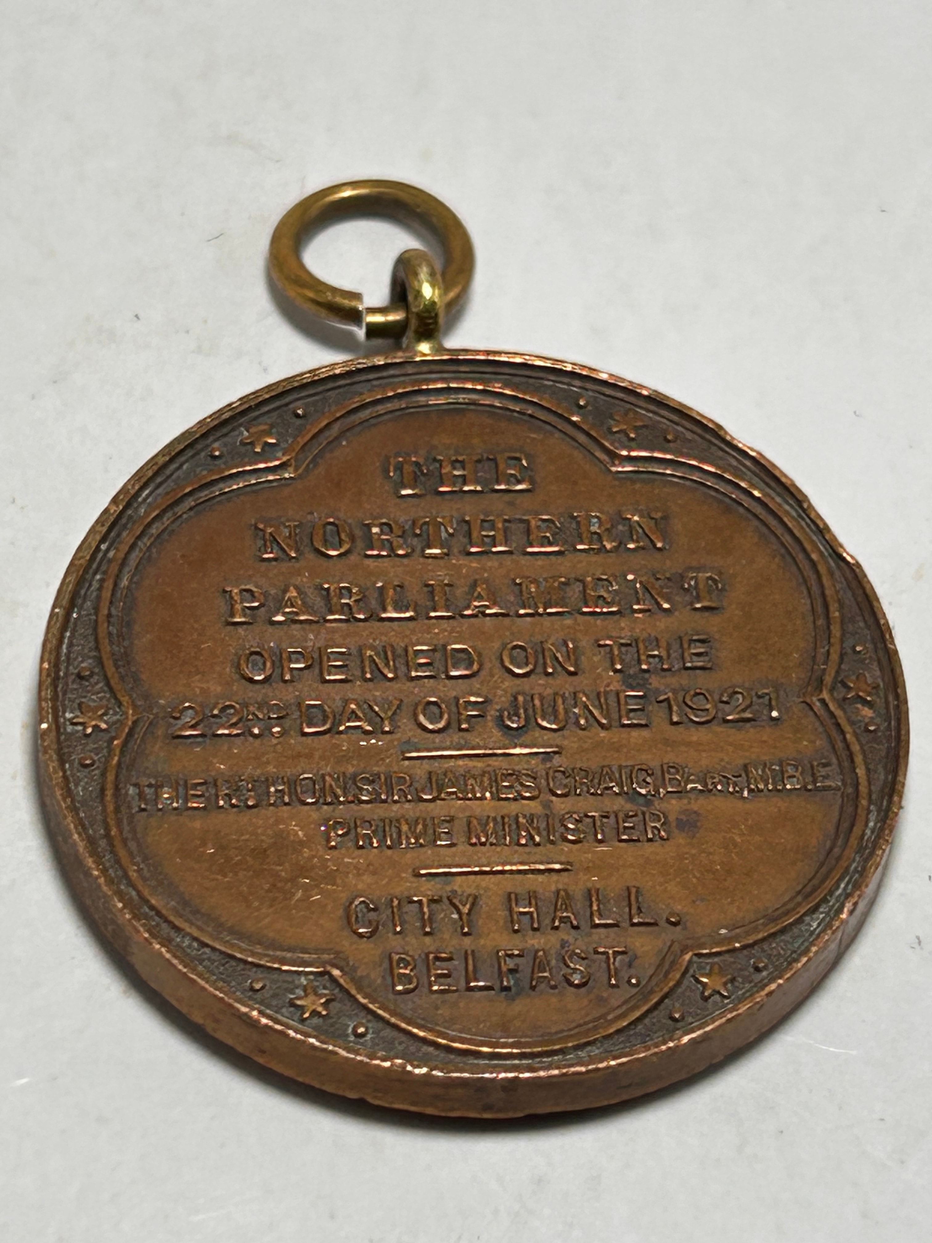 A commemorative medal for the opening of the Northern Parliament, dating to 1921. This round, bronze-toned medallion features an attached brass-colored suspension loop. The obverse is inscribed: “THE NORTHERN PARLIAMENT OPENED ON THE 22ND DAY OF JUNE 1921 THE RT. HON SIR JAMES CRAIG BART. MBE PRIME MINISTER CITY HALL. BELFAST.” The reverse displays a crowned shield centered with a cross and an open hand, flanked by laurel or oak leaves, encircled by the text “TO COMMEMORATE THE OPENING OF THE NORTHERN PARLIAMENT.”