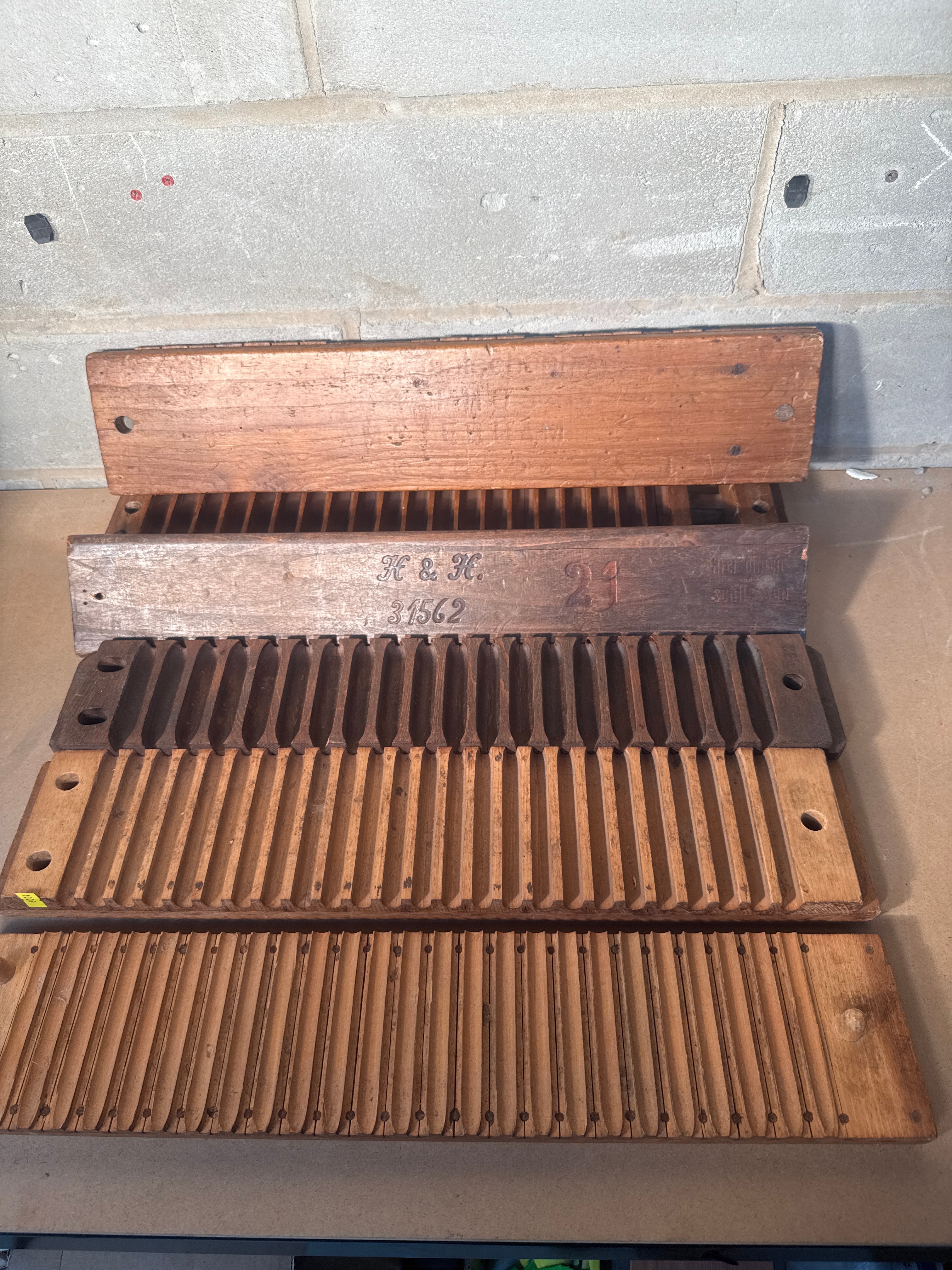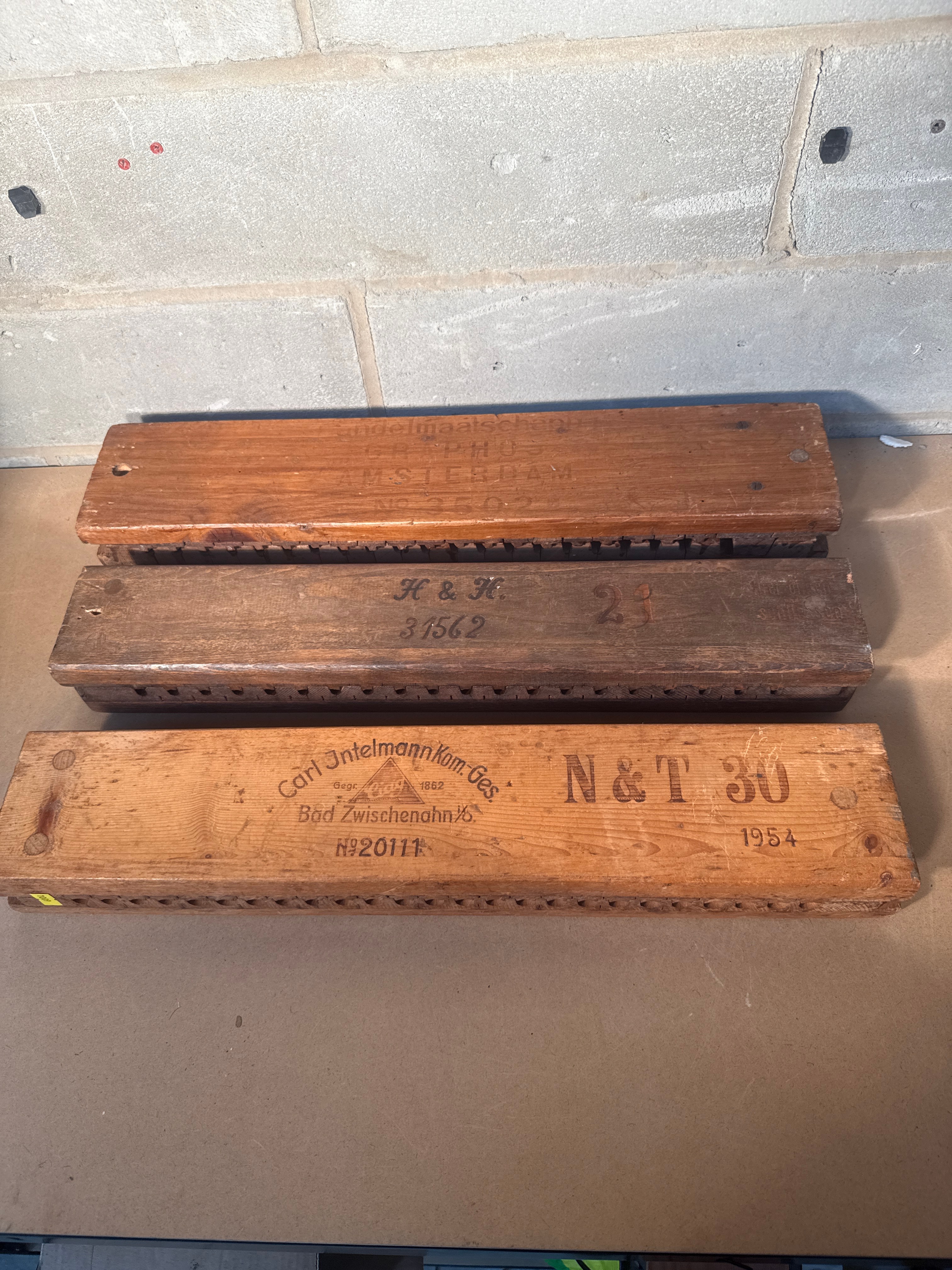 A set of three antique or vintage wooden cigar molds, each composed of two interlocking halves designed to shape multiple cigars concurrently. The top mold is partially marked with Dutch text reading “ENGELMAATSCHAPPY” (Angel Company) and “AMSTERDAM.” The middle mold features the markings “H & H,” “31562,” and “23.” The bottom mold, most clearly visible, includes extensive German text and numbers: “Carl Jntelmann Kom. Ges.” (Carl Jntelmann Limited Partnership), “gegr. 1882” (founded 1882), “Bad Zwischenahn i/O.” (Bad Zwischenahn in Oldenburg), “Nº20111,” “N & T 30,” and the year “1954.” The internal surfaces of the molds are deeply grooved, indicating their industrial function. The items display a well-developed patina consistent with their age and purpose.
