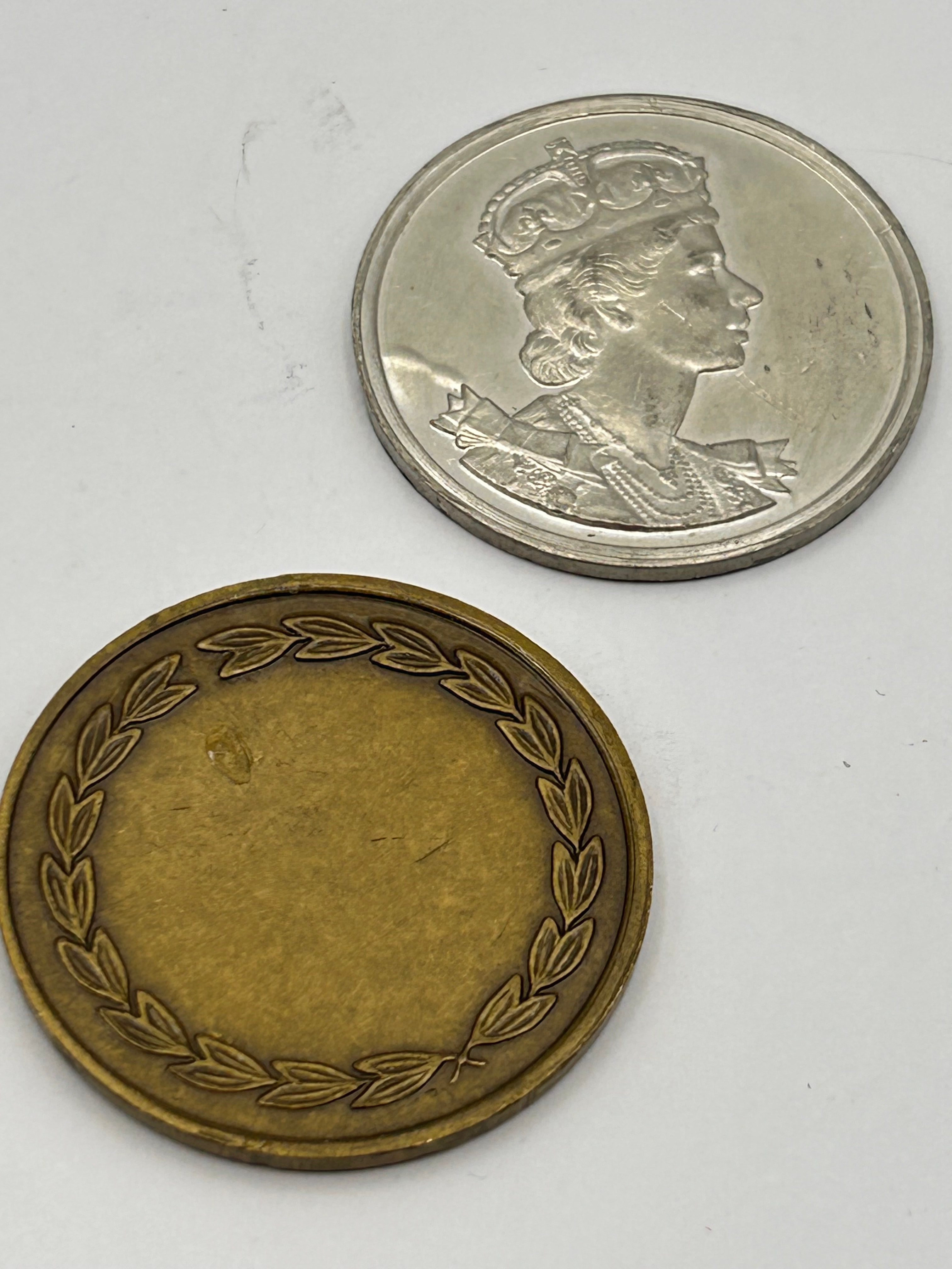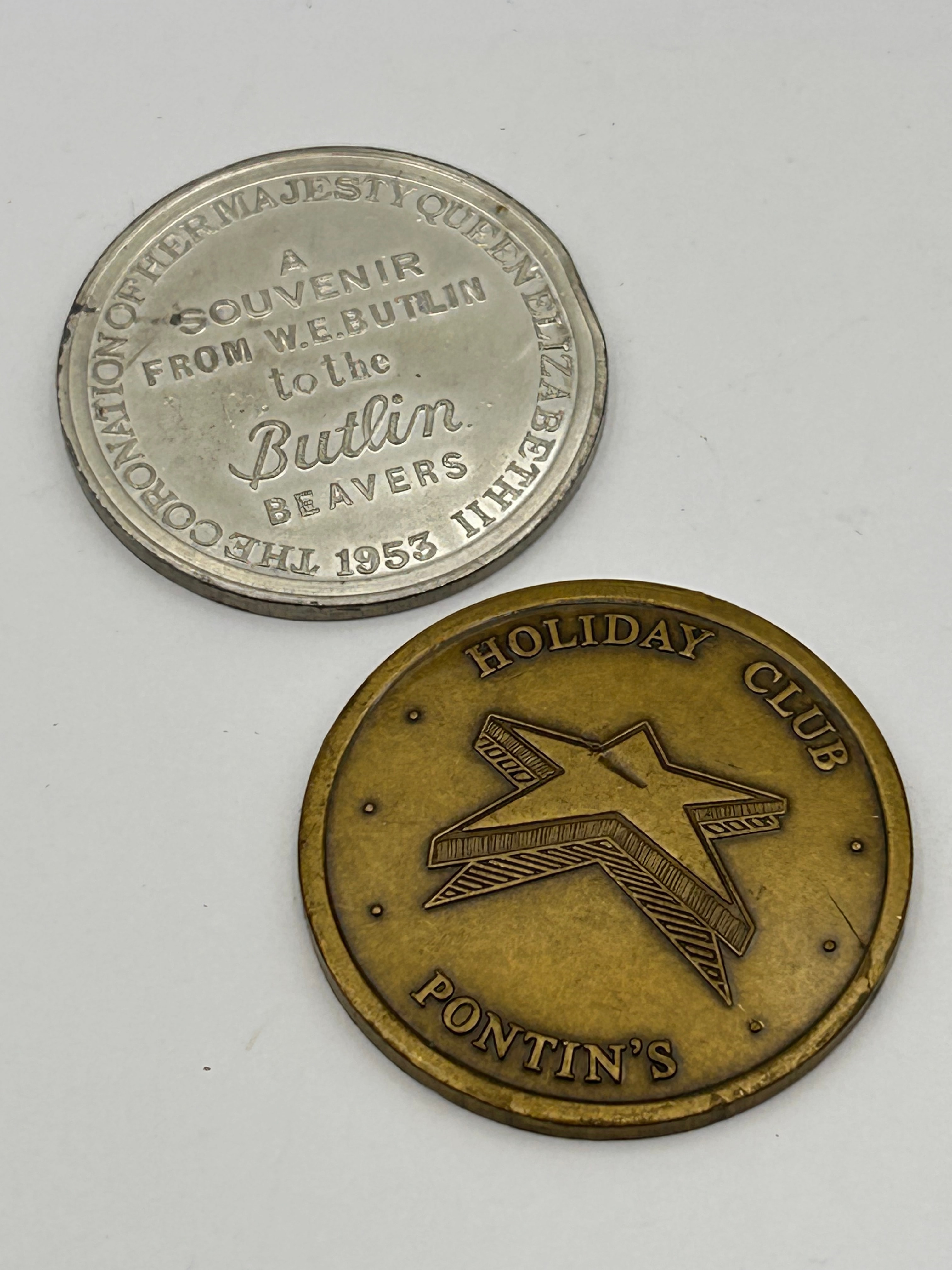 This lot comprises two circular metal tokens. The first is a silver-colored token, likely aluminum, commemorating the 1953 Coronation of Queen Elizabeth II. One side reads “CORONATION OF HER MAJESTY QUEEN ELIZABETH II 1953” and “A SOUVENIR FROM W.E. BUTLIN to the Butlin BEAVERS”, while the reverse features a crowned profile bust of the Queen. The second is a brass or bronze-colored token, bearing the text “HOLIDAY CLUB” and “PONTIN’S” surrounding a stylized star on one side, and a laurel wreath bordering a blank field on its reverse.