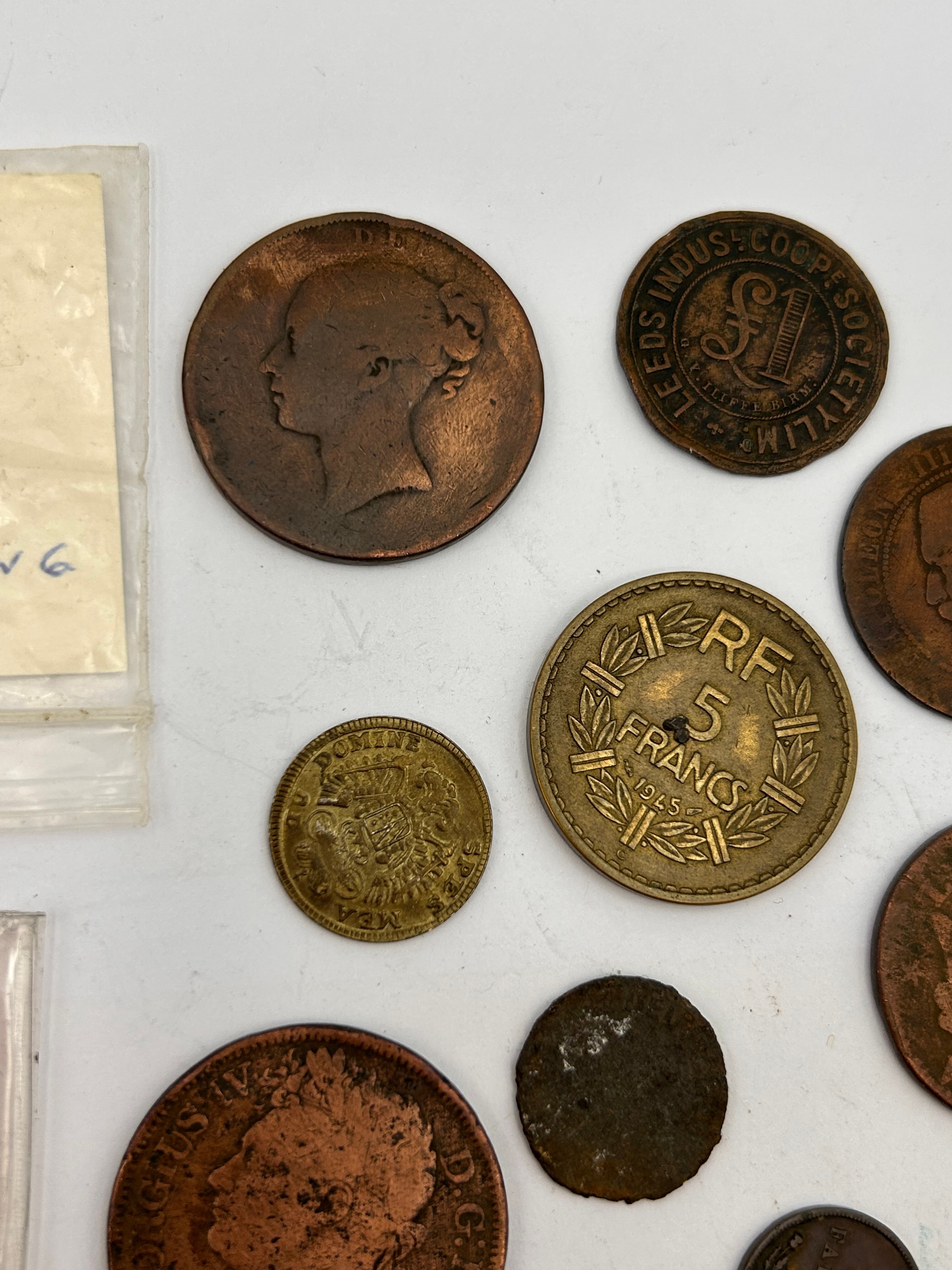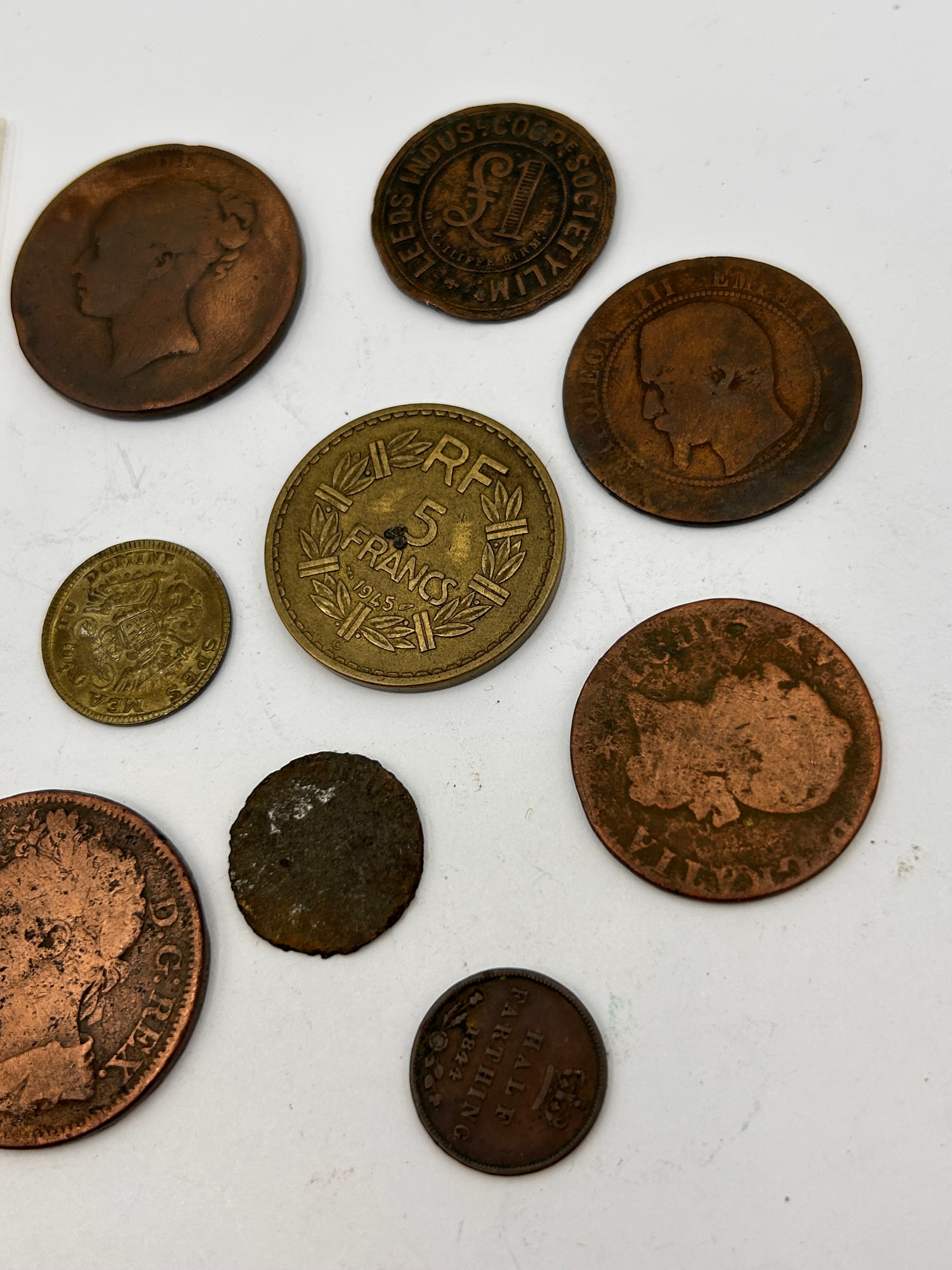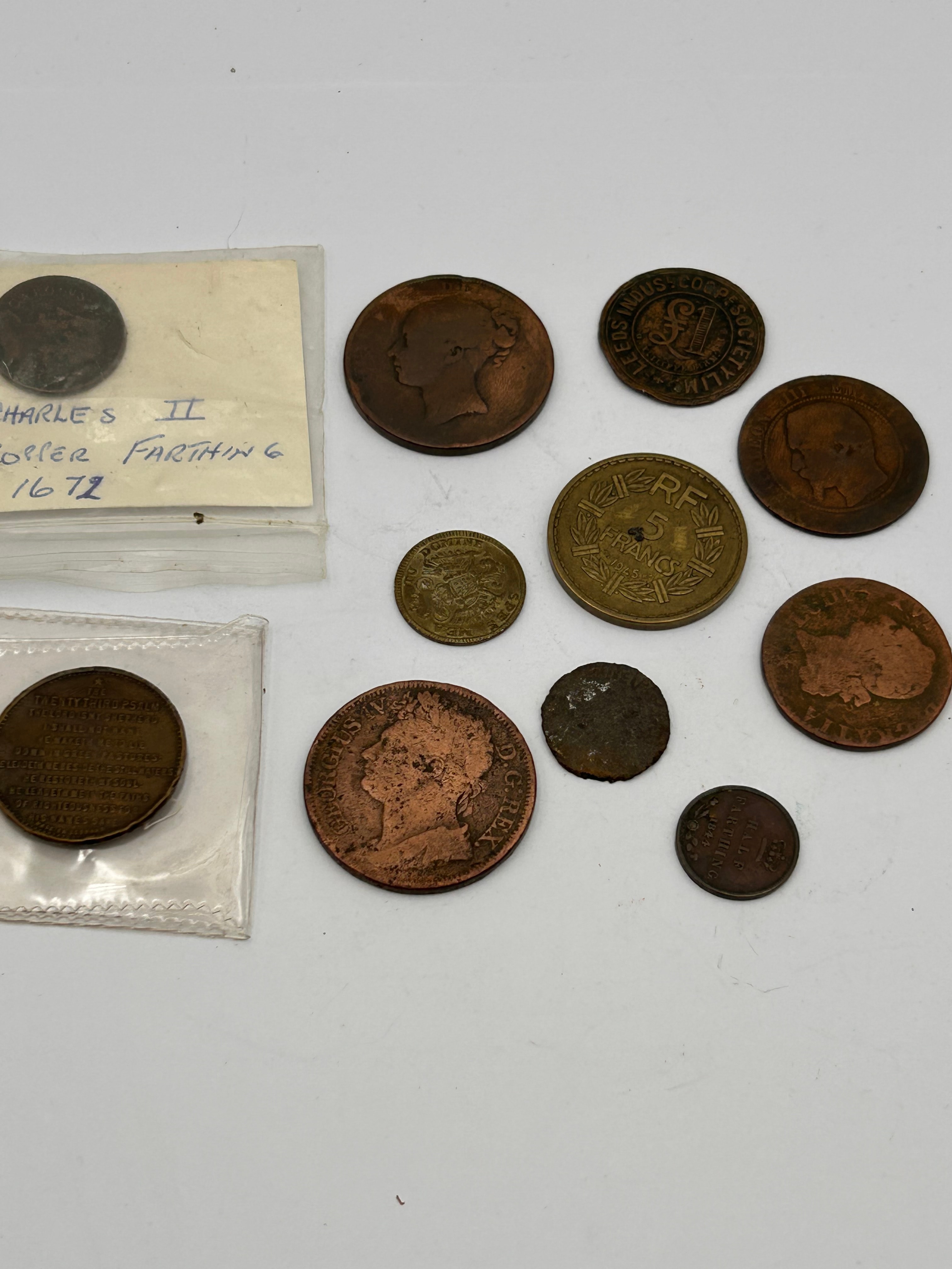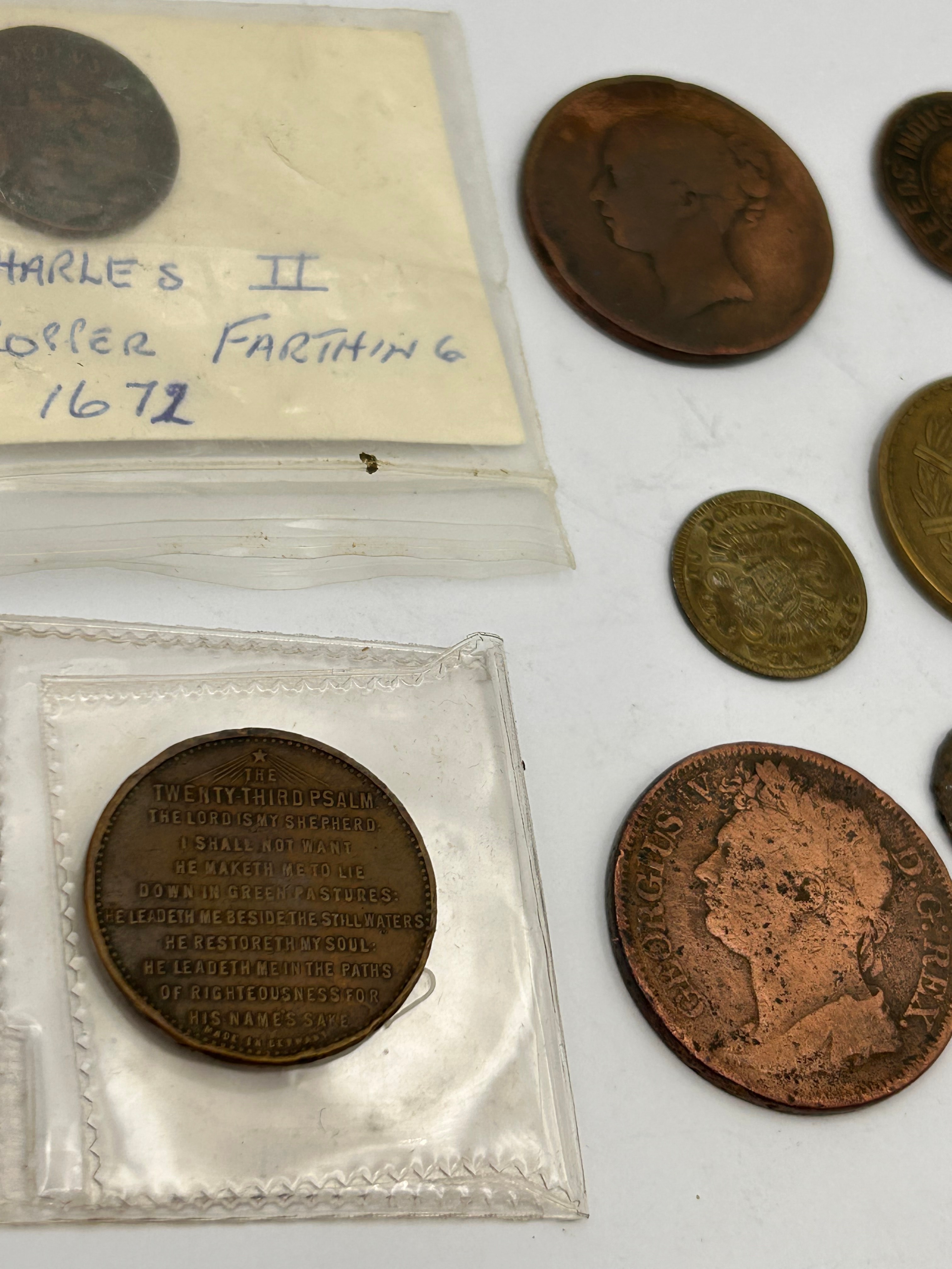 This lot comprises a diverse collection of 11 numismatic items, predominantly copper and bronze coins and tokens, with one brass coin and a religious token. The collection includes a Charles II copper farthing dated 1672, a French 5 Francs coin from 1925 marked “RF” (République Française), a British Half Farthing from the 1820s, and a larger coin featuring “GEORGIUS IV D G REX” (George IV, by the Grace of God, King). Other pieces present are a token from the “LEEDS INDUS CO-OP SOCIETY LIMITED,” a religious token inscribed with “THE TWENTY THIRD PSALM,” and a small coin with partially visible text “DOMINE SALVAM FAC REG” (O Lord, save the King).