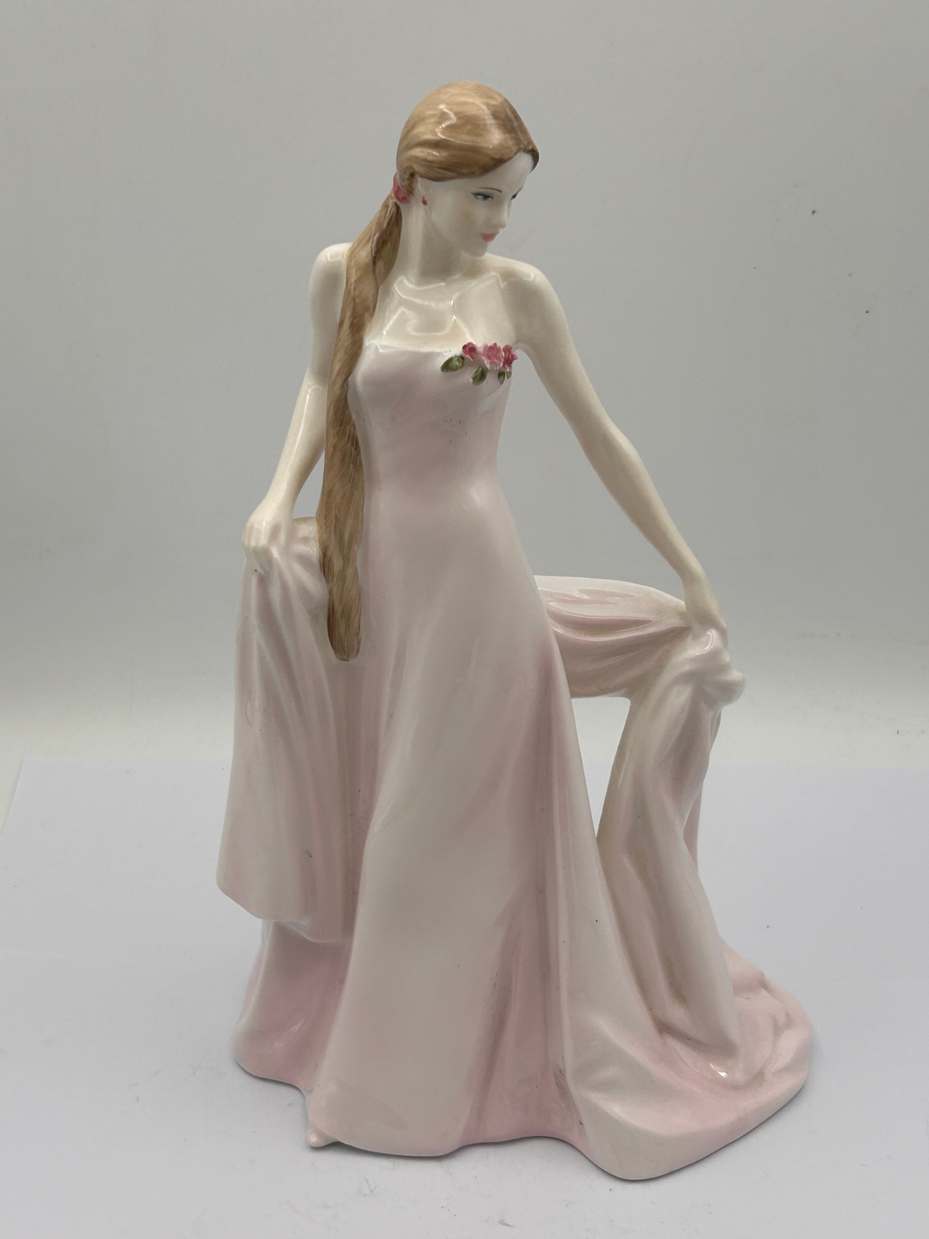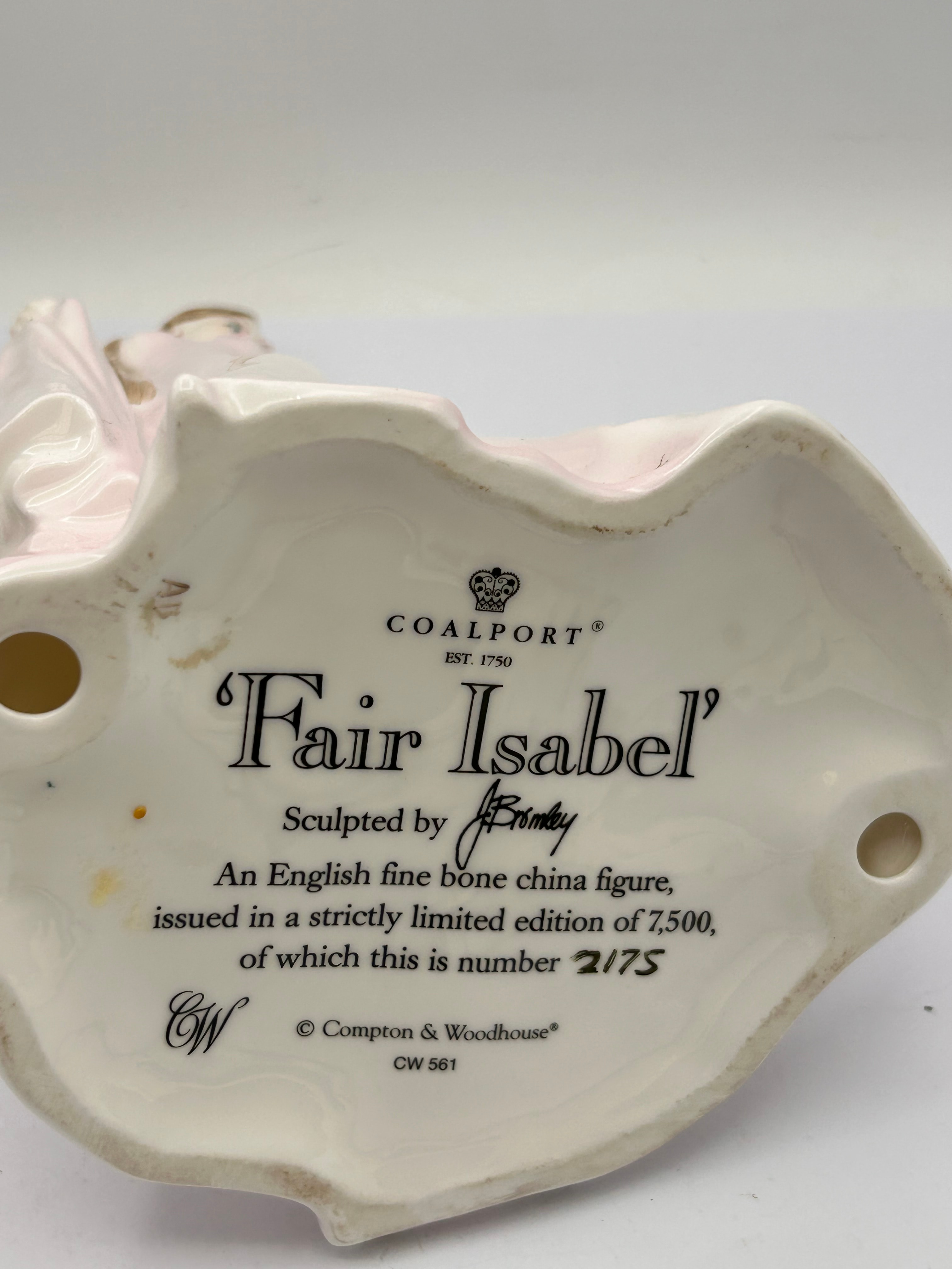 A Coalport ‘Fair Isabel’ limited edition bone china figurine, sculpted by J. Bromley. This English fine bone china piece depicts a female figure with long, light brown hair, posed in a flowing pale pink and white gown accented with small pink flowers on the bodice. The base is marked ‘COALPORT ® EST. 1750’, ‘Fair Isabel’, ‘Sculpted by J. Bromley’, ‘An English fine bone china figure, issued in a strictly limited edition of 7,500, of which this is number 2175’, a ‘CW’ monogram, ‘© Compton & Woodhouse®’, and ‘CW 561’.