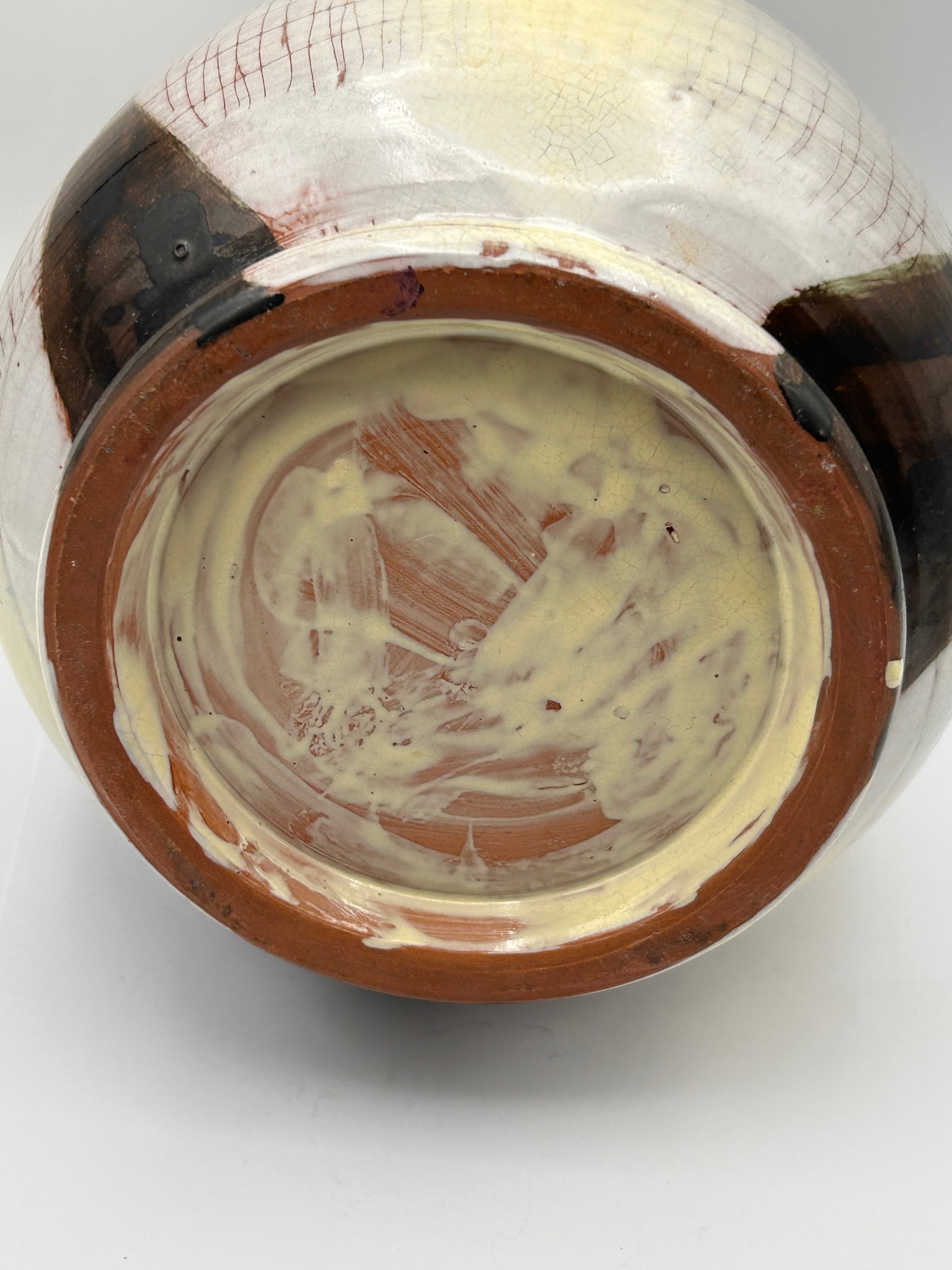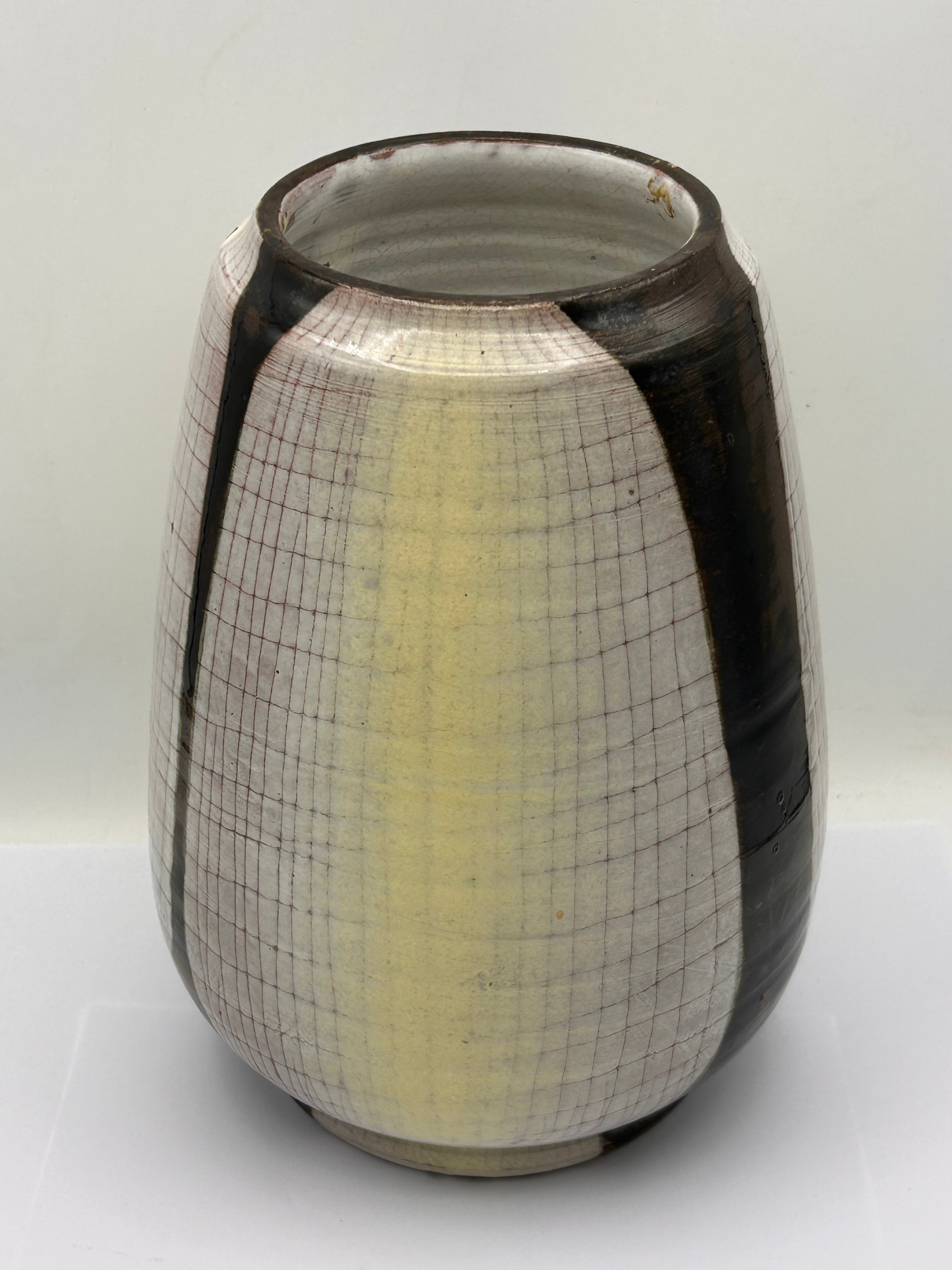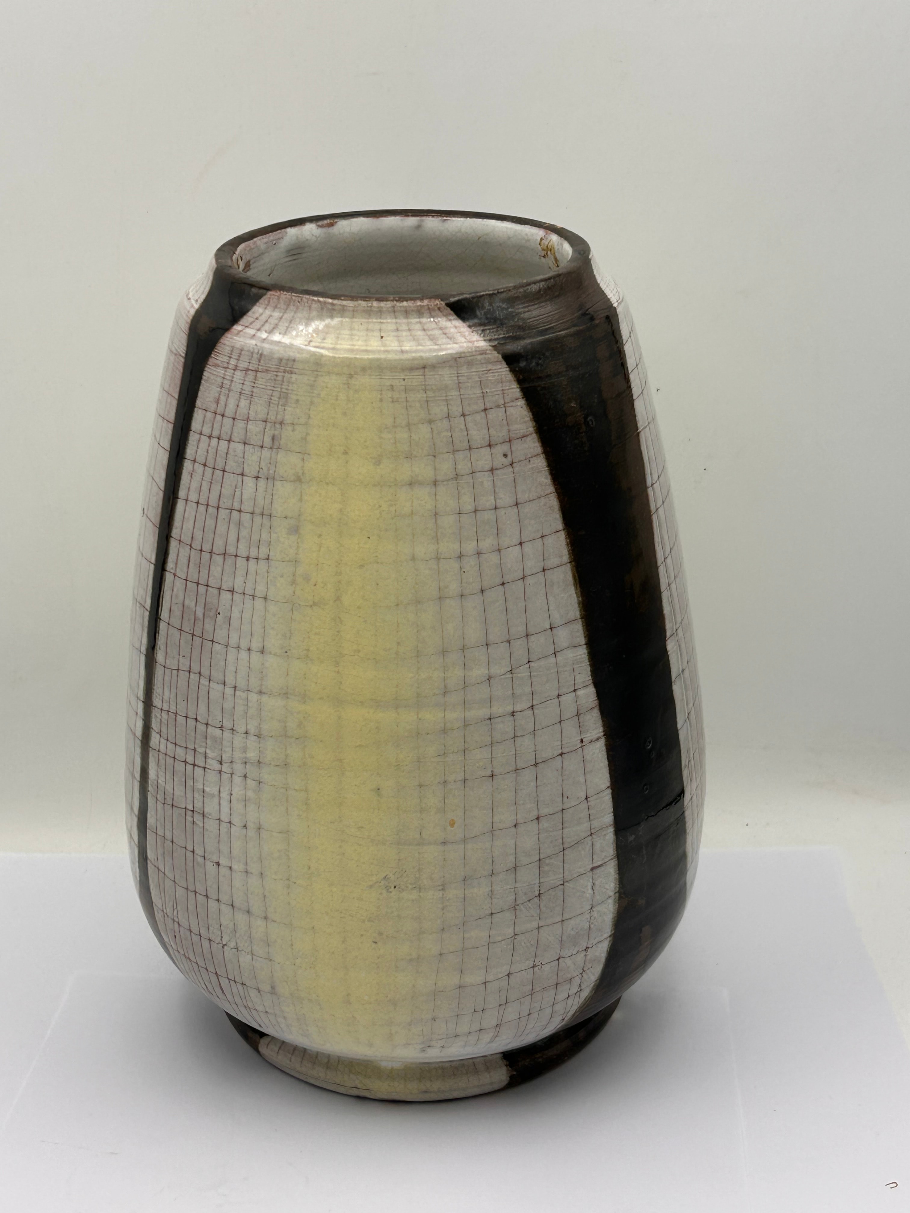 A Lucie Rie sgraffito glazed ceramic vase with an ovoid body, a wide mouth, and a distinct unglazed foot rim. Its surface features an abstract, geometric decoration comprised of a fine reddish-brown grid pattern over an off-white ground, accented by broad, irregular vertical dark brown/black stripes and a central pale yellow vertical panel. The material is glazed ceramic, likely earthenware or stoneware, with the exposed base revealing a reddish-brown unglazed body. The glossy glaze exhibits visible crazing across the lighter exterior areas and on the creamy yellow glazed interior of the base. No visible text, signatures, or maker’s marks.