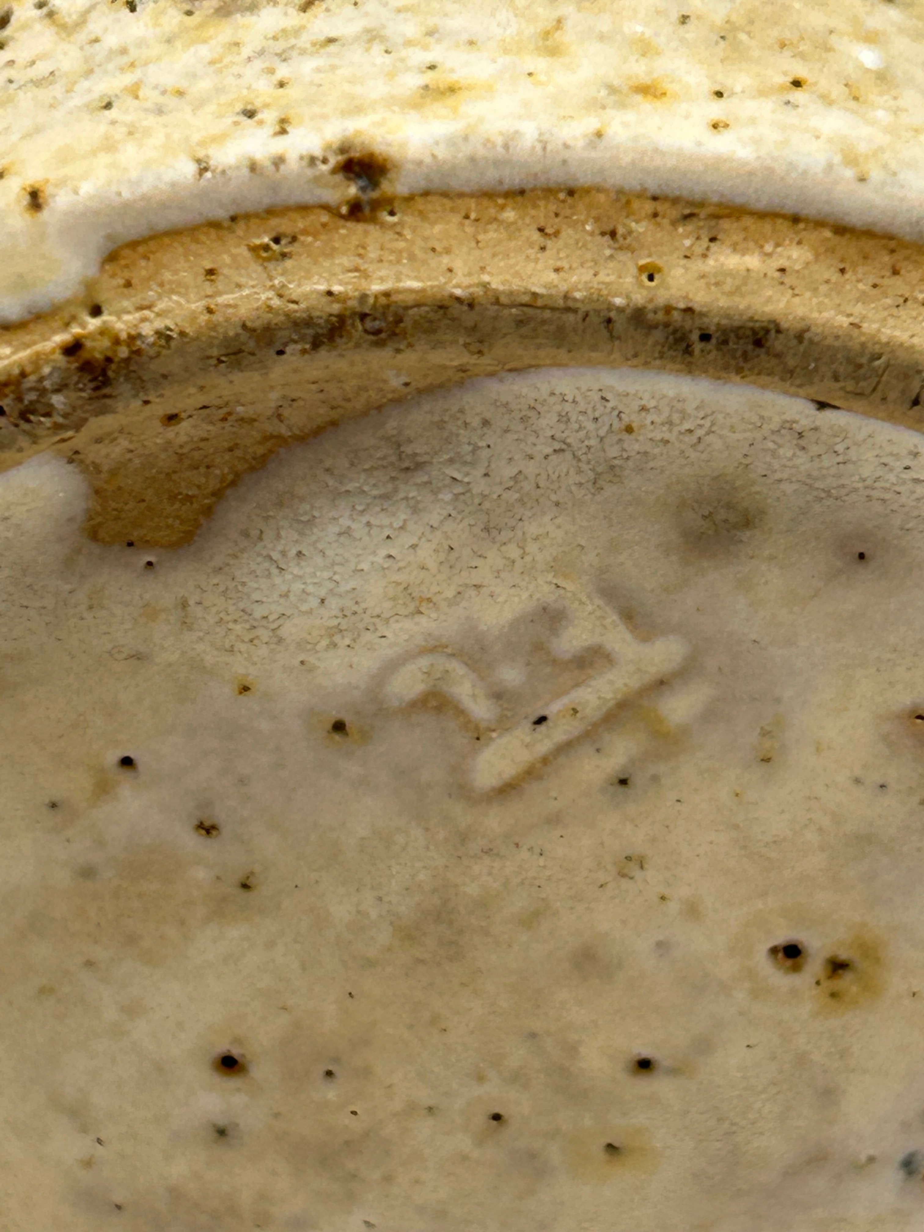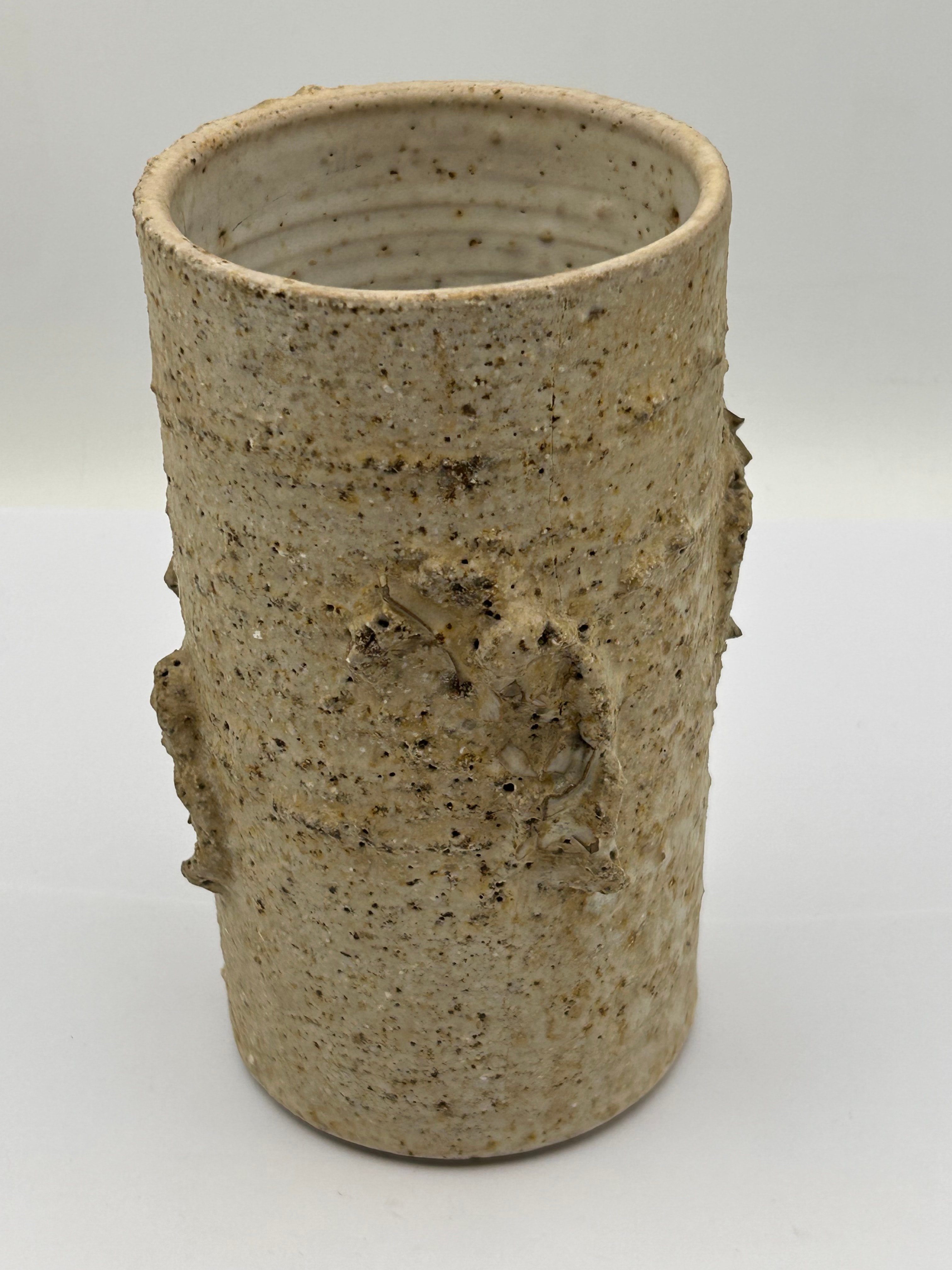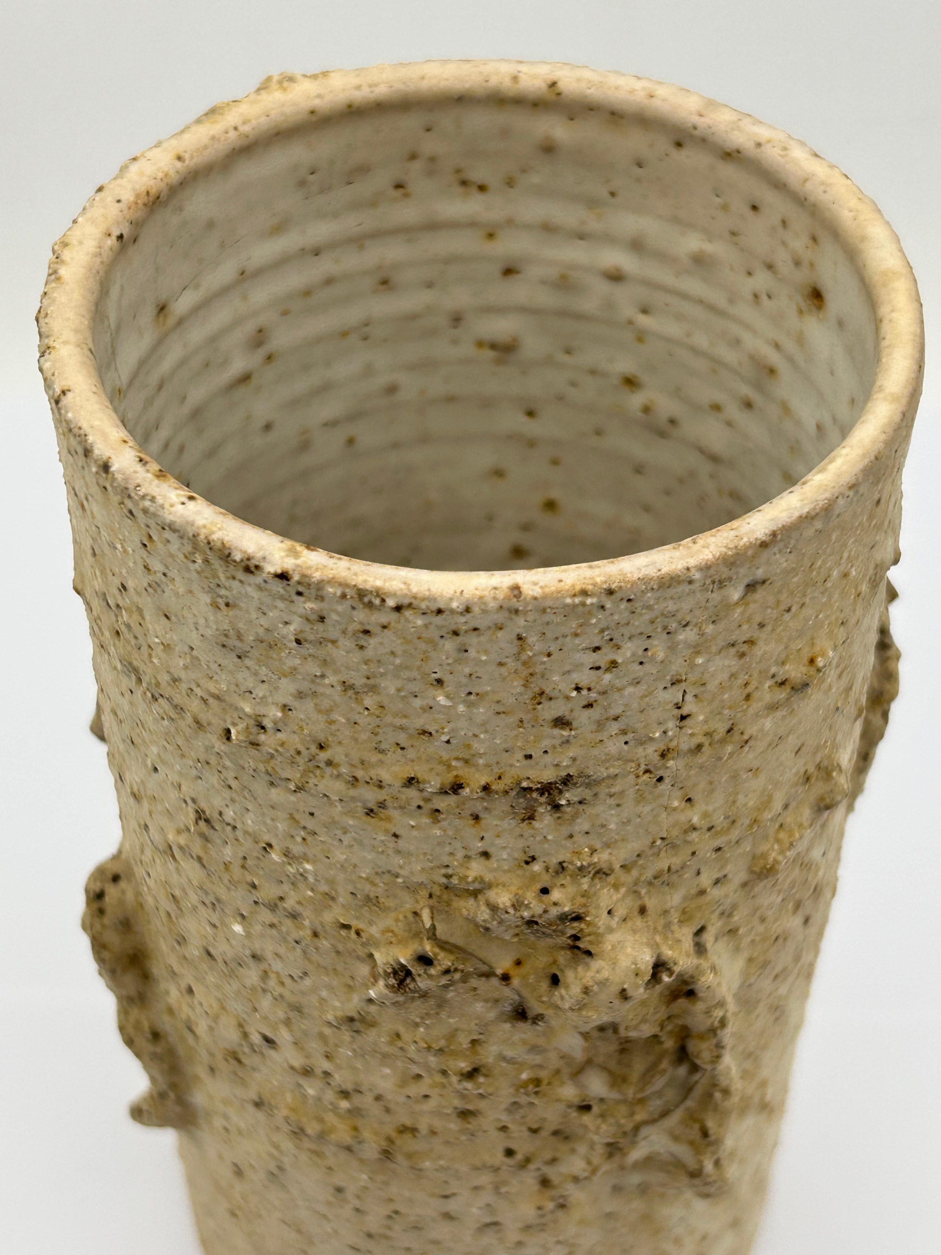 A modern studio pottery stoneware vase. This cylindrical ceramic vessel is crafted from a sandy-toned stoneware with an irregular, highly textured exterior featuring organic, raised protrusions and a speckled, oatmeal-colored glaze. The interior is smoother, revealing concentric wheel marks and a lighter, off-white glaze. The base features a clear, impressed artist’s mark appearing as ‘HL’.