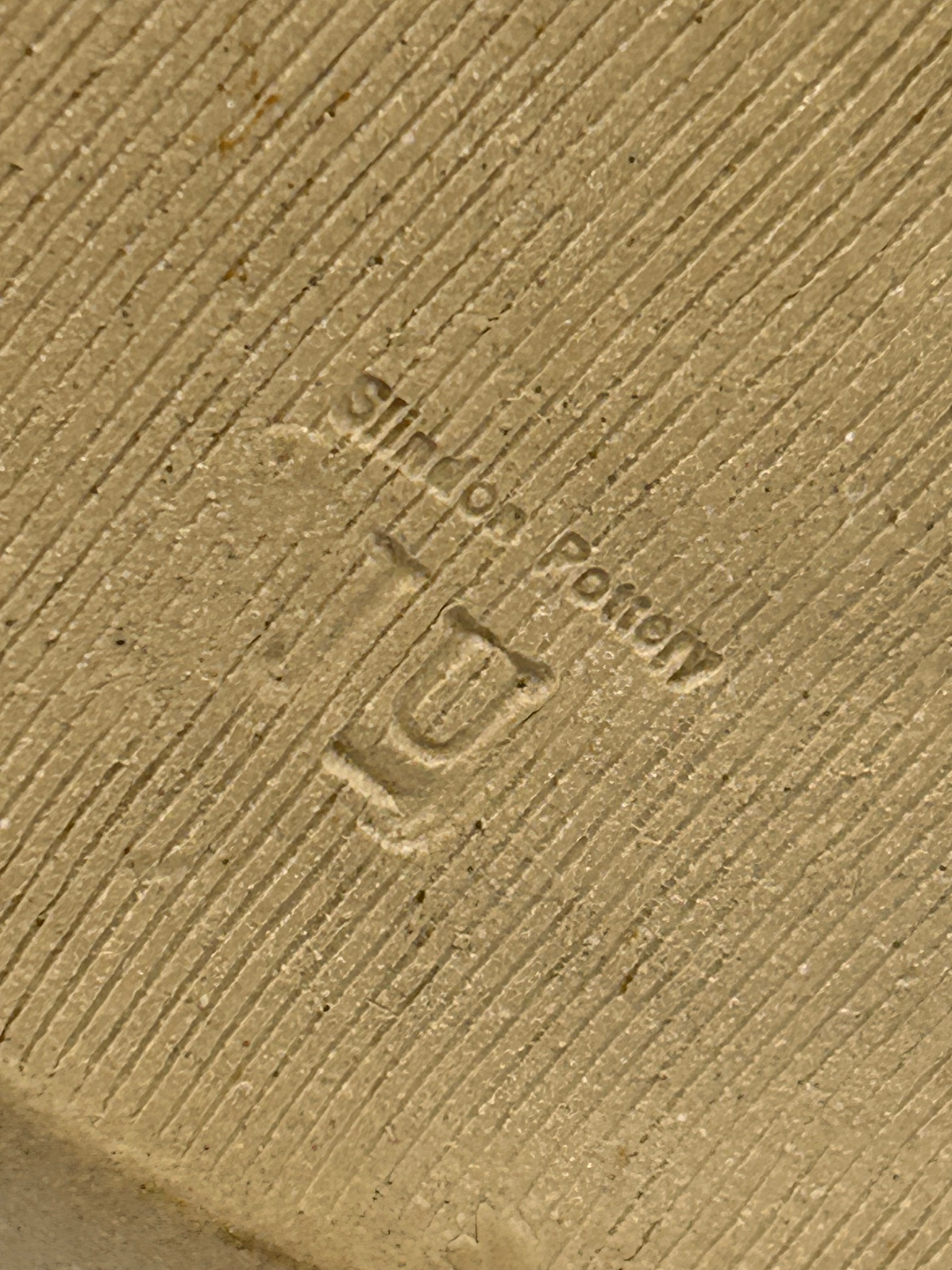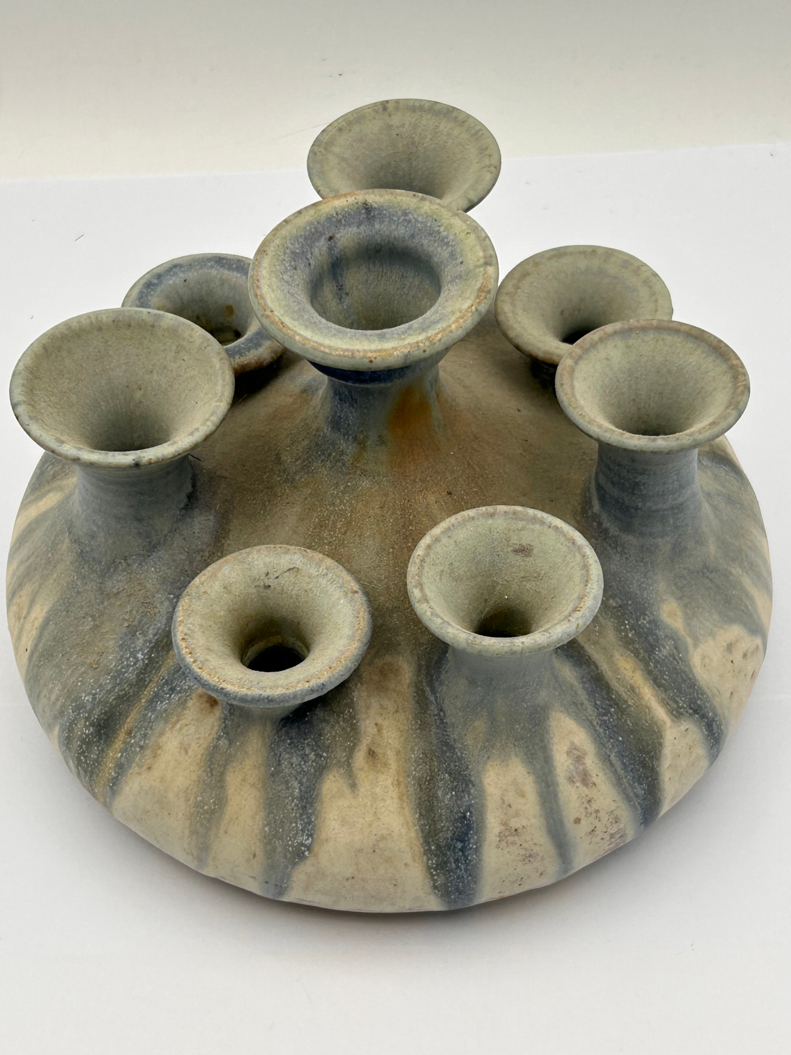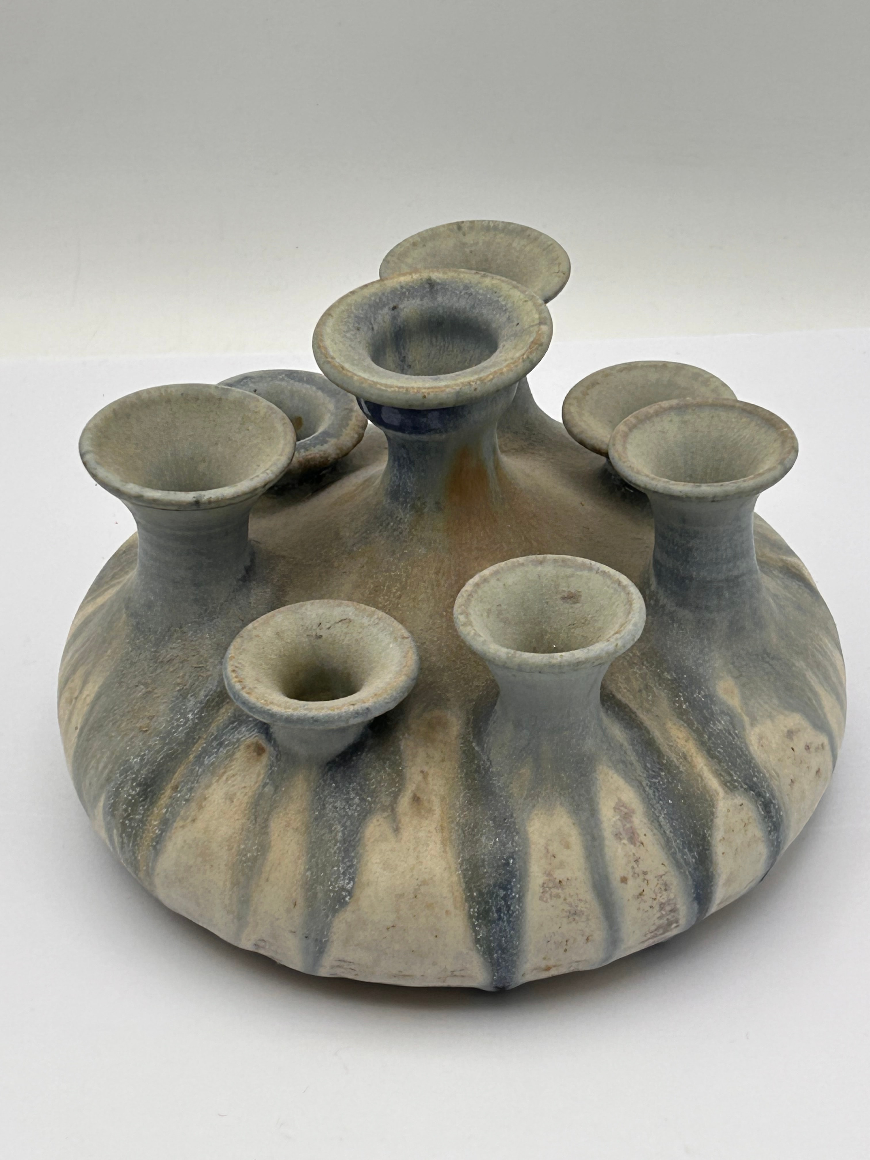 A Mid-Century Studio Pottery multi-spout vase by Shinon Pottery. This stoneware vessel features a wide, rounded base from which nine funnel-shaped spouts emerge, arranged circularly around a central, slightly taller spout, totaling ten openings. The piece is finished with a rustic, matte glaze exhibiting an off-white or cream ground heavily streaked with vertical drips of a muted blue-grey. The base is unglazed, revealing the coarse stoneware body with impressed horizontal ridges, and bears a clear stamped mark reading “Shinon Pottery” accompanied by a stylized ‘U’ maker’s mark.