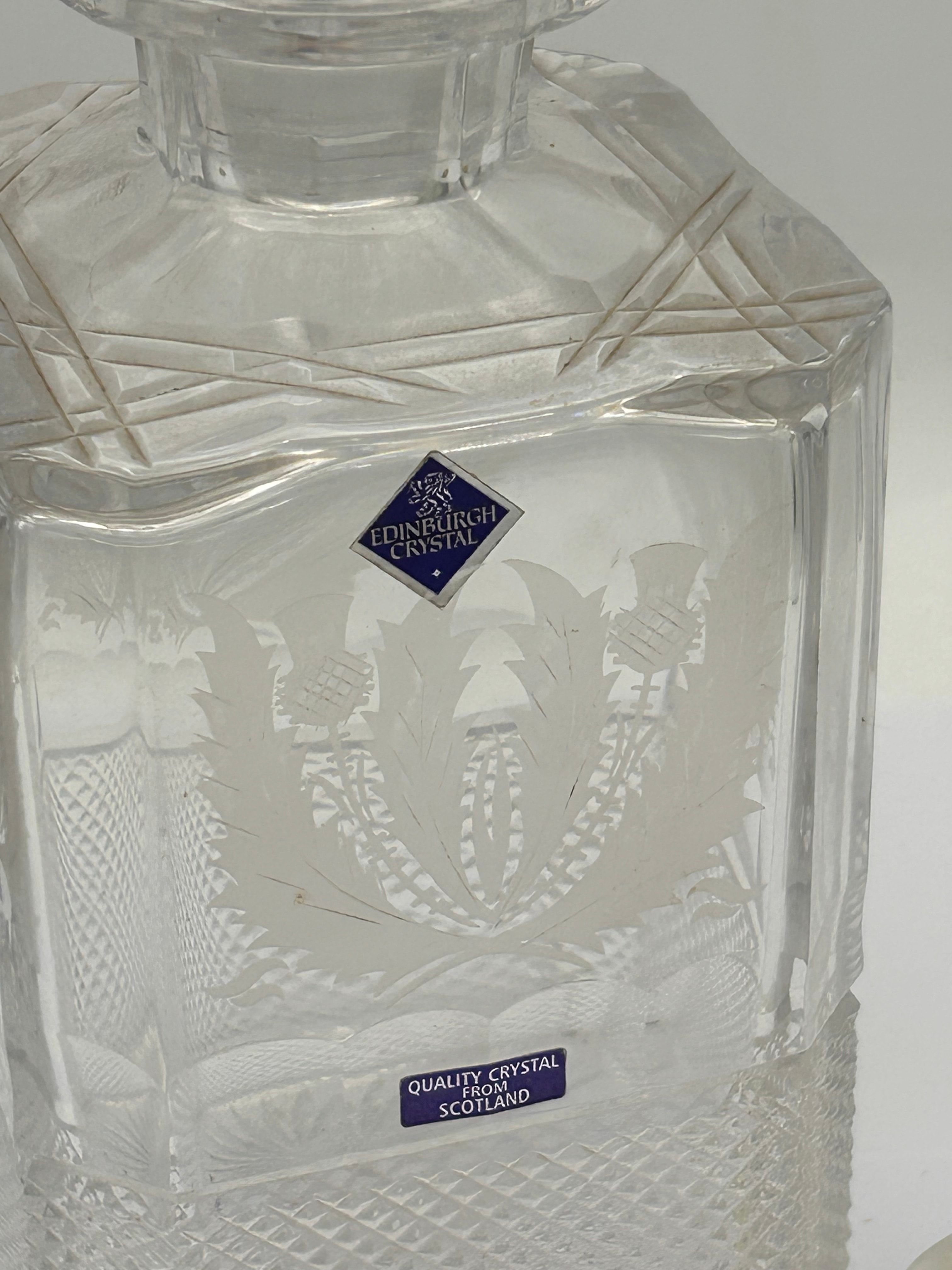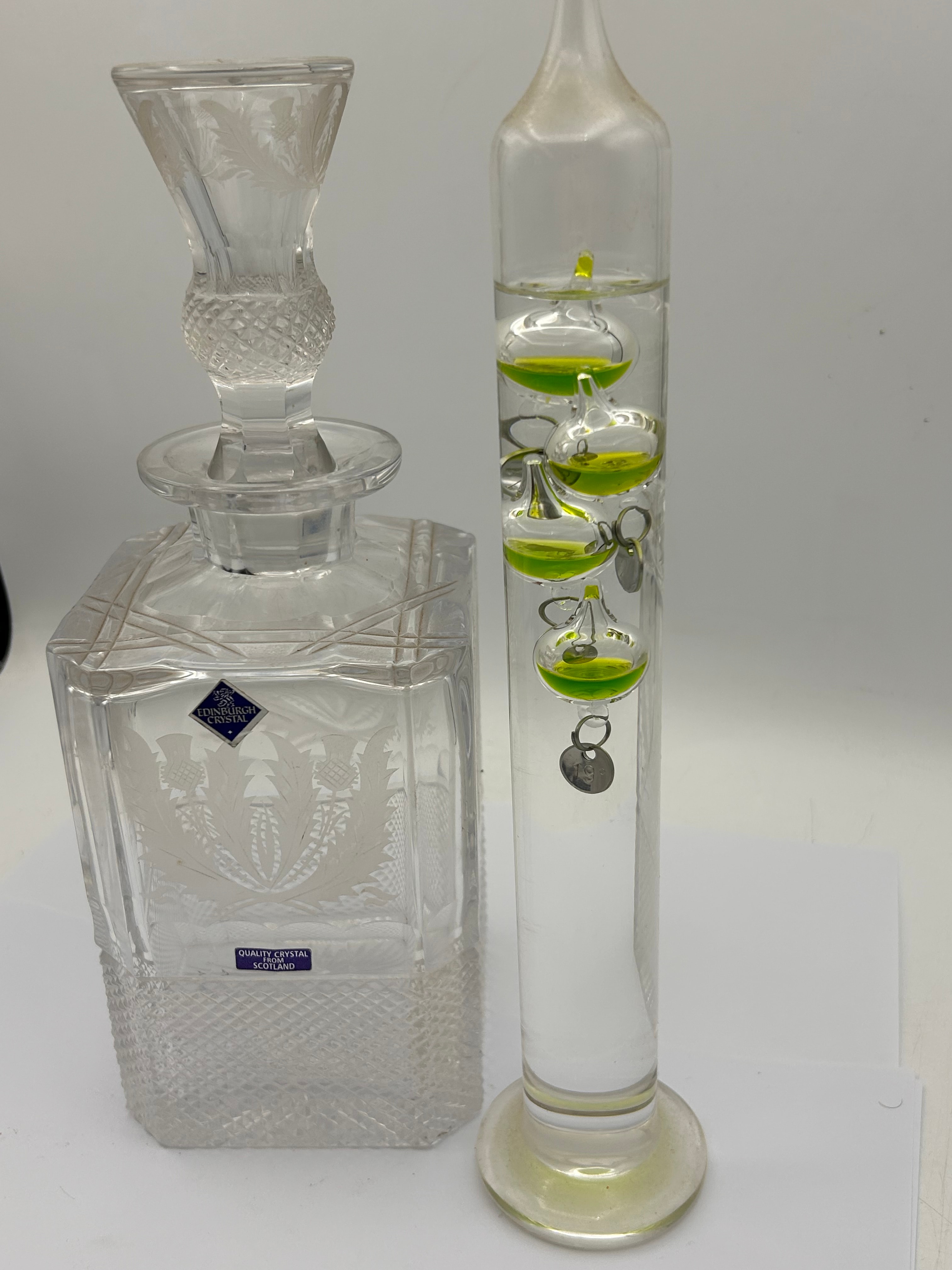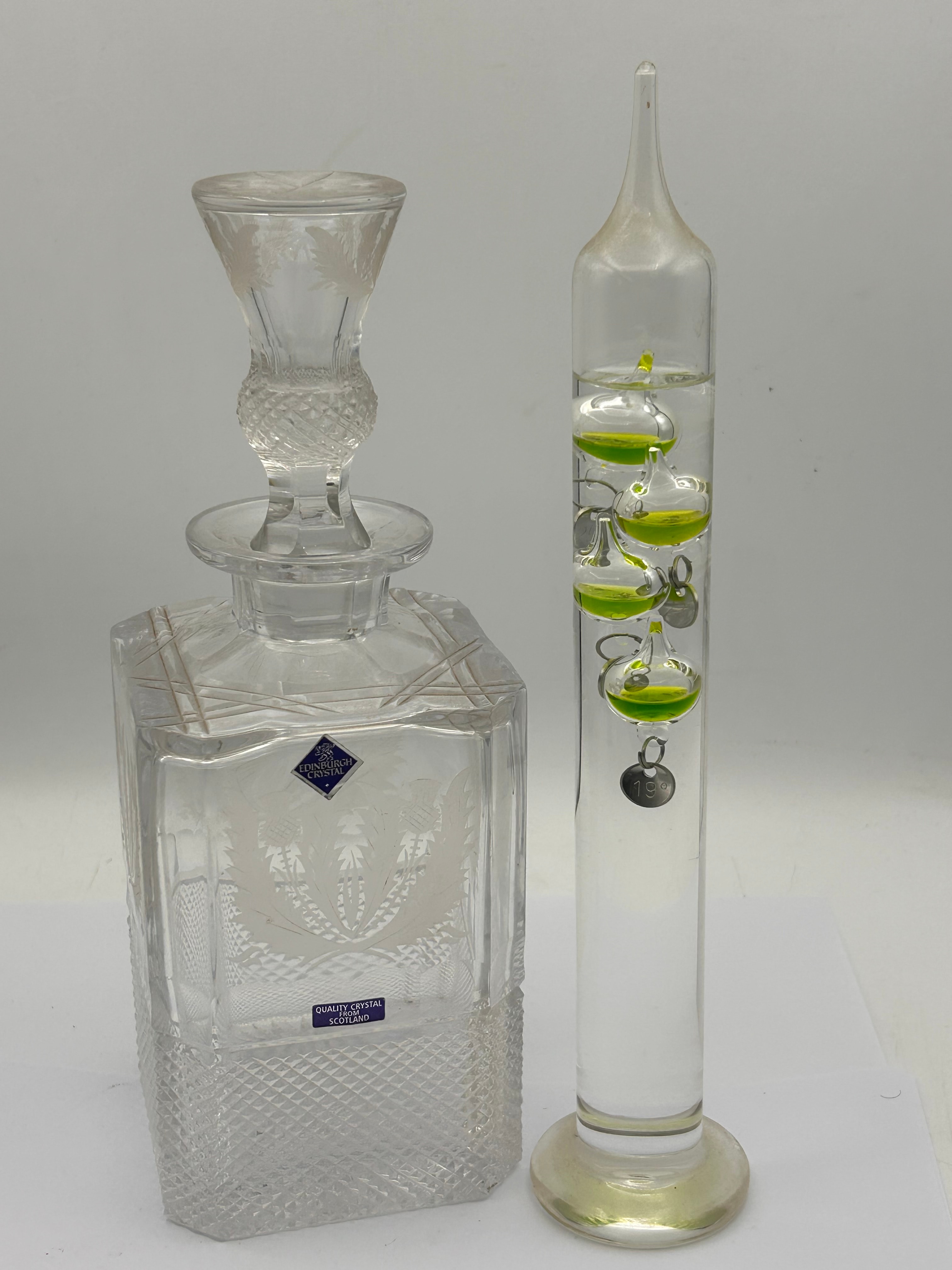 An Edinburgh Crystal ‘Thistle’ pattern decanter, square-bodied with a faceted stopper. The decanter features an etched thistle motif on its main body, complemented by diamond-cut patterns on its base, shoulders, and stopper. It bears two blue labels: one with “EDINBURGH CRYSTAL” and a thistle/crown logo, and another stating “QUALITY CRYSTAL FROM SCOTLAND.” Accompanied by a Galileo thermometer, a tall, cylindrical clear glass instrument with a tapered top and flared base, containing a clear liquid and at least five sealed glass spheres filled with green liquid, each with a small metallic tag.