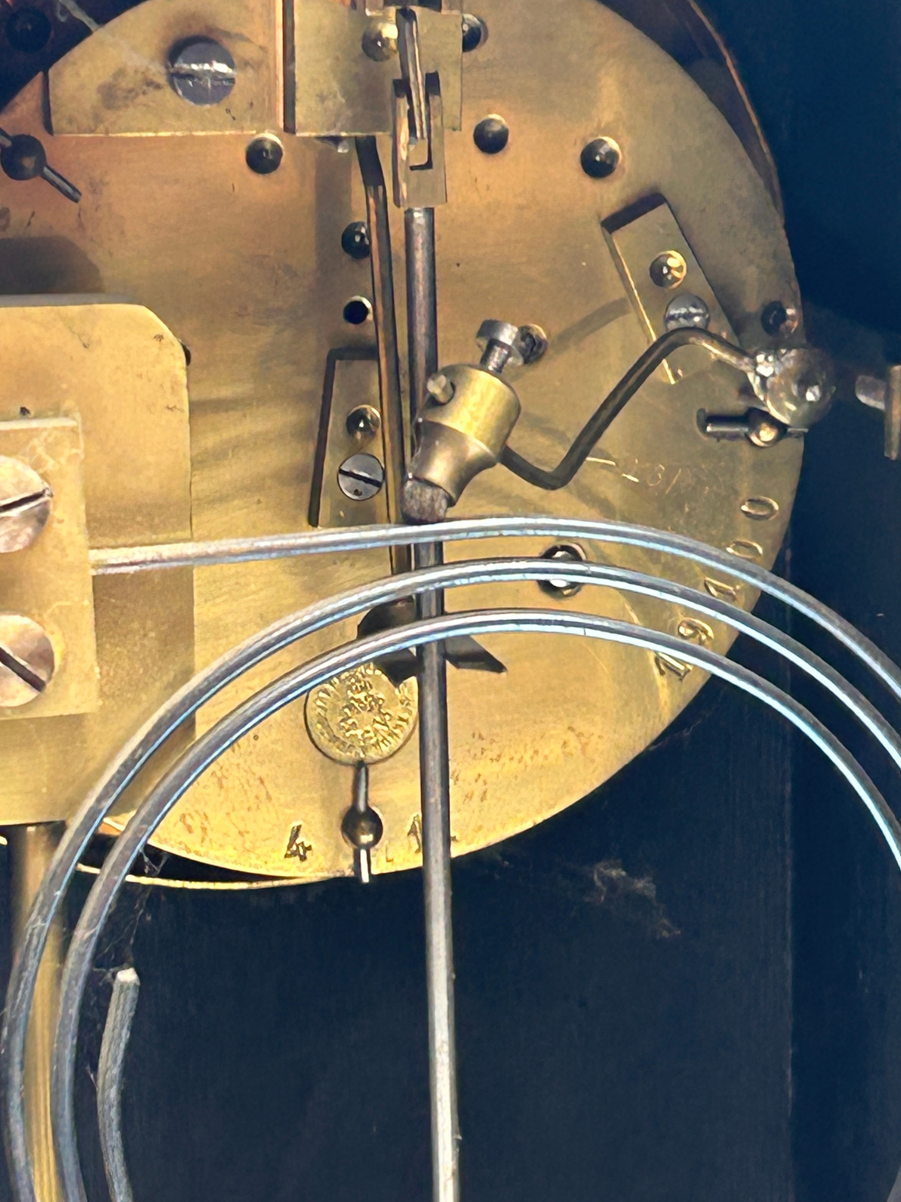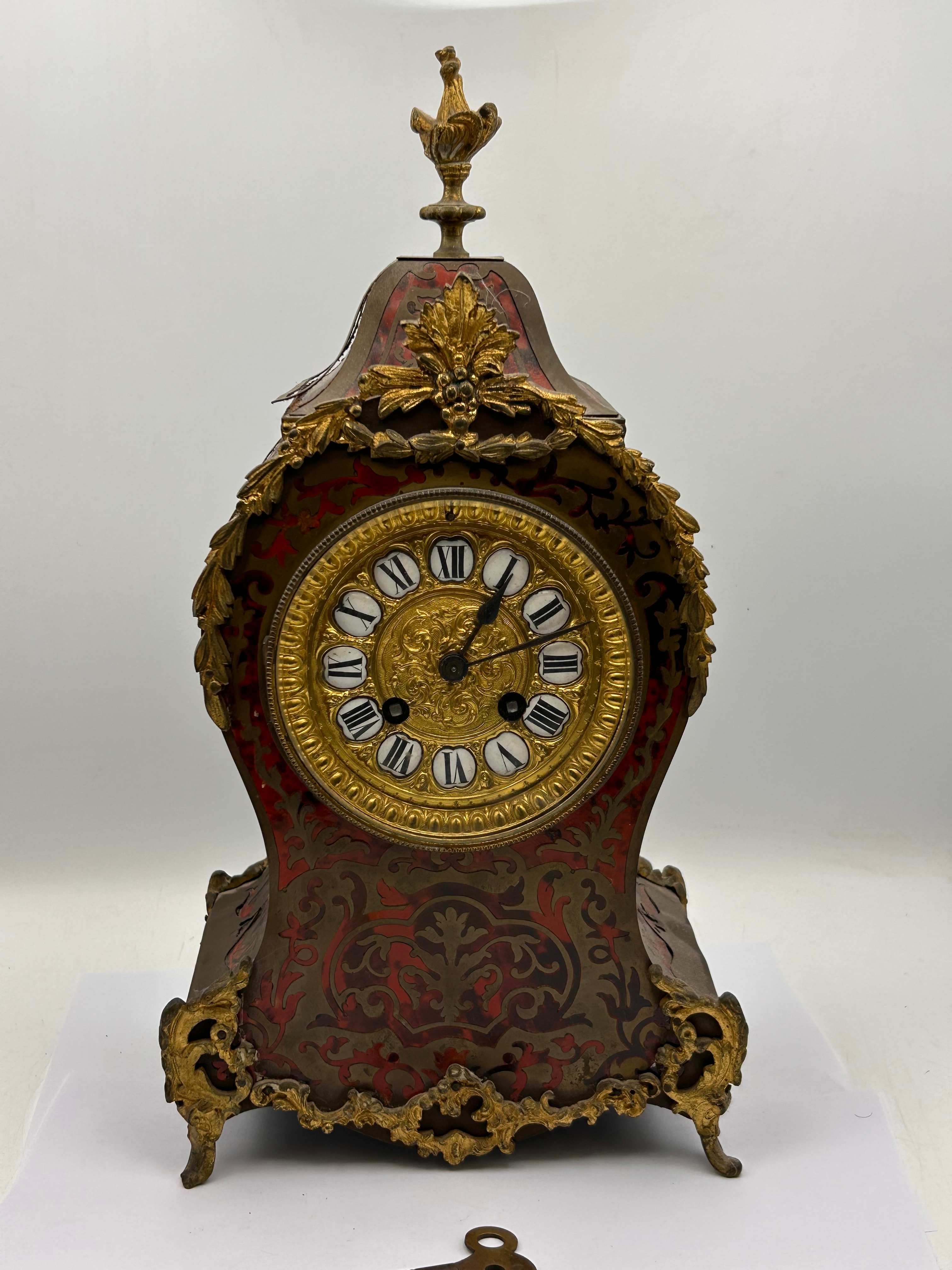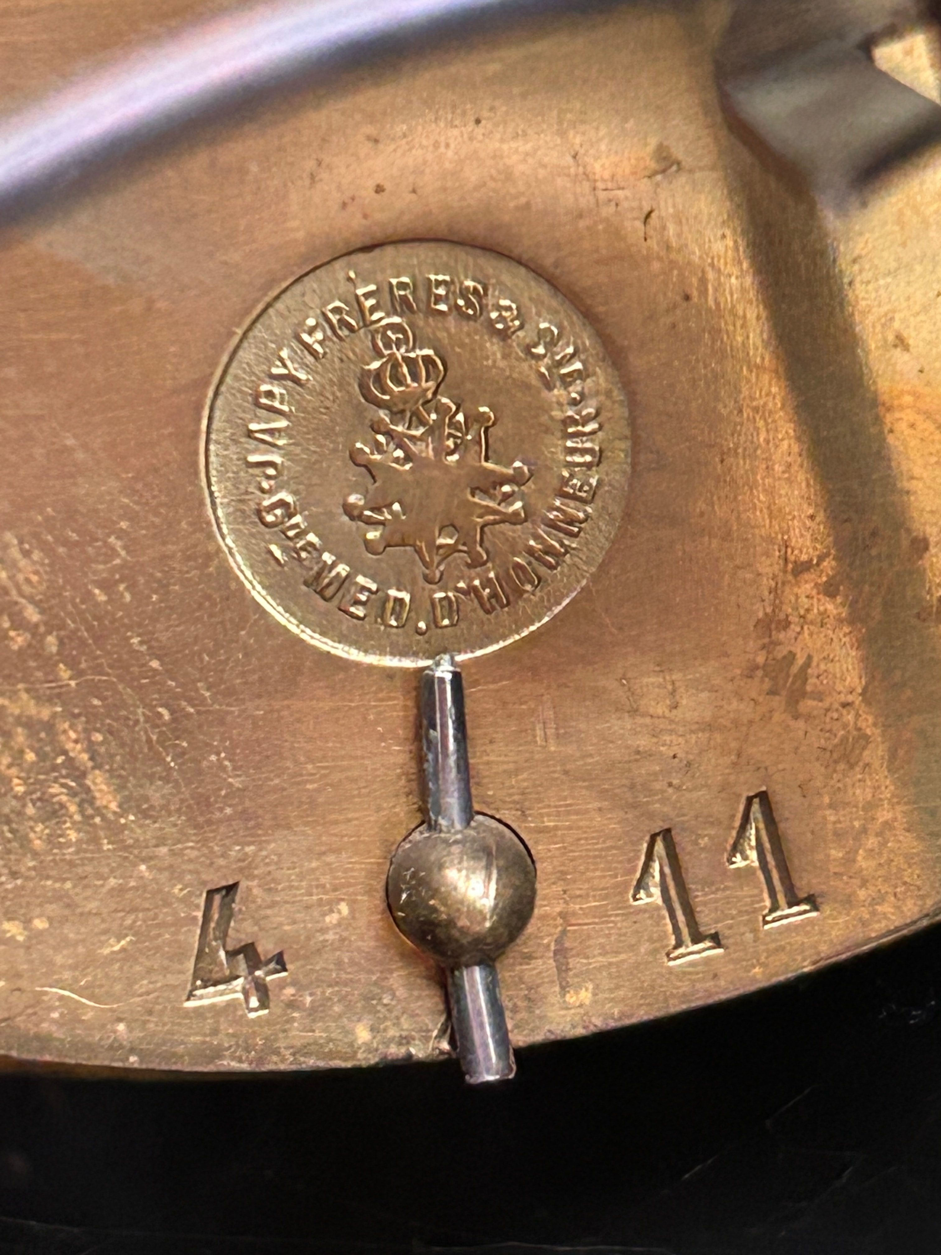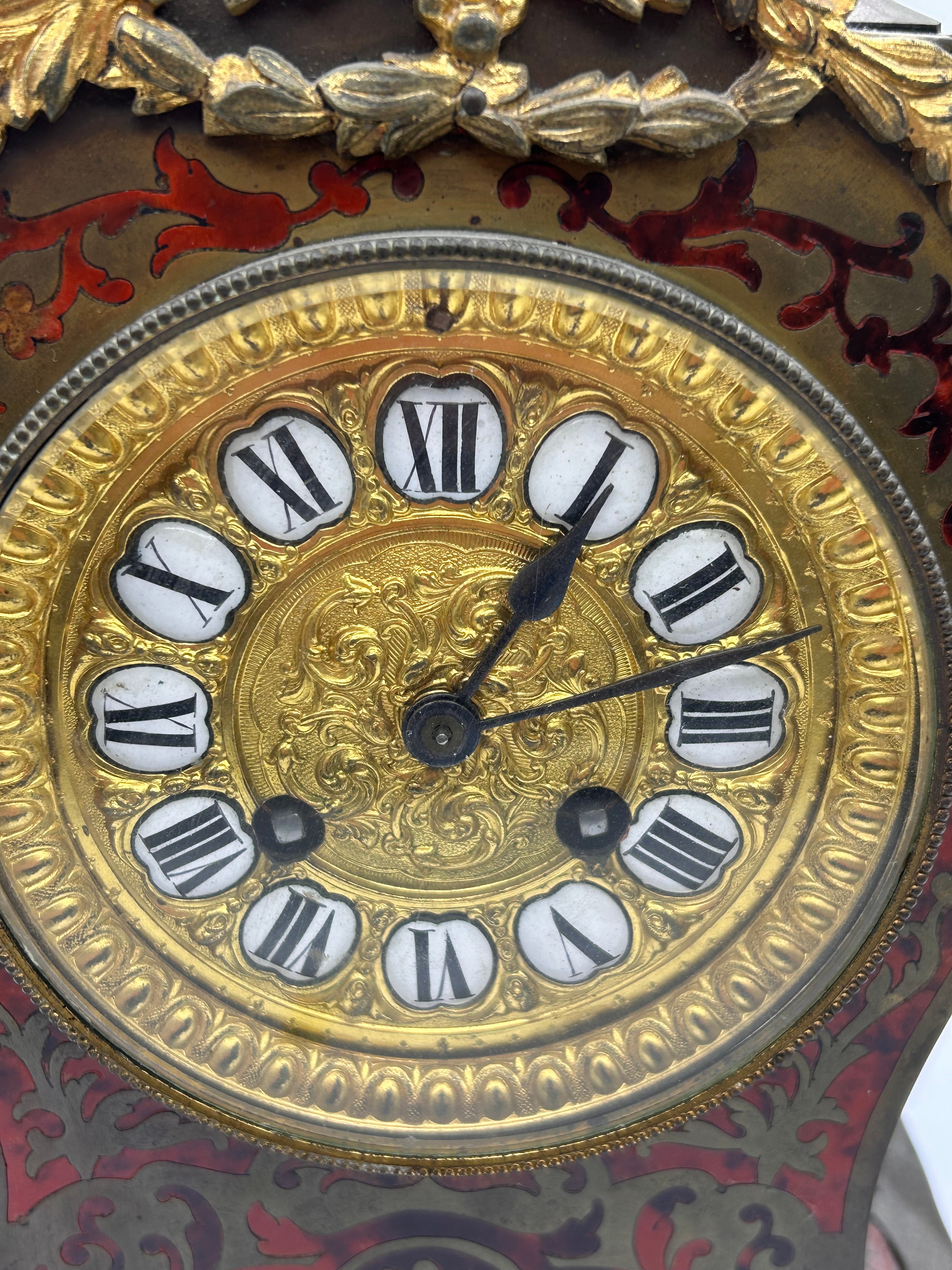 A late 19th Century French Rococo Revival mantel clock by Japy Freres. The ornate case is crafted from gilded bronze, featuring elaborate scrolling foliage, a finial, and standing on four scrolling feet. The body is decorated with red and dark patterned champlevé enamel. The circular dial has a gilded, heavily chased center with individual white enamel or porcelain cartouches displaying black Roman numerals (I-XII) for the hours, and features ornate black hands. The brass mechanism on the reverse bears a prominent circular medallion engraved with “J. JAPY FRÈRES & CIE. GRANDE MÉD. D’HONNEUR” along with a crown and star motif, and the numbers “4” and “11” stamped below.