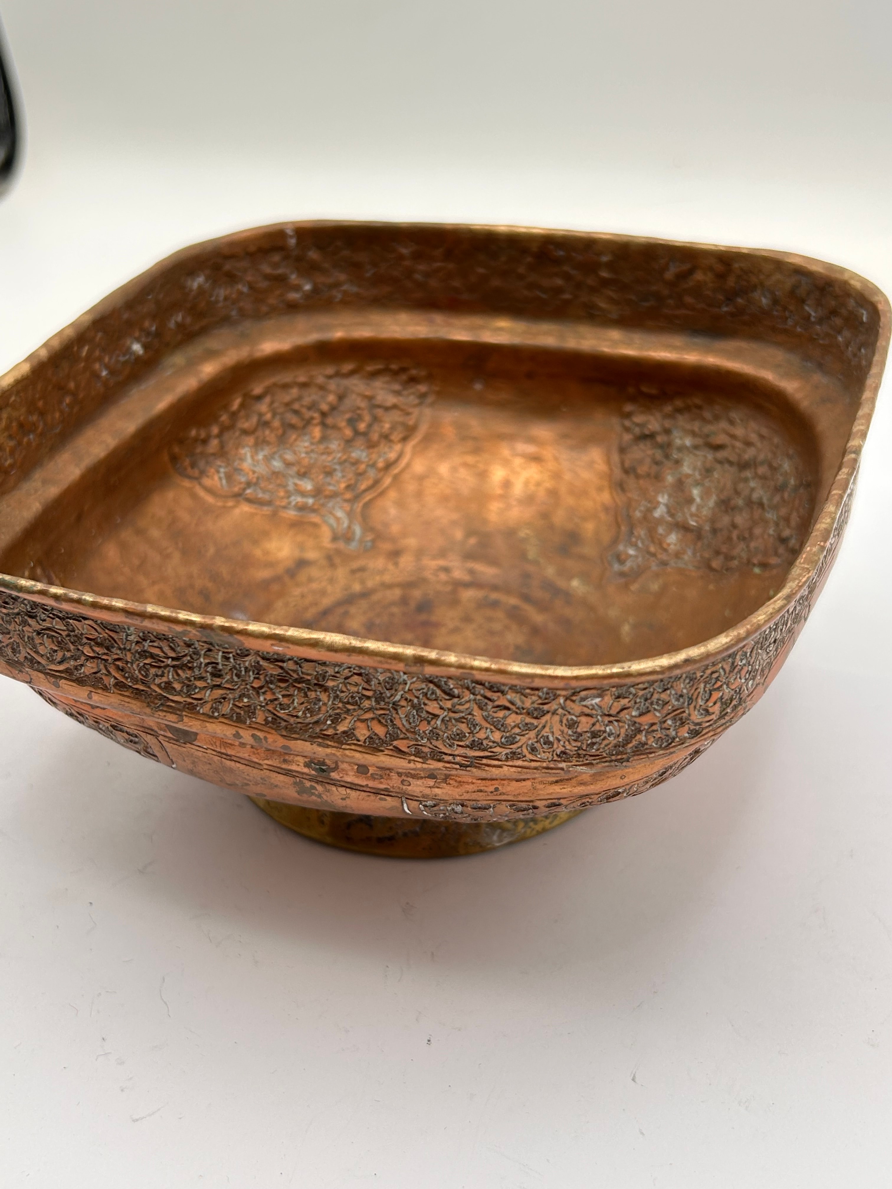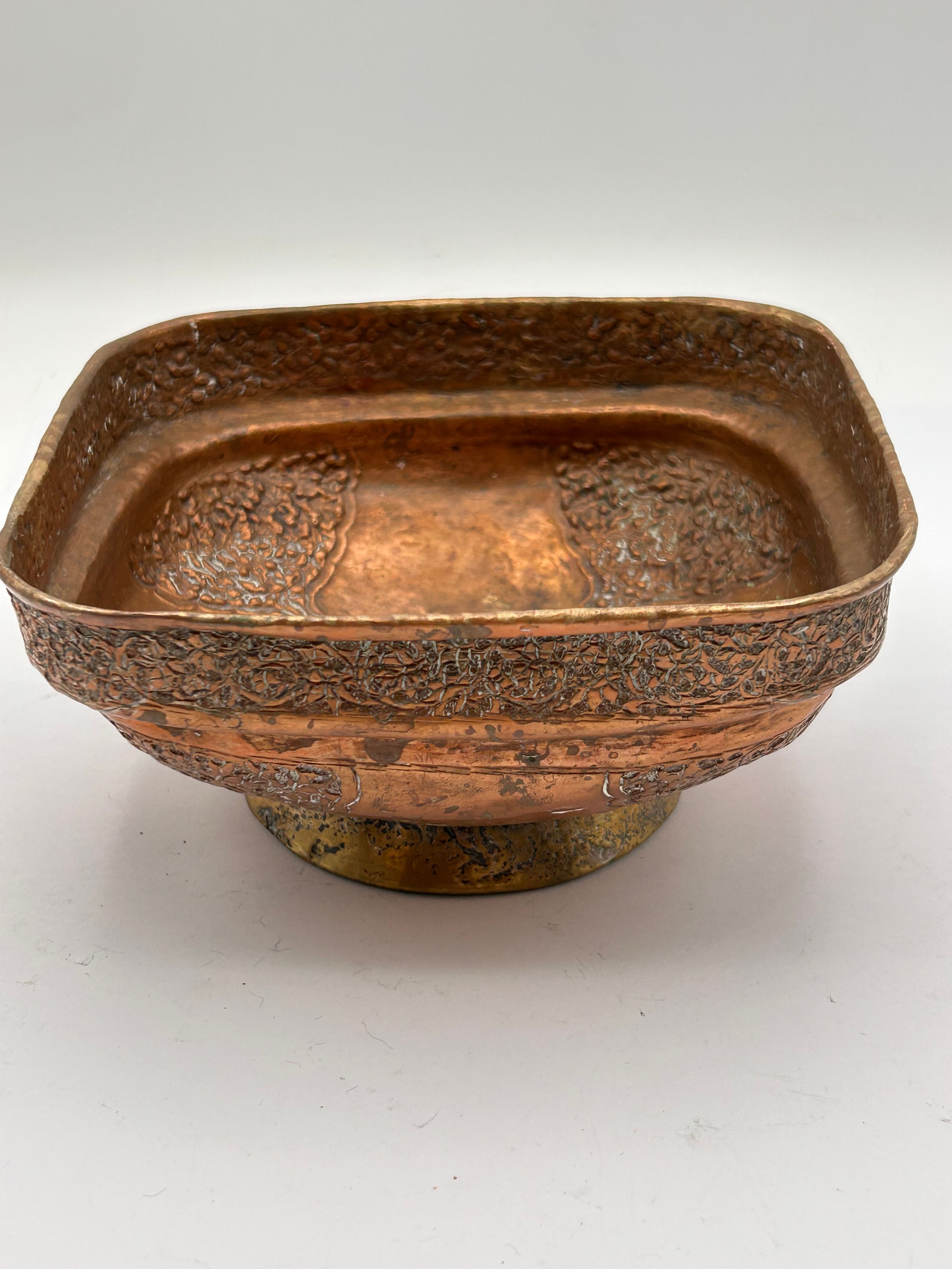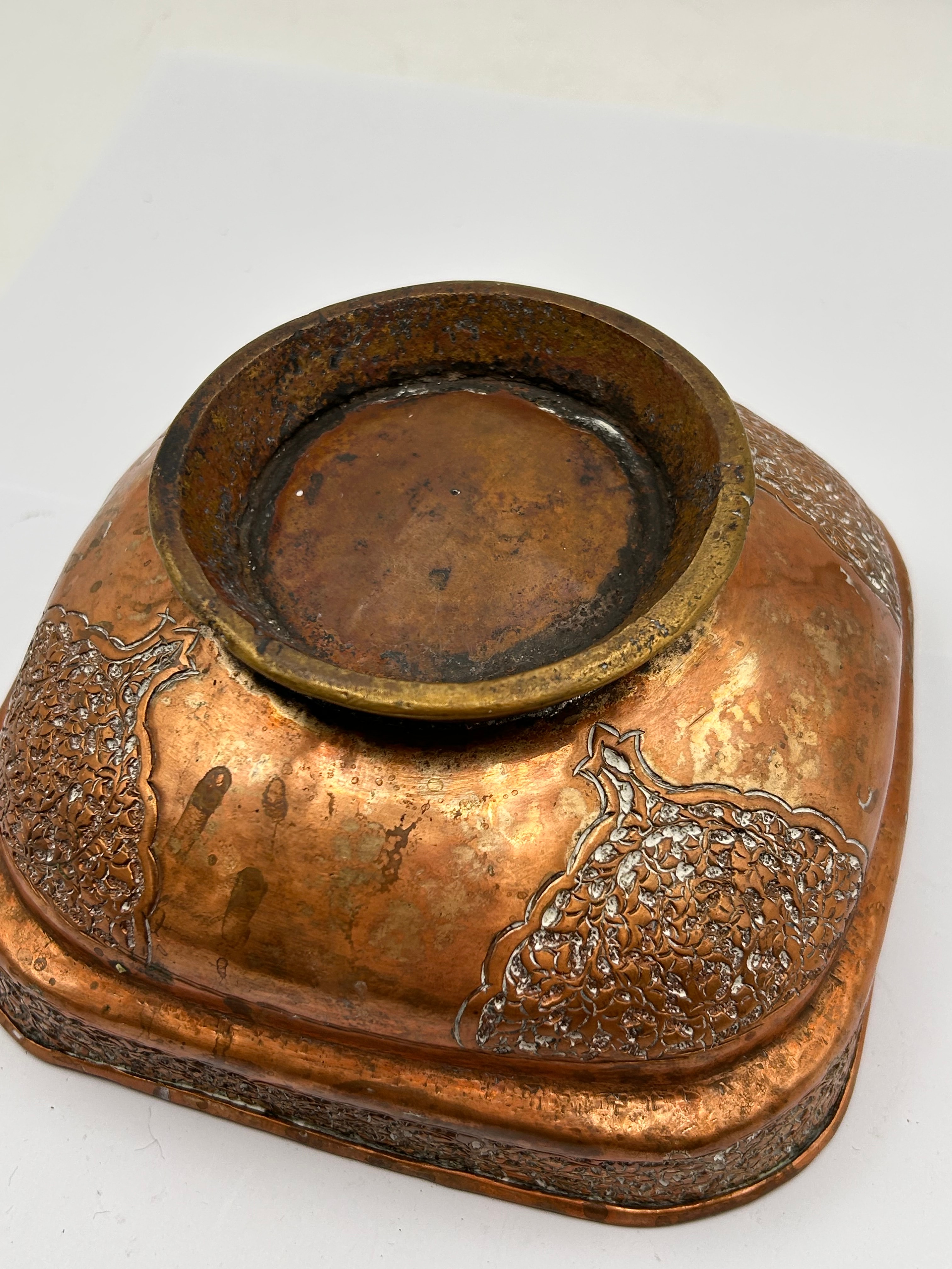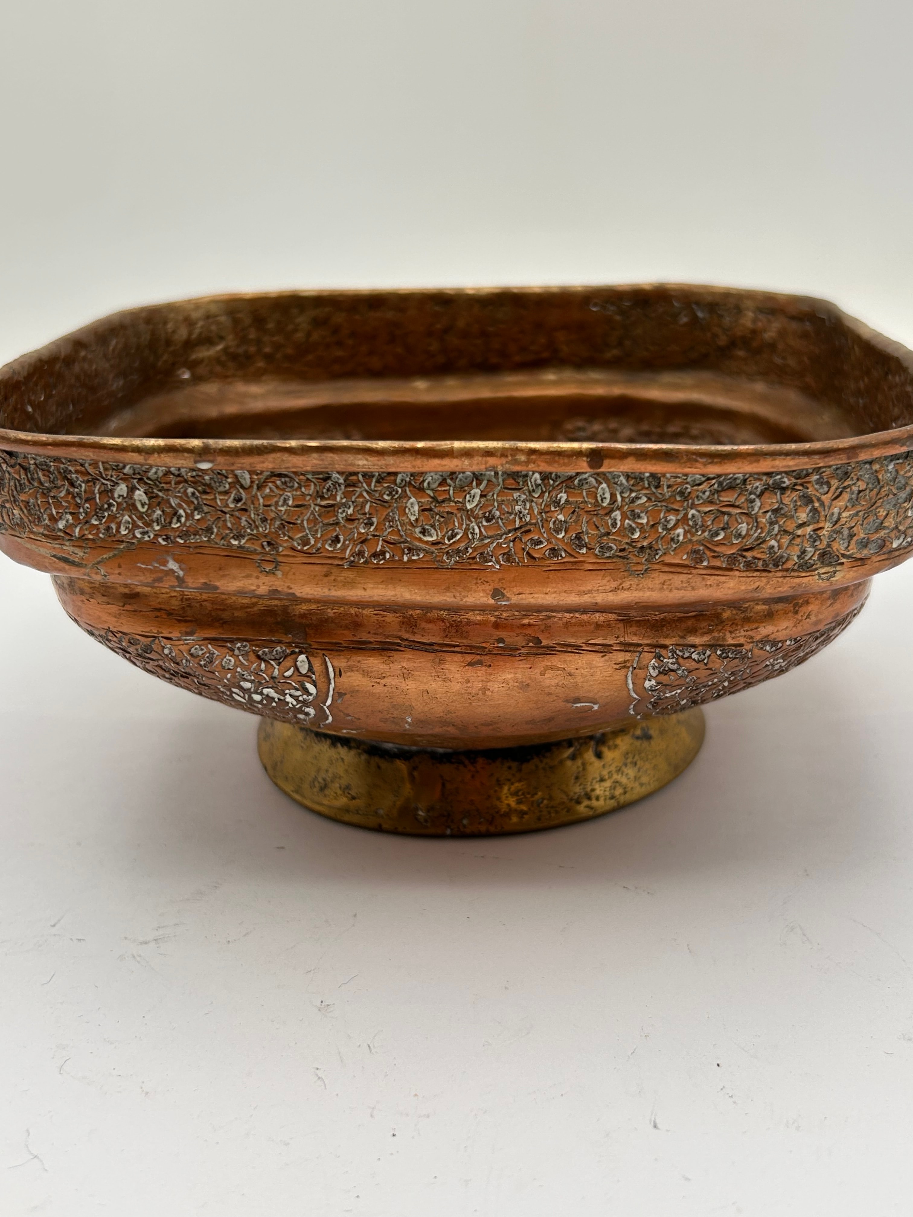 An antique hammered copper footed bowl, crafted in the Persian or Kashmiri style. This distinctive rectangular basin features gently rounded corners and a slightly everted rim. The body is primarily hammered copper, with a contrasting brass or bronze alloy foot. The exterior surface is elaborately adorned with intricate, seemingly chased and inlaid patterns of a lighter metal, likely silver or tin, forming dense arabesque or floral motifs around the rim and in lobed reserves on the body. No specific text or manufacturer’s marks are discernible.