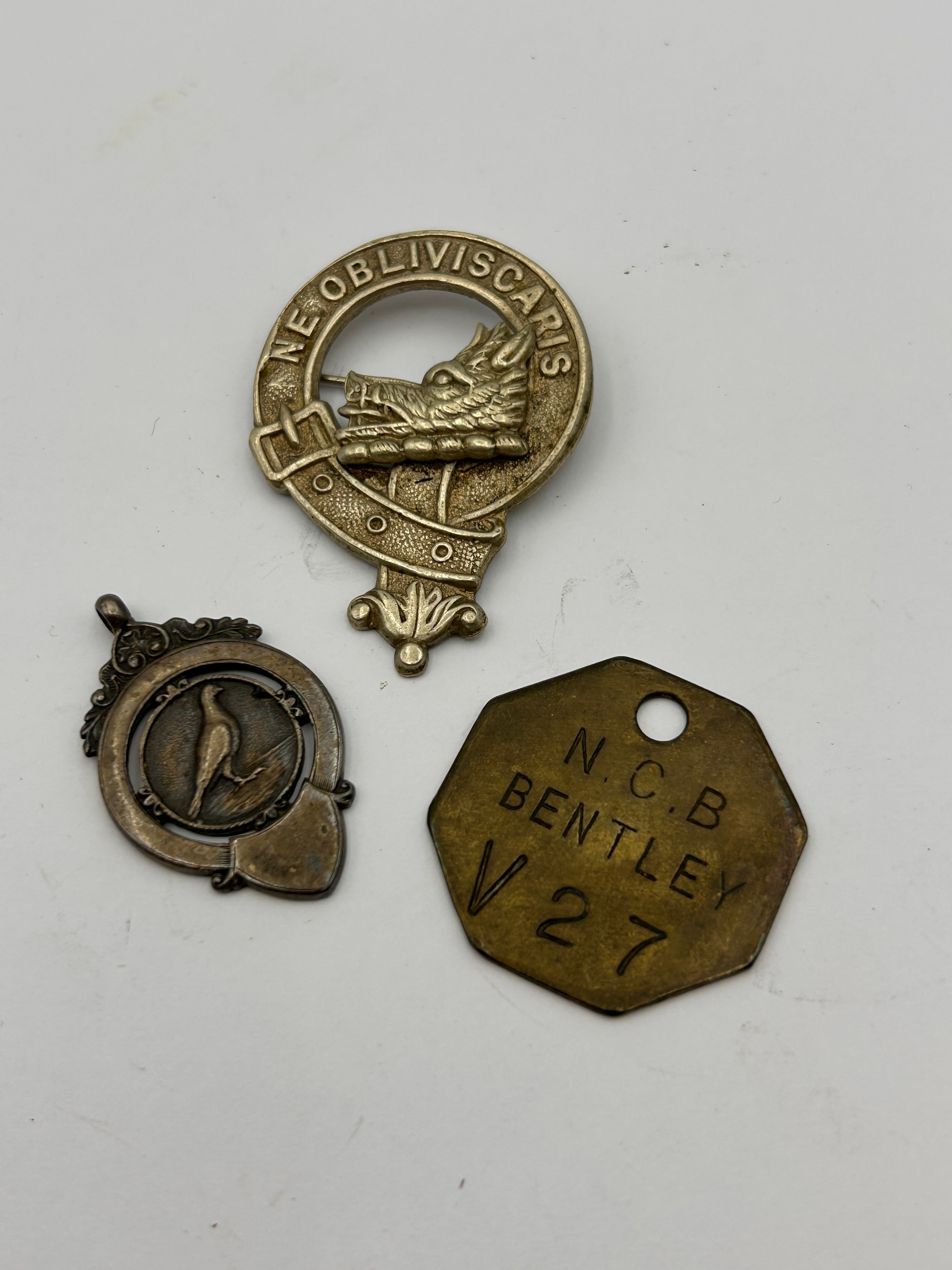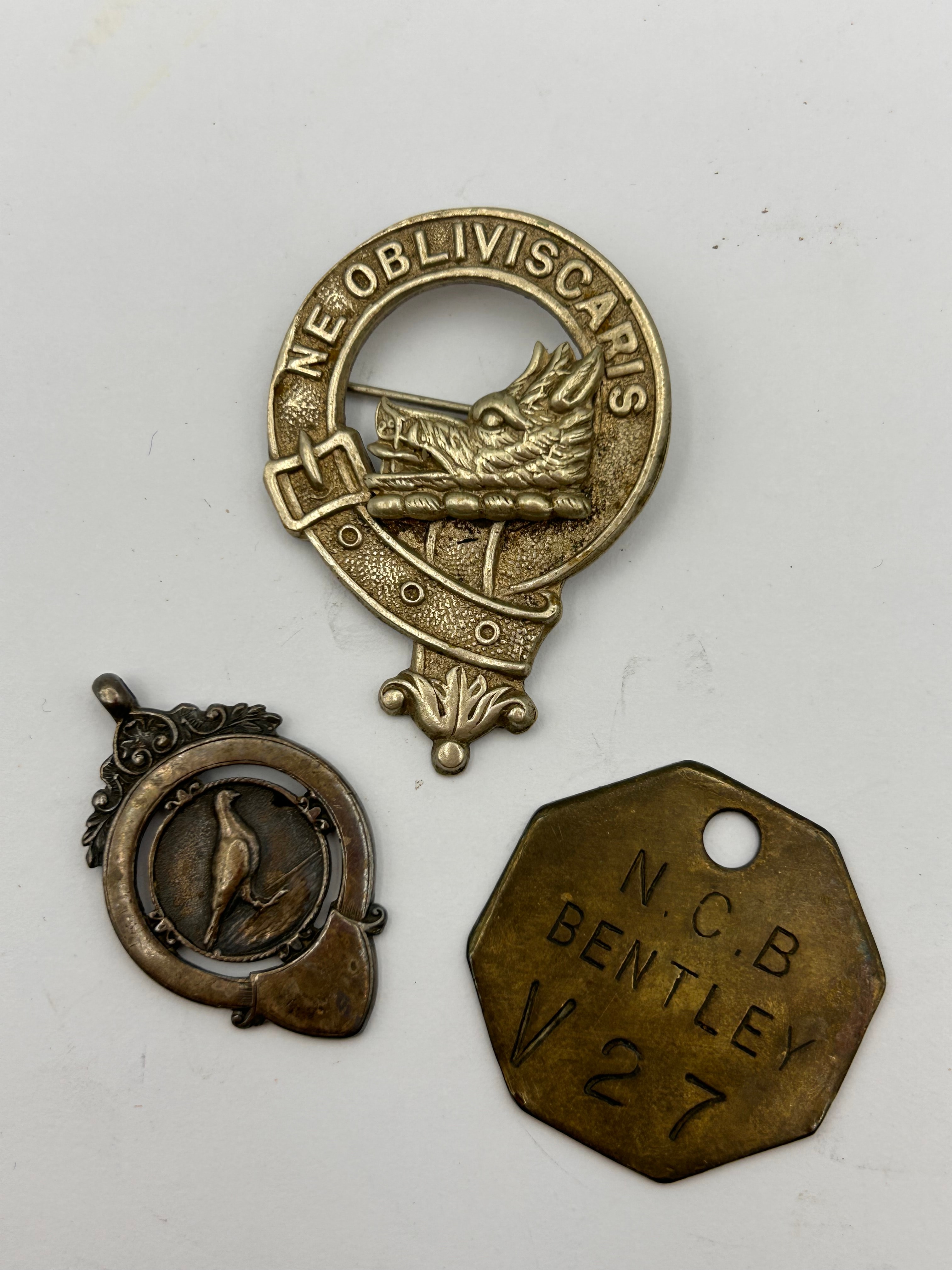 This lot comprises three distinct metal items, all appearing to be patinated base metal, likely brass or bronze. The primary item is a Scottish Clan Campbell ‘Ne Obliviscaris’ crest badge brooch, featuring a dragon-like head crest within a buckled strap, inscribed with the Latin motto ‘NE OBLIVISCARIS’ (Do not forget). Below it, to the left, is a decorative pendant or charm depicting a bird, possibly a heron or crane, within an ornate circular frame. The third item, located bottom right, is an octagonal metal tag with a suspension hole, clearly engraved with ‘N.C.B.’, ‘BENTLEY’, and ‘V 27’. All three pieces exhibit surface wear, scratches, and darkened patination commensurate with their apparent age and use.