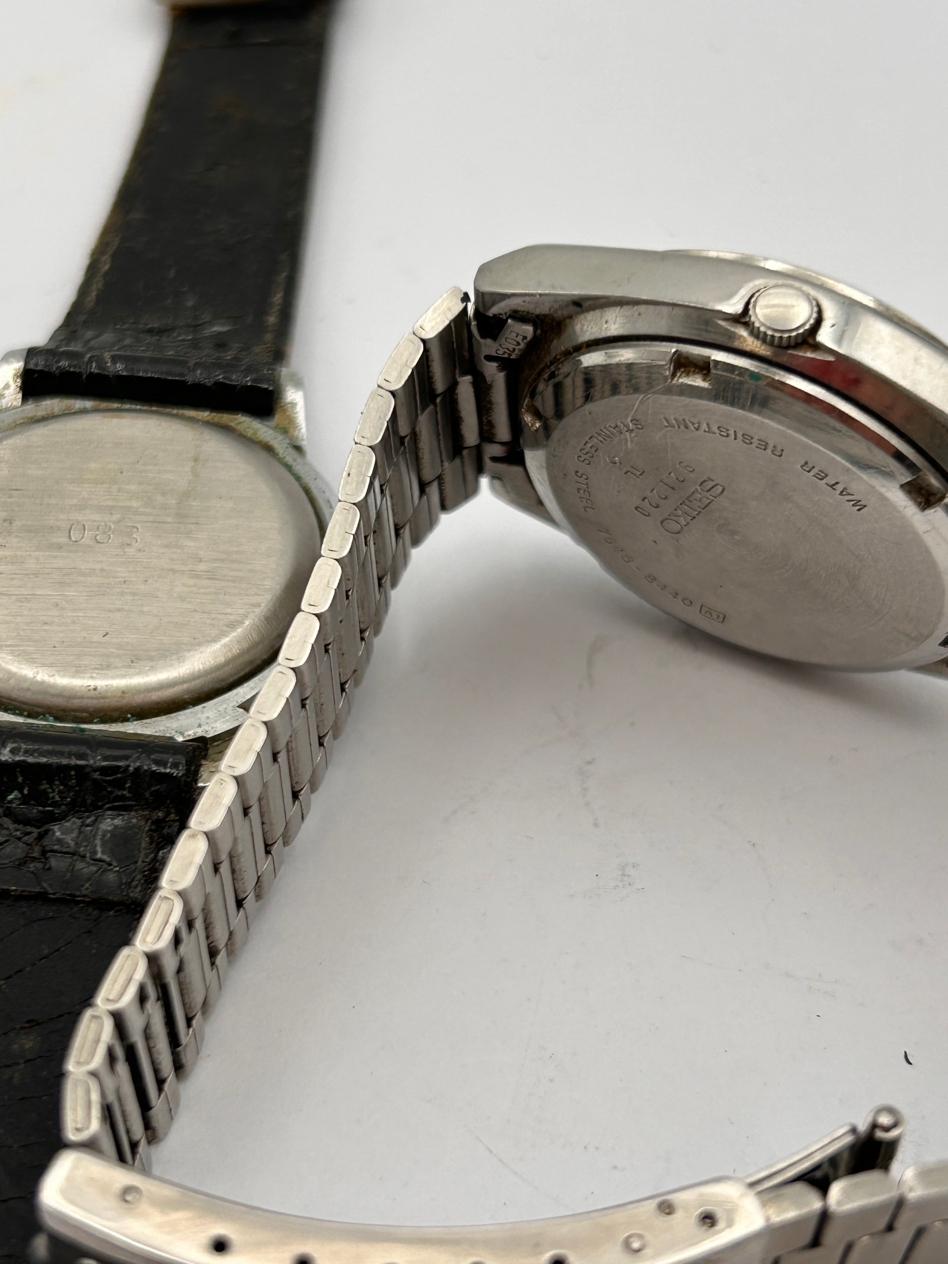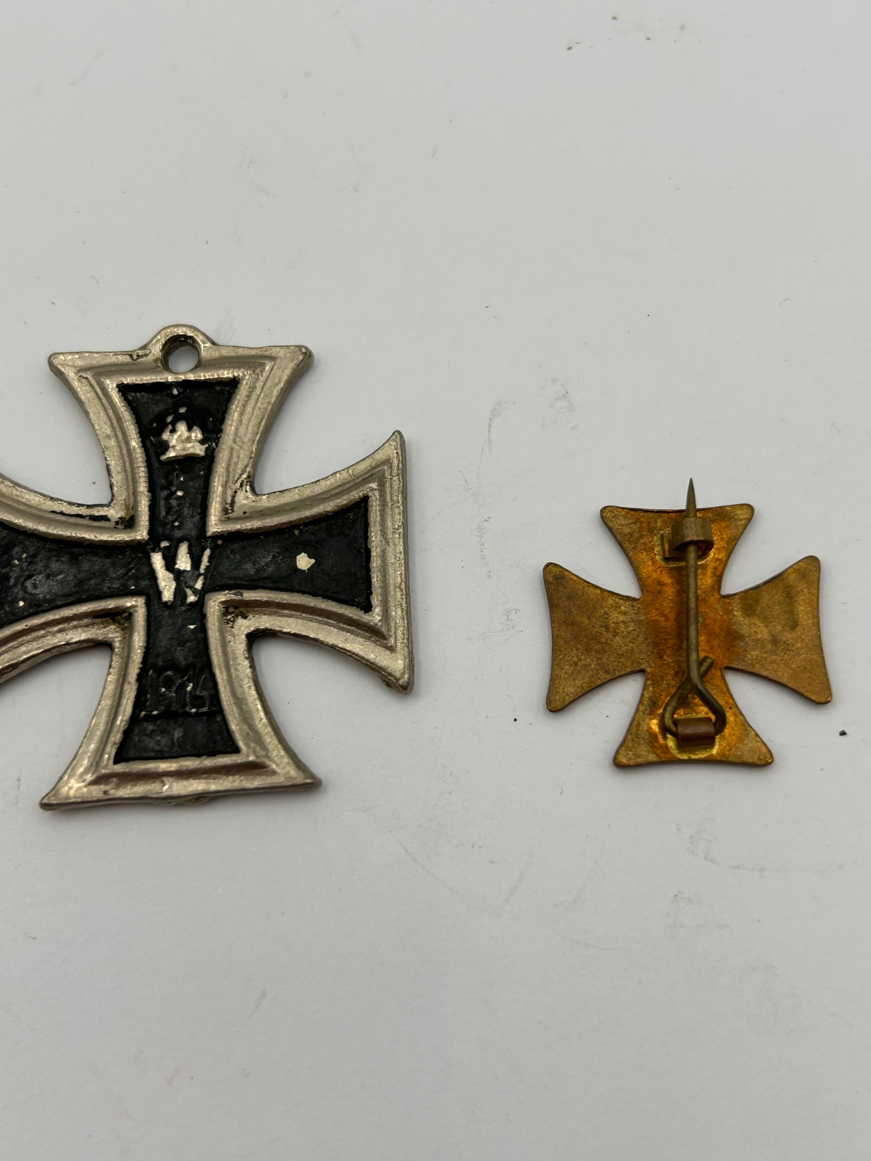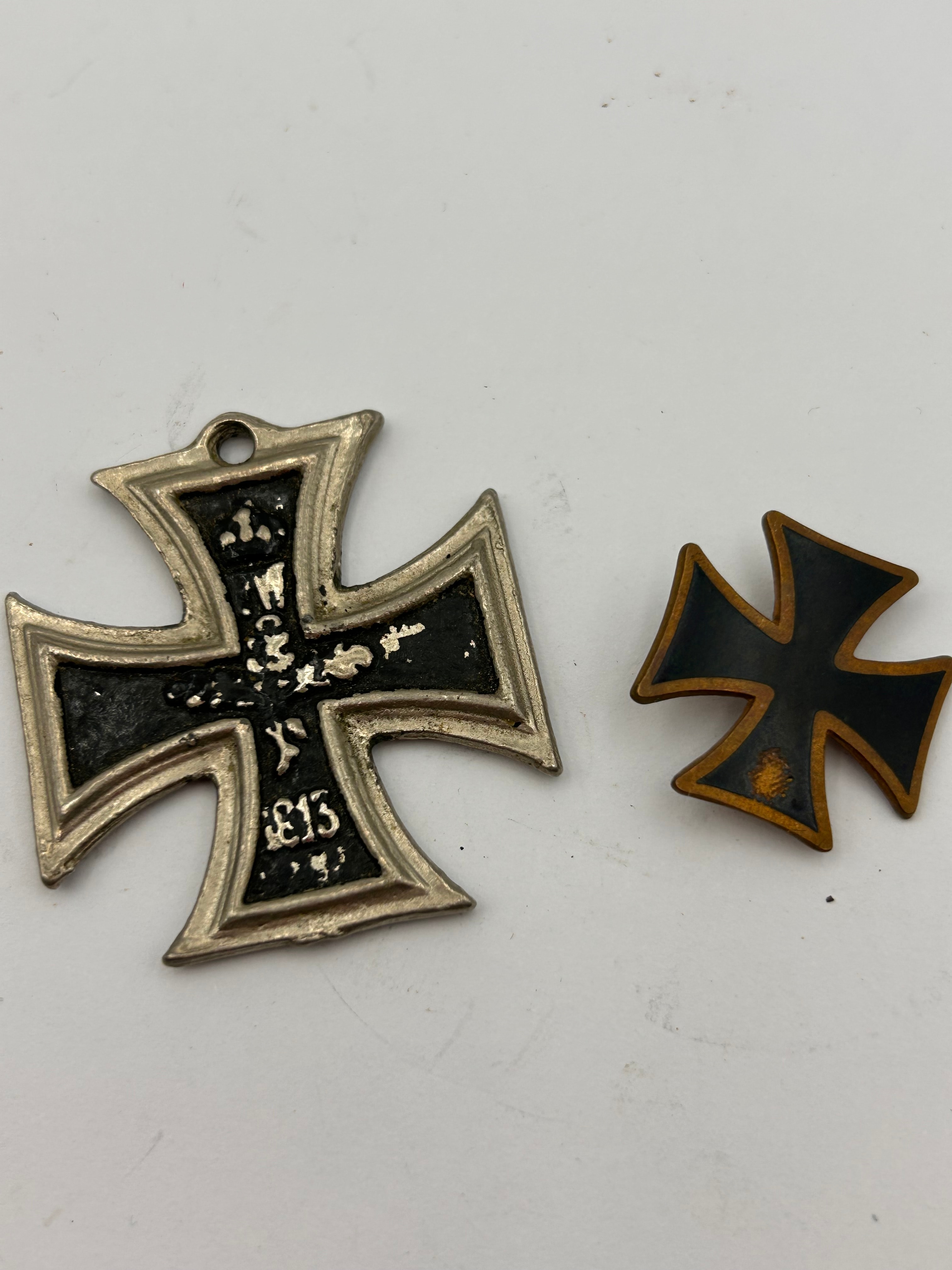 A group comprising two Imperial German Iron Cross medallions and two wristwatches. The larger medallion, identified as a WWI Imperial German Iron Cross 1914 2nd Class, features a silver-tone metal frame with black enamel inlay, depicting a crown, the letter ‘W’, and the year ‘1914’ on its front. It is fitted with a suspension loop at the top. The smaller cross, of similar design, displays black enamel over a darker, possibly bronze-toned, metal, and is fitted with a pin-back mechanism. The first wristwatch is a round-cased Sekonda with a white dial featuring Arabic numerals, marked “18 JEWELS”, and attached to a worn black leather-patterned strap; its case back is stamped “033” and “WATERPROOF STAINLESS STEEL BACK”. The second wristwatch is a Seiko automatic, housed in a round silver-tone case with an integrated metal bracelet, featuring a black dial with baton markers and a day-date window displaying “JEU 15”; the case back is marked “SEIKO”, “WATER RESISTANT”, “STAINLESS STEEL”, and model numbers “971220” and “6309-8130”.