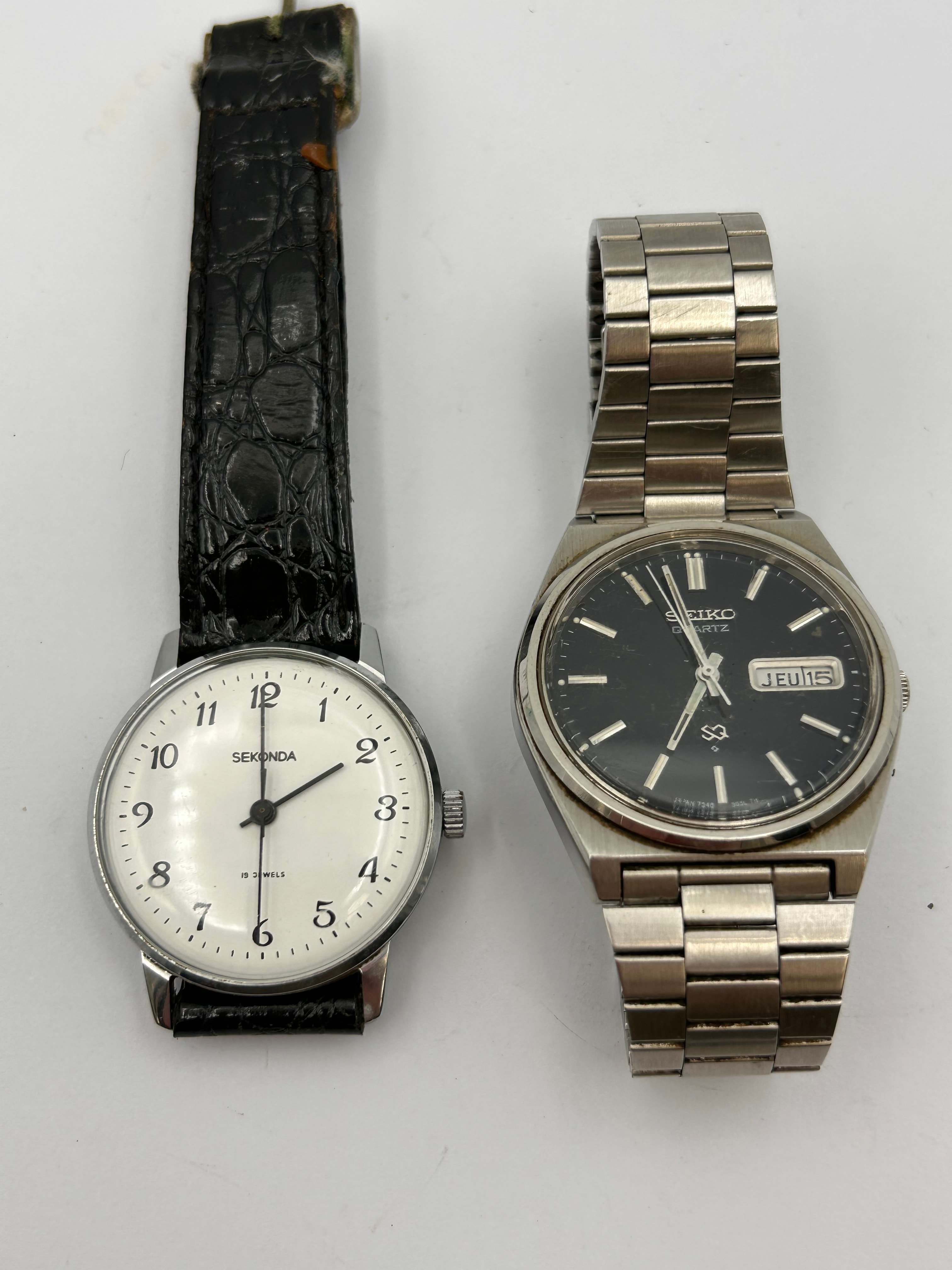 A Seiko Quartz SQ 7546-8440 wristwatch, featuring a stainless steel case and integrated link bracelet. The black dial displays applied silver-tone baton markers, ‘SEIKO QUARTZ’ text, and a day/date complication currently showing ‘JEU 15’. The caseback is marked ‘SEIKO,’ ‘STAINLESS STEEL,’ ‘WATER RESISTANT,’ along with partially legible serial/model numbers including ‘91220’ and ‘8T45-8020’. Accompanied by a Sekonda 18 Jewels wristwatch, with a round, silver-tone case and a white dial featuring black Arabic numerals and marked ‘SEKONDA’ and ’18 JEWELS’. It is fitted with a black leather-patterned strap. The plain metal caseback has a partial ‘083’ engraving.