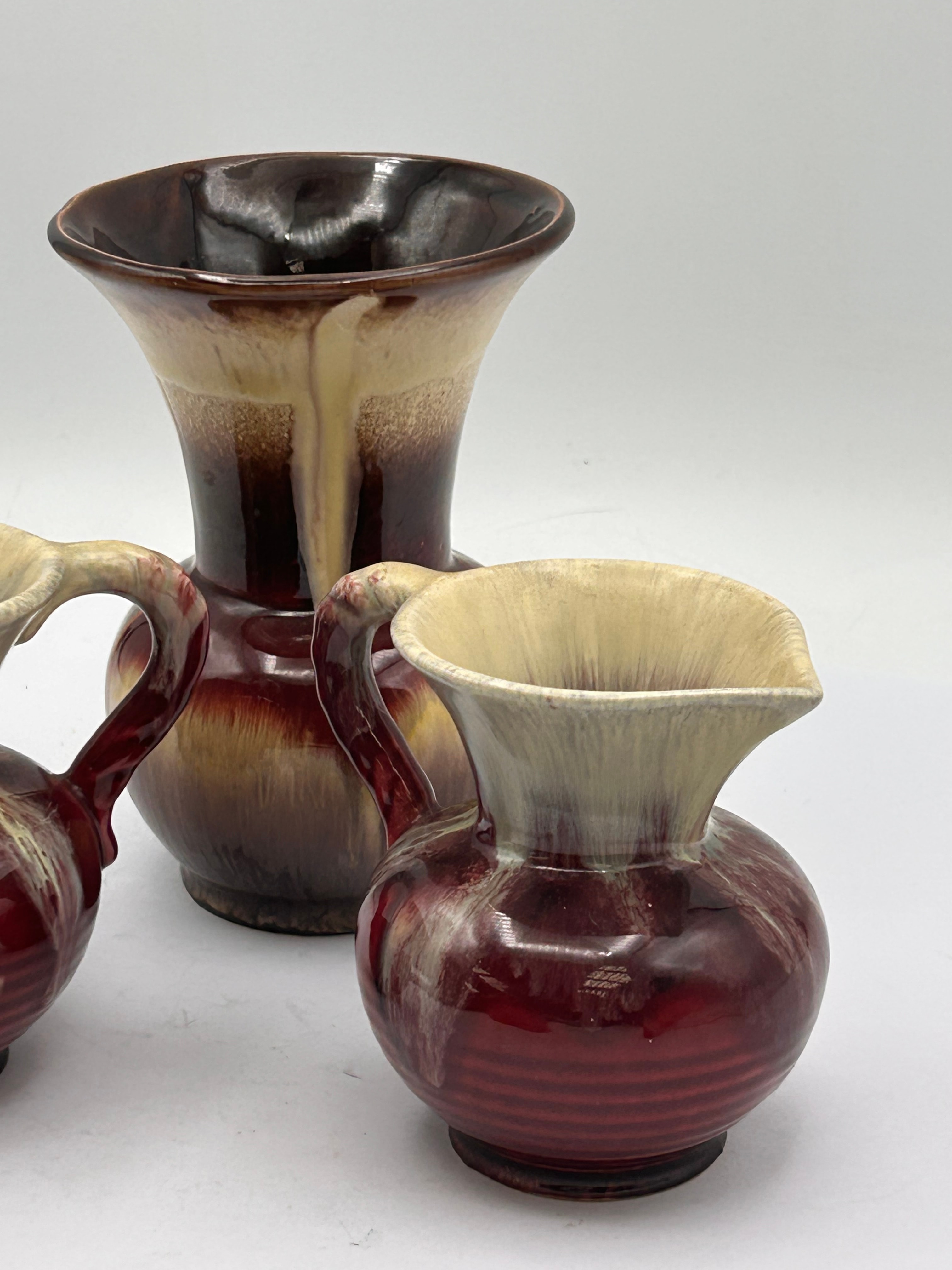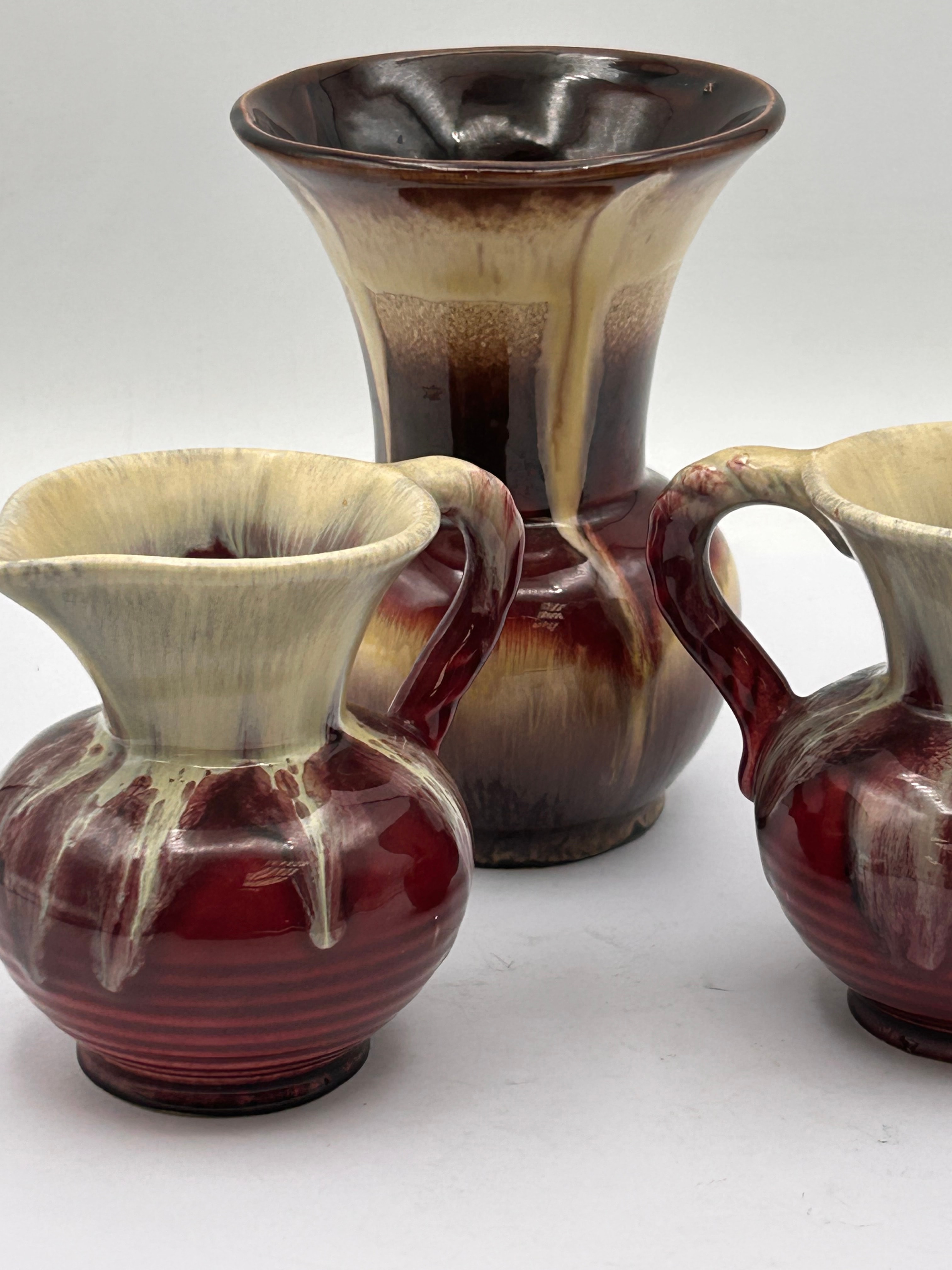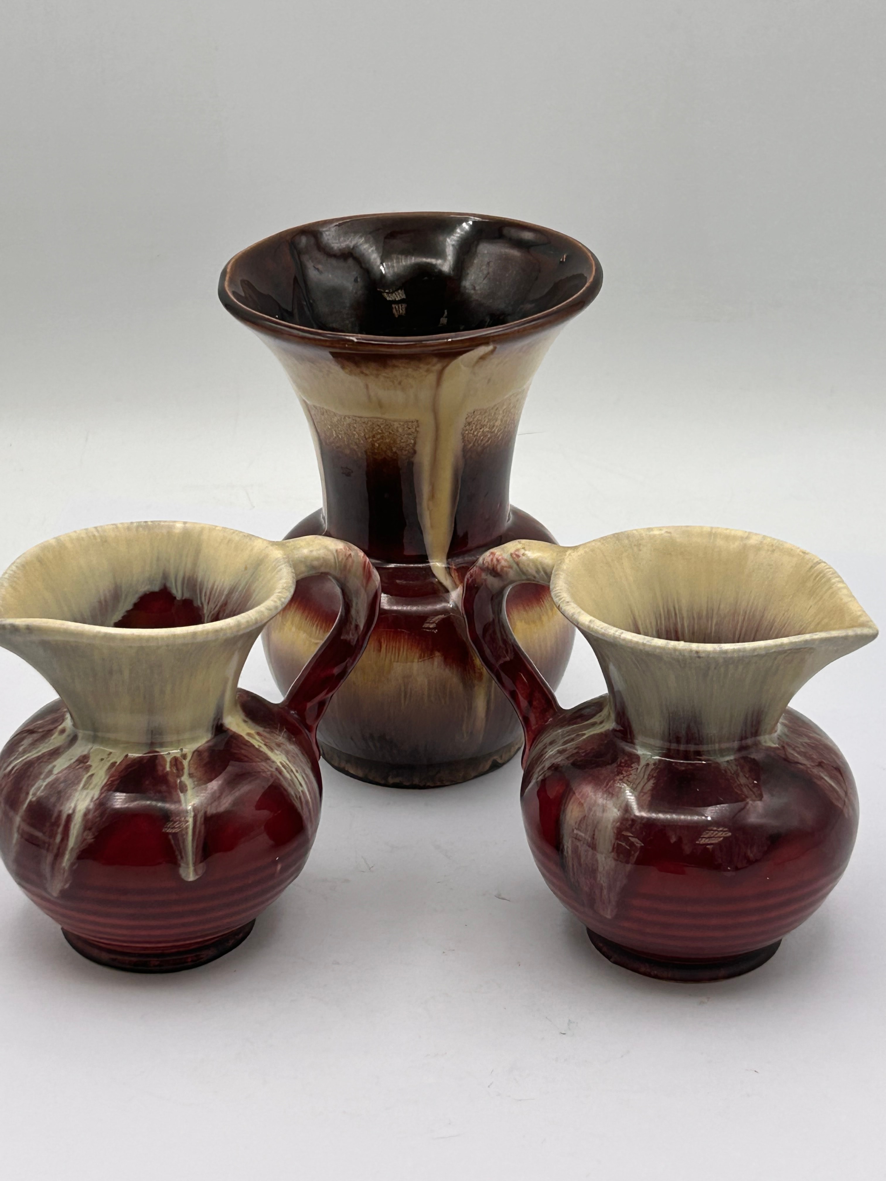 A group of three West German Mid-Century ‘Cranberry Lava’ drip glaze pottery vessels, comprising one larger vase and two smaller, handled jugs. All pieces are crafted from earthenware and feature a distinctive drip glaze. The larger vase presents a wide, flaring rim with a dark brown interior, transitioning to a cream-colored drip glaze over a rich brown body that lightens towards the base. The two smaller jugs share a similar design, with a cream drip glaze applied over a deep reddish-brown, ribbed body, each fitted with a matching handle and a small spout. No visible text or markings are apparent.