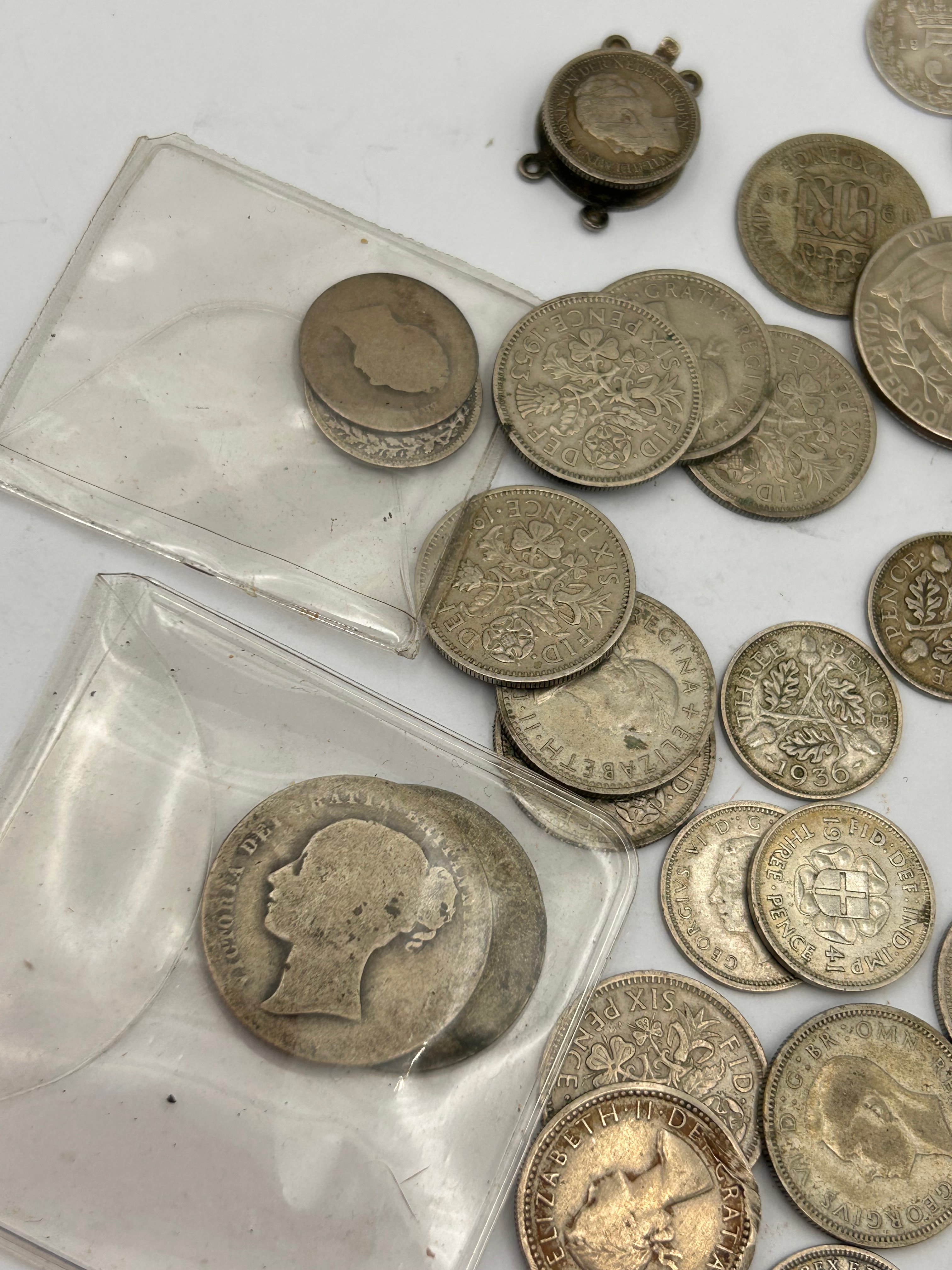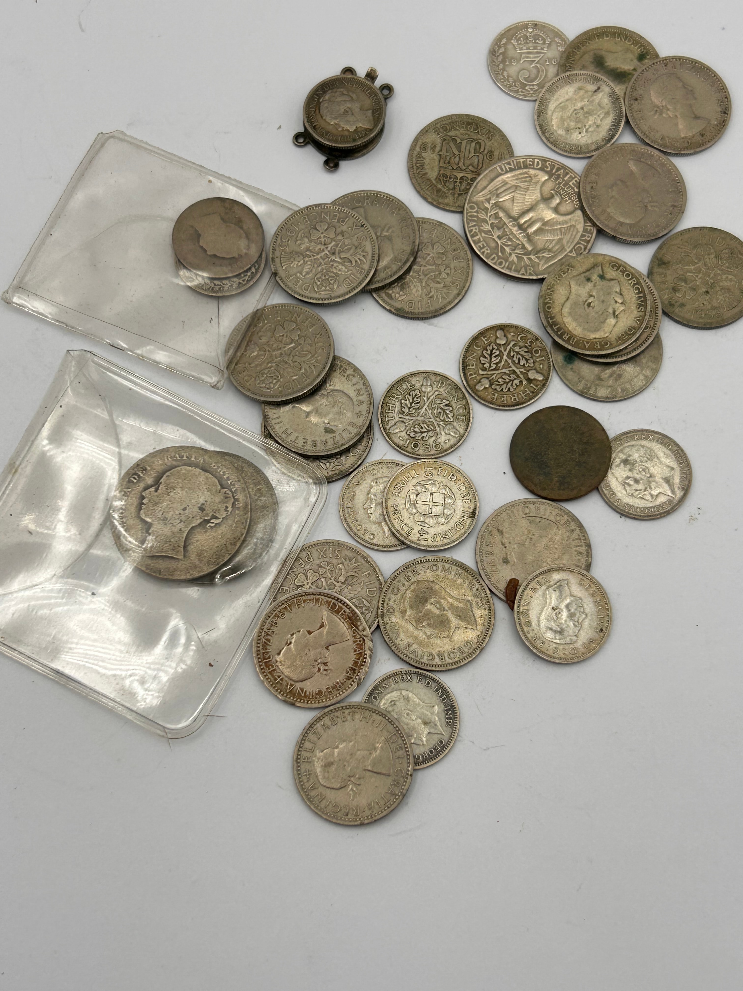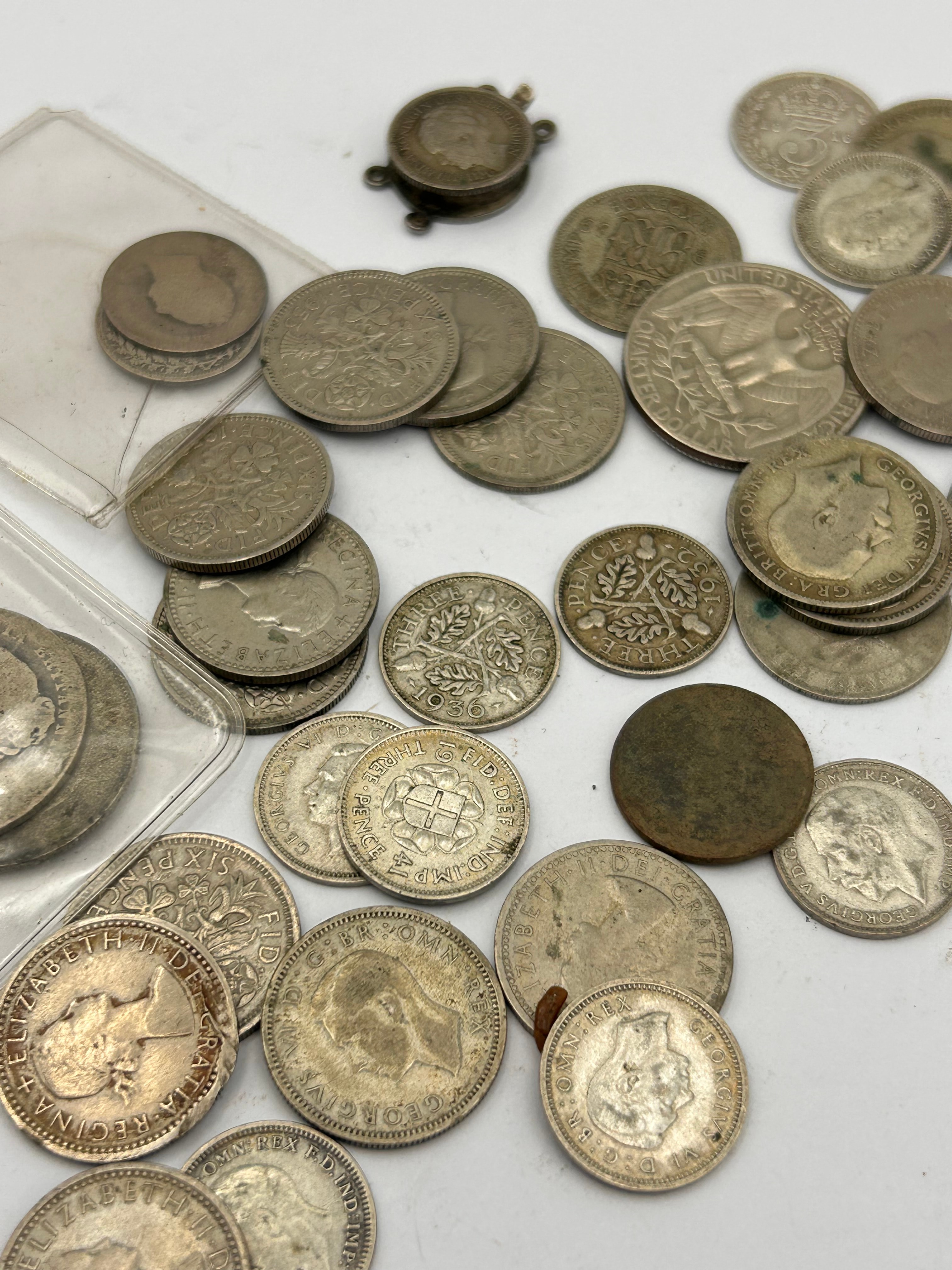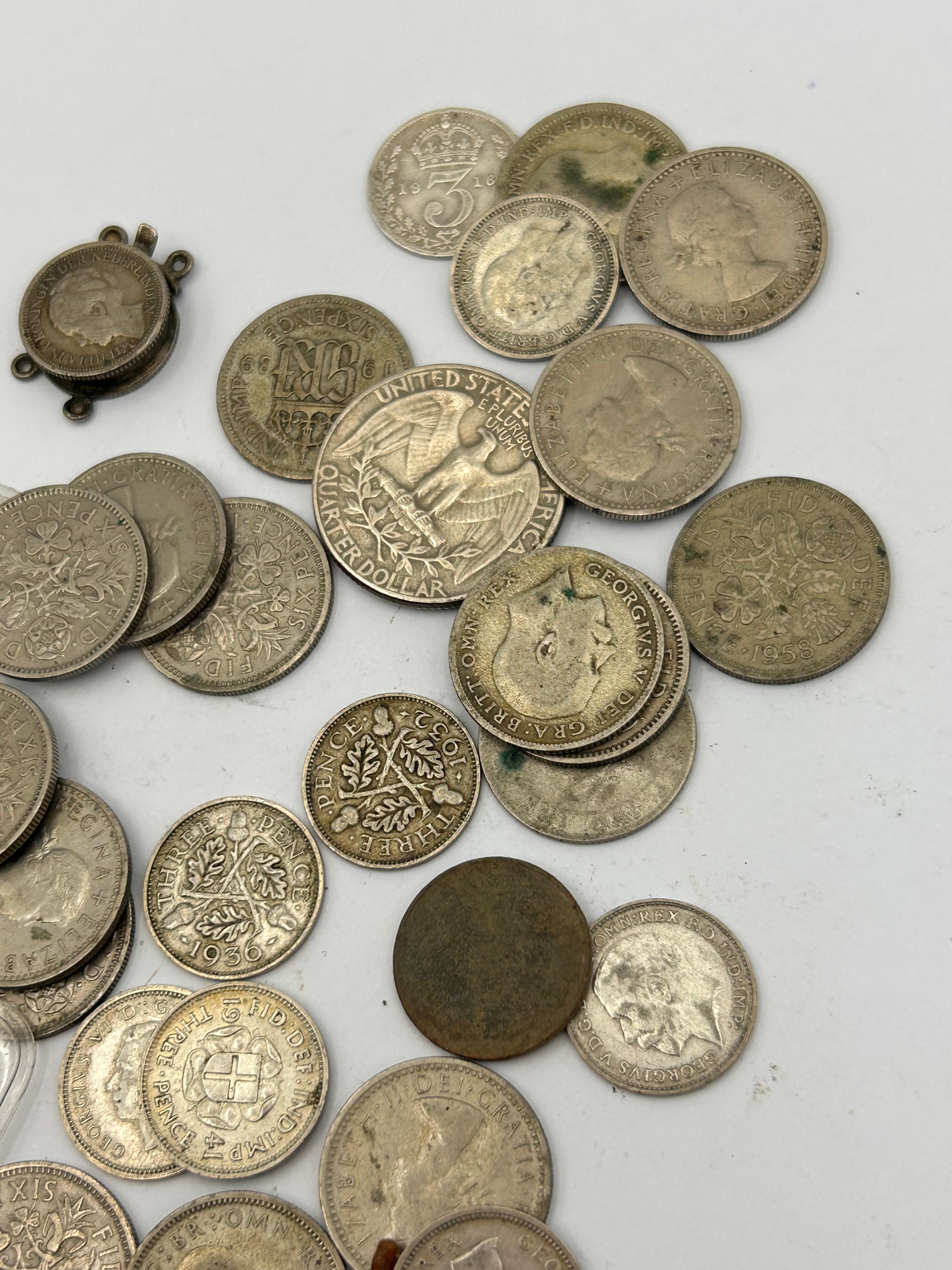 This collection comprises numerous coins, predominantly British, alongside one United States Standing Liberty Quarter Dollar and a small, hinged, coin-like metal locket. The British coins represent different periods, featuring portraits and inscriptions for monarchs such as Victoria (“VICTORIA DEI GRATIA”), George VI (“GEORGIVS VI D: G: BRITT: OMN: REX F: D: IND: IMP.”), and Elizabeth II (“ELIZABETH II DEI GRATIA REGINA F: D:”), with visible dates spanning from the late 19th to mid-20th century, including examples from 1936, 1953, and 1954. Denominations include Three Pence, Six Pence, Florin, and Shilling. Many of the British coins are likely pre-1947 50% silver issues, and the United States Quarter Dollar is a 90% silver Standing Liberty type. Most coins are silver-toned metal, likely silver or cupro-nickel, with one noticeable dark brown/bronze coin also present.