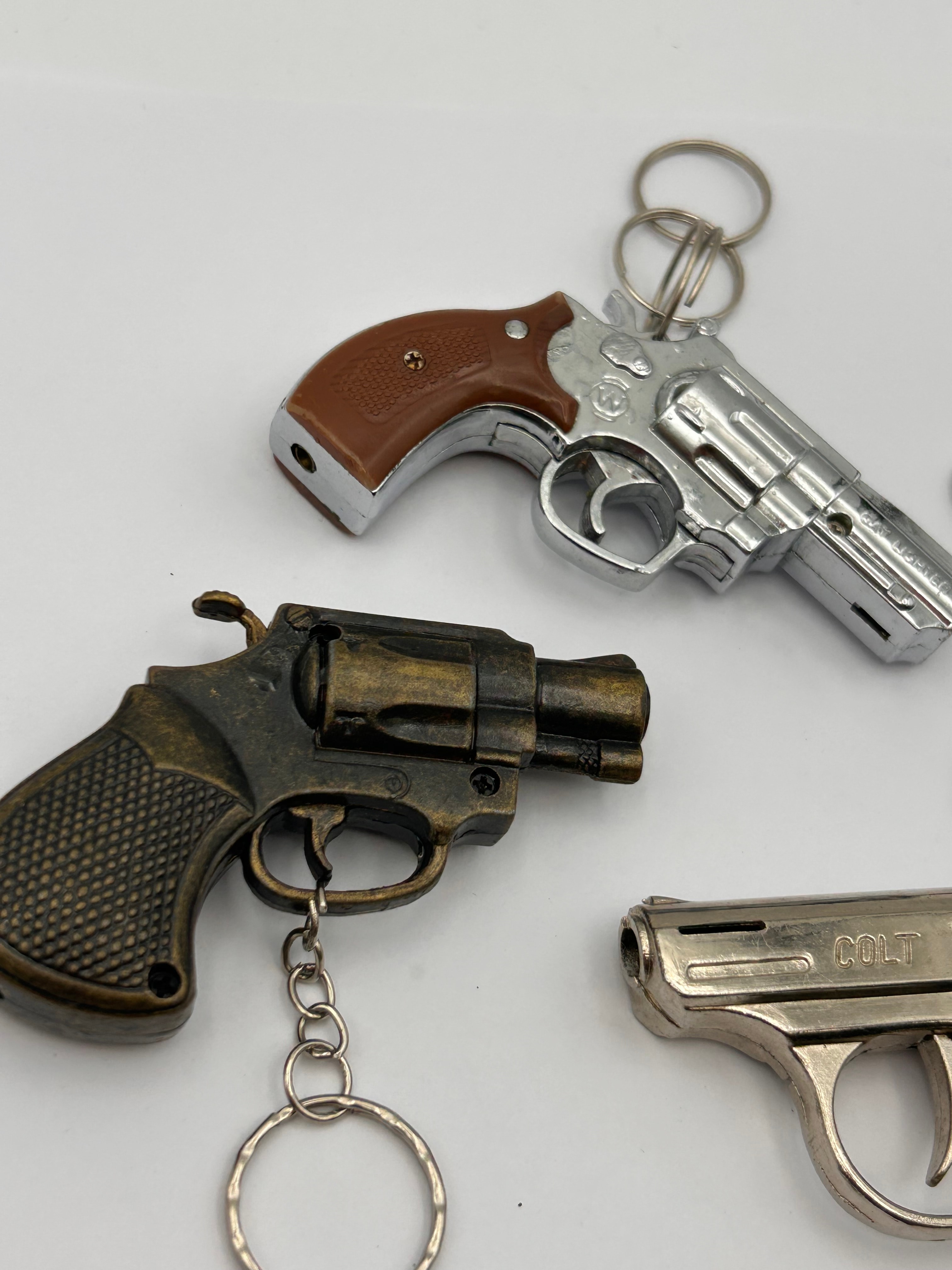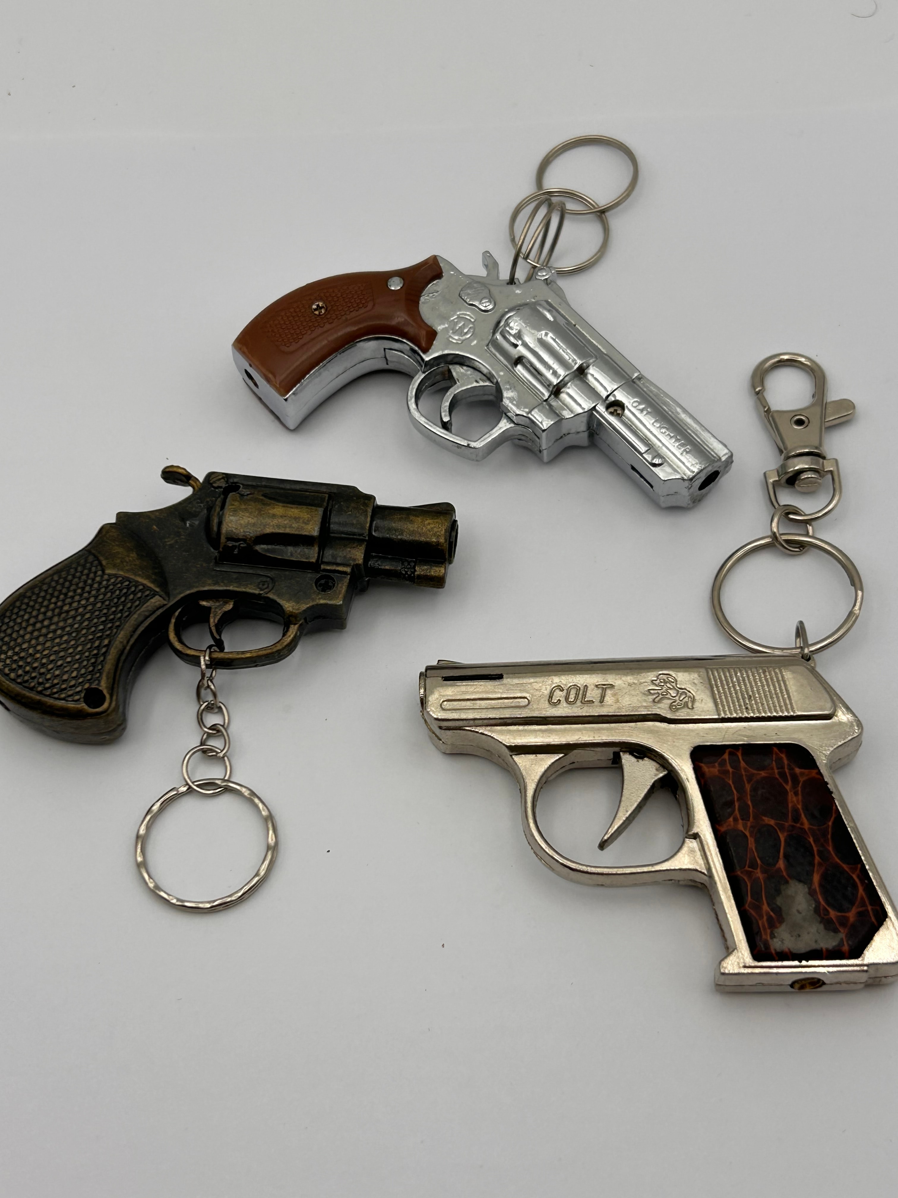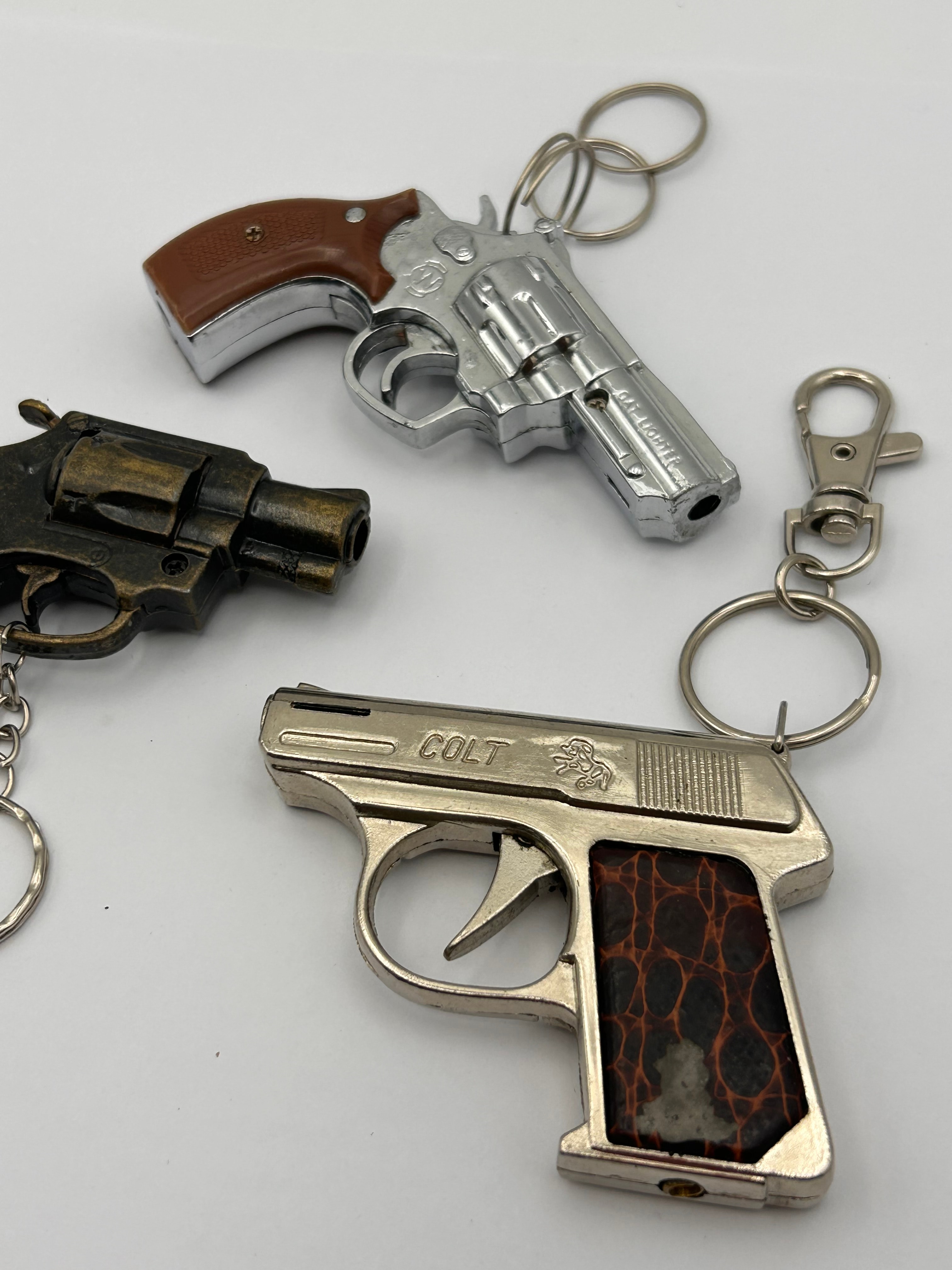 A group of three metal firearm-shaped novelty keychains, likely also functioning as lighters, constructed from base metals with various finishes and plastic components. The top item is a silver-toned revolver with a brown plastic grip, attached to a split ring. To its left is an antiqued bronze-toned revolver with a textured grip, also secured to a split ring. The bottom-right item is a silver-toned semi-automatic pistol keychain featuring a “COLT” marking and an emblem on the slide, with dark grip panels displaying an orange and red marbled or cracked pattern, attached via a spring-loaded clasp and split ring.