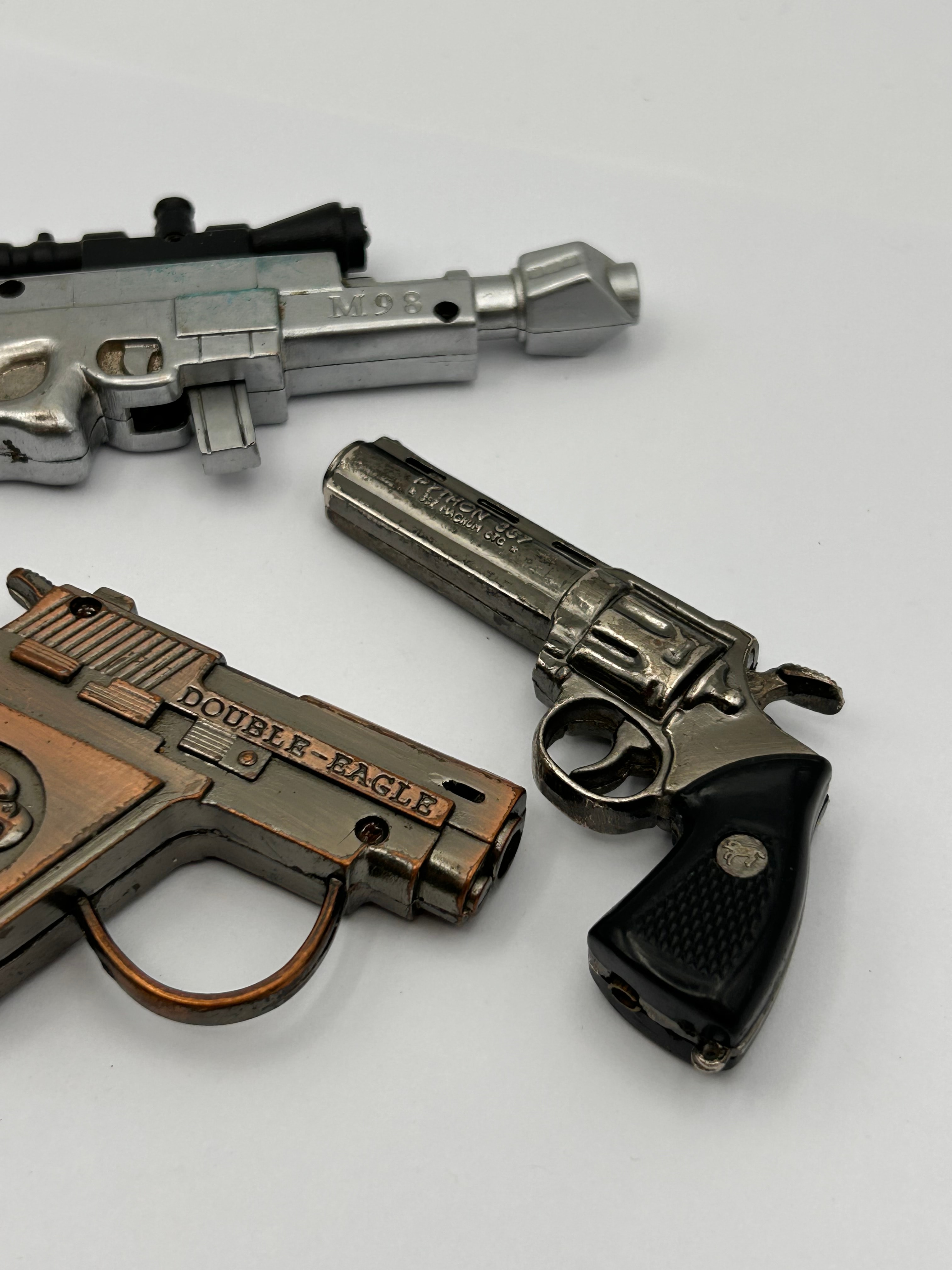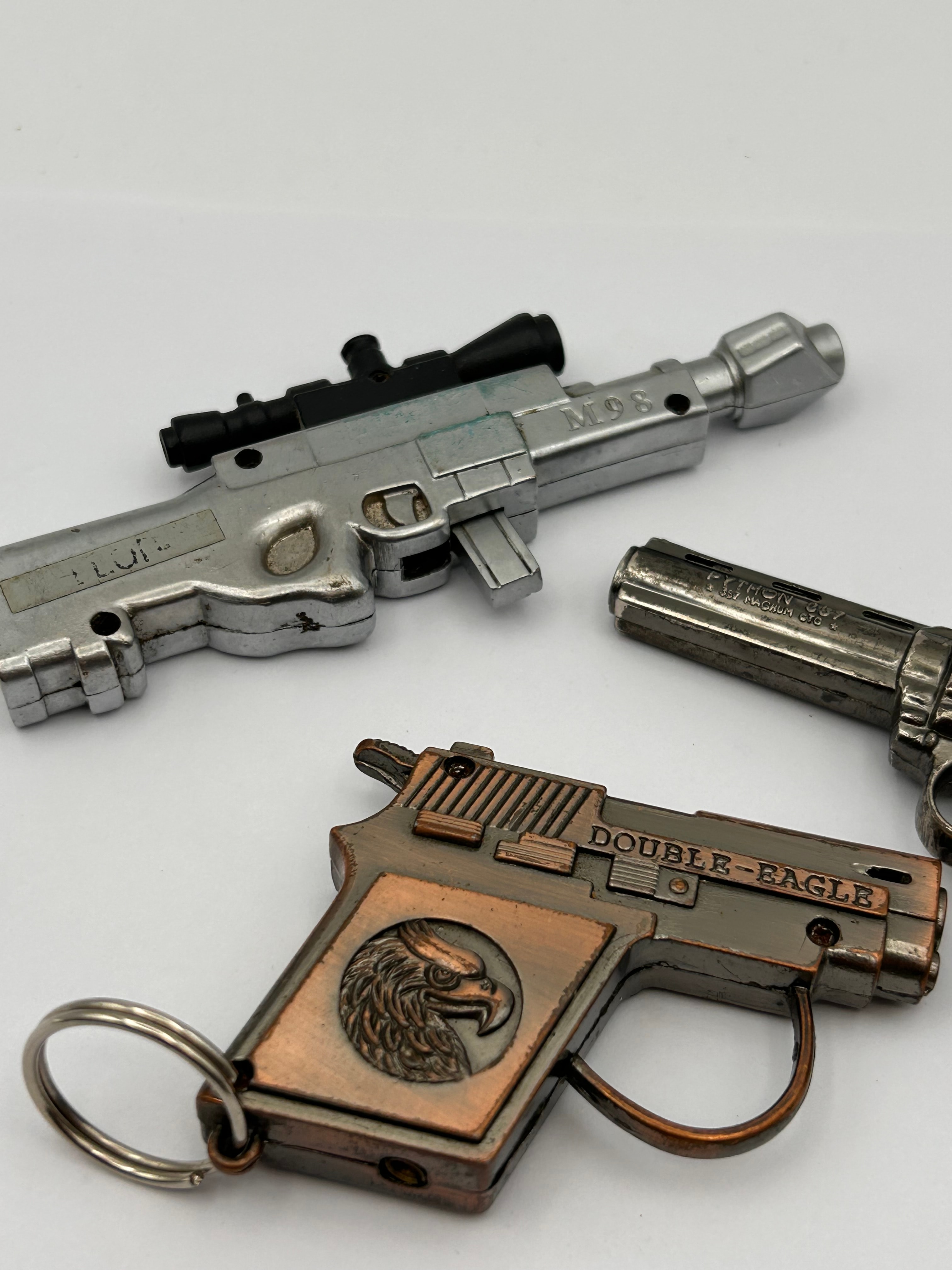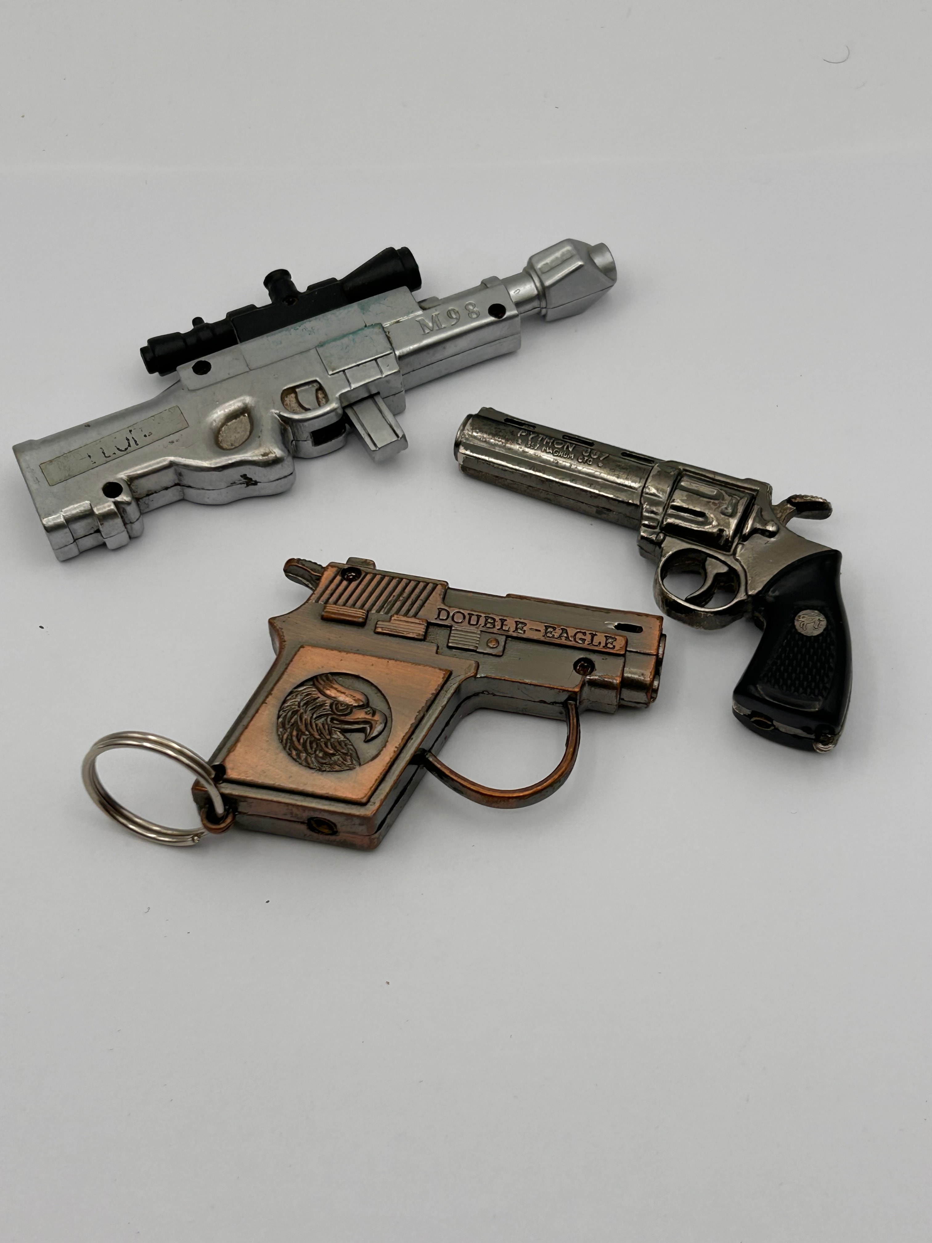 A lot comprising three miniature novelty items resembling firearms, constructed primarily from cast metal (zinc alloy or pot metal) with black plastic accents, likely functioning as keychains or lighters. The first item is a silver-toned, futuristic rifle-style piece marked “M98” and “L.O.I.” (or “L.C.I.”). The second item is a bronze and dark grey-toned semi-automatic pistol, featuring an embossed eagle head on the grip and “DOUBLE-EAGLE” on the slide, with an attached keyring. The third item is a silver-toned classic revolver replica, marked “SUPER .38,” “MADE IN JAPAN,” and “R27” (or “R77”), suggesting a mid-to-late 20th-century origin.