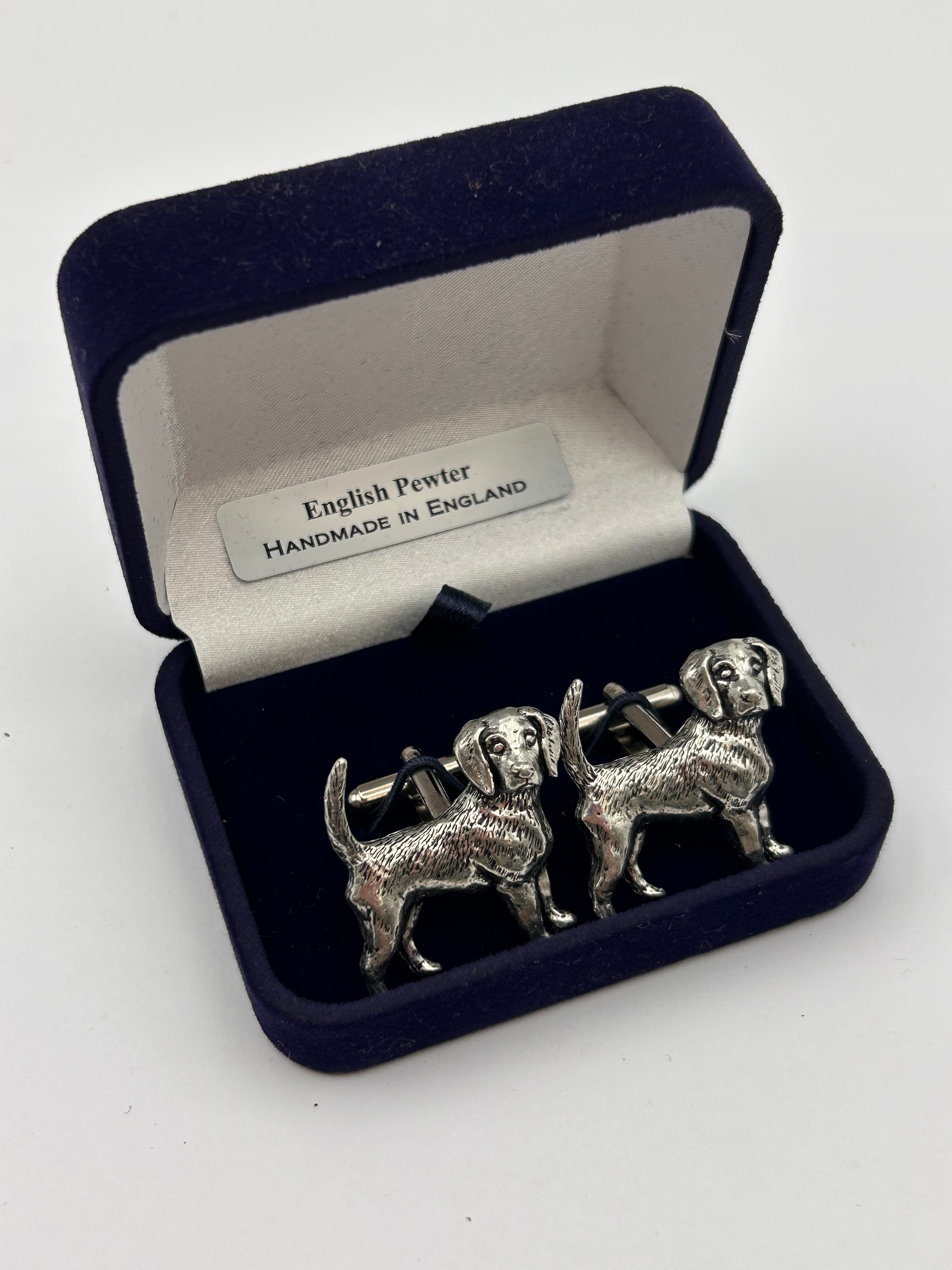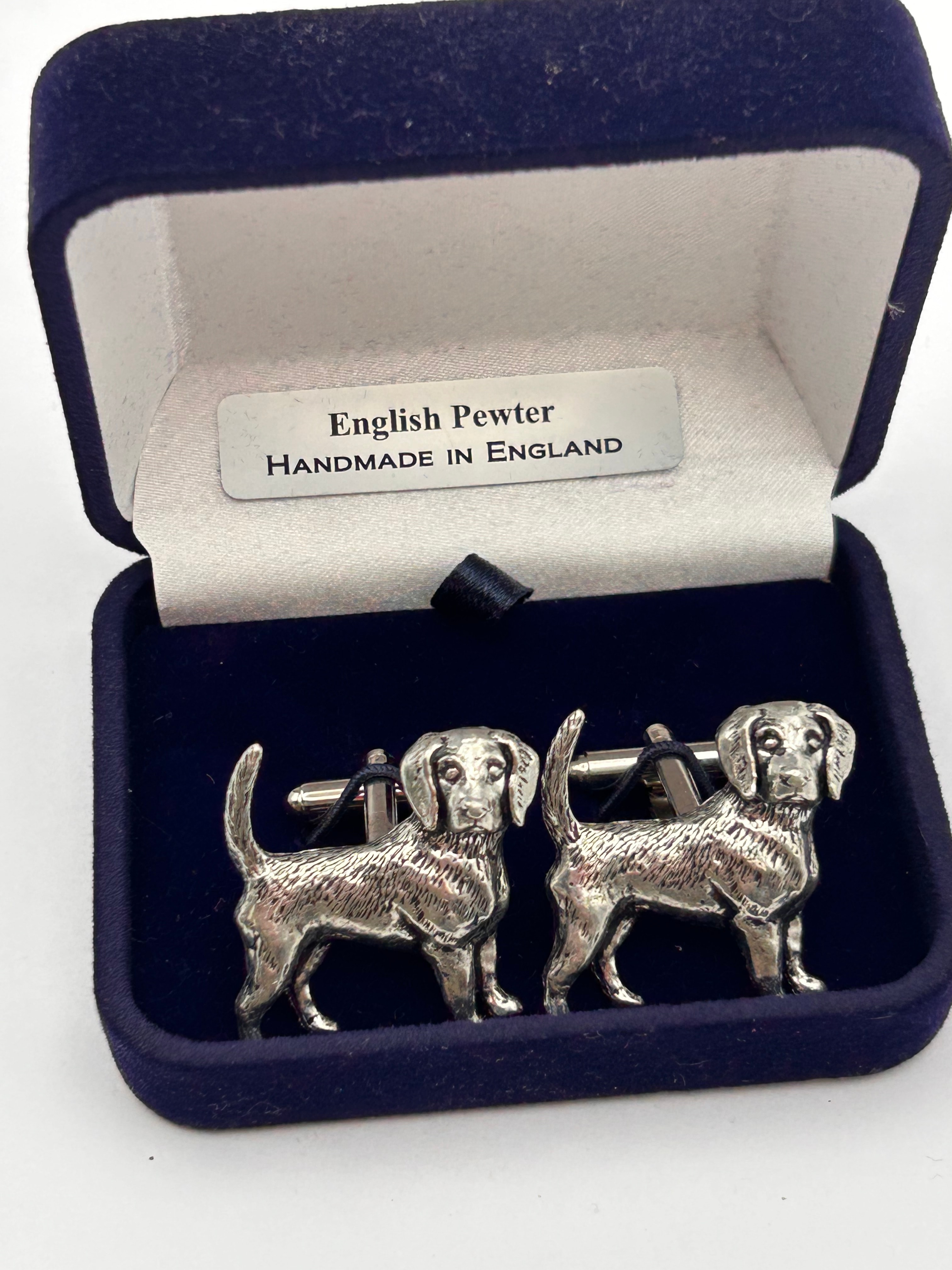 A pair of English Pewter cufflinks, each depicting a detailed, three-dimensional standing beagle dog. Crafted from English Pewter, as indicated by a label, the cufflinks feature a naturalistic style. They are presented in a dark blue, hinged, velvet-covered presentation box with a satin-lined interior. The label inside the box reads “English Pewter” and “HANDMADE IN ENGLAND.”