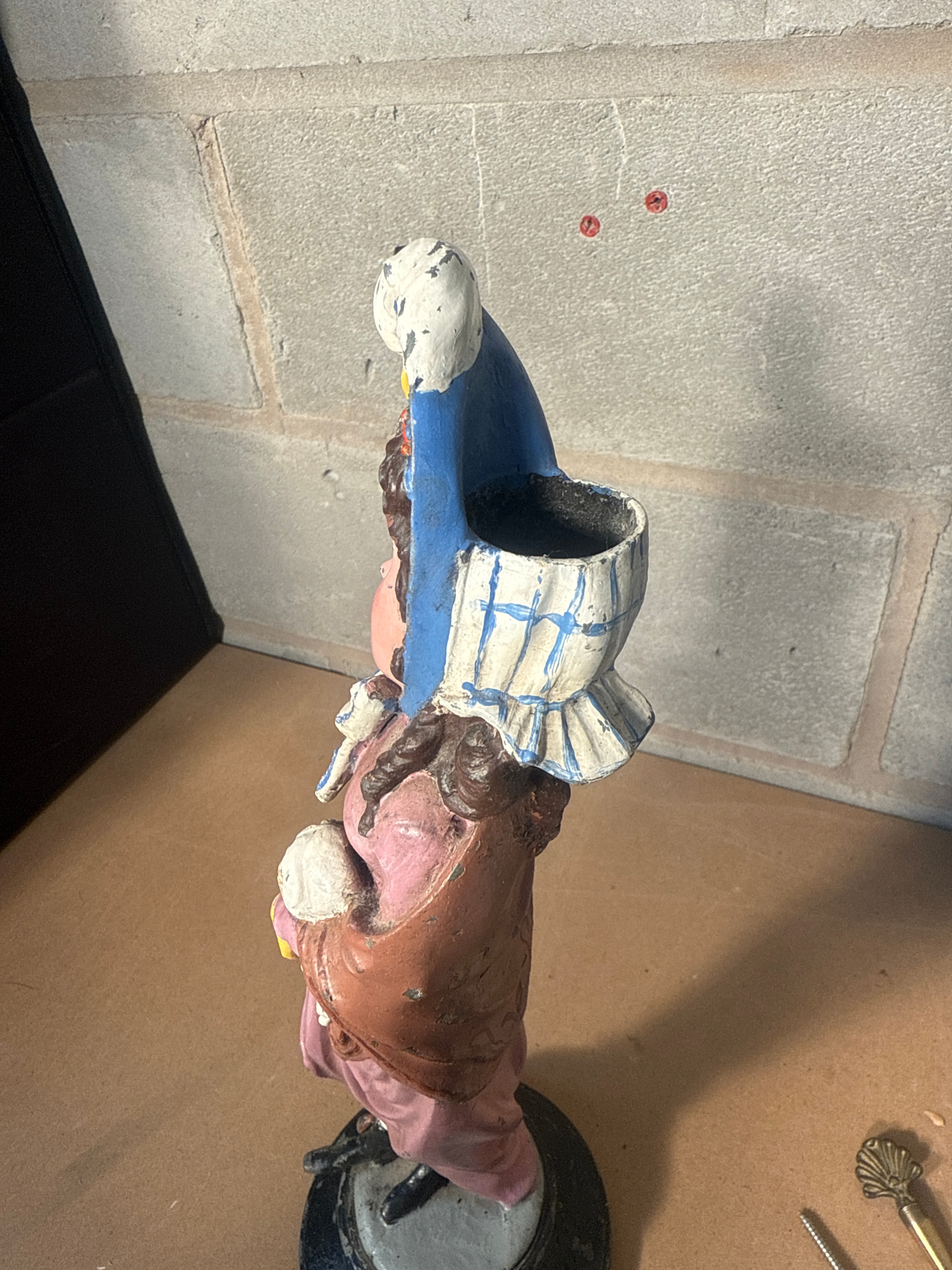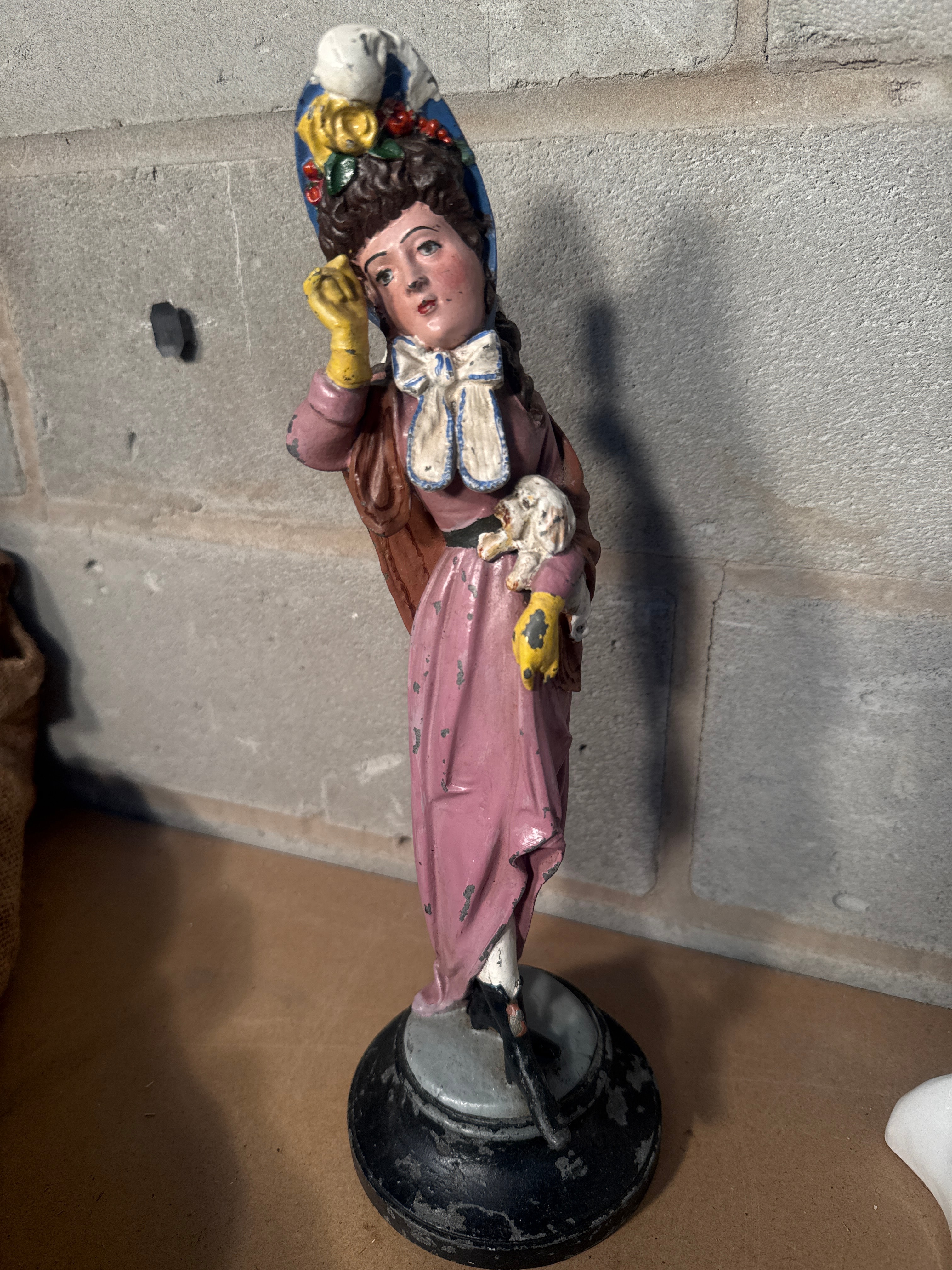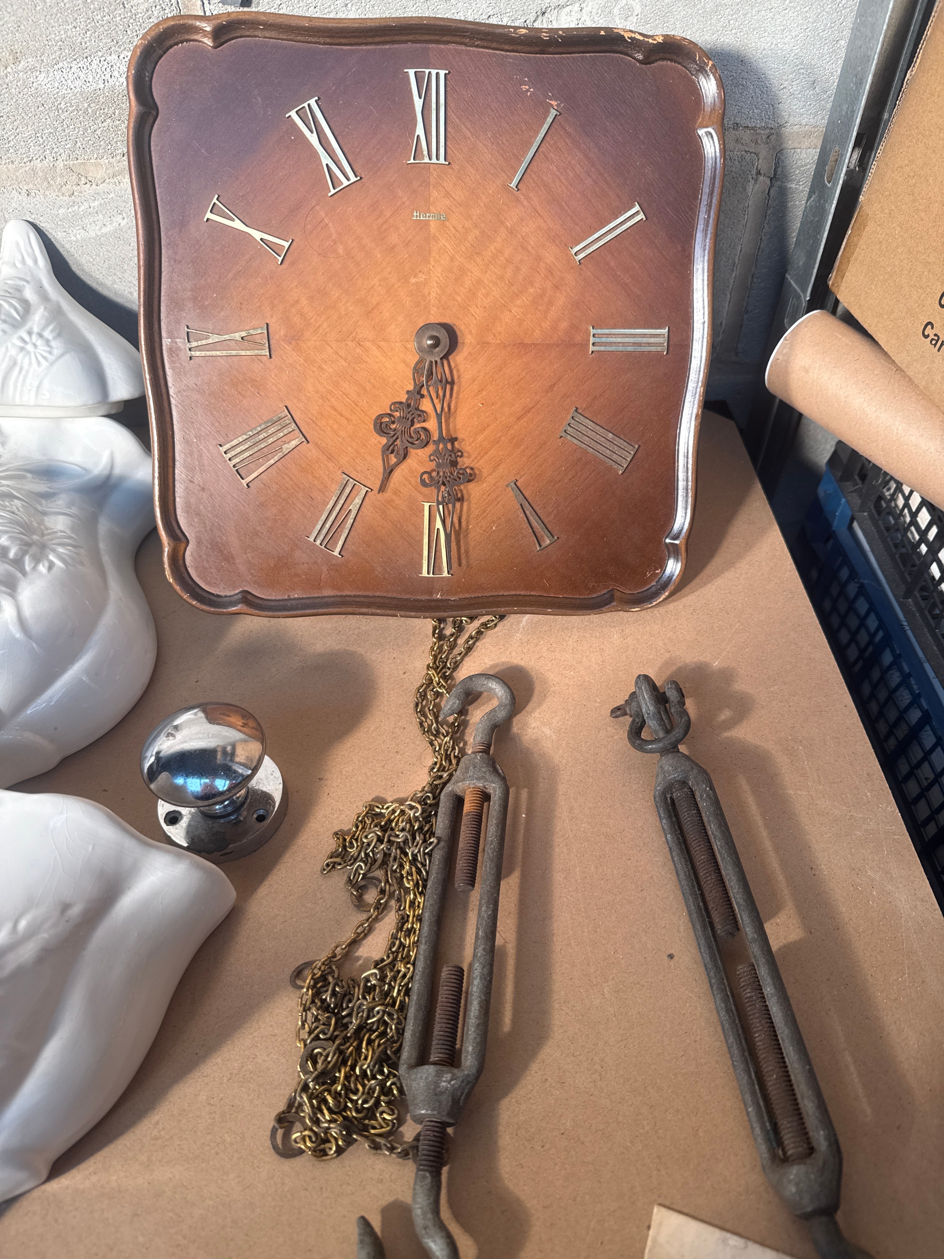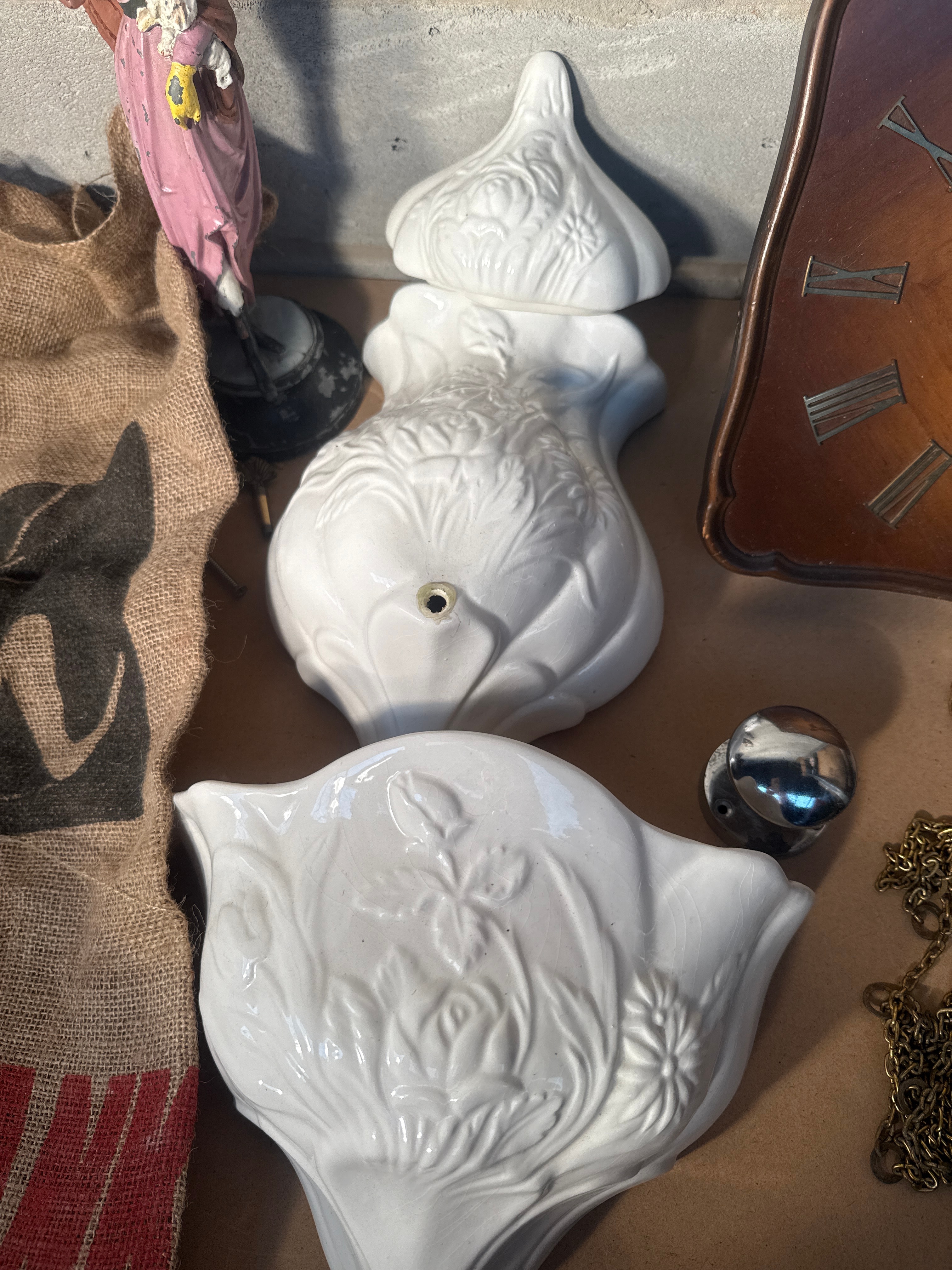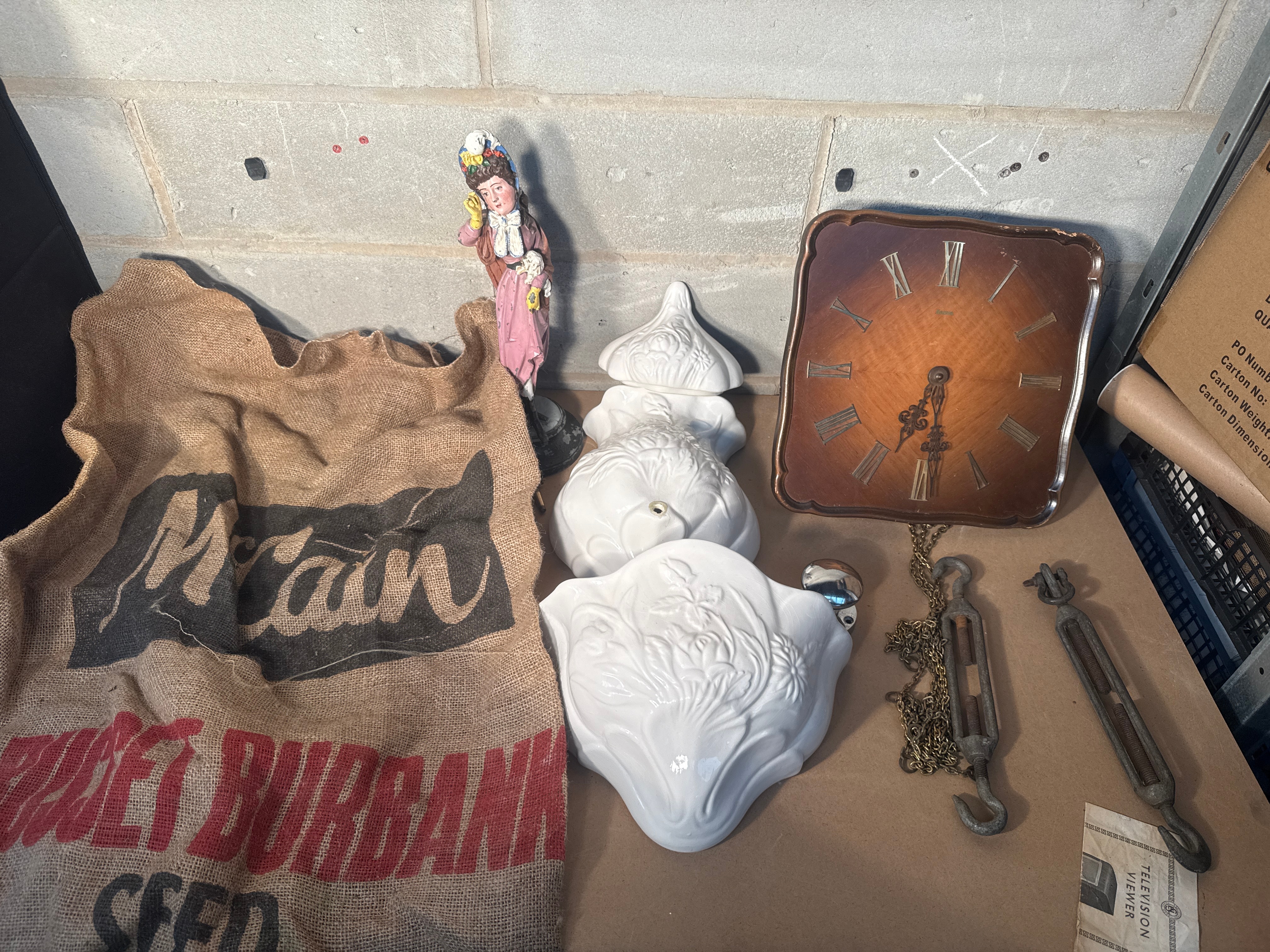 This lot comprises a diverse collection of vintage and antique items. It features a large burlap sack printed with “McCain RUSSET BURBANK SEED POTATOES.” Also included is a painted cast iron figurine of a woman in historical dress, likely intended as a doorstop or planter. The collection further includes three white glazed ceramic decorative wall pockets or vases, each adorned with raised floral motifs; one is shaped like a finial, and another has a central mounting hole. A square ‘Heirloom’ brand wall clock with a wood-look finish, scalloped edges, and Roman numerals is present. Completing the lot are two rustic metal industrial turnbuckles with hooks, a length of metal chain, and a single chrome-plated dome-shaped knob.