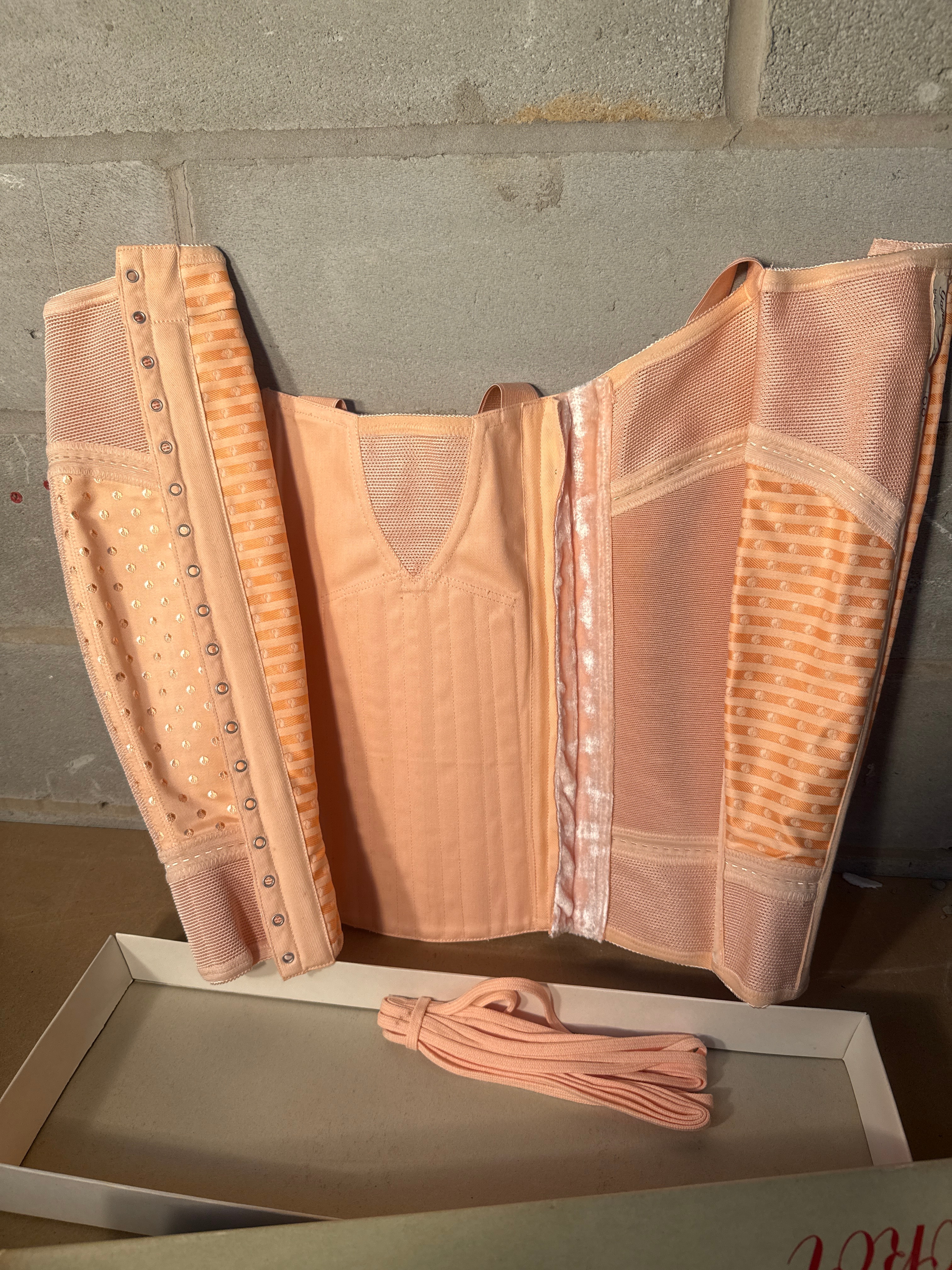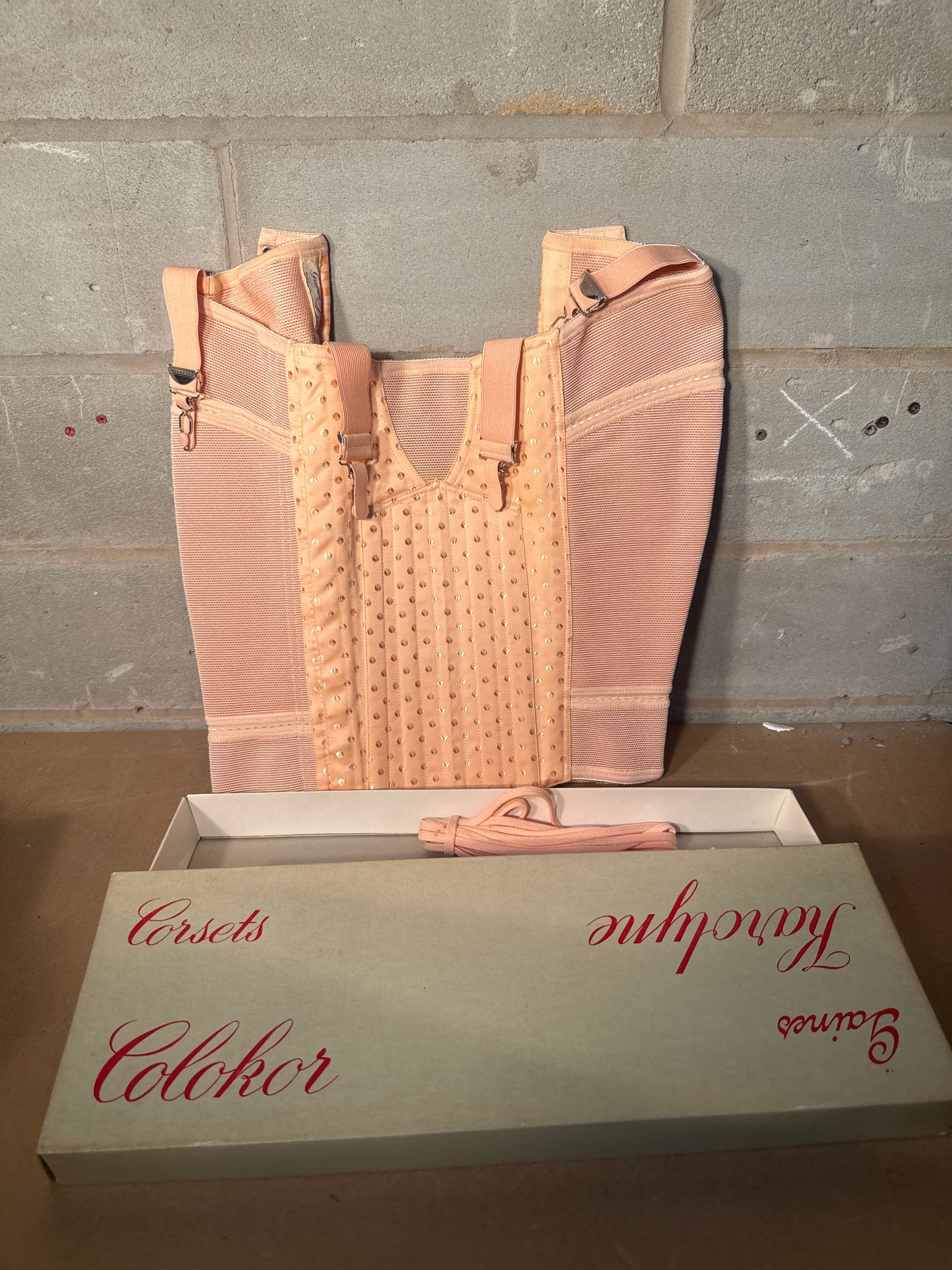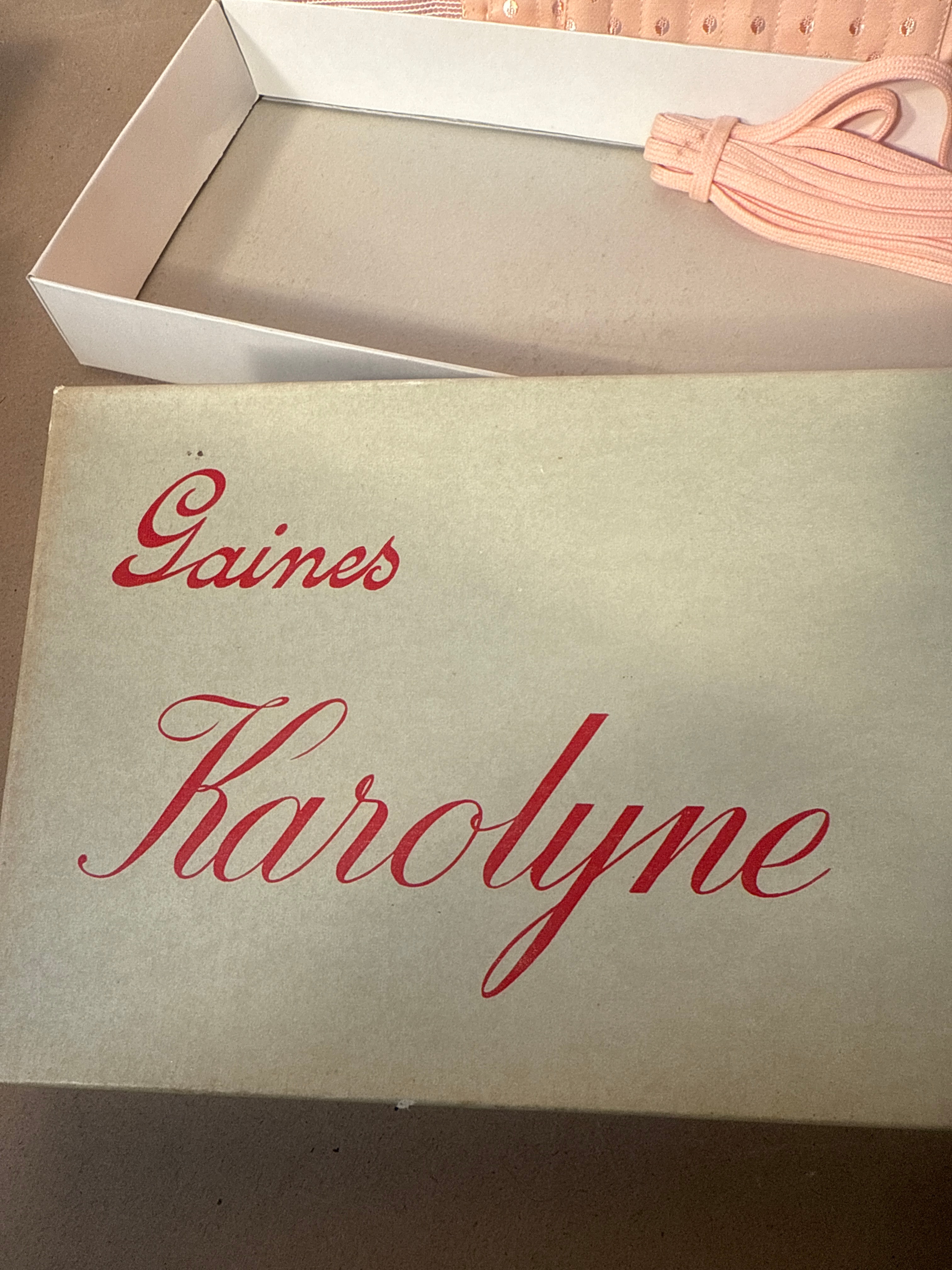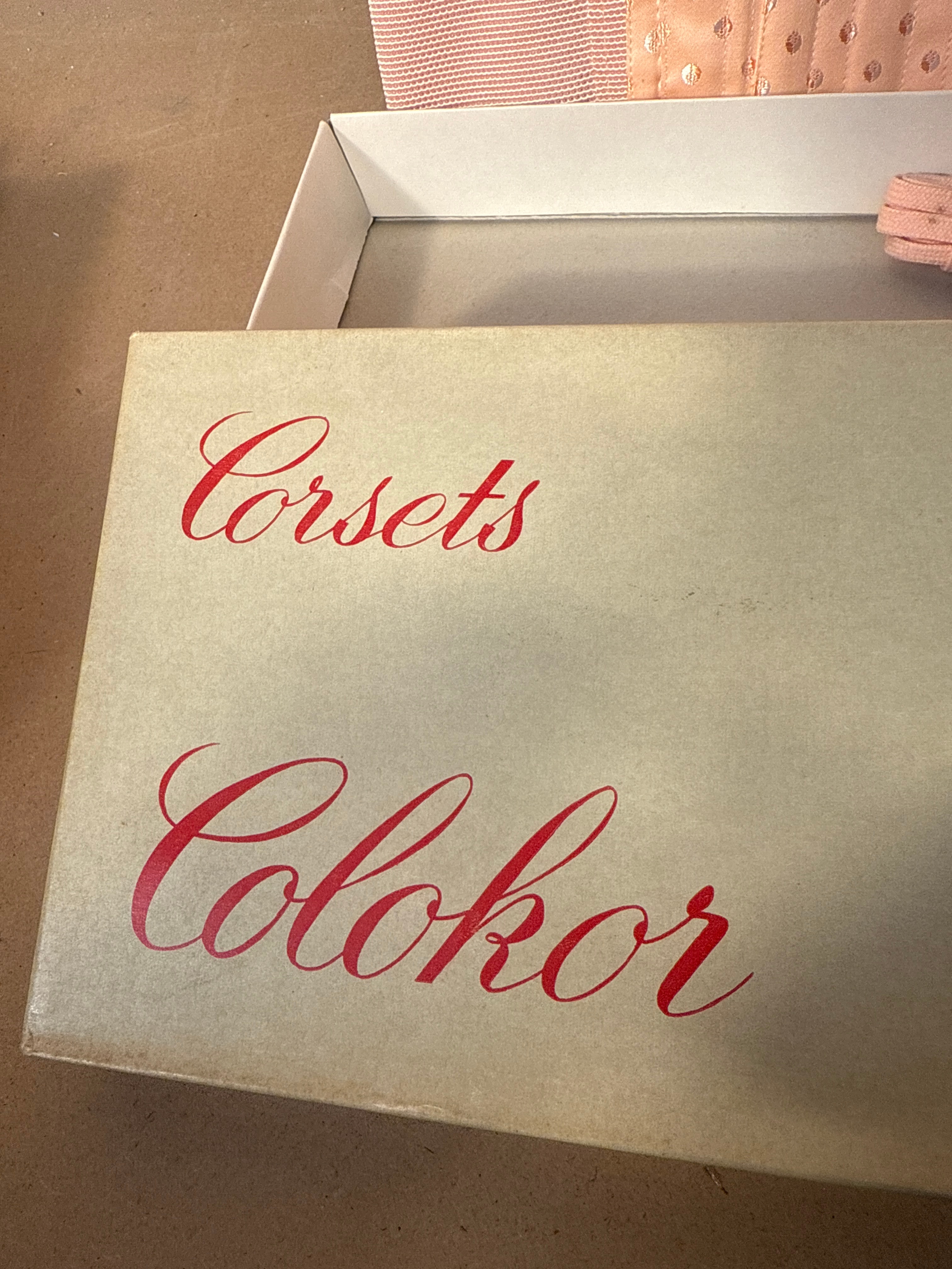 A vintage-style peachy-pink foundationwear garment by Gaines Karolyne and Colokor, presented new in its original box. This longline corset or girdle is constructed from a synthetic fabric blend, featuring mesh inserts and panels adorned with small, reflective dots or texture. It is designed with a full-length hook-and-eye front closure and includes attached garter clips with adjustable fabric straps. The original light-colored cardboard box is labeled in red script with the brand names “Gaines Karolyne” and “Colokor,” and the product category “Corsets.” A coiled length of matching fabric, likely additional garters or straps, is included within the box.