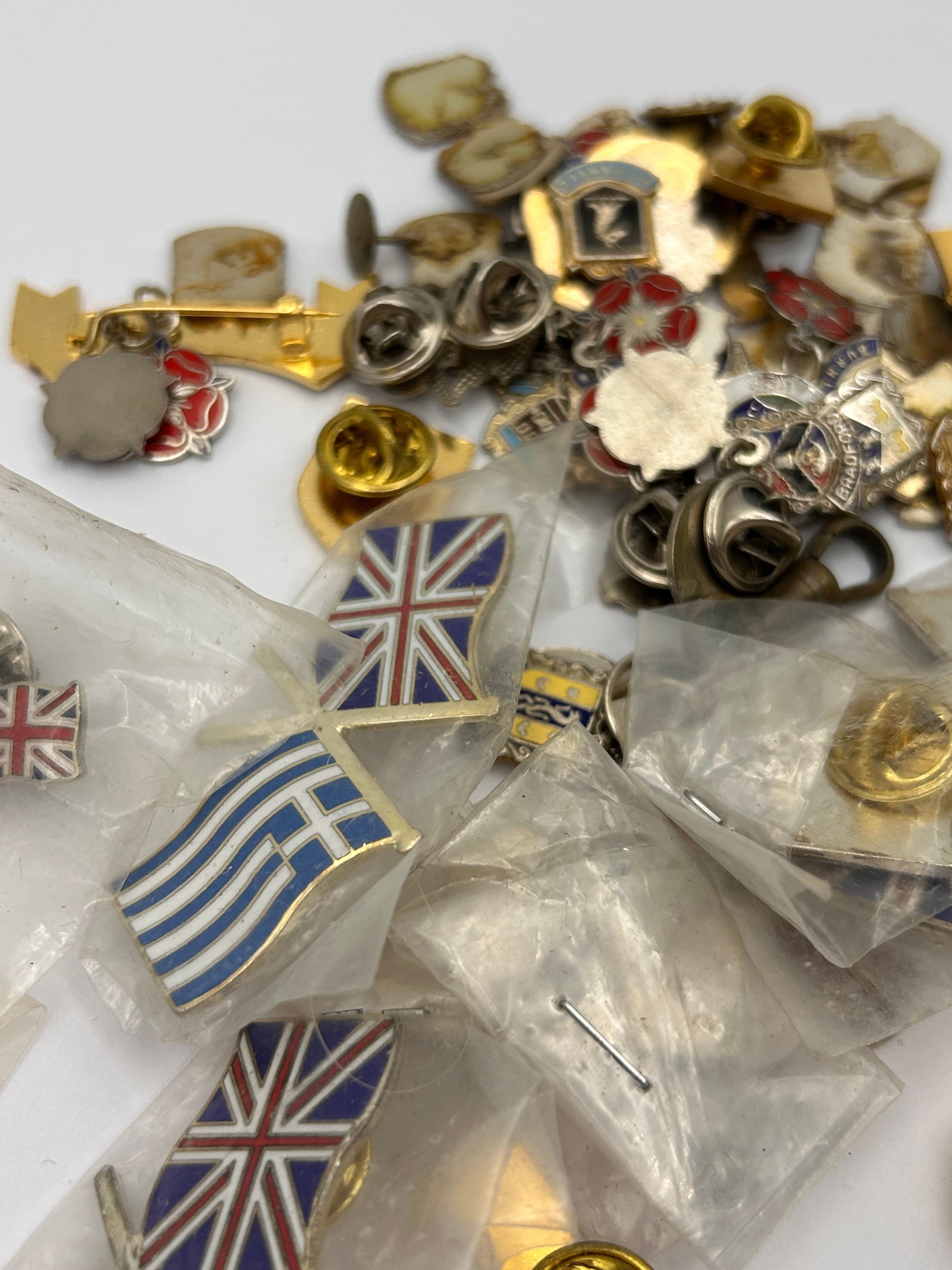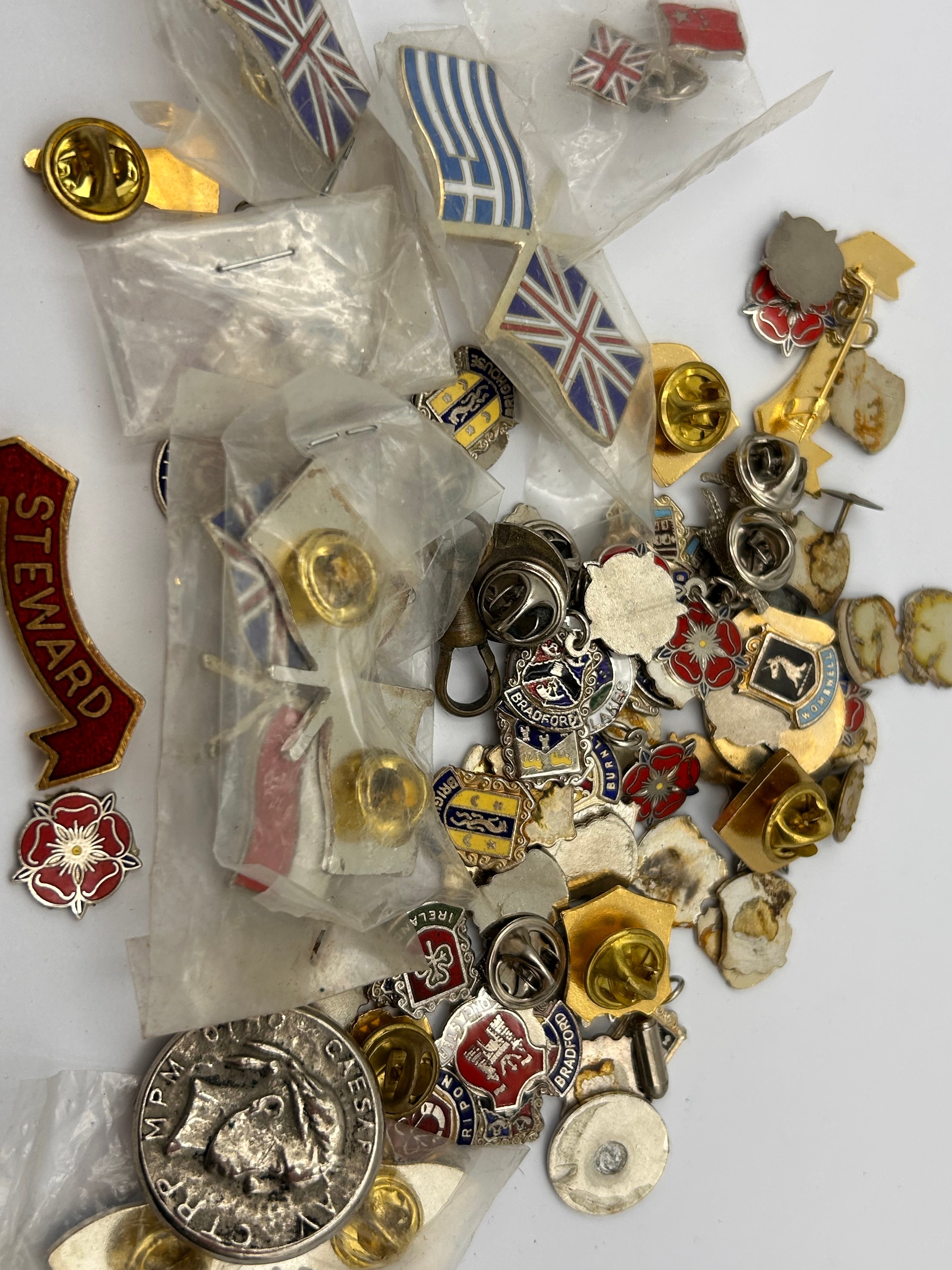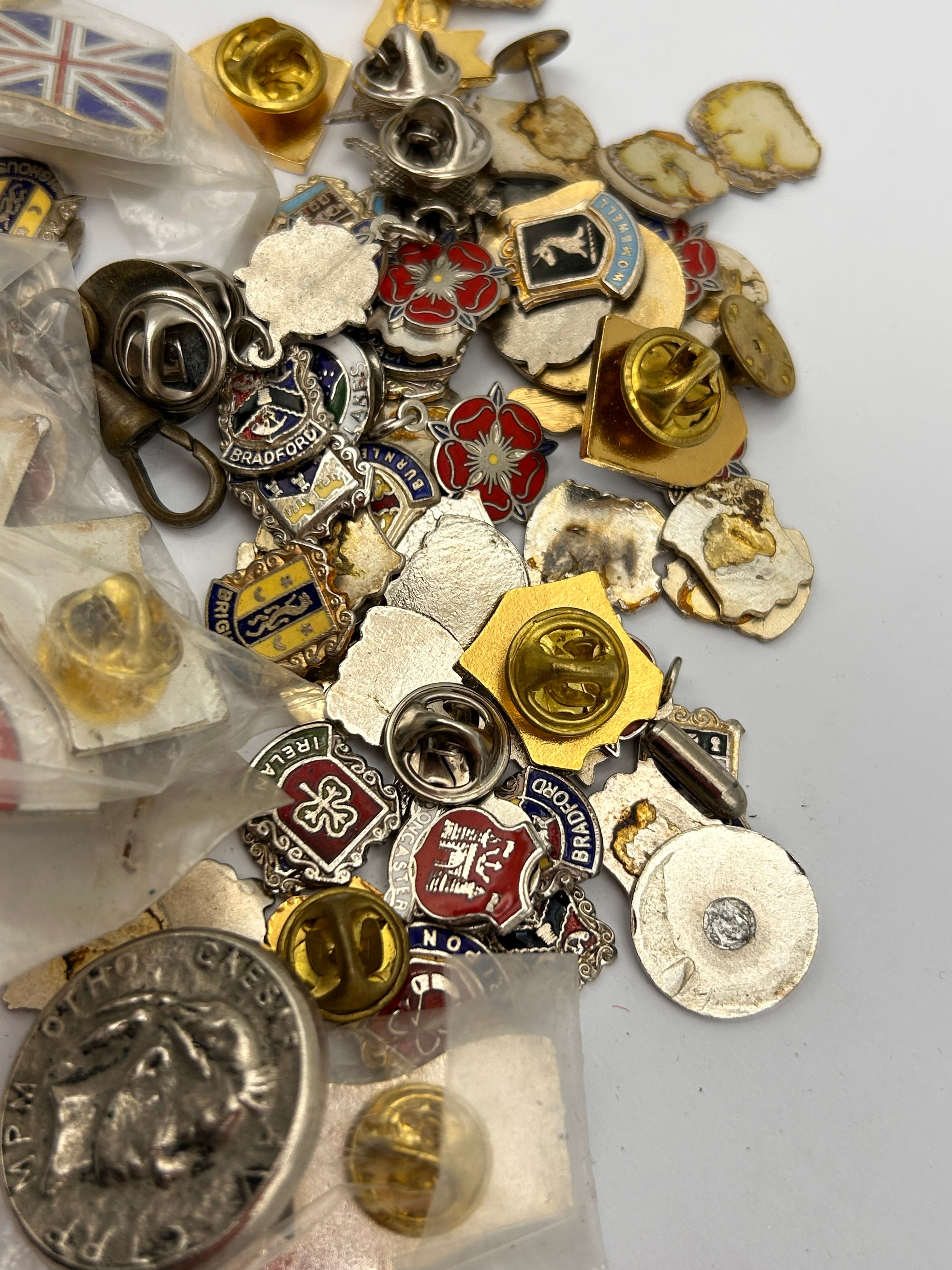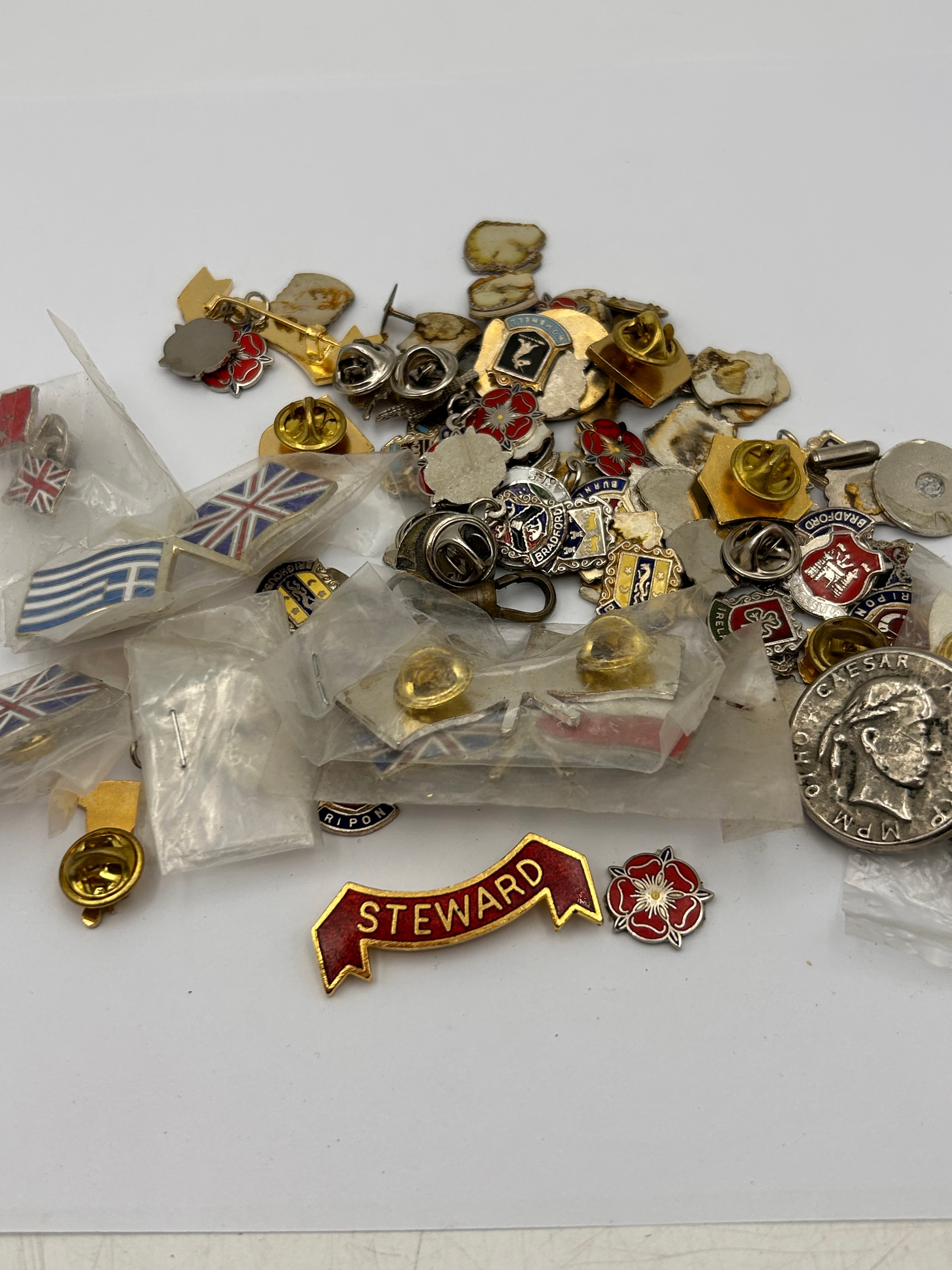 A varied collection of predominantly lapel pins and badges, with one notable large silver-toned medallion, many of which are still sealed in small plastic bags. The styles are diverse, featuring national flags, including the UK Union Jack and the Greek flag, heraldic crests, and text-based designs. Visible inscriptions include “STEWARD” on a red enamel banner, “BRADFORD,” and “IRELAND.” The prominent medallion depicts a profile bust with the text “CAESAR MPM.” The items are crafted primarily from base metals with enamel or painted details, exhibiting gold-tone, silver-tone, and bronze-tone finishes, suggesting a period largely within the 20th to 21st century.