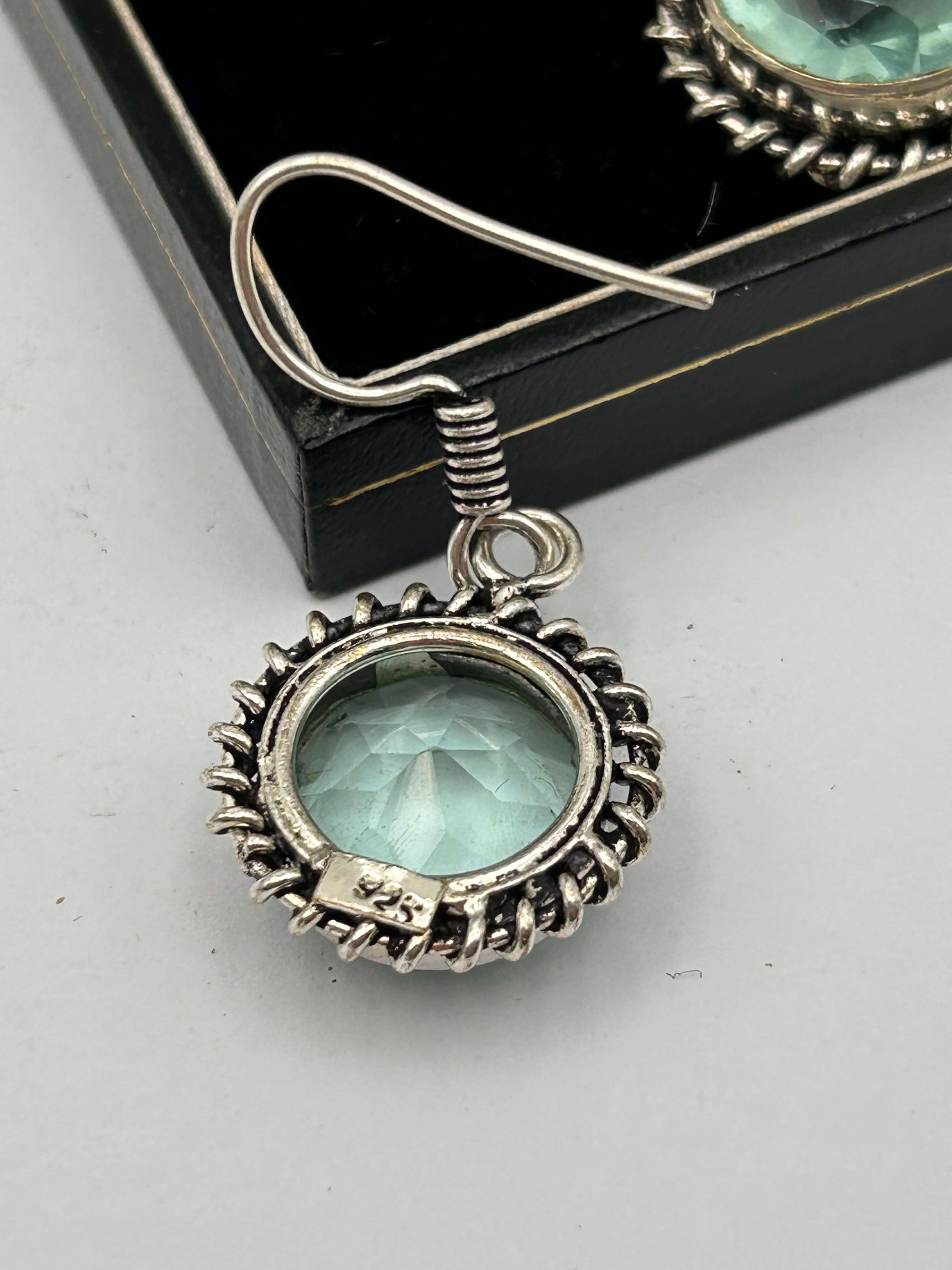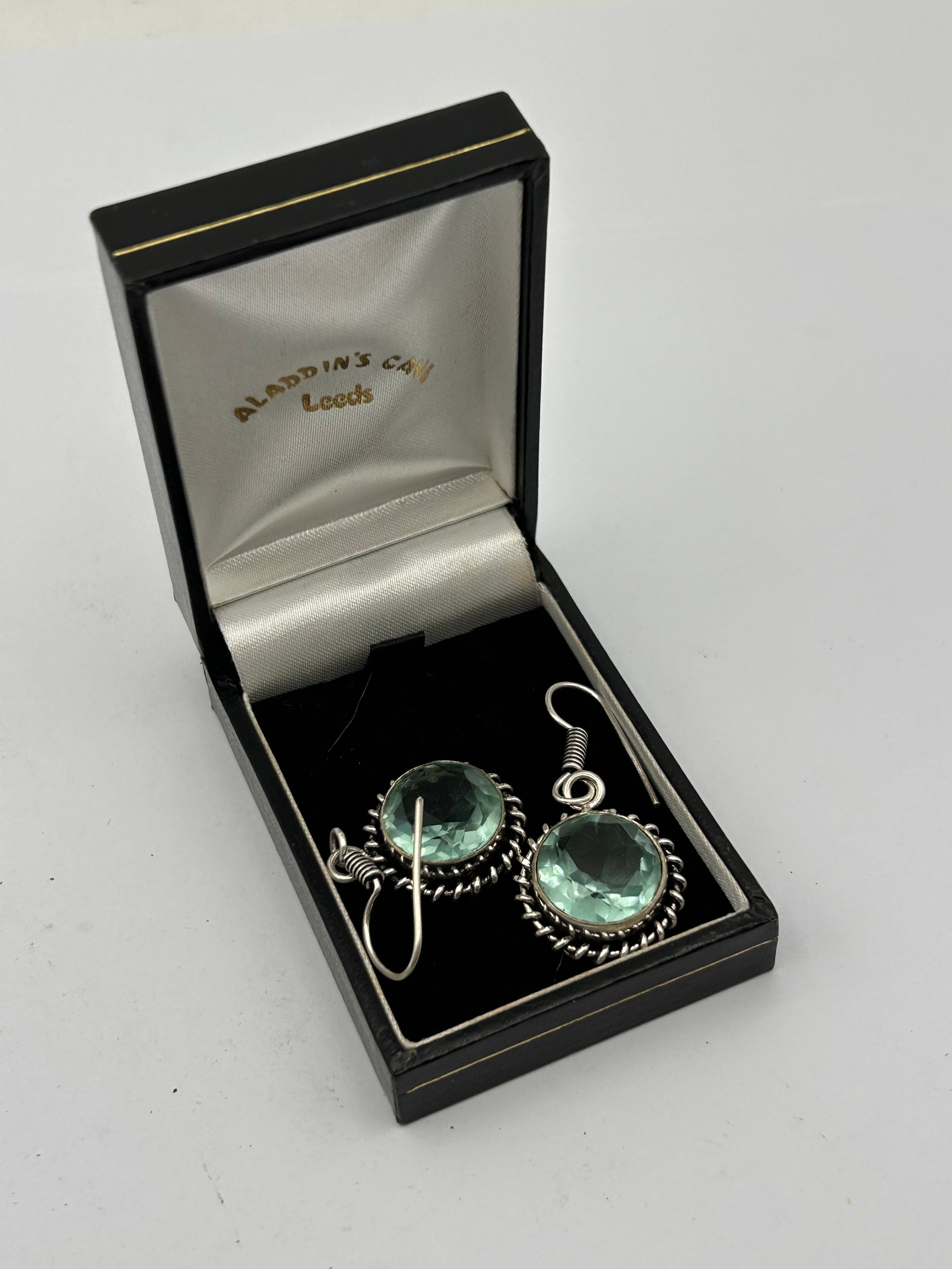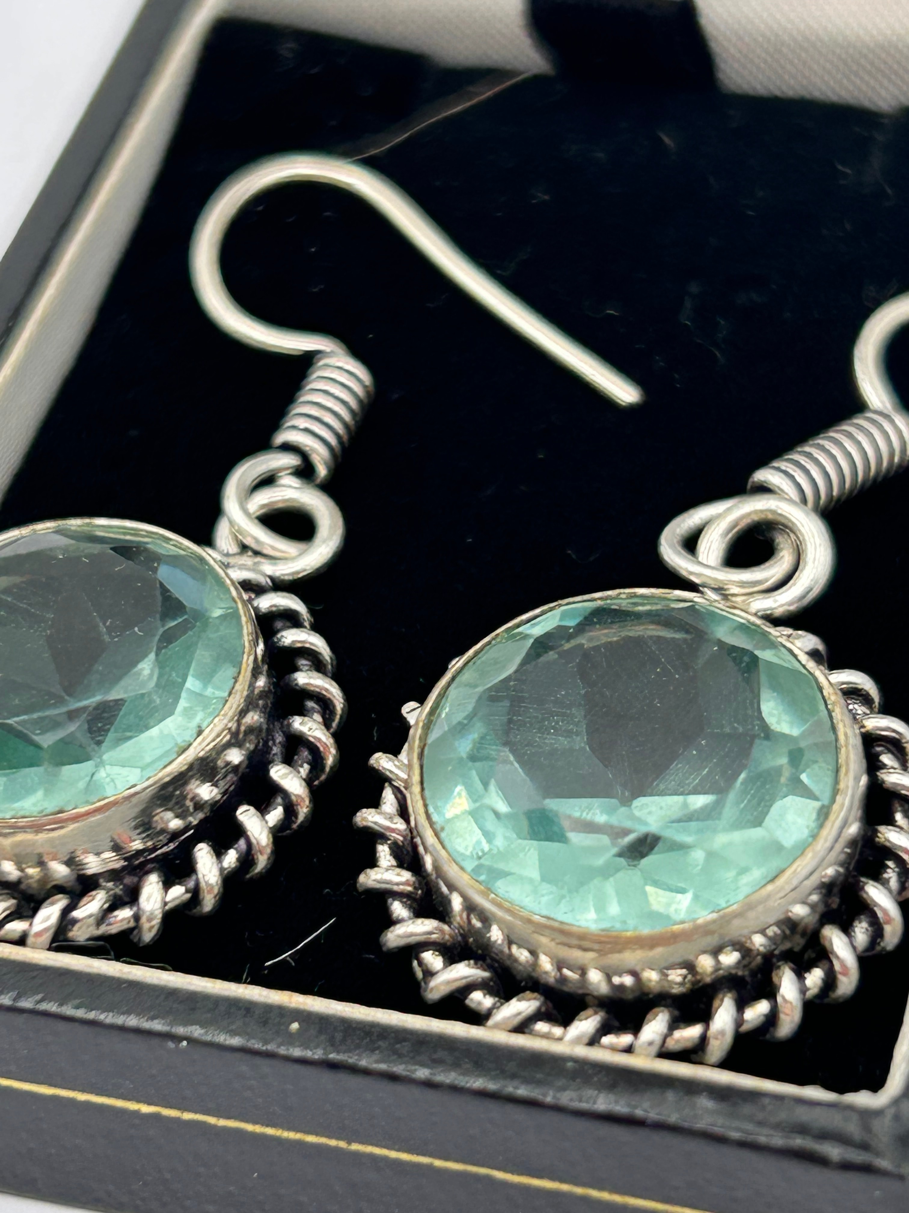 A pair of sterling silver apatite dangle earrings. Each earring features a bezel-set, faceted round translucent blue-green apatite gemstone, encircled by a twisted wire border, suspended from a coiled shepherd’s hook ear wire. One earring is visibly marked “925,” indicating sterling silver. The earrings are presented in a black hinged box with white satin lining, which is marked in gold script “ALADDIN’S CAVE Leeds.”