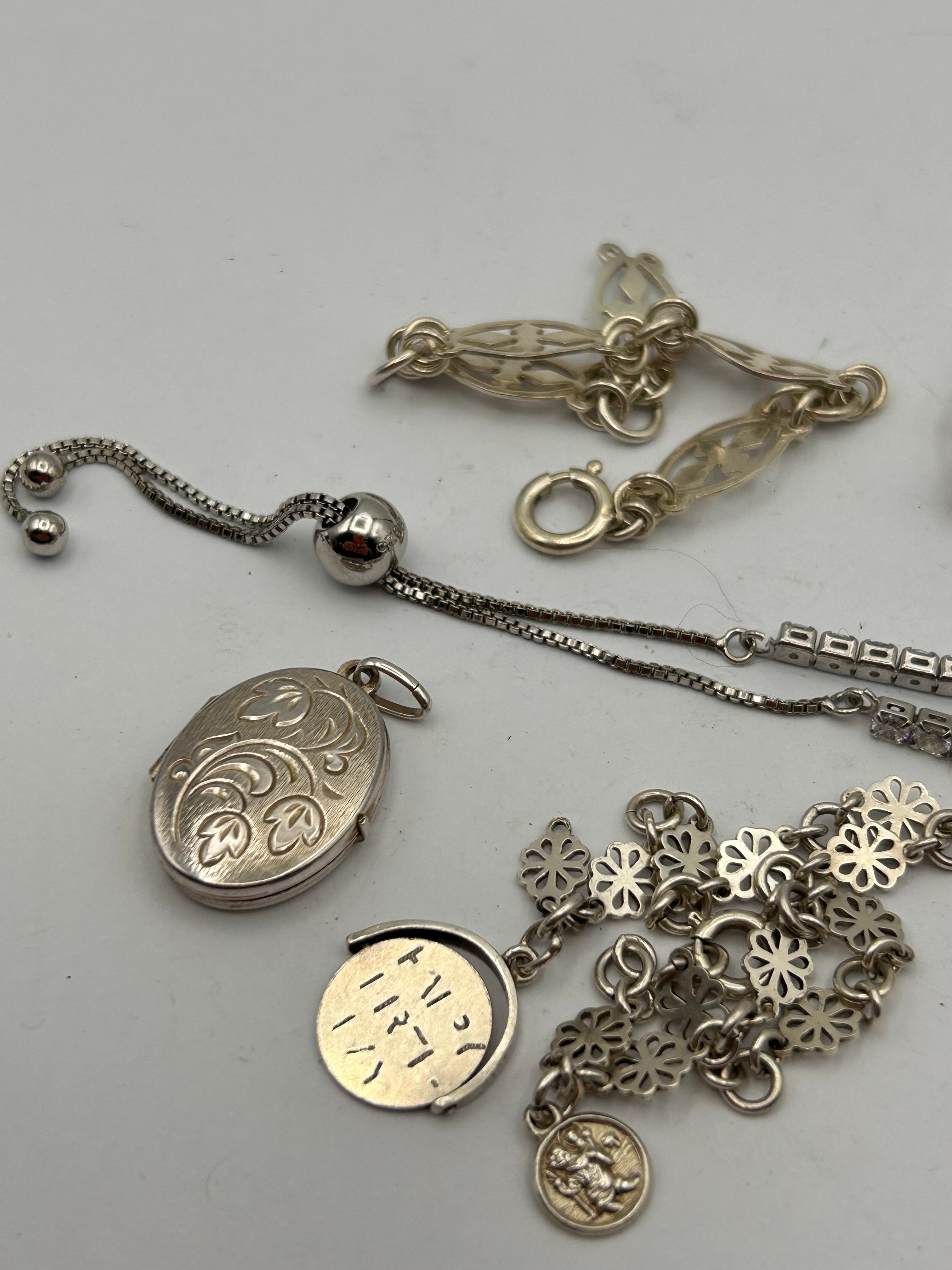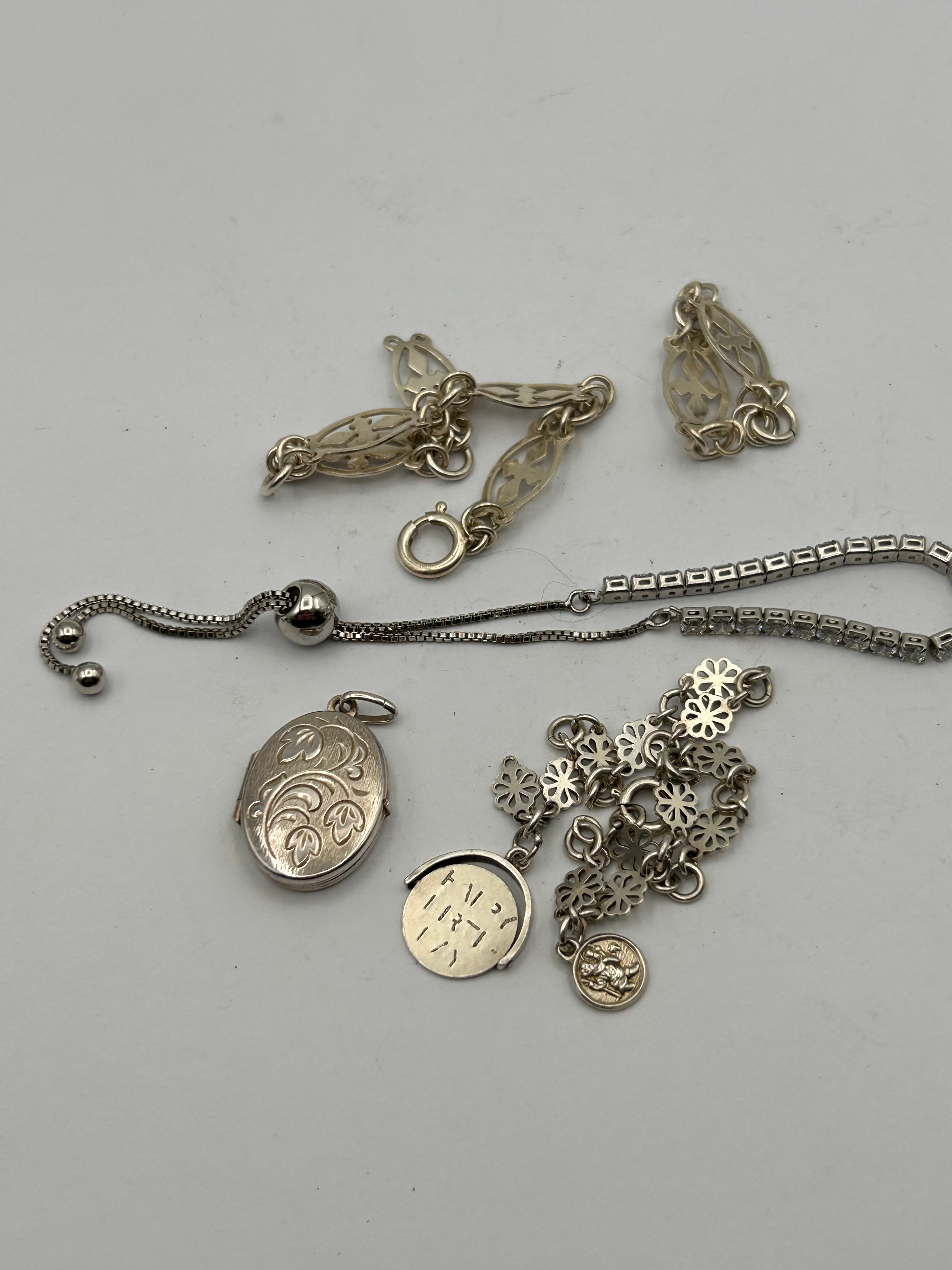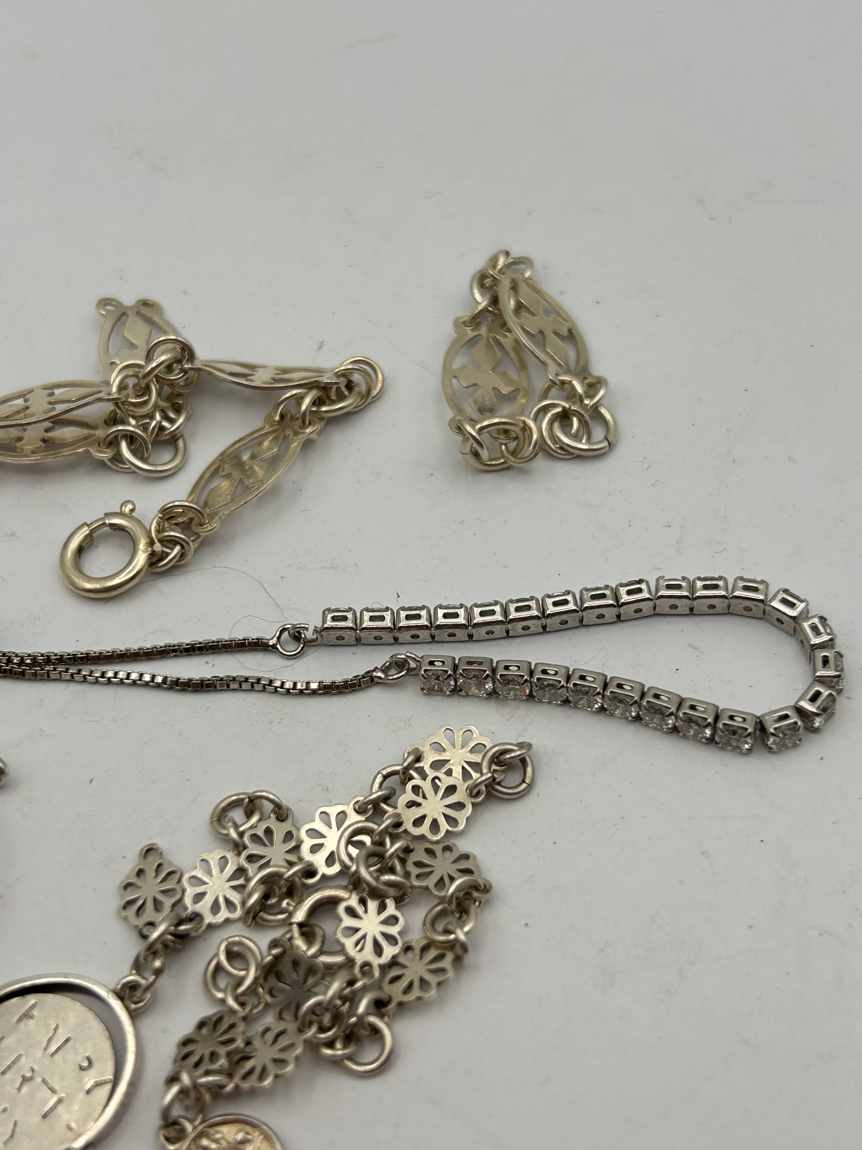 A group of silver jewelry, comprising segments of an openwork link bracelet with a spring-ring clasp, an adjustable bolo-style chain transitioning into a box-link chain with a segment of square-set clear stones, an oval locket pendant intricately engraved with floral scrollwork, and a chain composed of small four-petal flower links holding two pendants: a circular spinning charm inscribed with the words ‘TIME’, ‘FLIP’, and ‘A COIN’, and a smaller, round coin-like charm depicting a classical bust in relief.