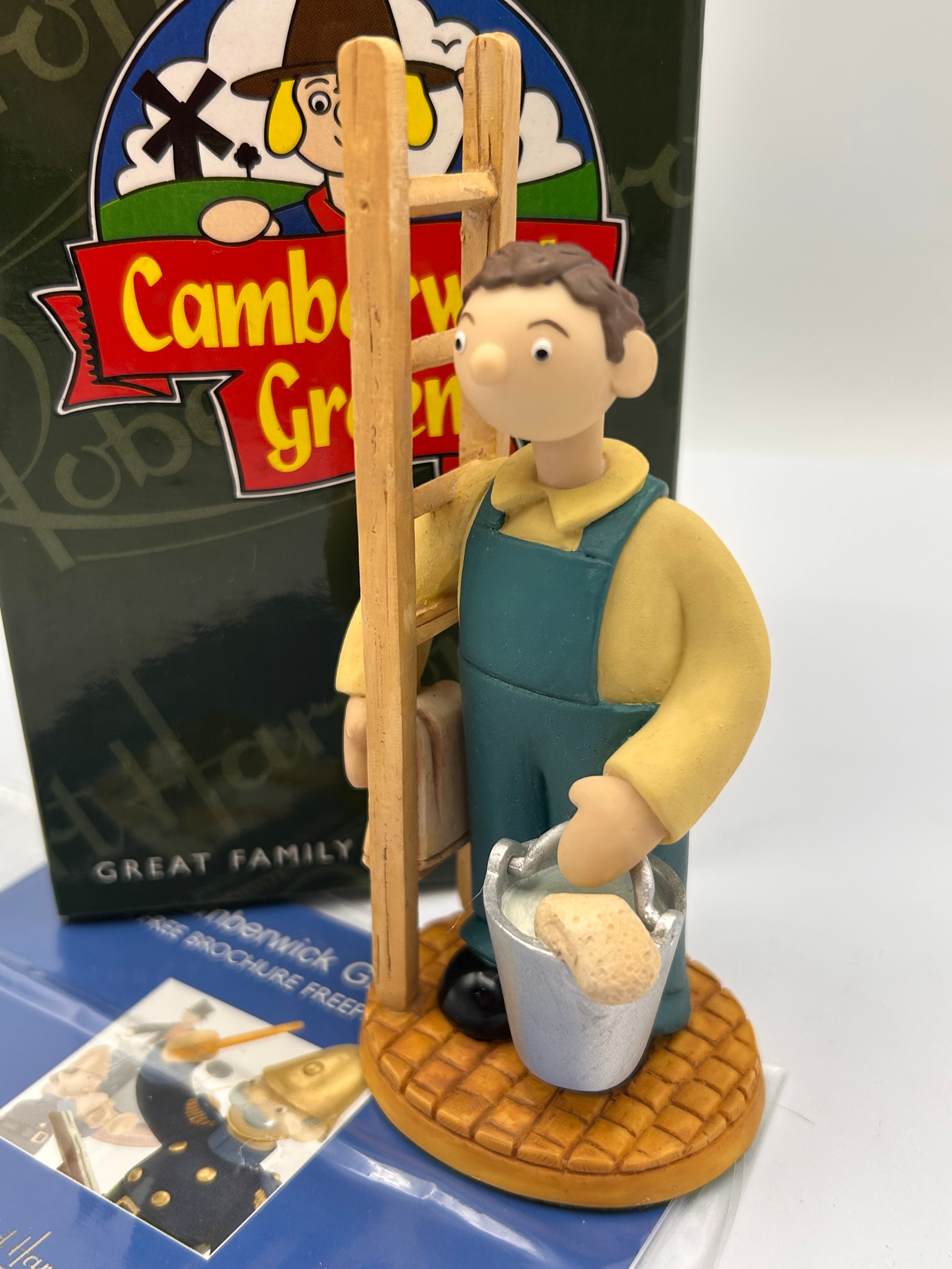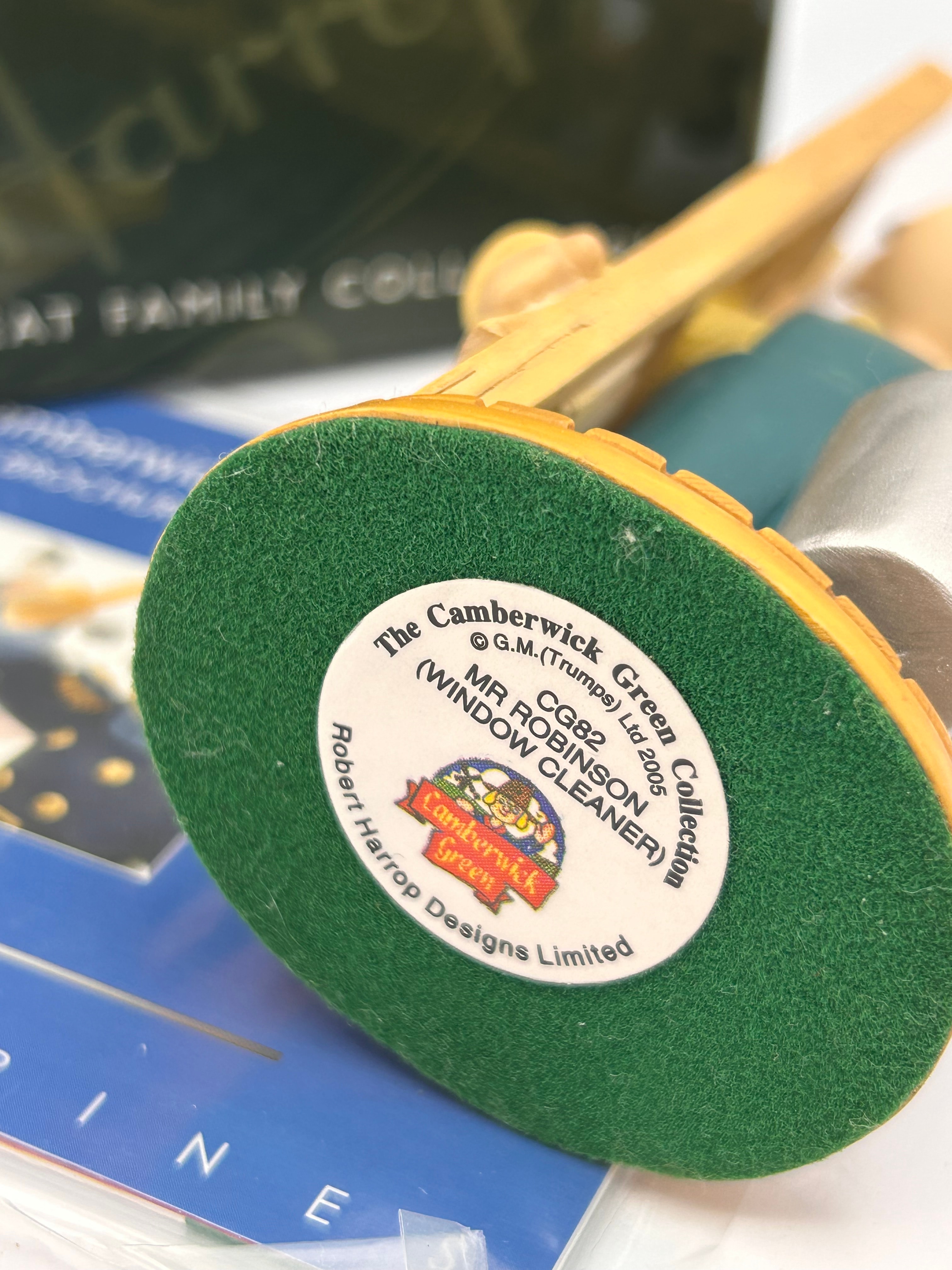 A Robert Harrop ‘Camberwick Green’ figurine, ‘Mr Robinson (Window Cleaner)’, reference CG82. This character figurine, dated 2005, is crafted from resin or a similar material. It depicts Mr Robinson in a whimsical, cartoonish style, wearing a yellow shirt and teal overalls, holding a wooden ladder and a silver-colored bucket with a sponge. The figure is mounted on a textured brown base with a green felted bottom. The base bears a label identifying it as part of ‘The Camberwick Green Collection,’ marked ‘© G.M. (Trumps) Ltd 2005,’ with the specific reference ‘CG82’ and ‘Robert Harrop Designs Limited.’ It is accompanied by its original dark green box featuring ‘Robert Harrop’ and ‘Camberwick Green’ branding, and a blue brochure marked ‘FINE FIGURINE’.