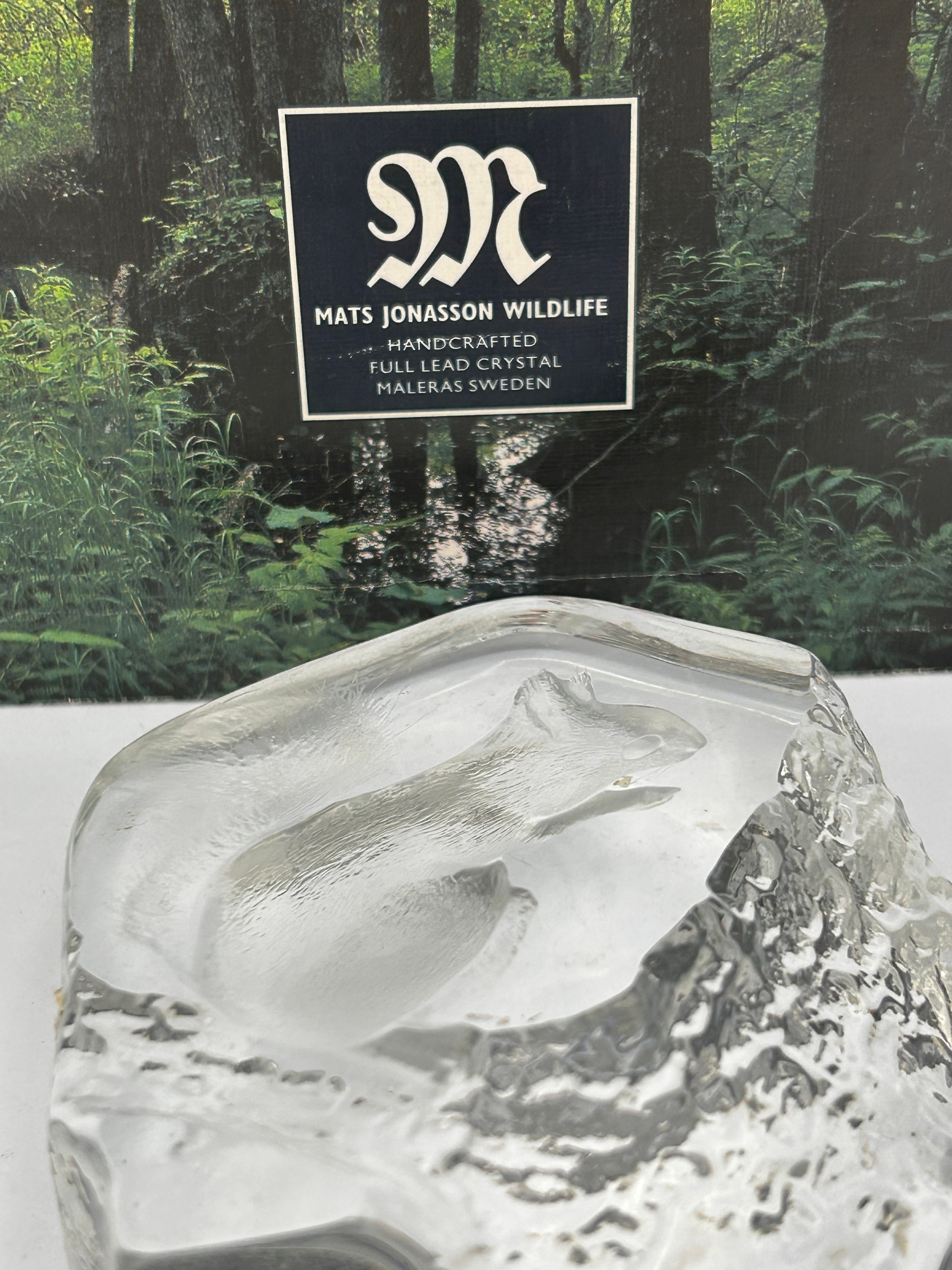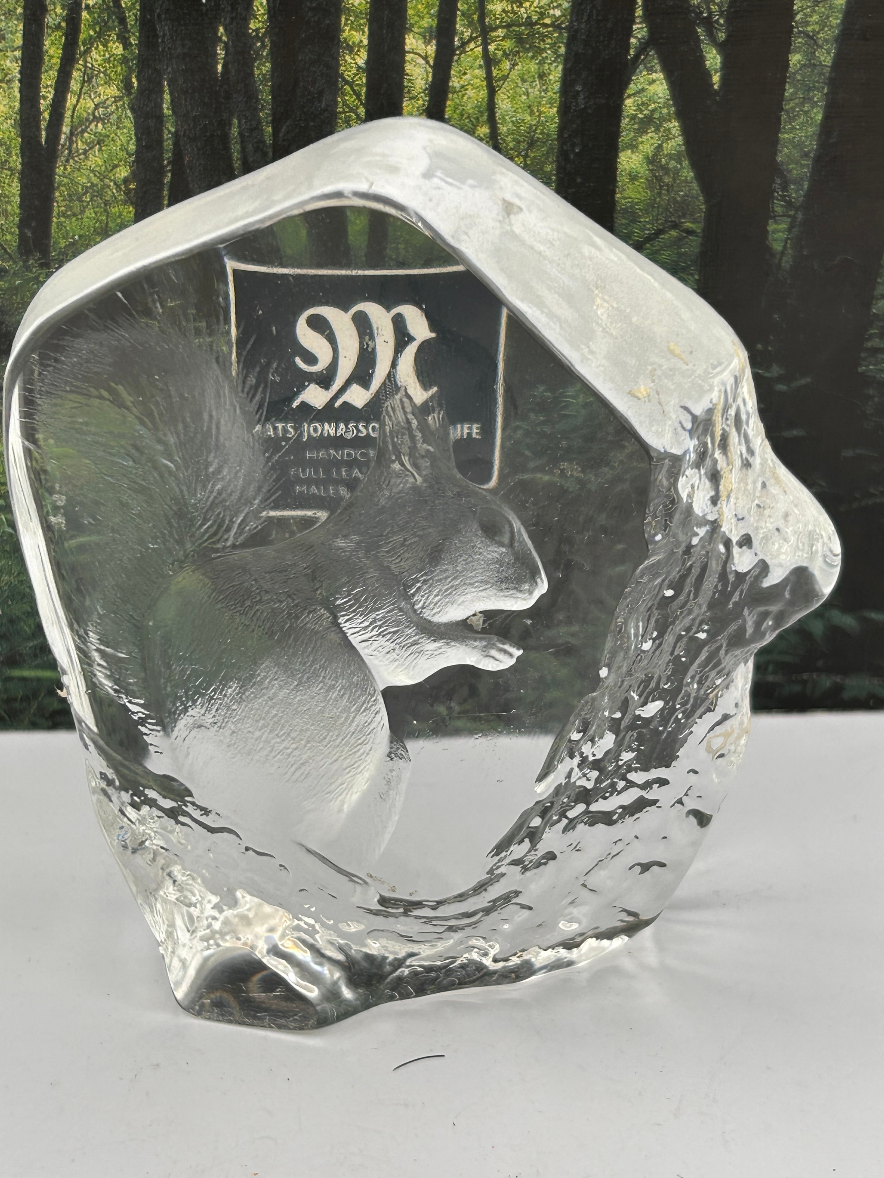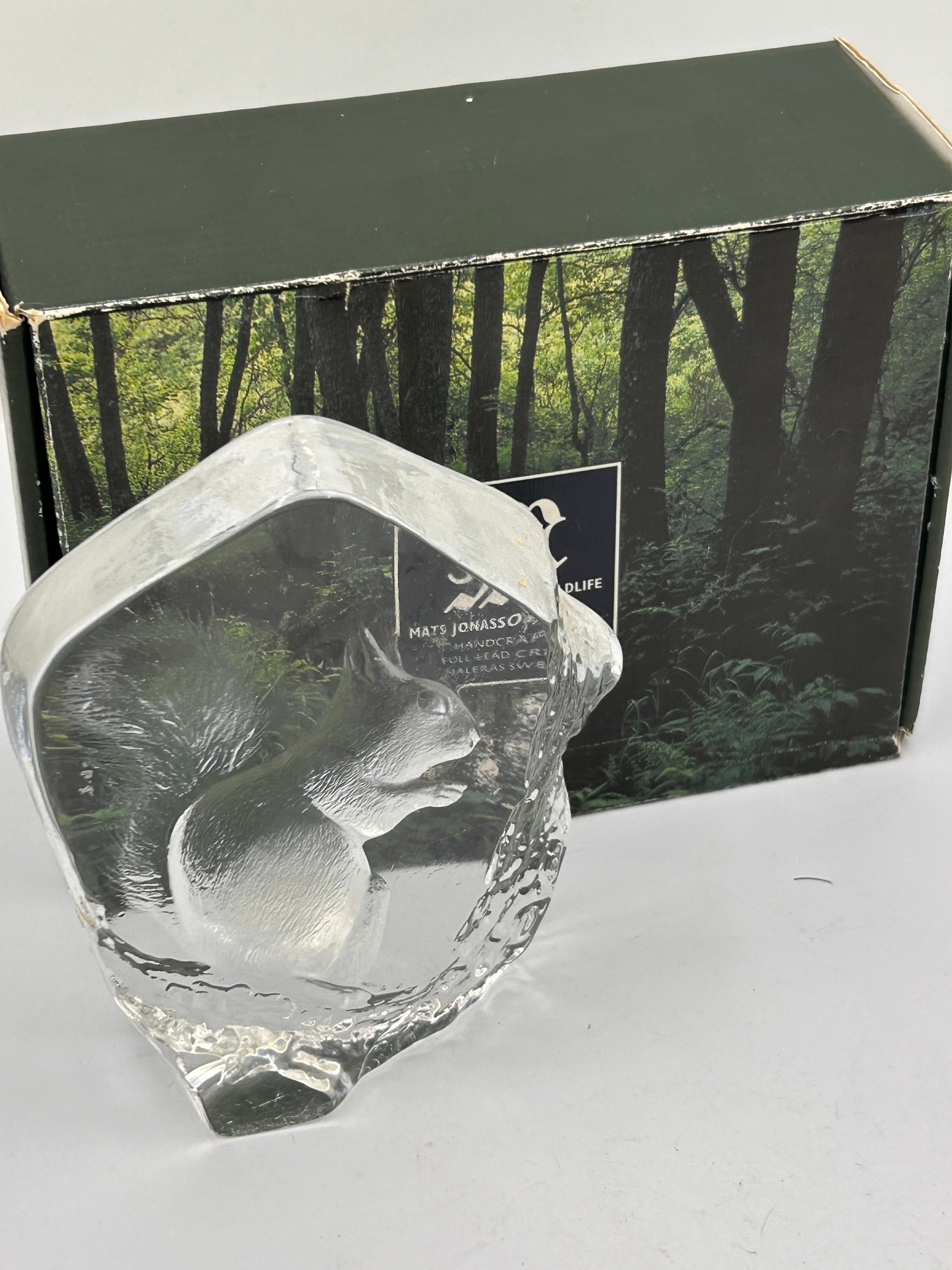 A Mats Jonasson signed lead crystal paperweight, handcrafted in Maleras, Sweden. This modern, naturalistic clear sculpted full lead crystal decorative object features an intaglio relief carving of a squirrel in profile within an irregularly shaped, multi-faceted form, exhibiting both polished and textured surfaces. It is accompanied by its original dark green cardboard box, which prominently displays the text “MATS JONASSON WILDLIFE,” “HANDCRAFTED,” “FULL LEAD CRYSTAL,” and “MALERAS SWEDEN,” along with a distinct ‘M’ logo.