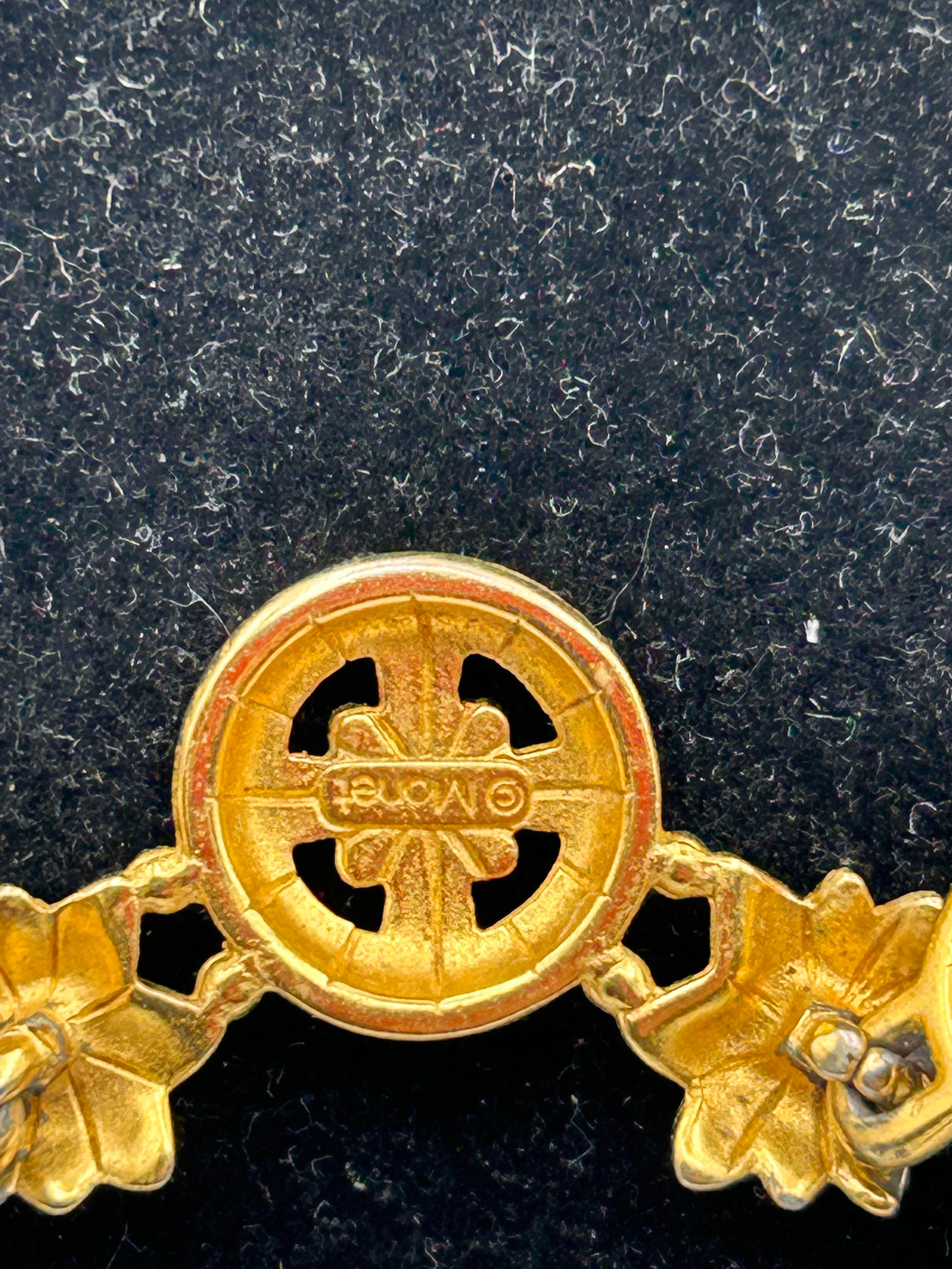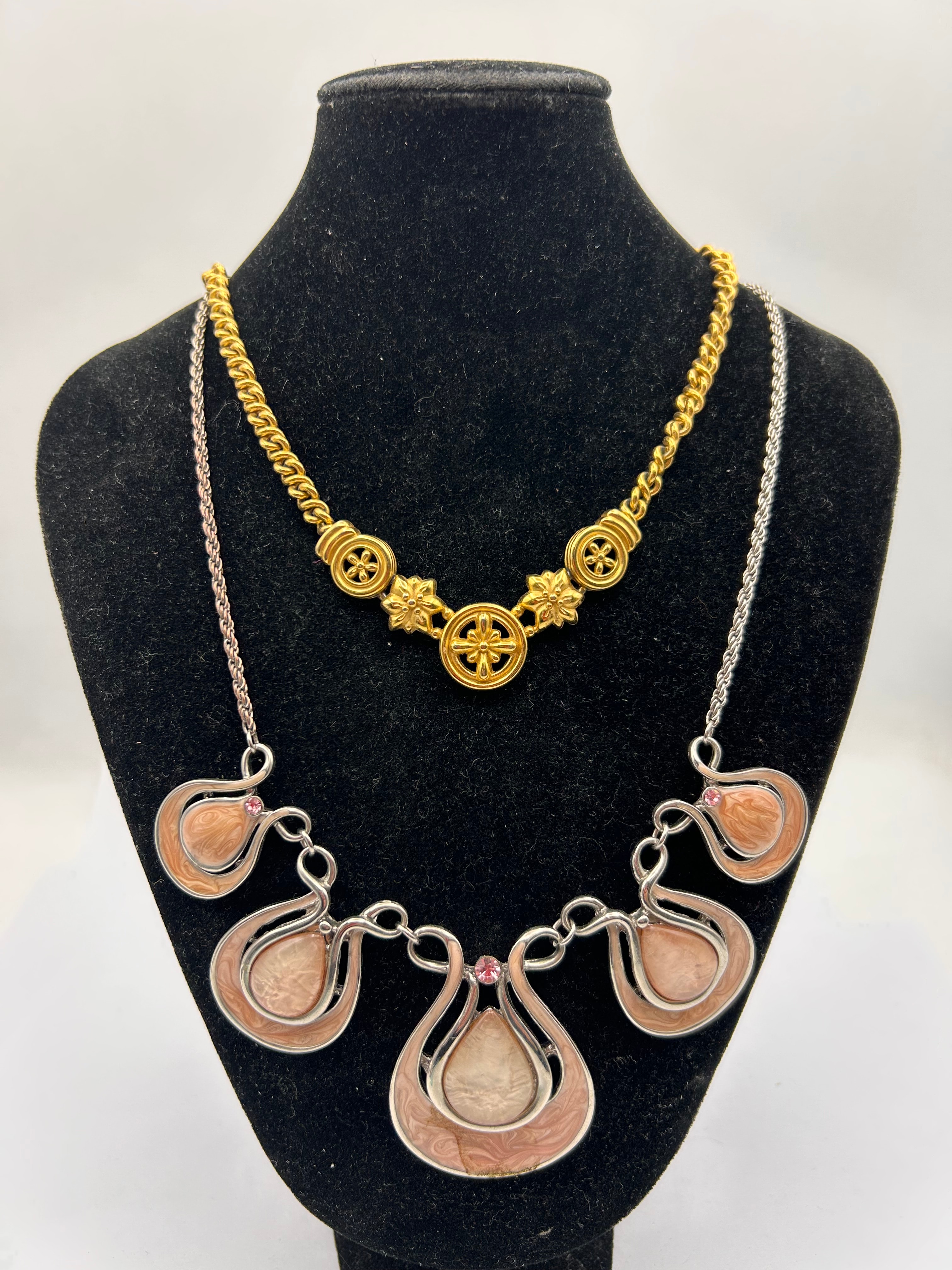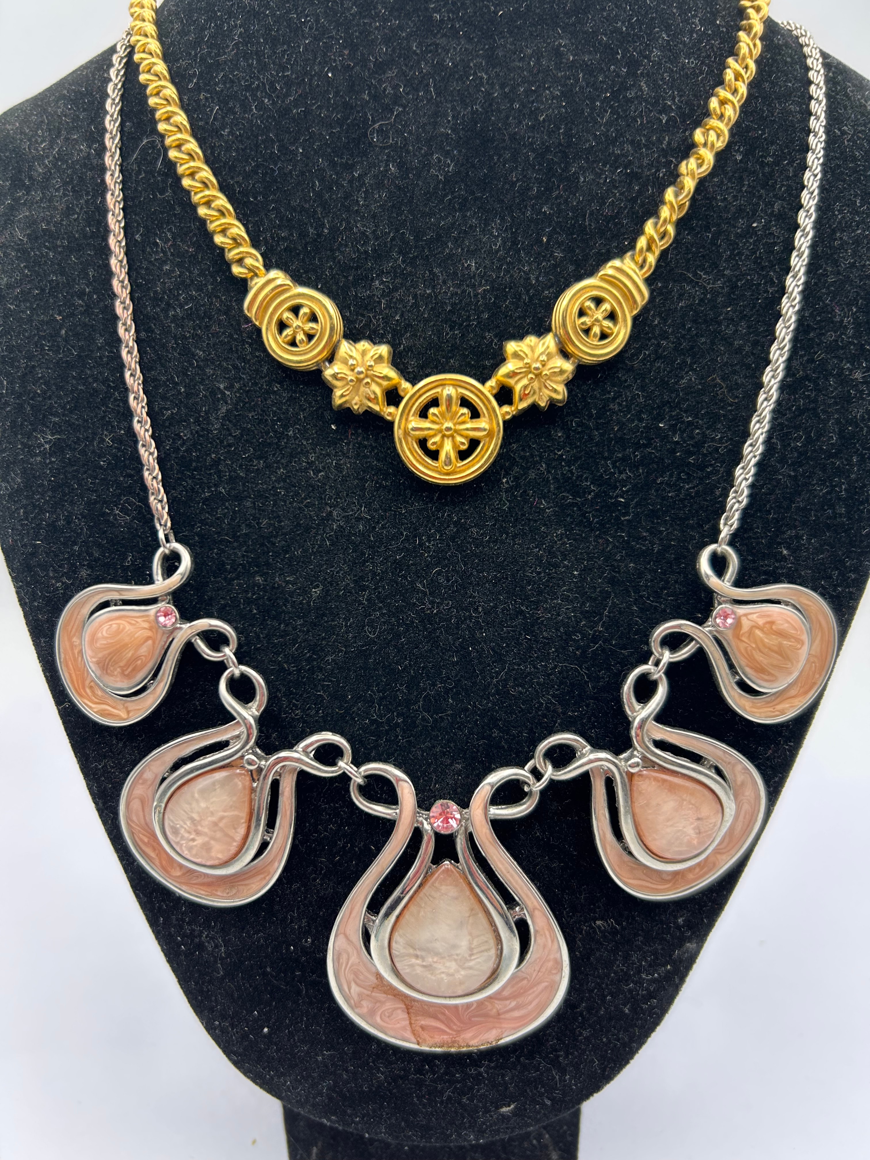 A group of two costume necklaces. The first, a gold-tone necklace, features a curb chain with a central section composed of repeating ornate, stylized floral and cross-like link elements. The reverse of one such element is marked “©Monet”. The second necklace is a silver-tone multi-link piece adorned with five teardrop-shaped pendants, each featuring a pinkish-beige enameled or resin-like finish, a smaller silver-tone accent, and a single small pink stone.