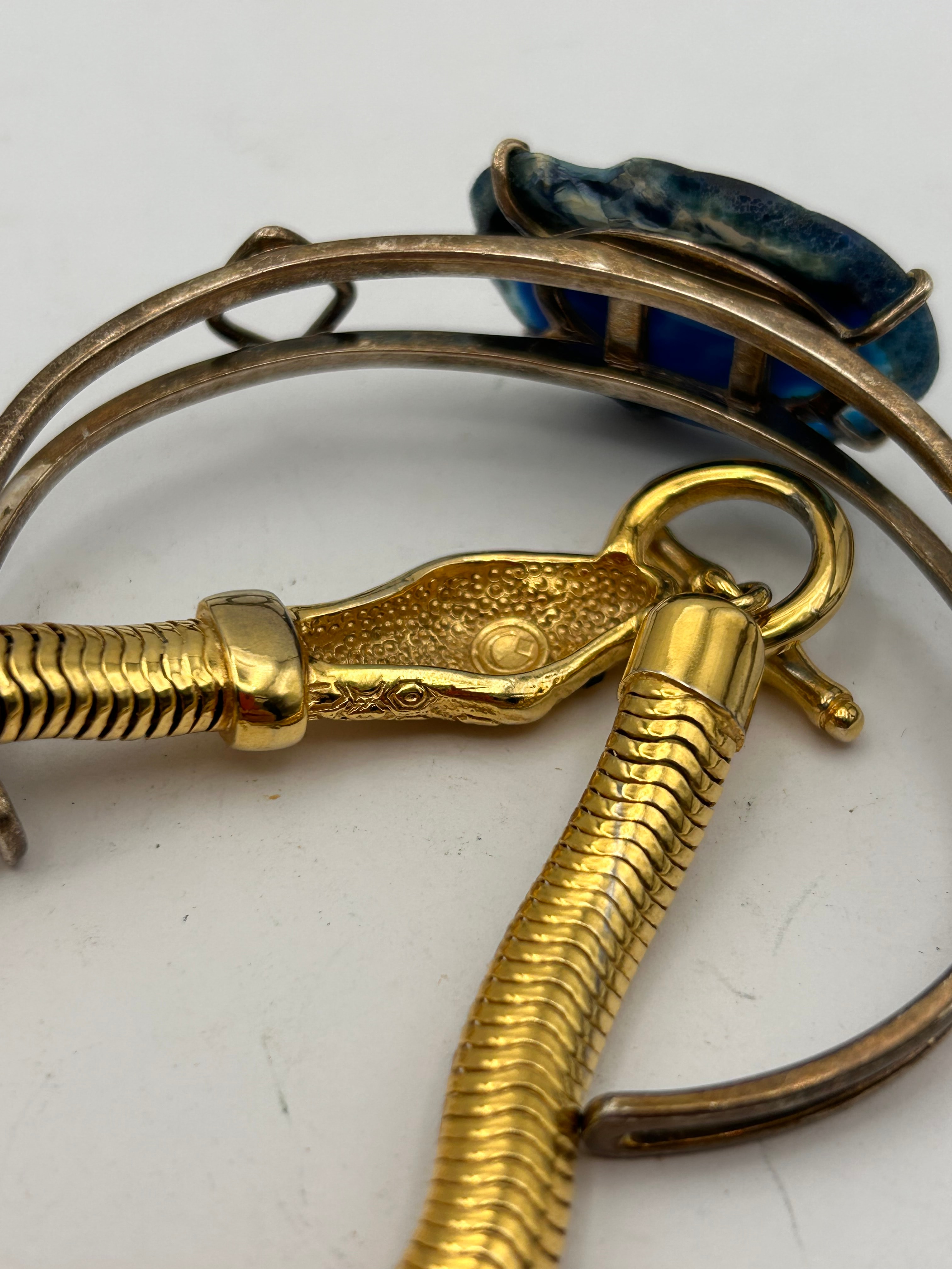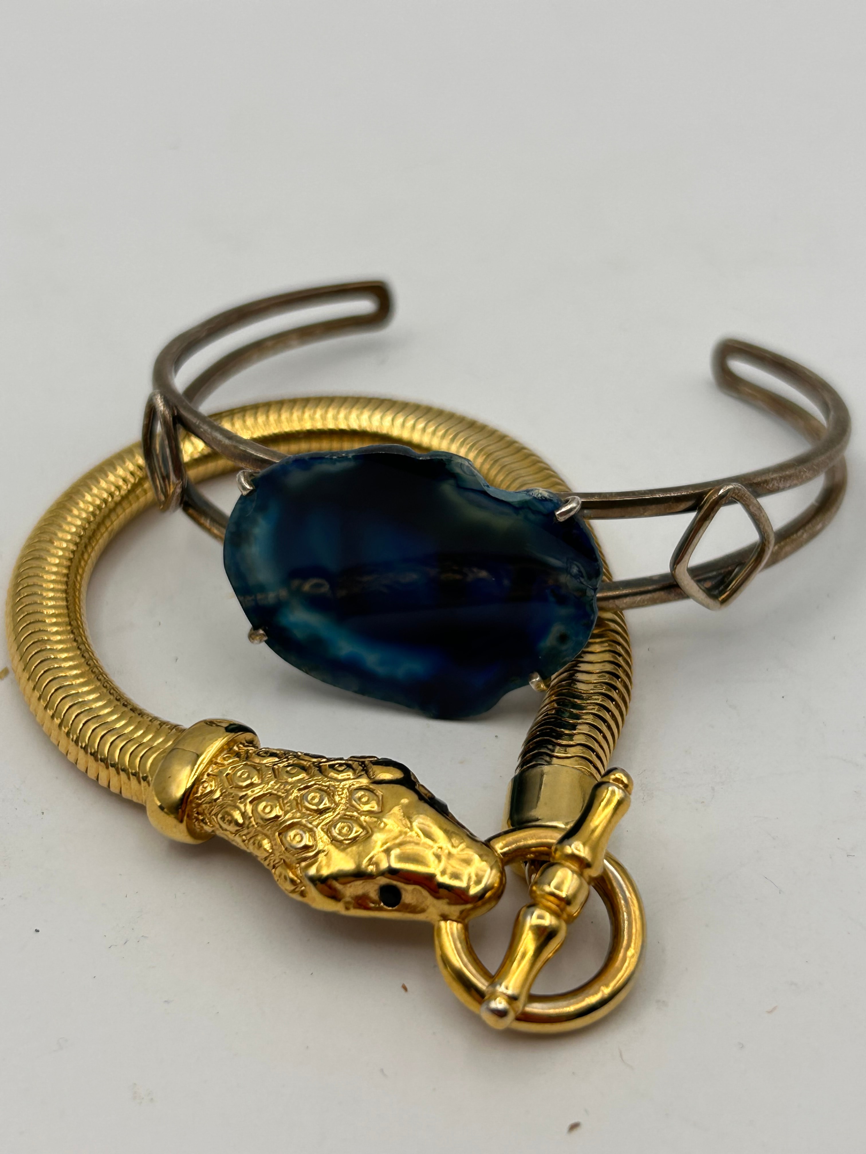 A pair of vintage bracelets. The first is an open cuff bracelet crafted from silvertone metal, featuring a central bezel-set, irregular-shaped polished blue stone, possibly a dyed agate slice or geode. This stone is flanked by two small open rhombus details on a flat band. The second bracelet is flexible and goldtone, designed in a snake-chain style body, terminating in a textured animal-head finial resembling a serpent. A circular mark with a stylized letter resembling “C” is visible on the underside of the serpent head. This bracelet secures with a toggle clasp closure.