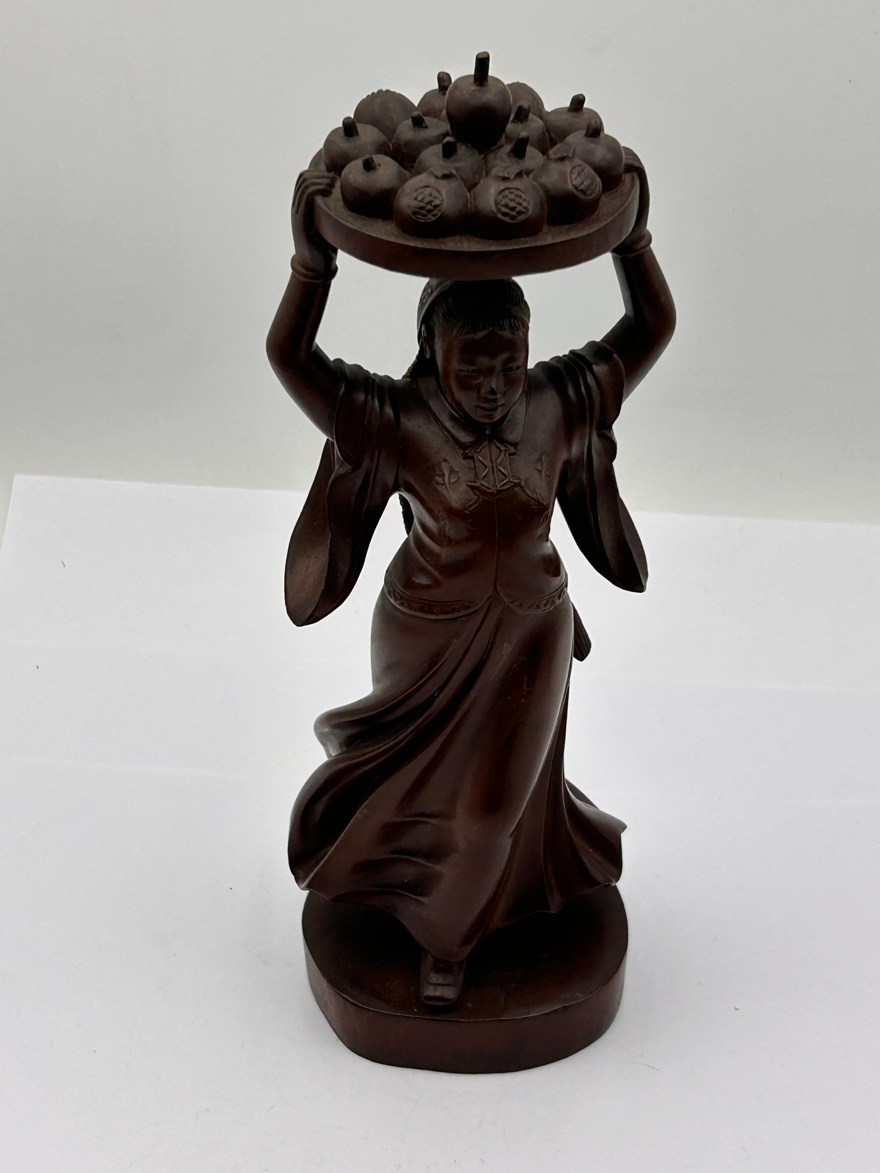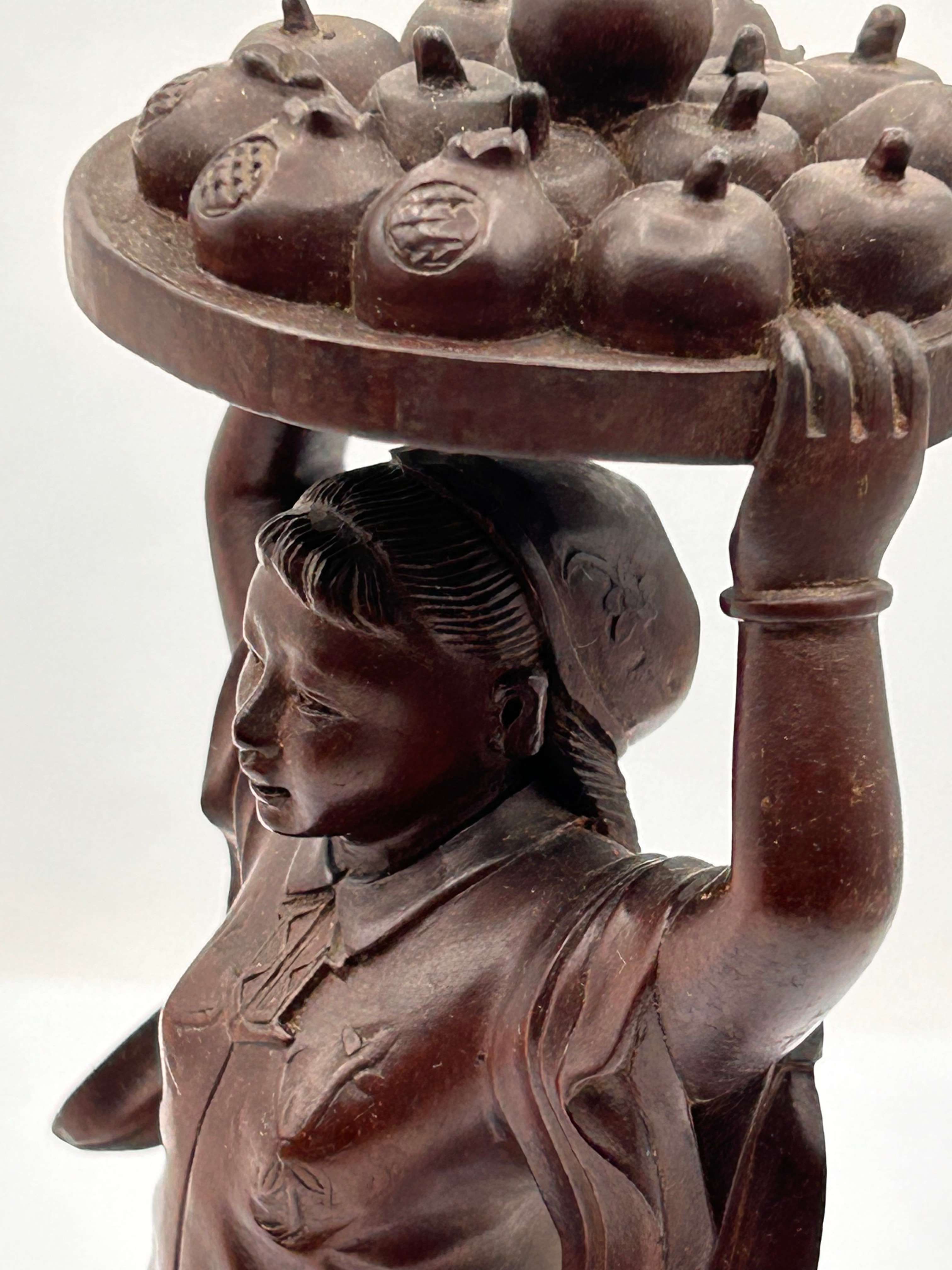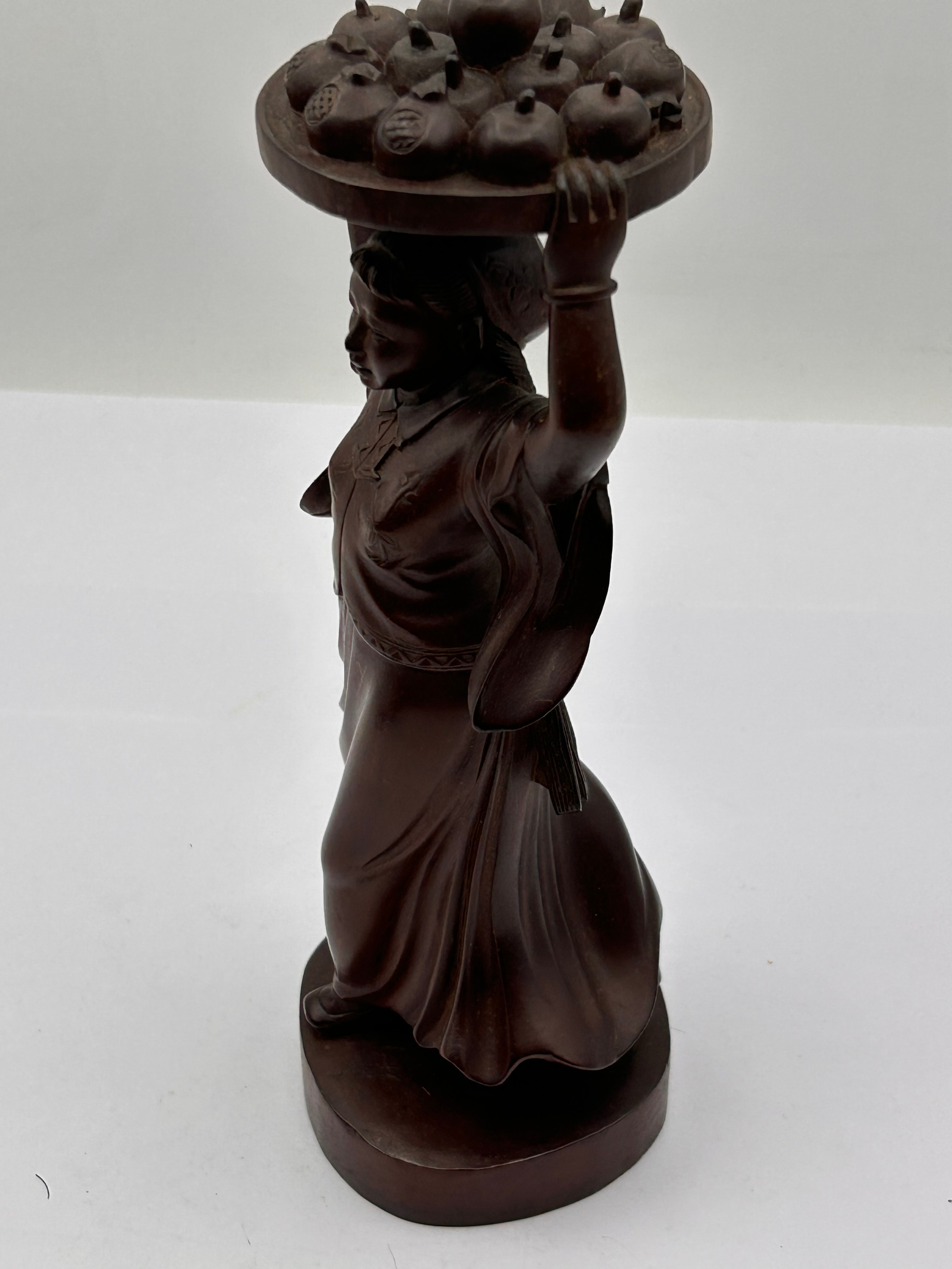 A dark, hand-carved wooden figural sculpture depicting a female figure in traditional East Asian attire, balancing a shallow, circular tray laden with pomegranates over her head. The figure stands on an integrated circular base. Several pomegranates on the tray are incised with Chinese characters, notably “壽” (Shòu, meaning Longevity) and “福” (Fú, meaning Fortune/Good Luck). The carving style is detailed, and the wood exhibits a smooth, rich dark brown patina.