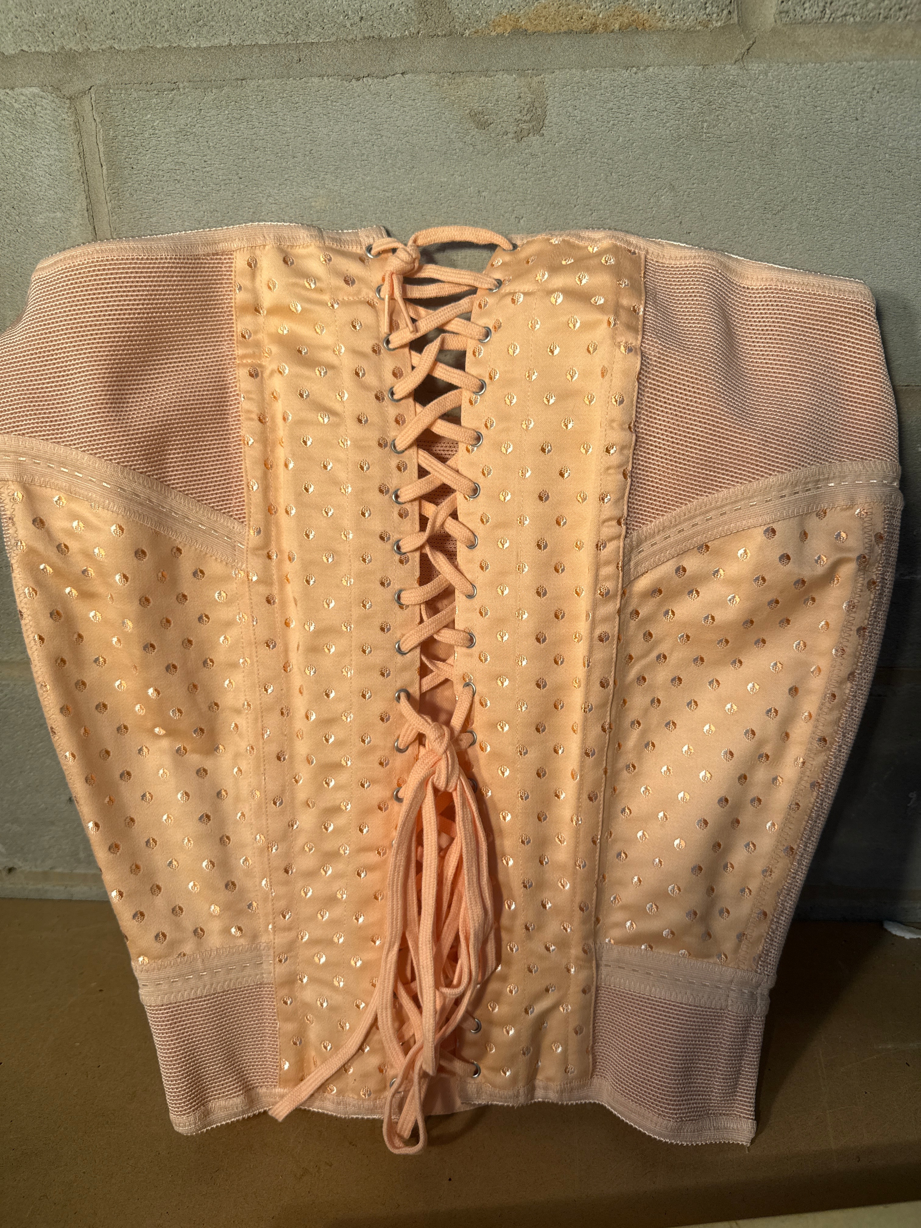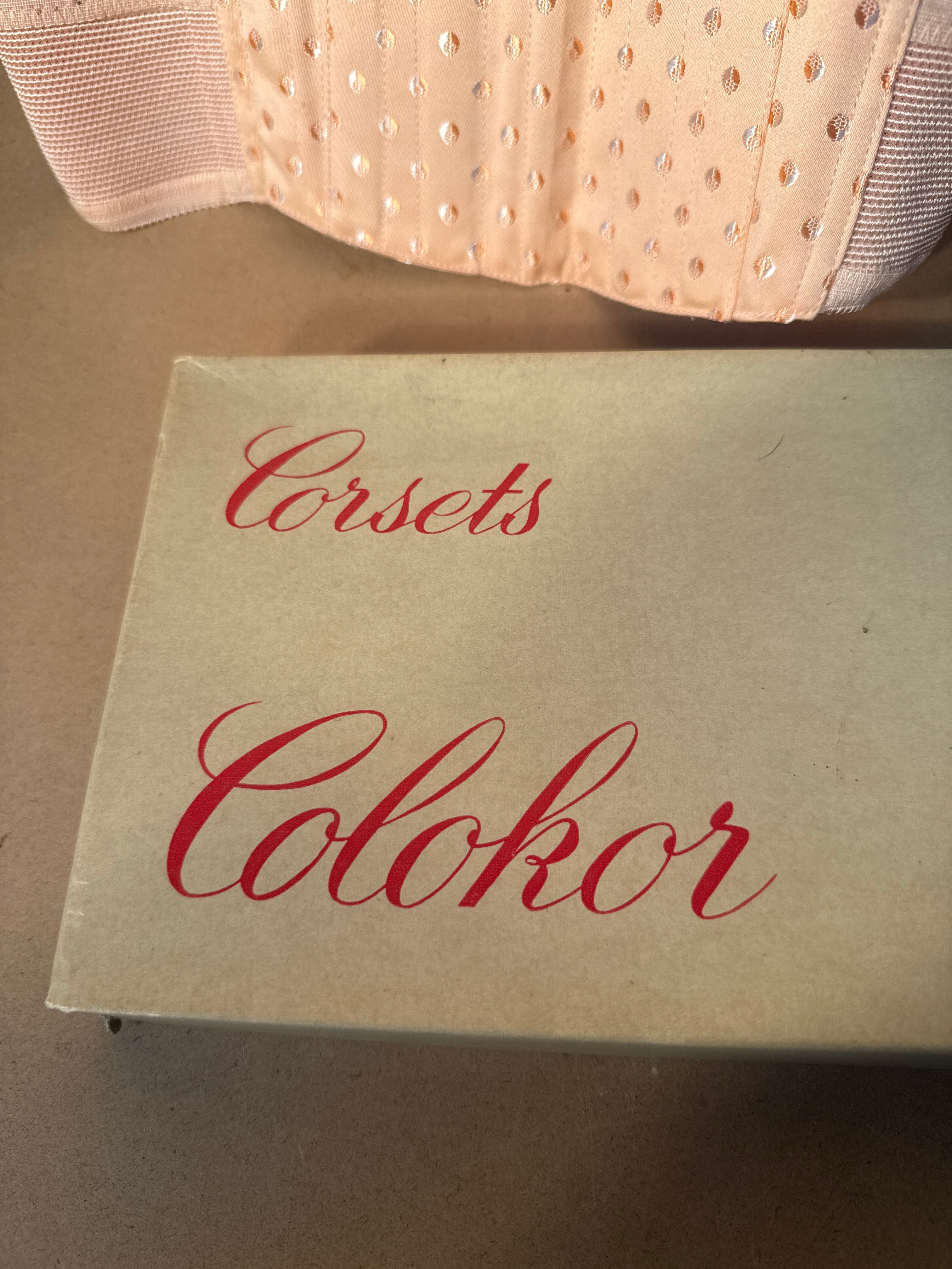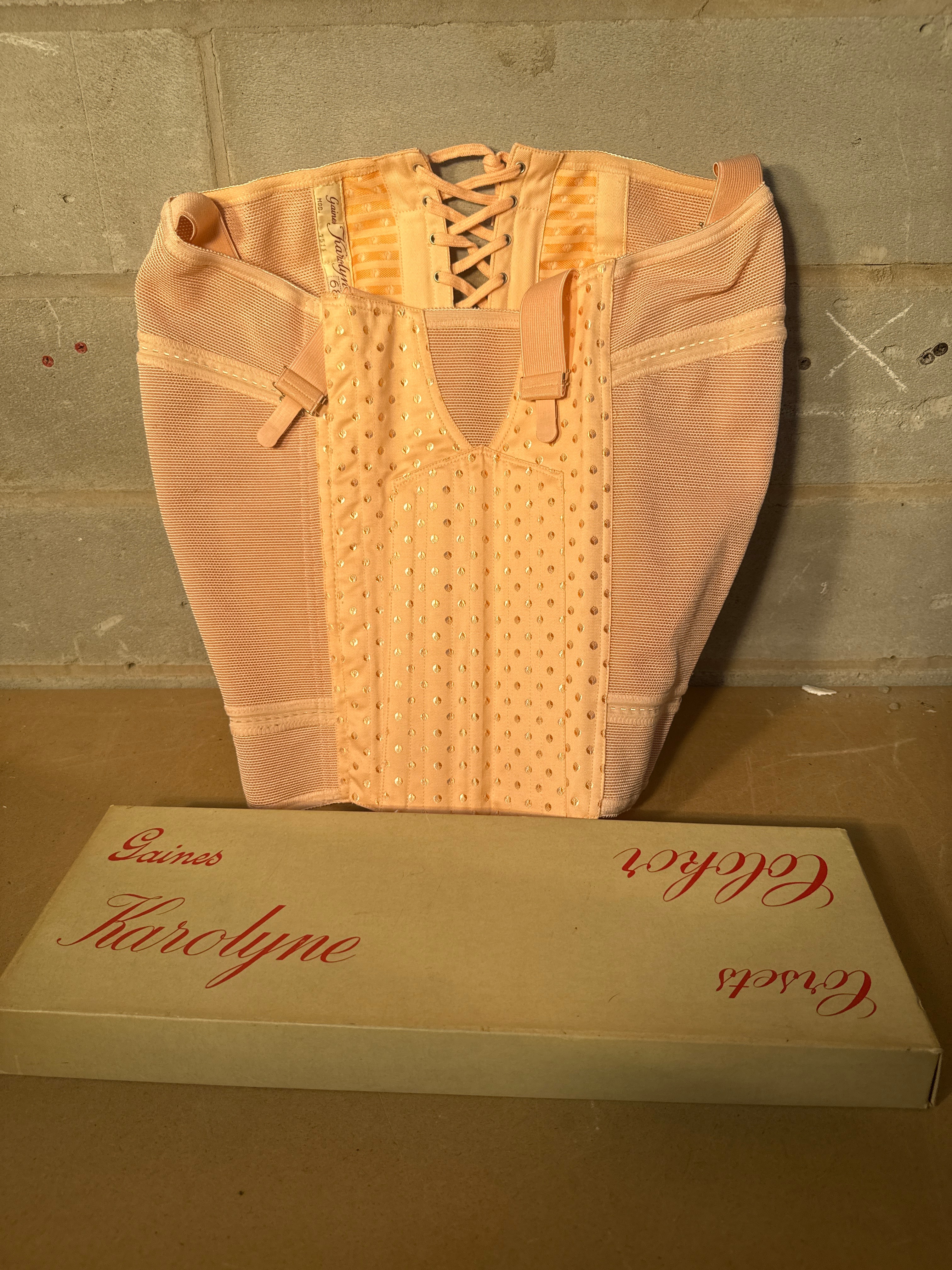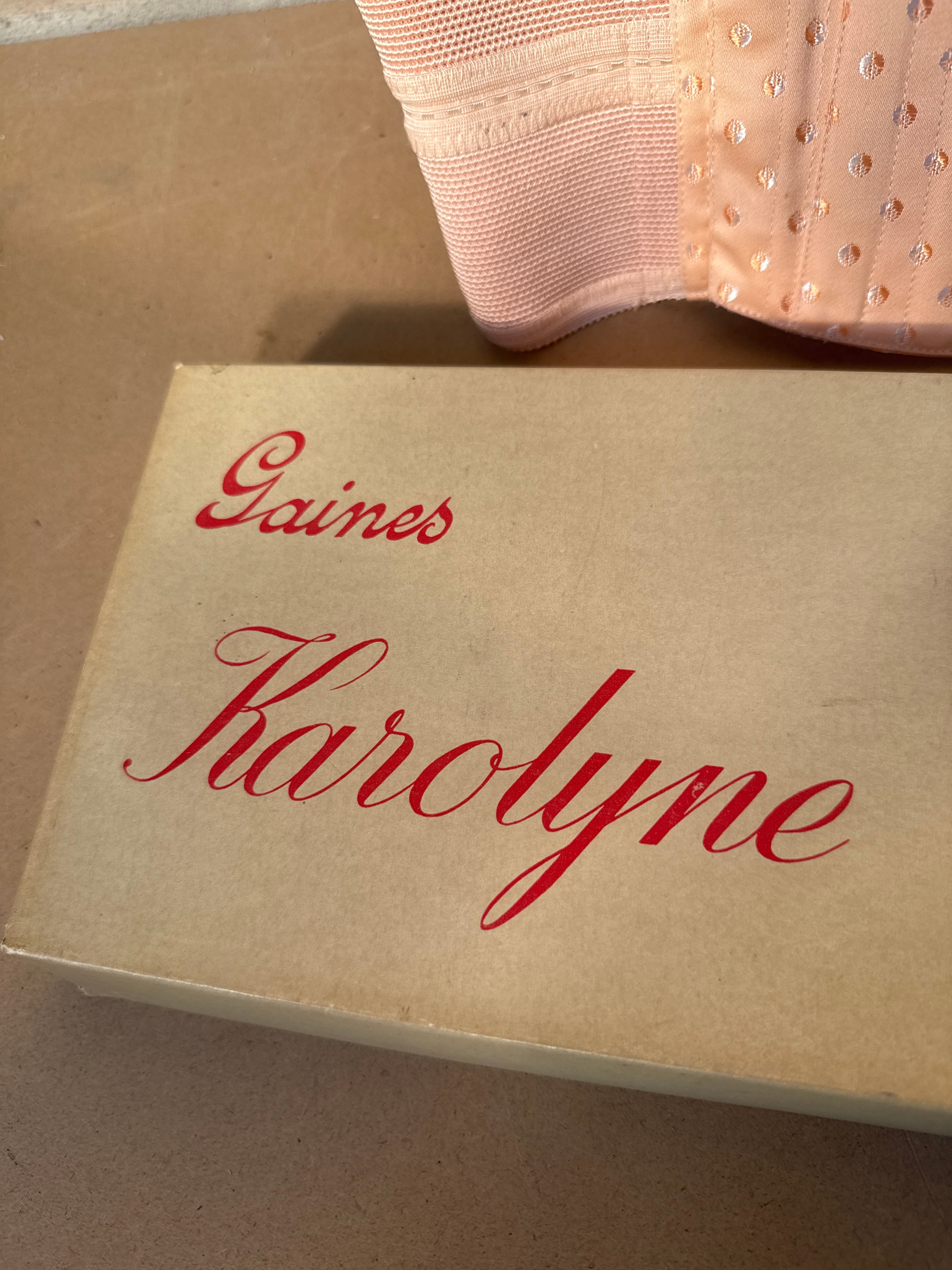 A vintage Gaines Karolyne Colokor foundation garment, presented new in its original box. Constructed from peach-colored elasticized fabric, featuring a central panel with a woven pattern of small, metallic-appearing dots. The garment has a full lace-up closure on the reverse with matching fabric laces, and adjustable elastic straps with metal clasps on the front. An interior label reads ‘Genuine Nylon Elastic’. Accompanied by its original cardboard box, printed in red with ‘Gaines Karolyne’ on one long side and ‘Corsets Colokor’ on the other.